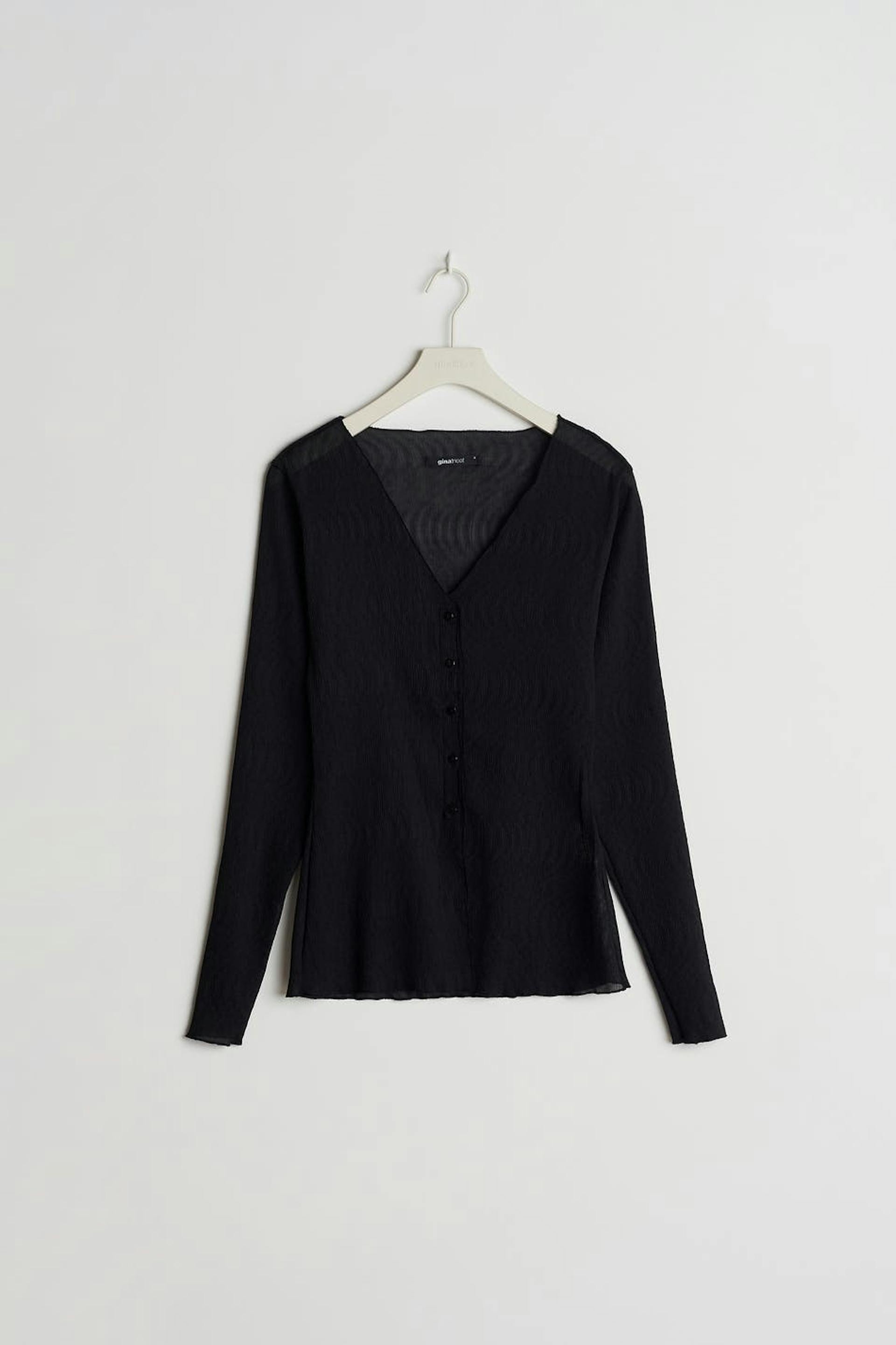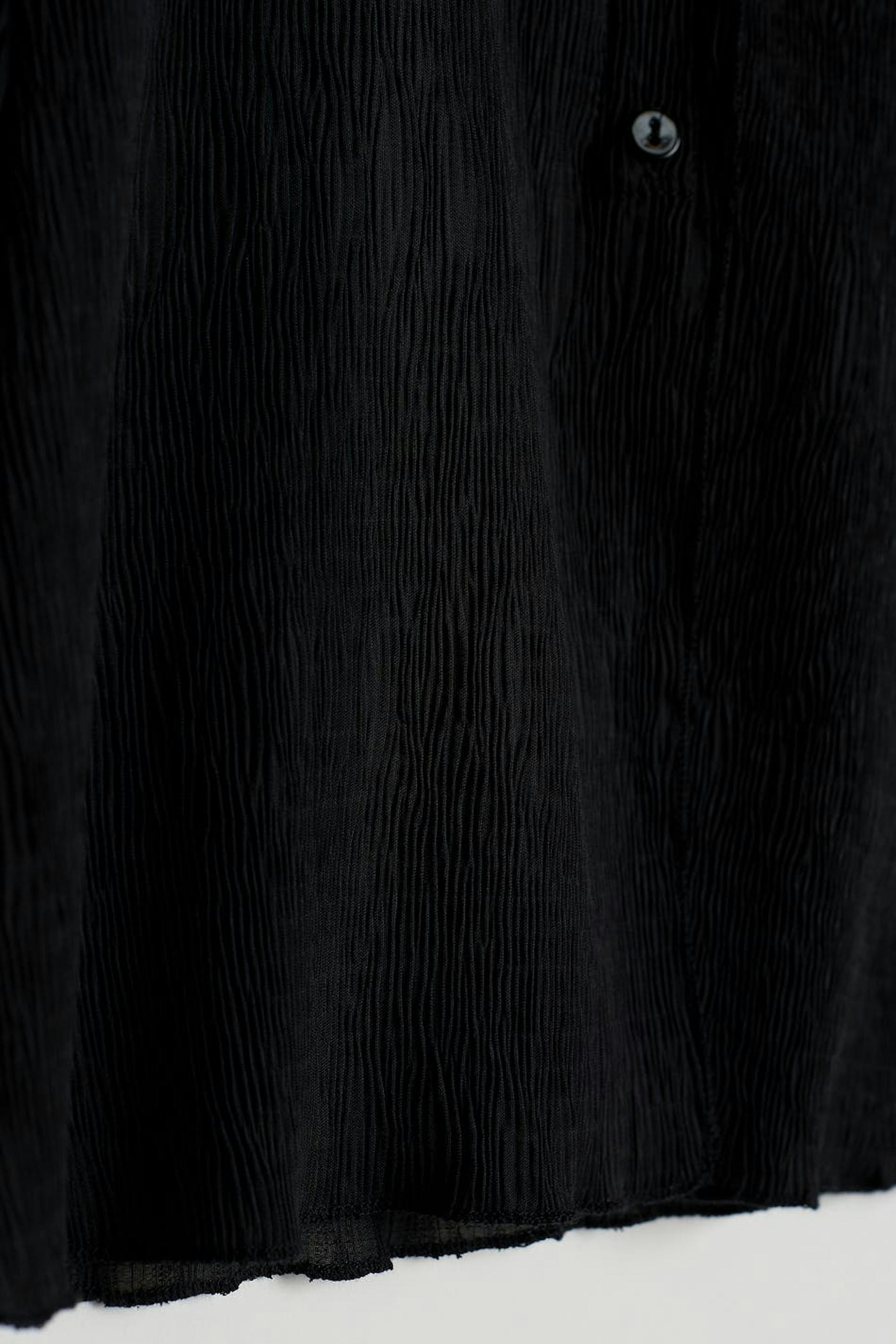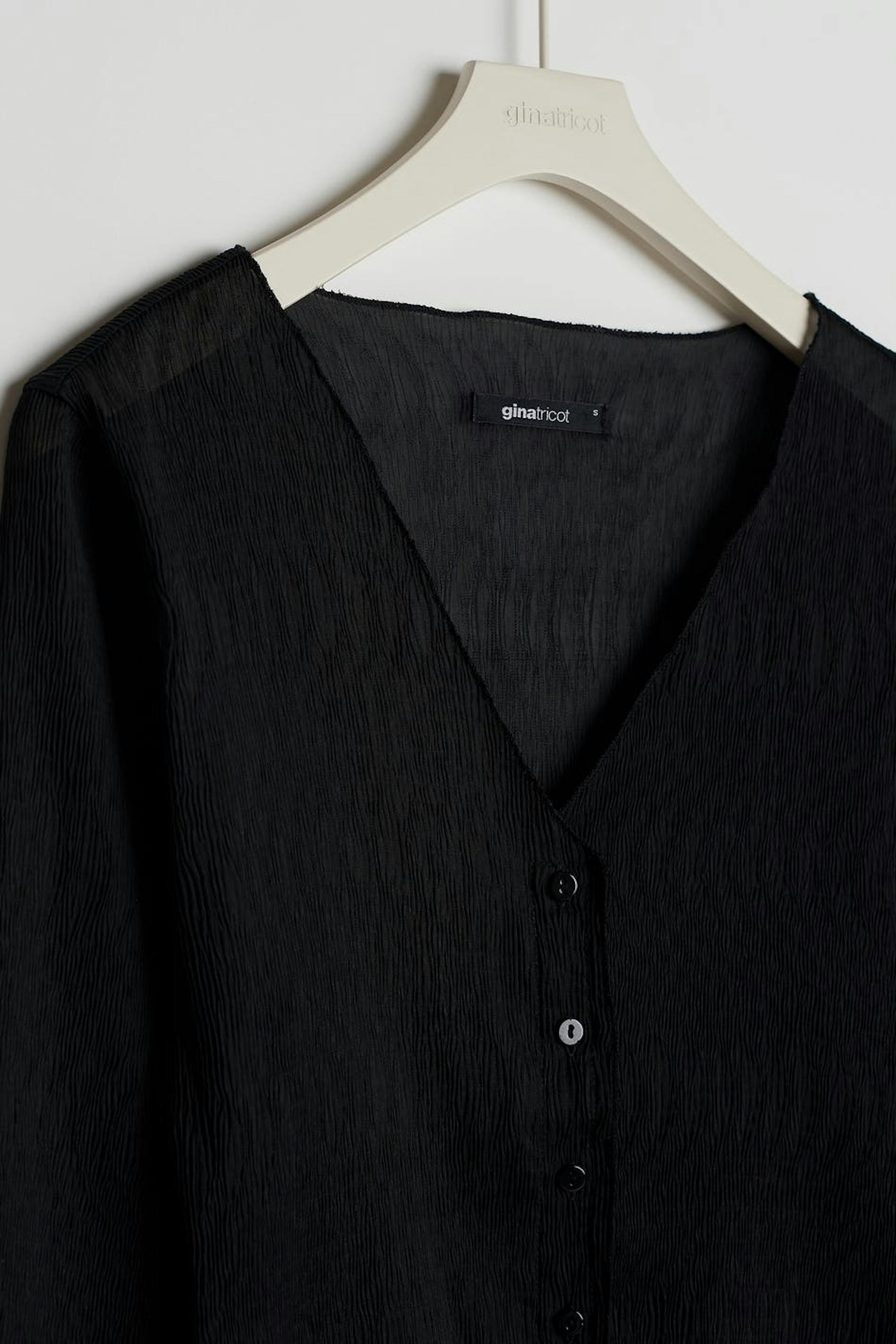 Blus med tunn kvalitet i chiffon. Blusen är svart och har ett lätt krinklat material. Den har en v-ringning, en knappstängning framtill och små volanger på nederfållen.