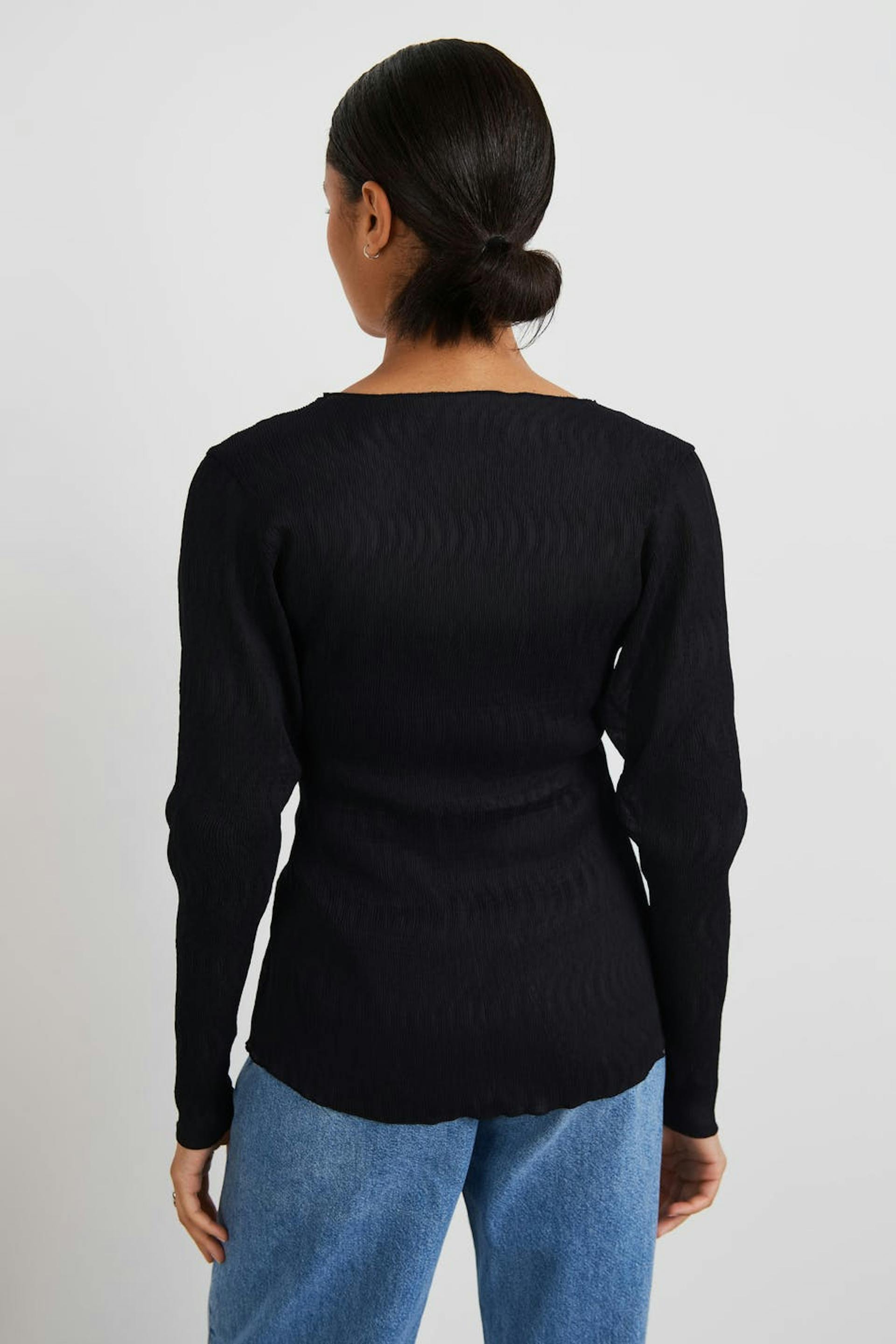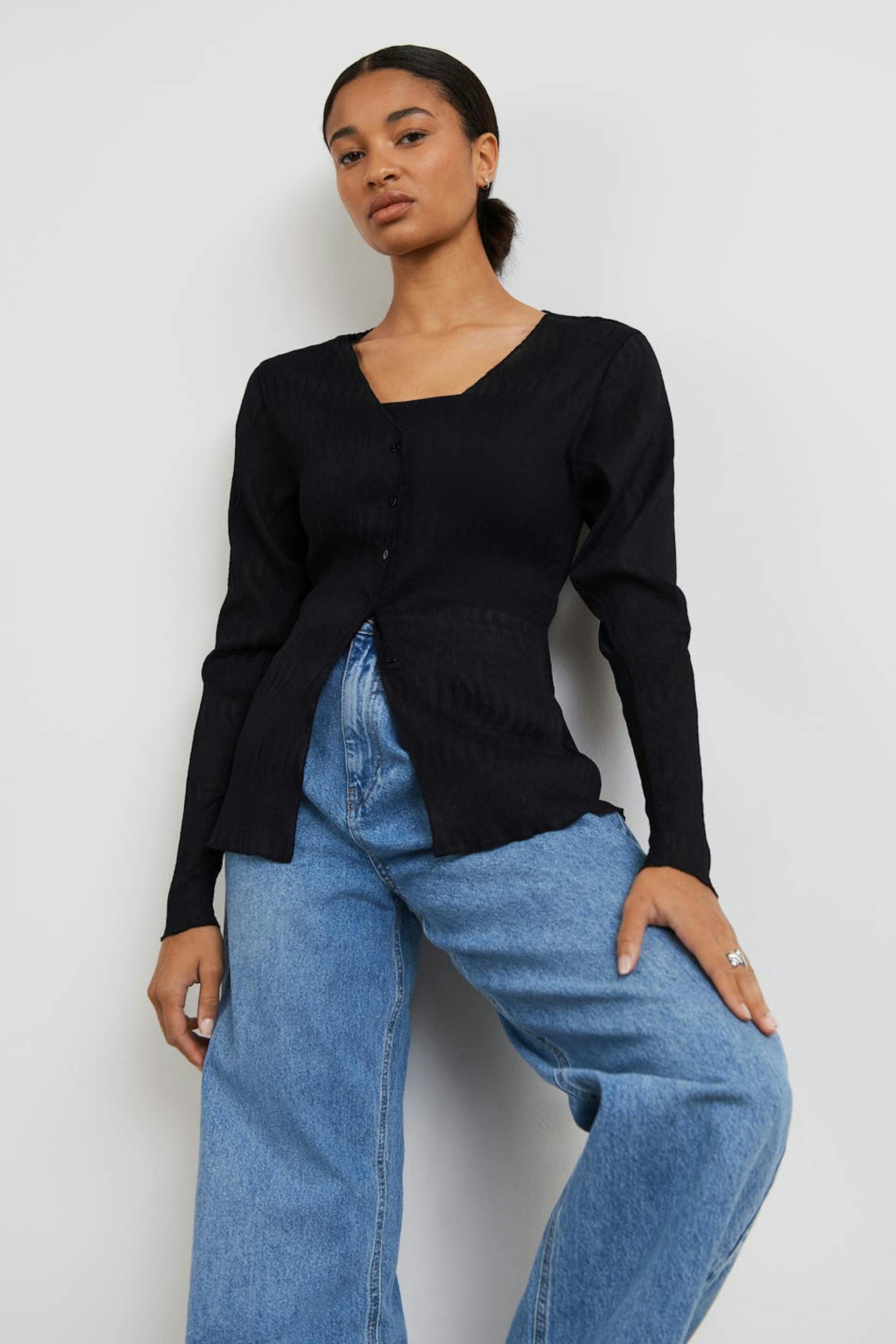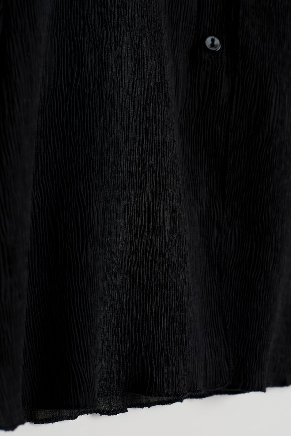 Blus med tunn kvalitet i chiffon. Blusen är svart och har ett lätt krinklat material. Den har en v-ringning, en knappstängning framtill och små volanger på nederfållen.