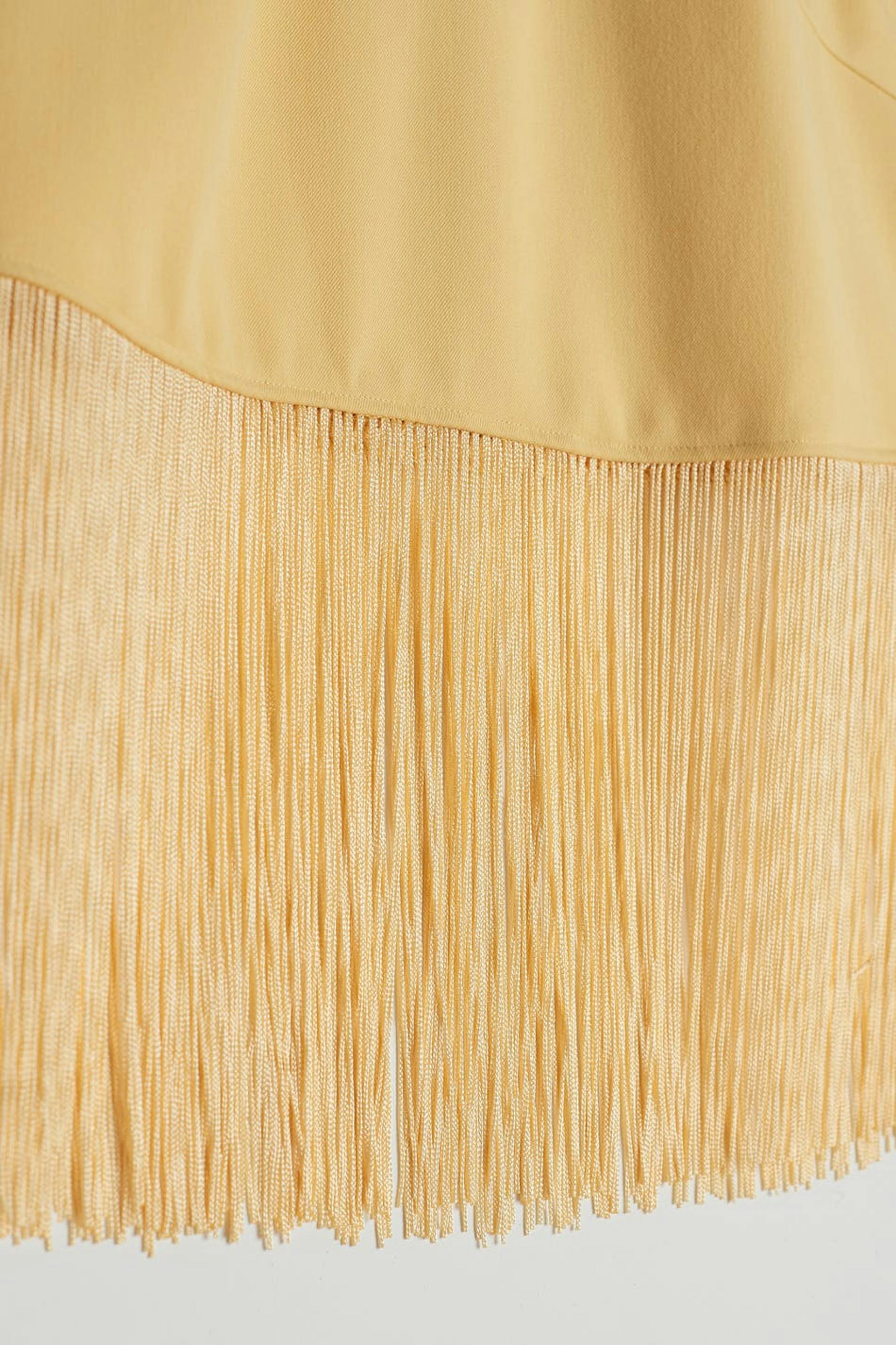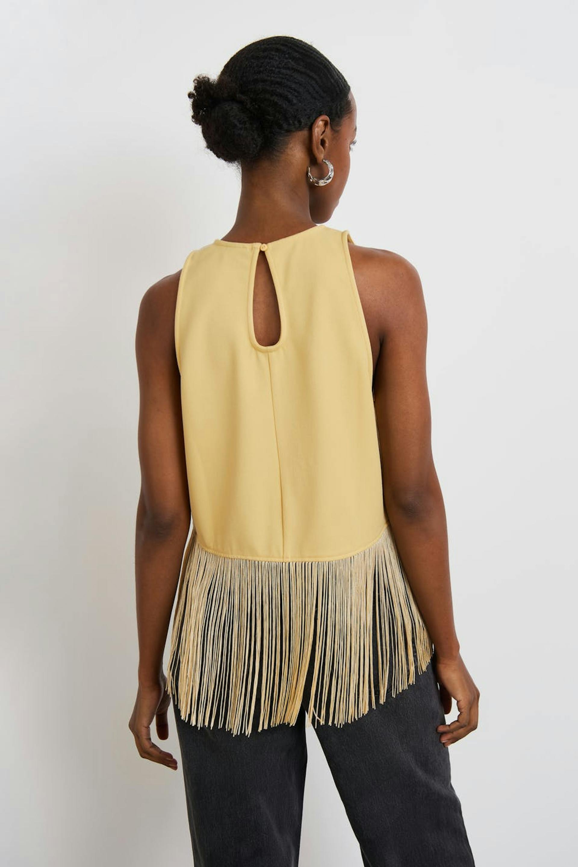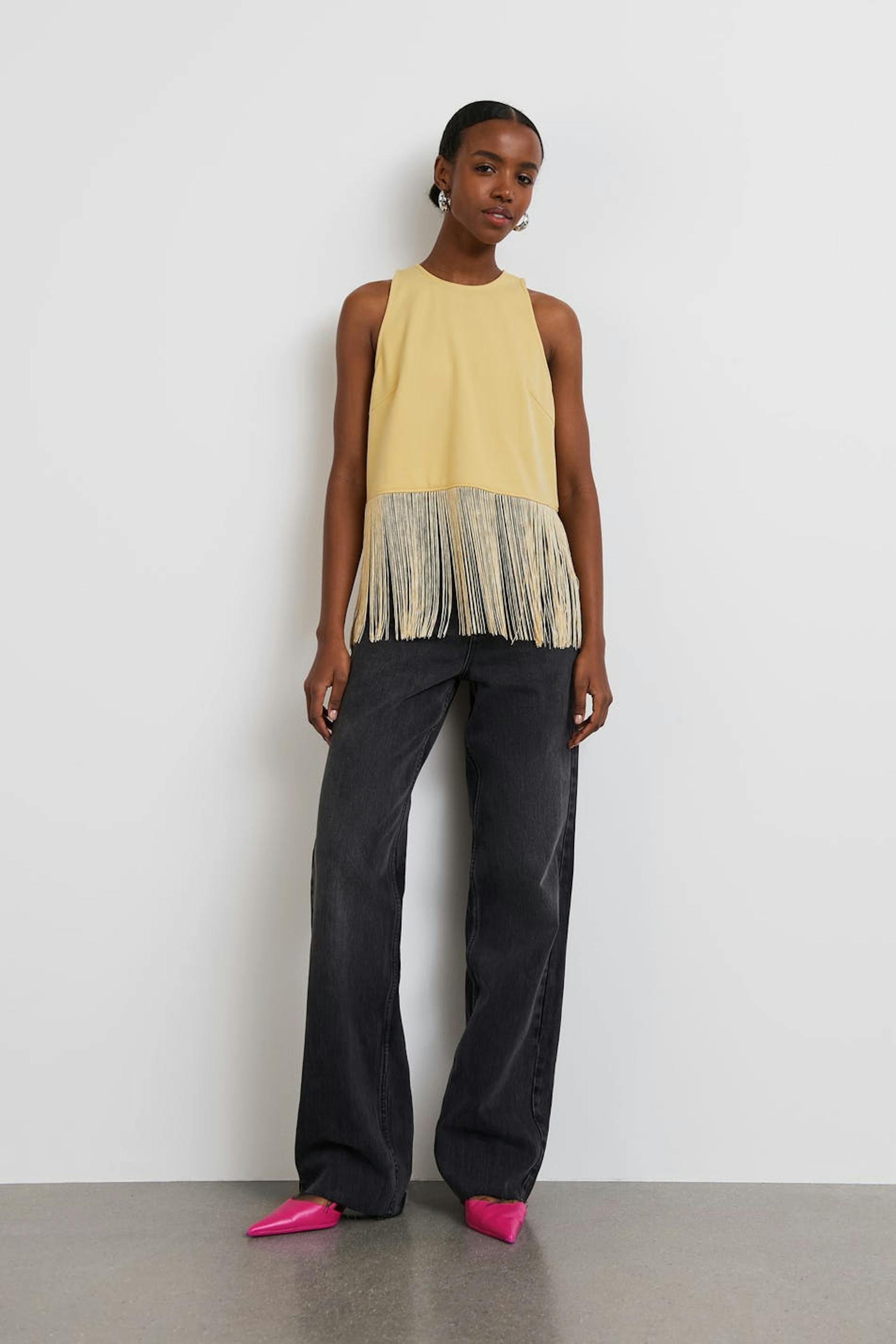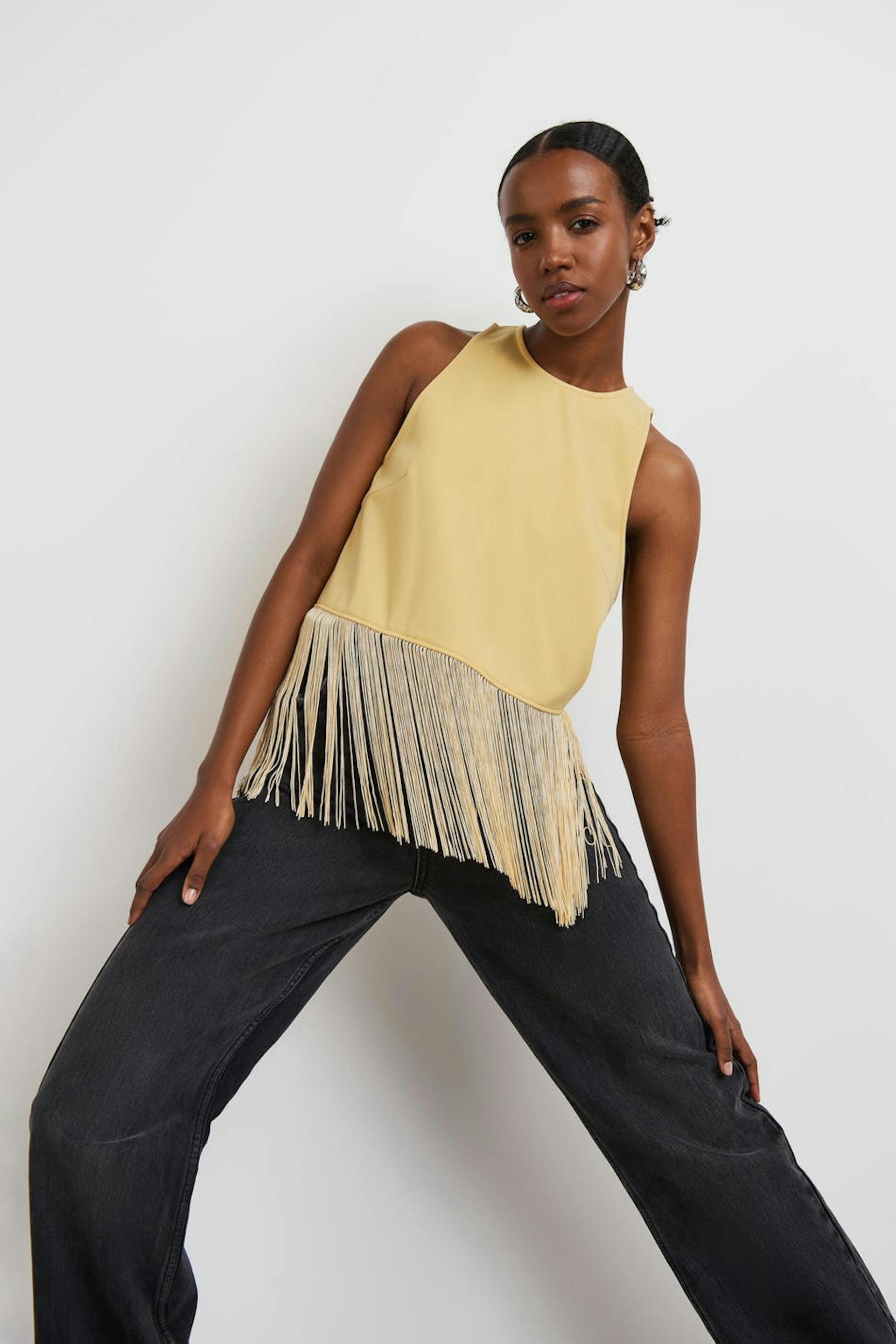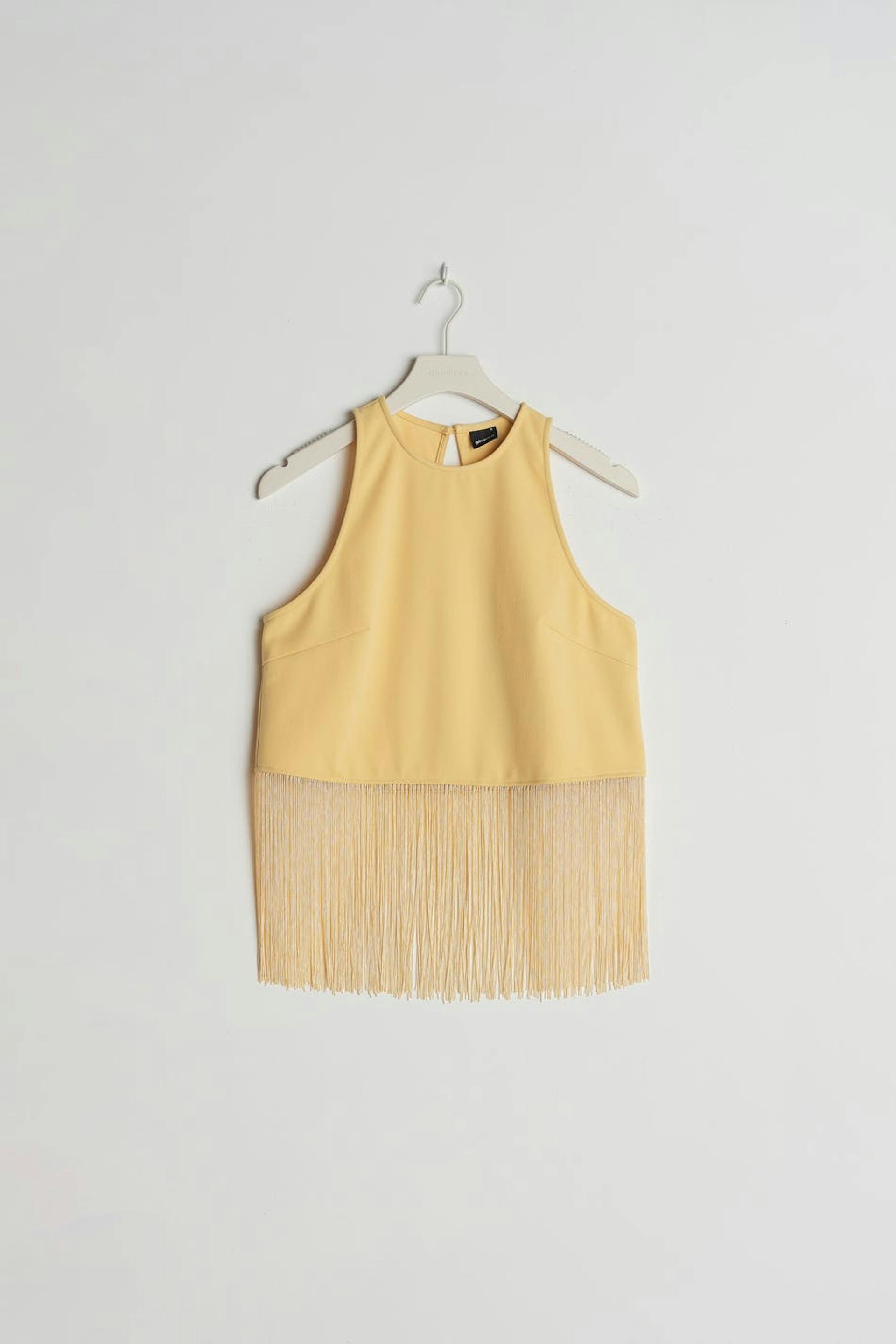 Ärmlös topp i tjockare sweatshirtkvalitet. Toppen är gul och har fransar på nederfållen. Den har en rund halsringning och en knäppning i ryggen.