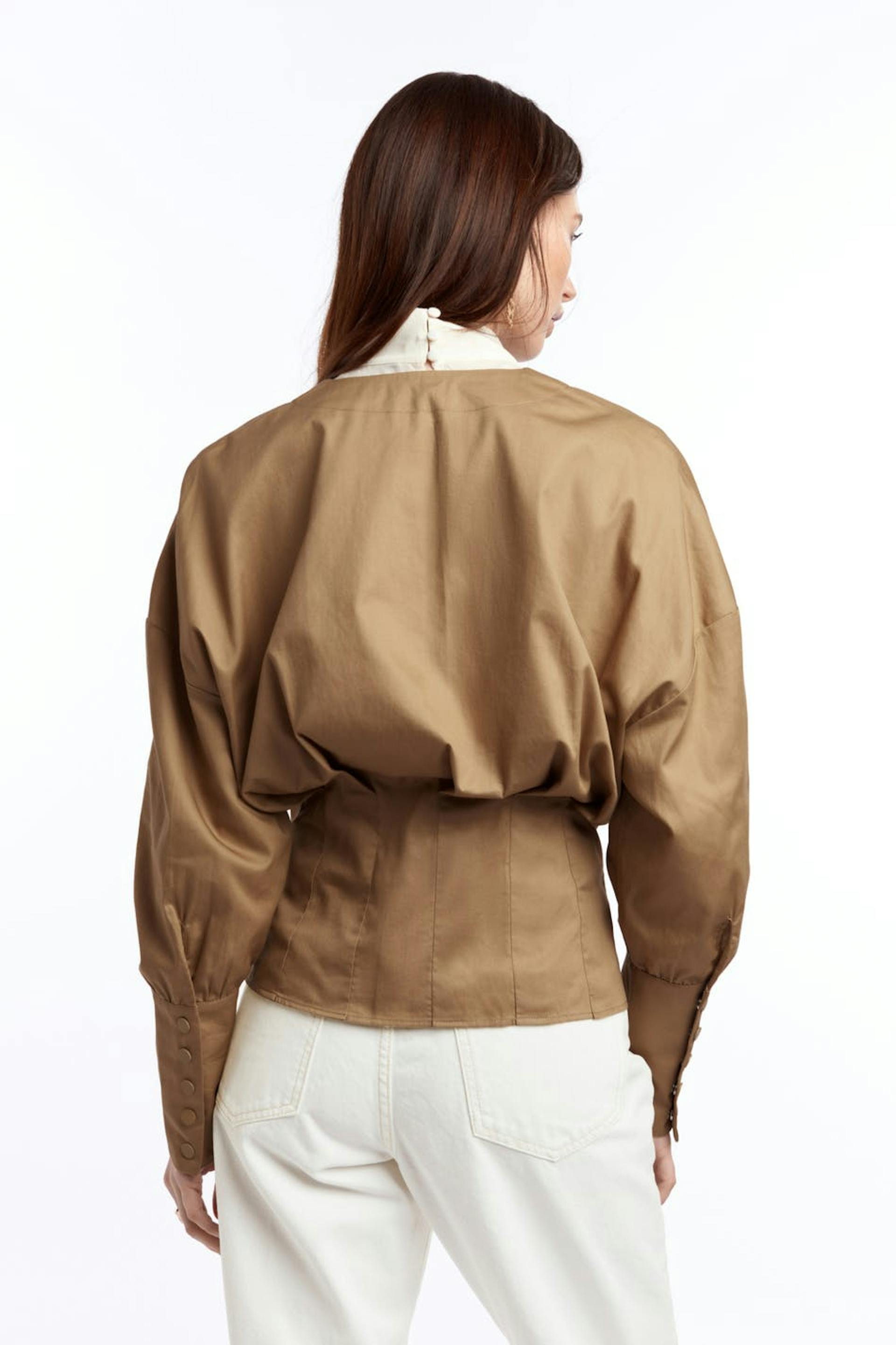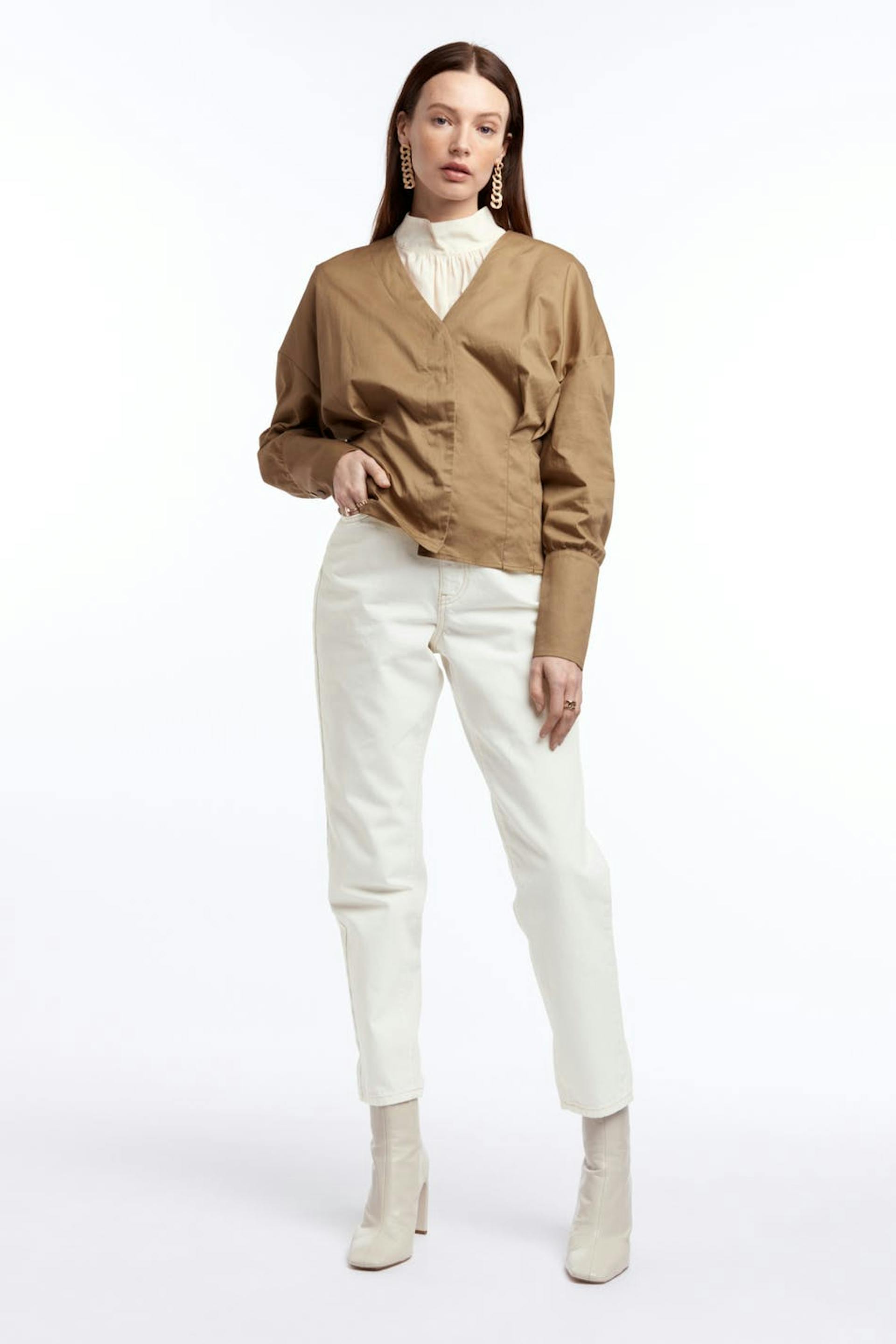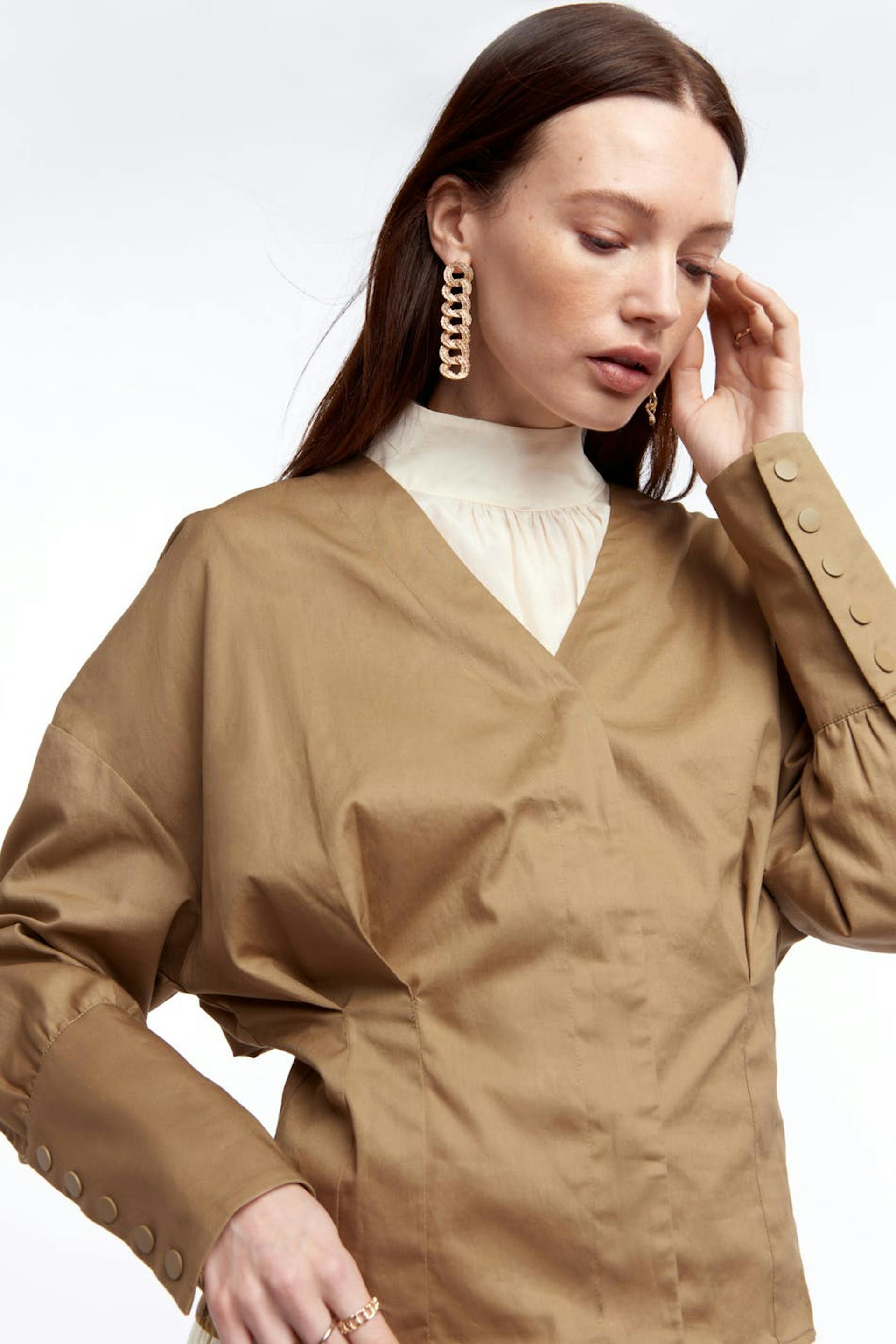 Blus med en dold knäppning framtill. Blusen är beige och har en v-ringning. Den har en insydd midja och knappar vid ärmsluten.