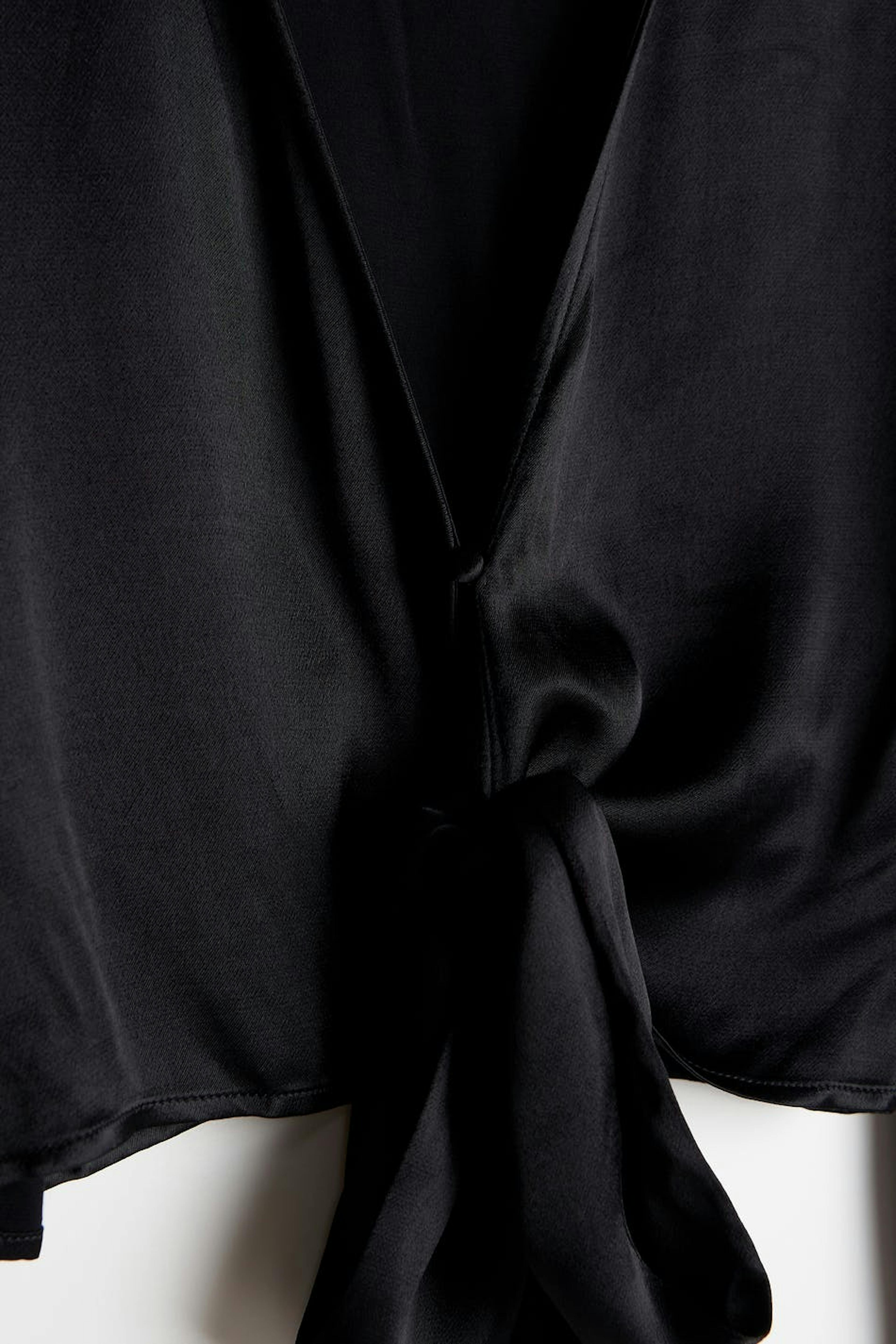 Skjorta i satin med en croppad längd. Skjortan är perfekt för festen, svart och långärmad. Den har en v-ringning med krokstängning och knytband framtill. Kan knytas på olika sätt.