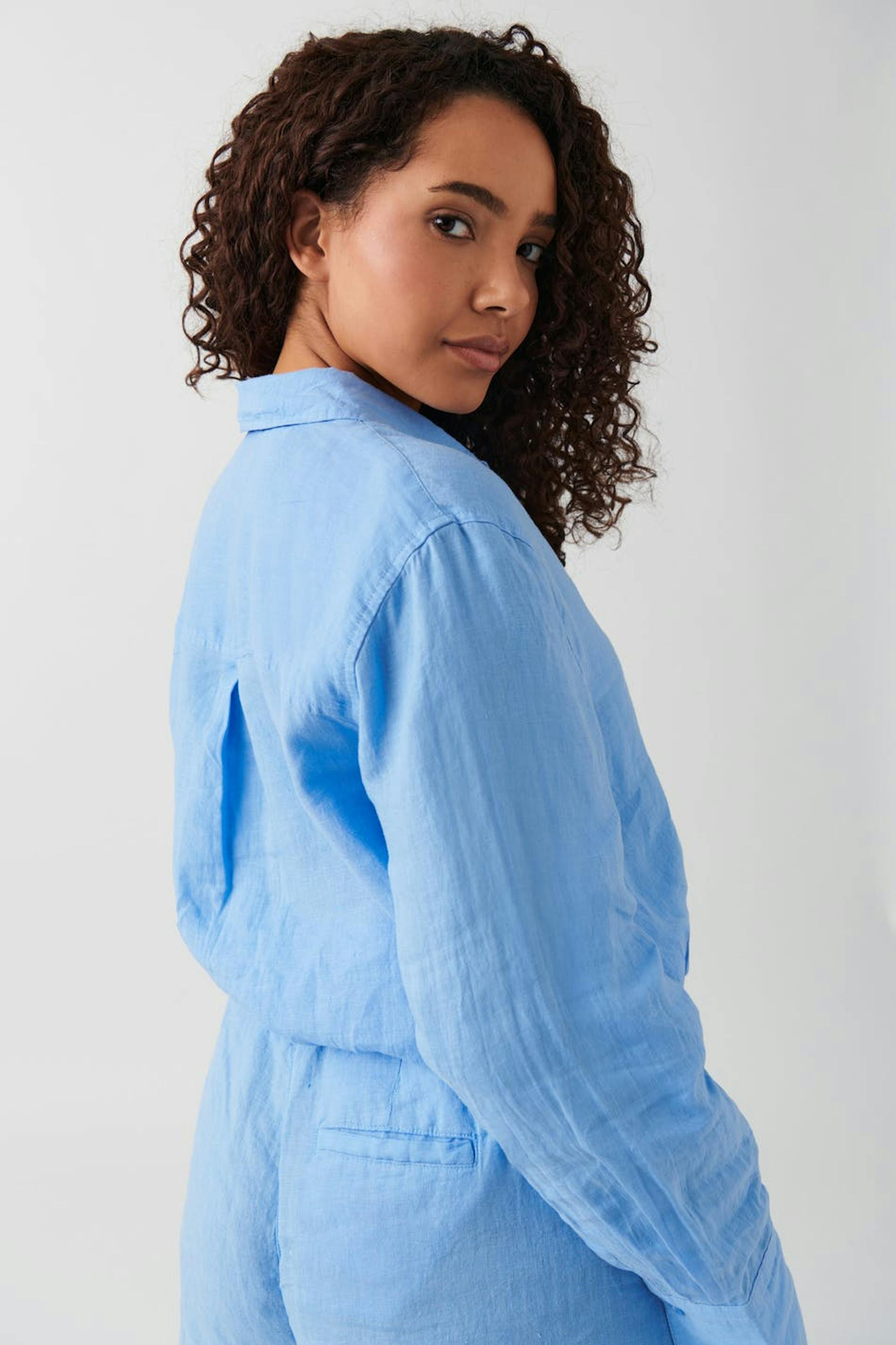 Linneskjorta med oversize fit. Skjortan är ljusblå och har knäppning fram. Den har krage, okavskärning med veck bak och lång ärm med knapp och manschett.