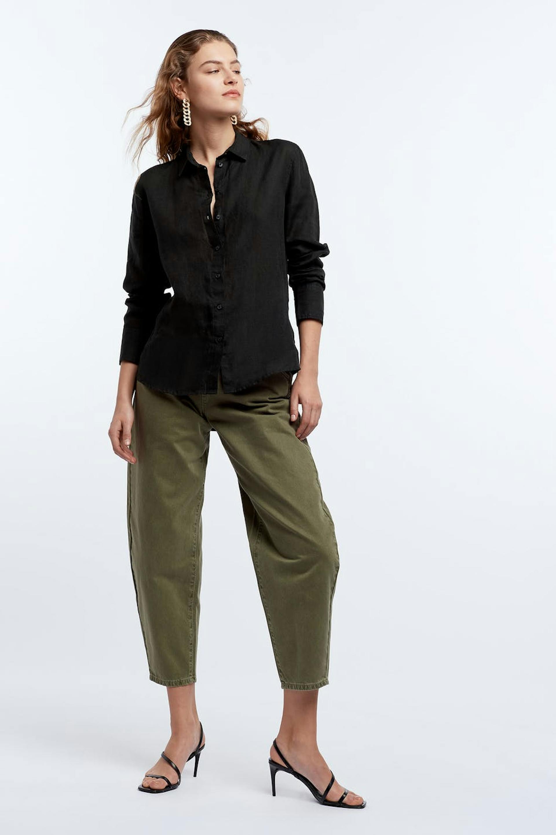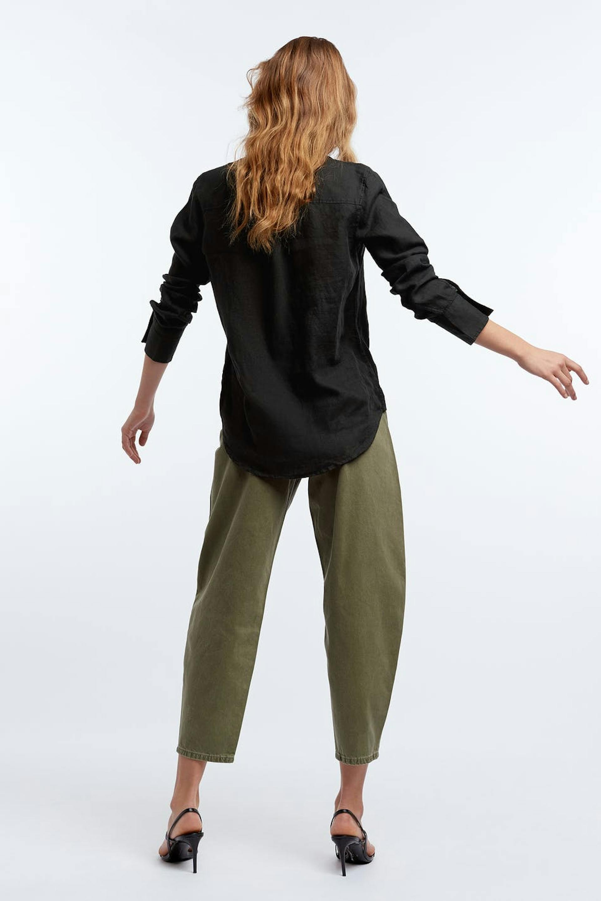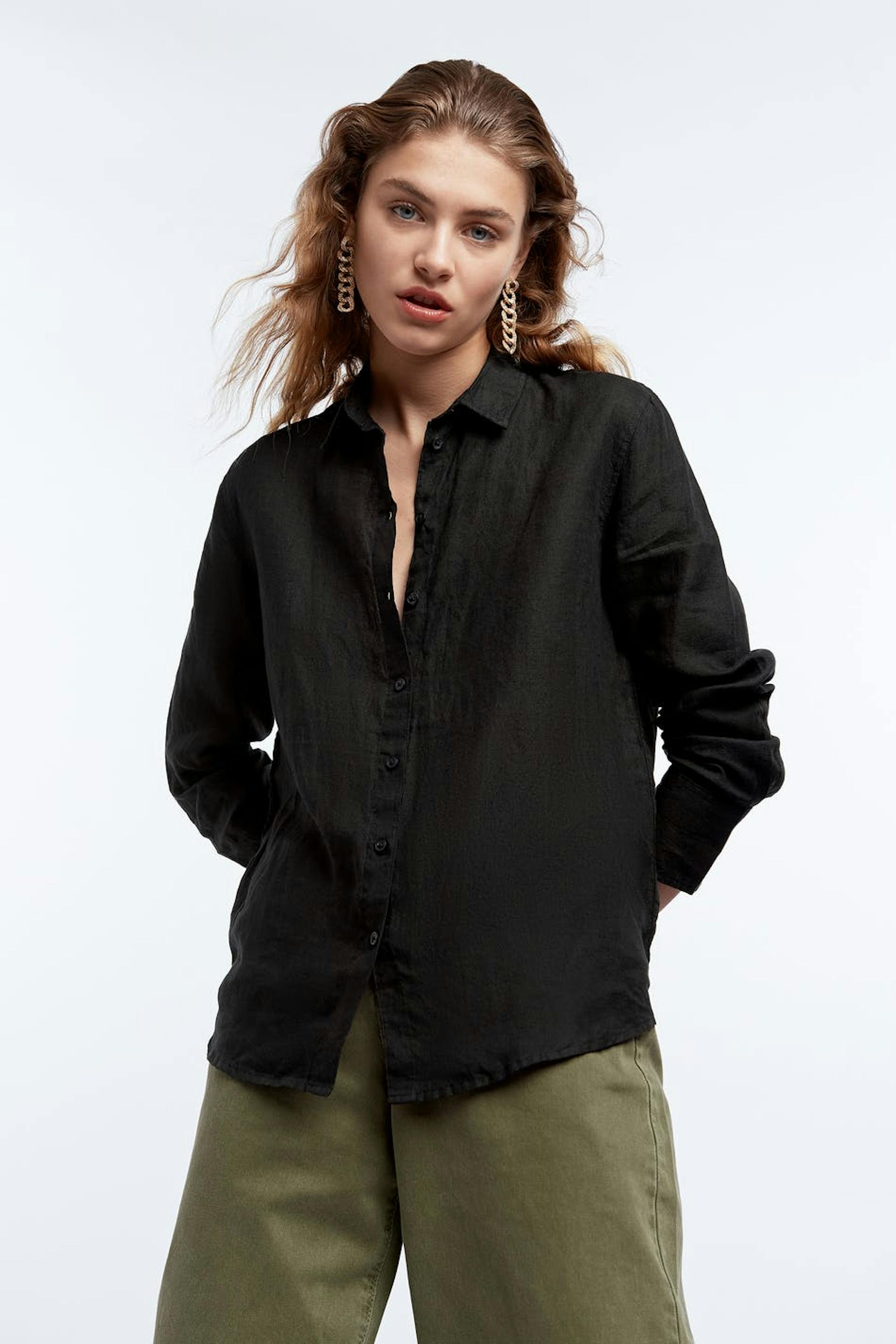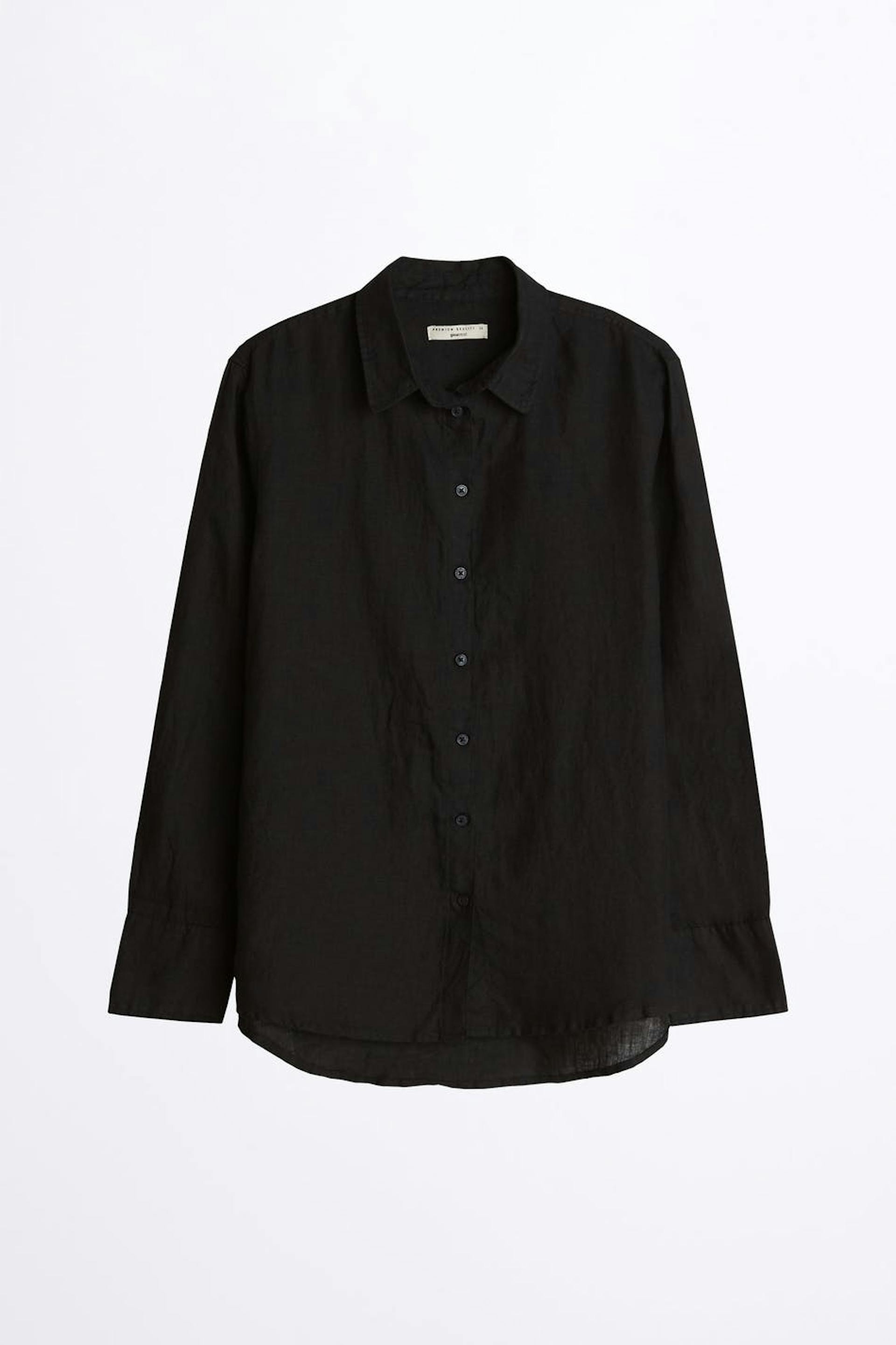 Långärmad skjorta med en rak passform. Skjortan är svart och har en nervikt krage. Den är gjord av linne och har knappar framtill och en rundad nederkant.
