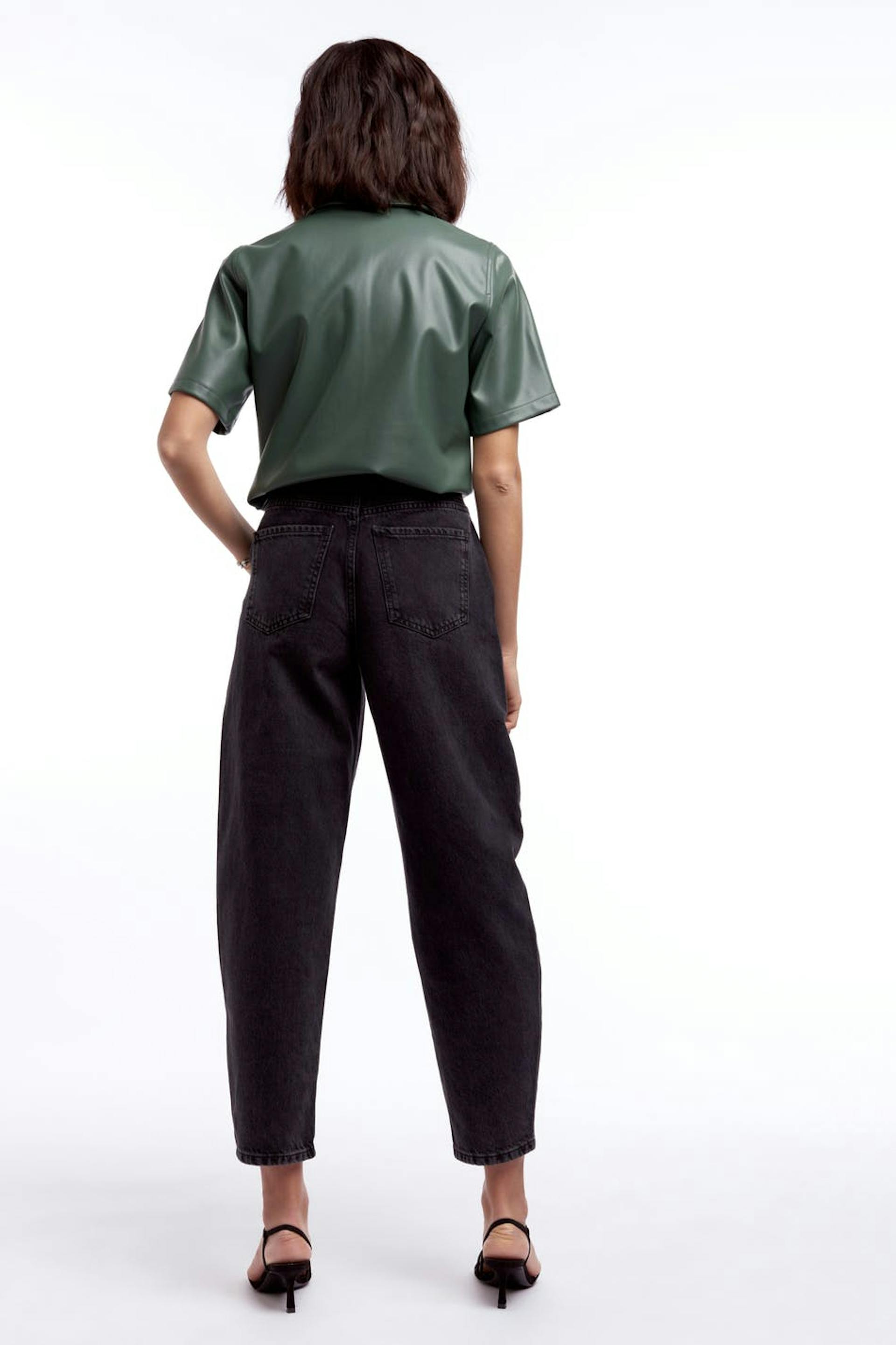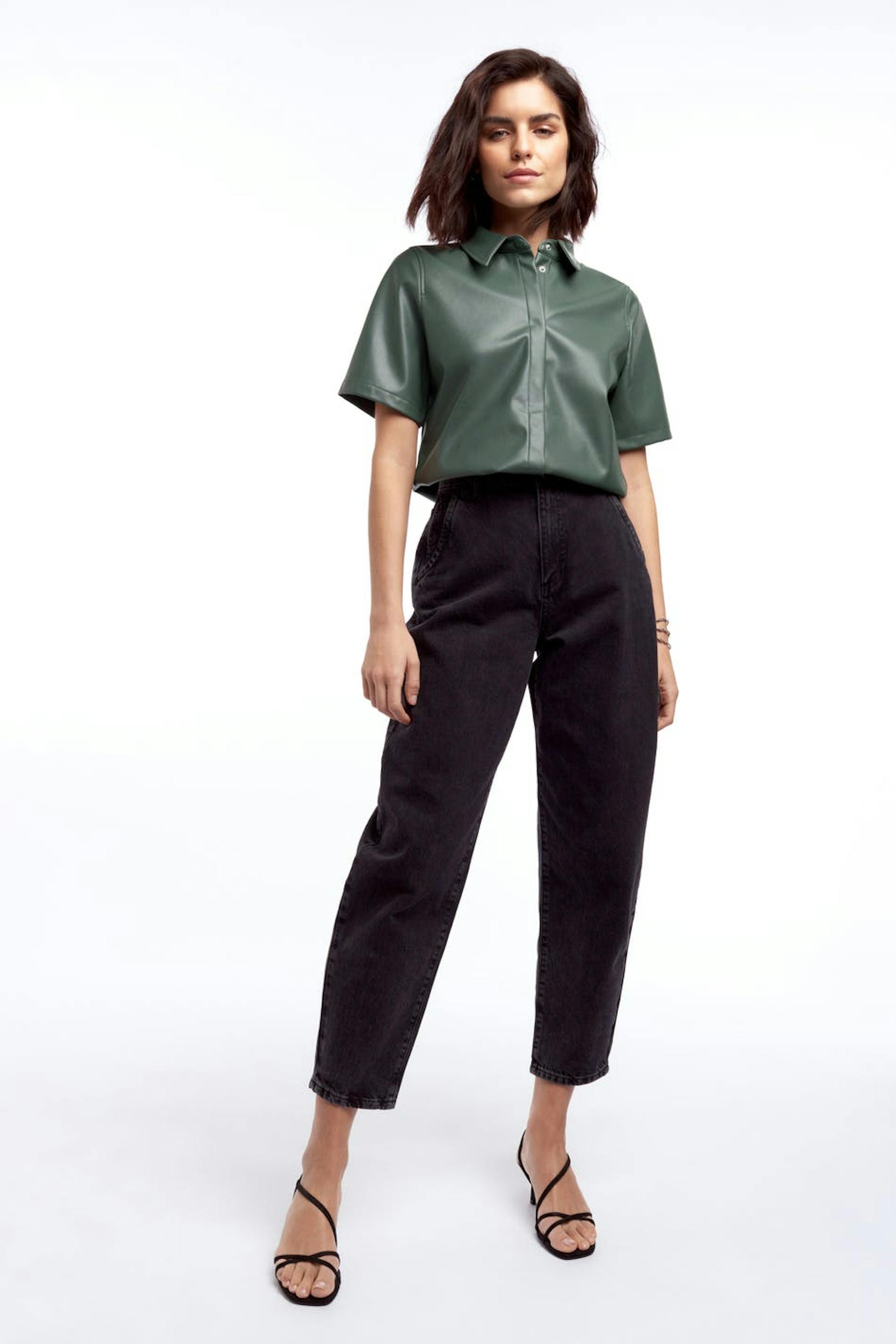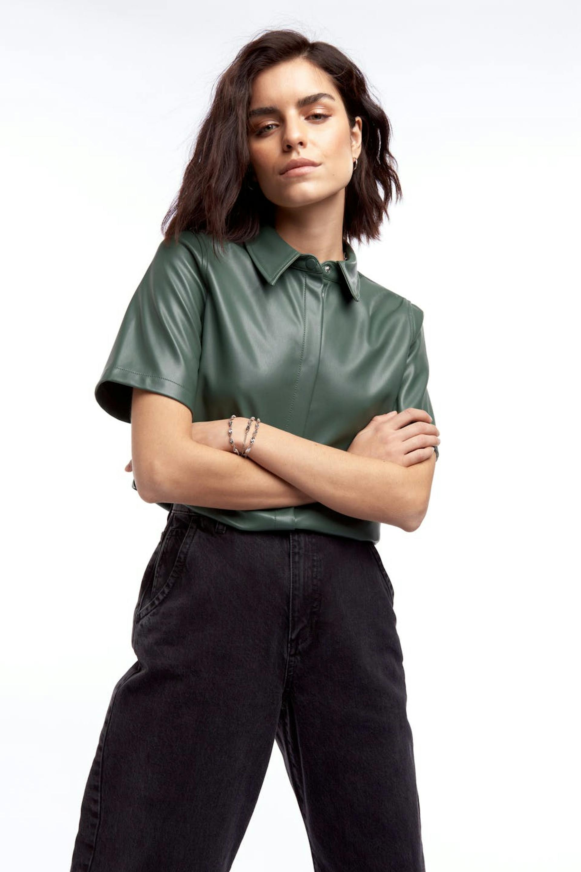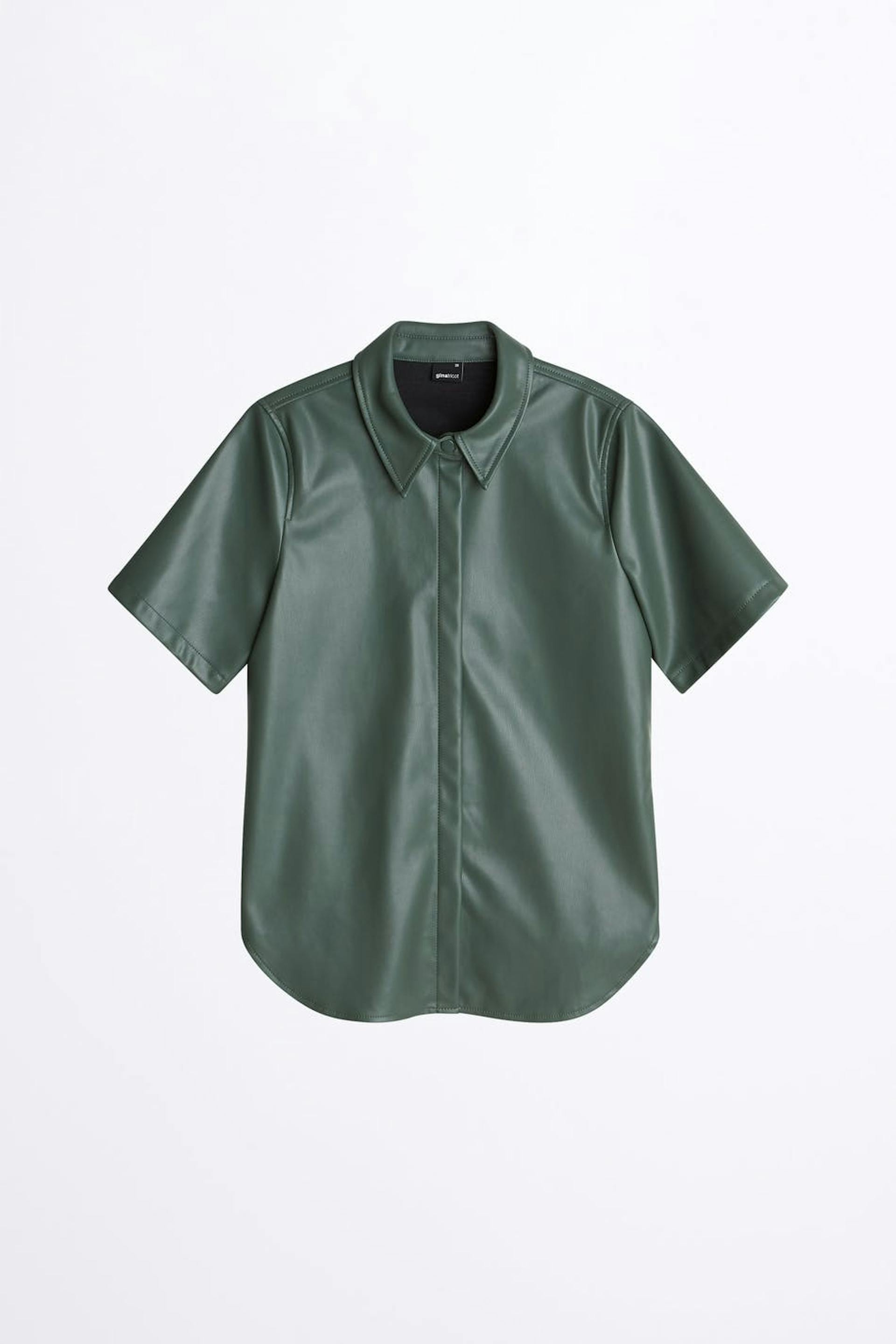 Kortärmad skjorta med oversize fit. Skjortan är grön och har en dold knäppning med en tryckknapp. Den är gjord av PU och har en rundad nederkant.