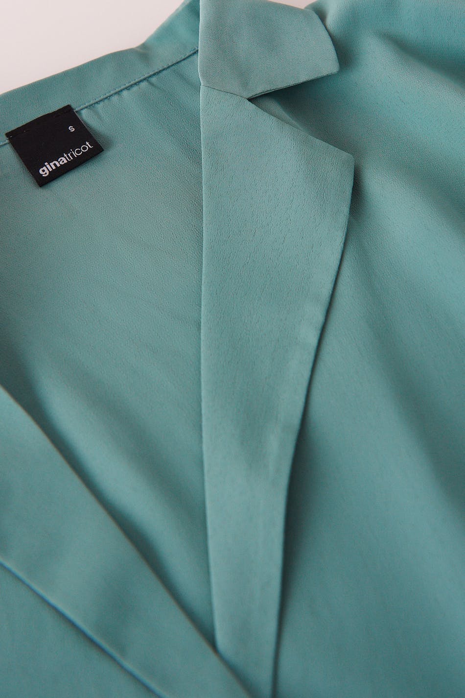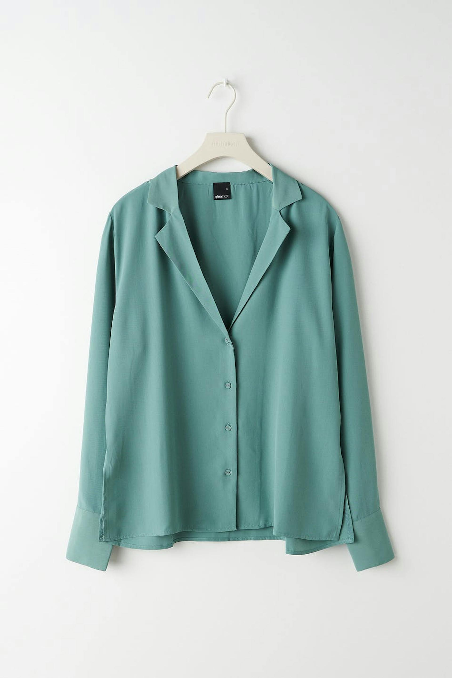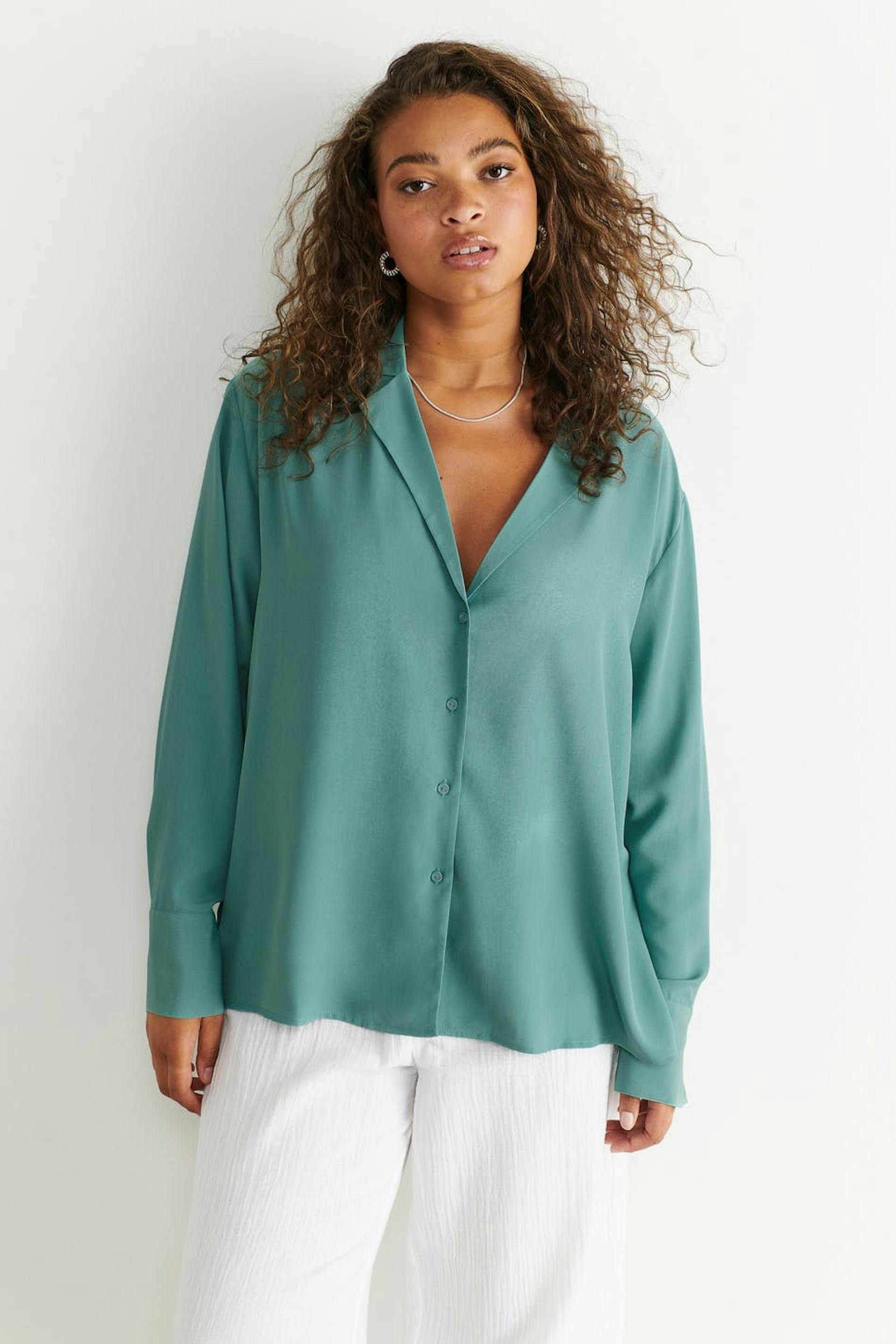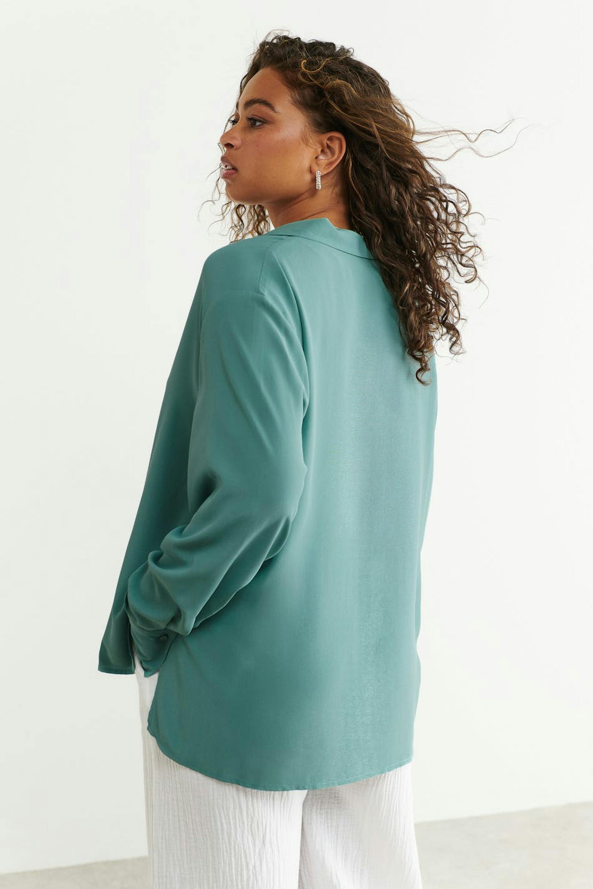 Långärmad skjorta med en boxig passform. Skjortan är blå och har en knappstängning framtill. Den har manschetter och en krage med ett slag.