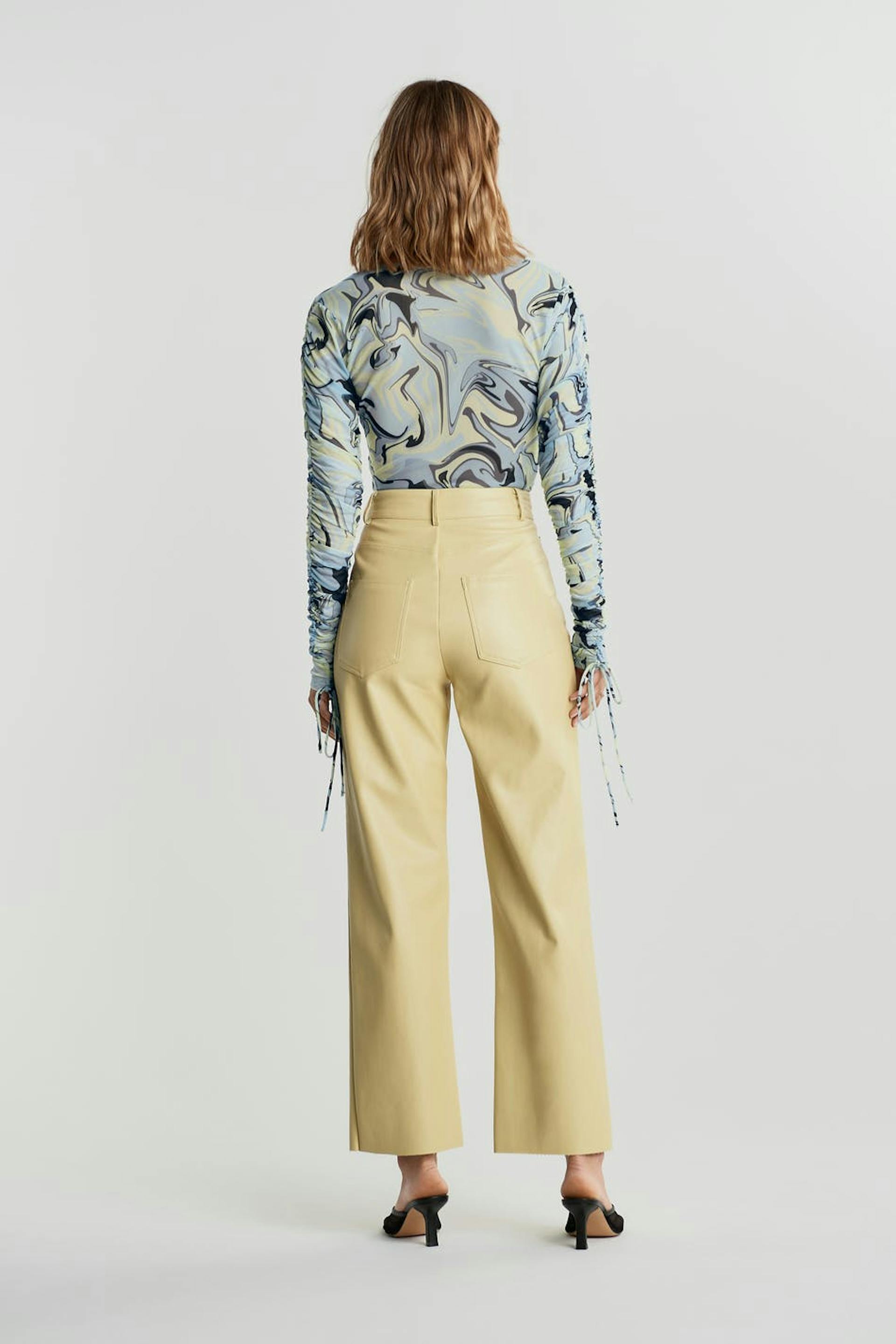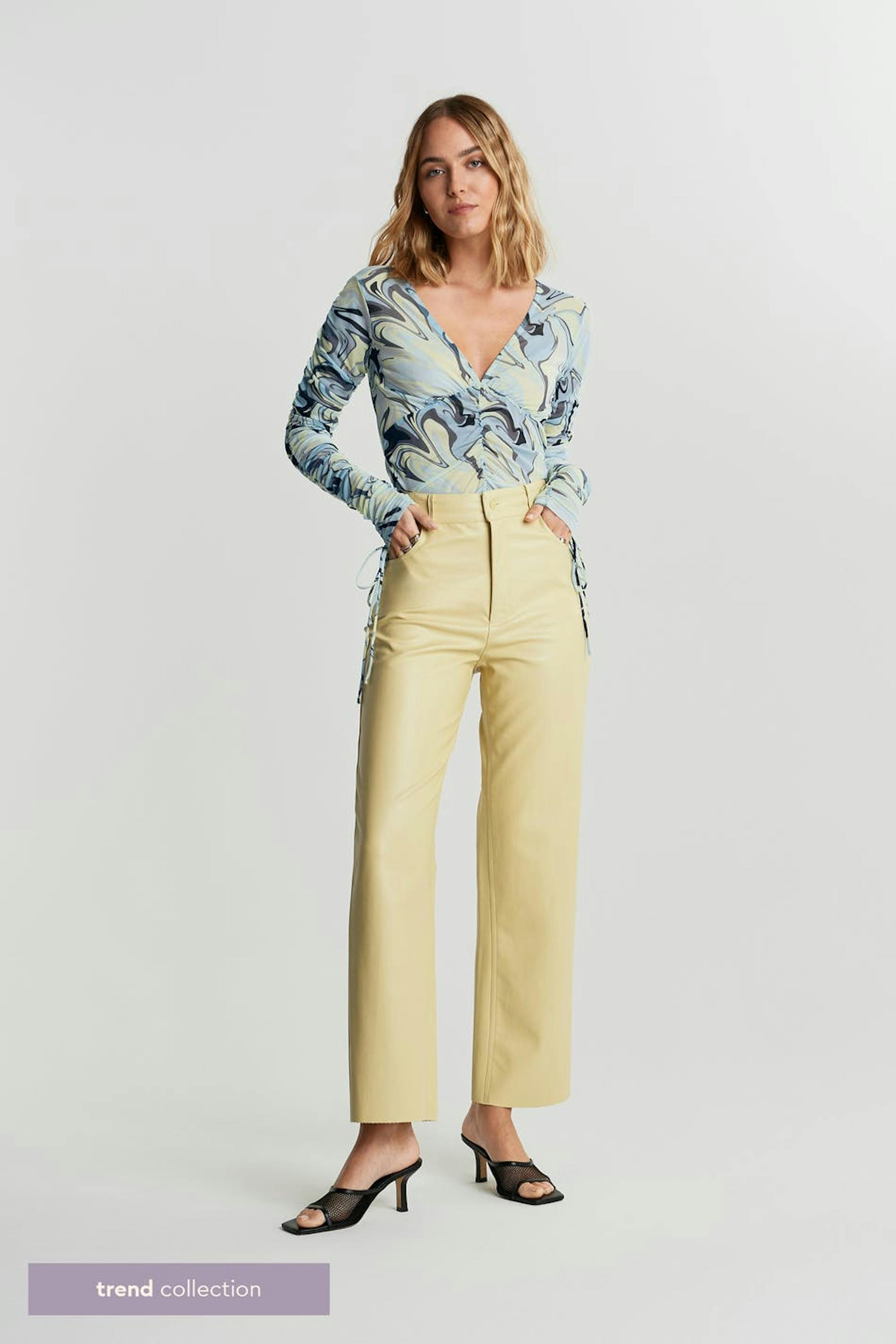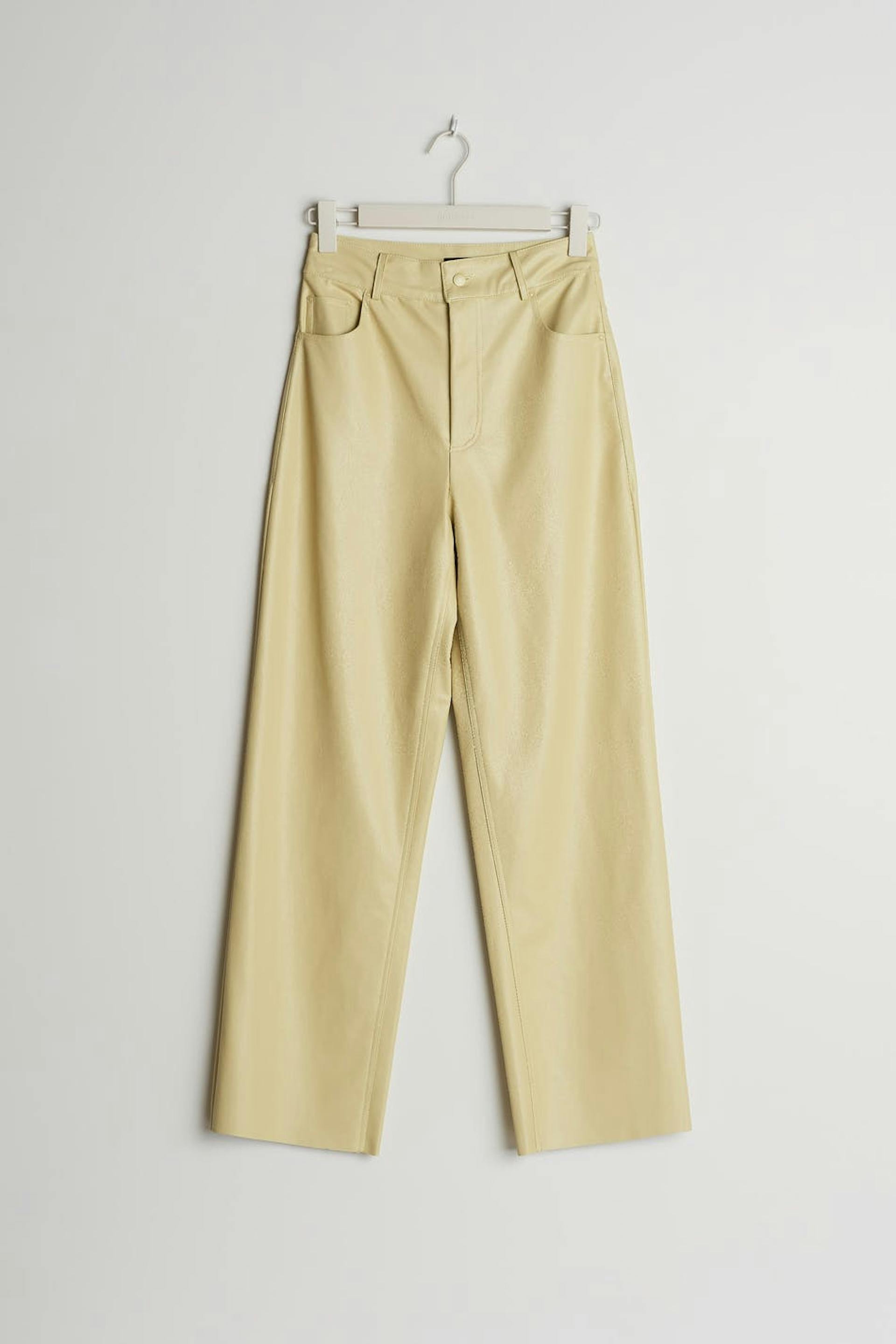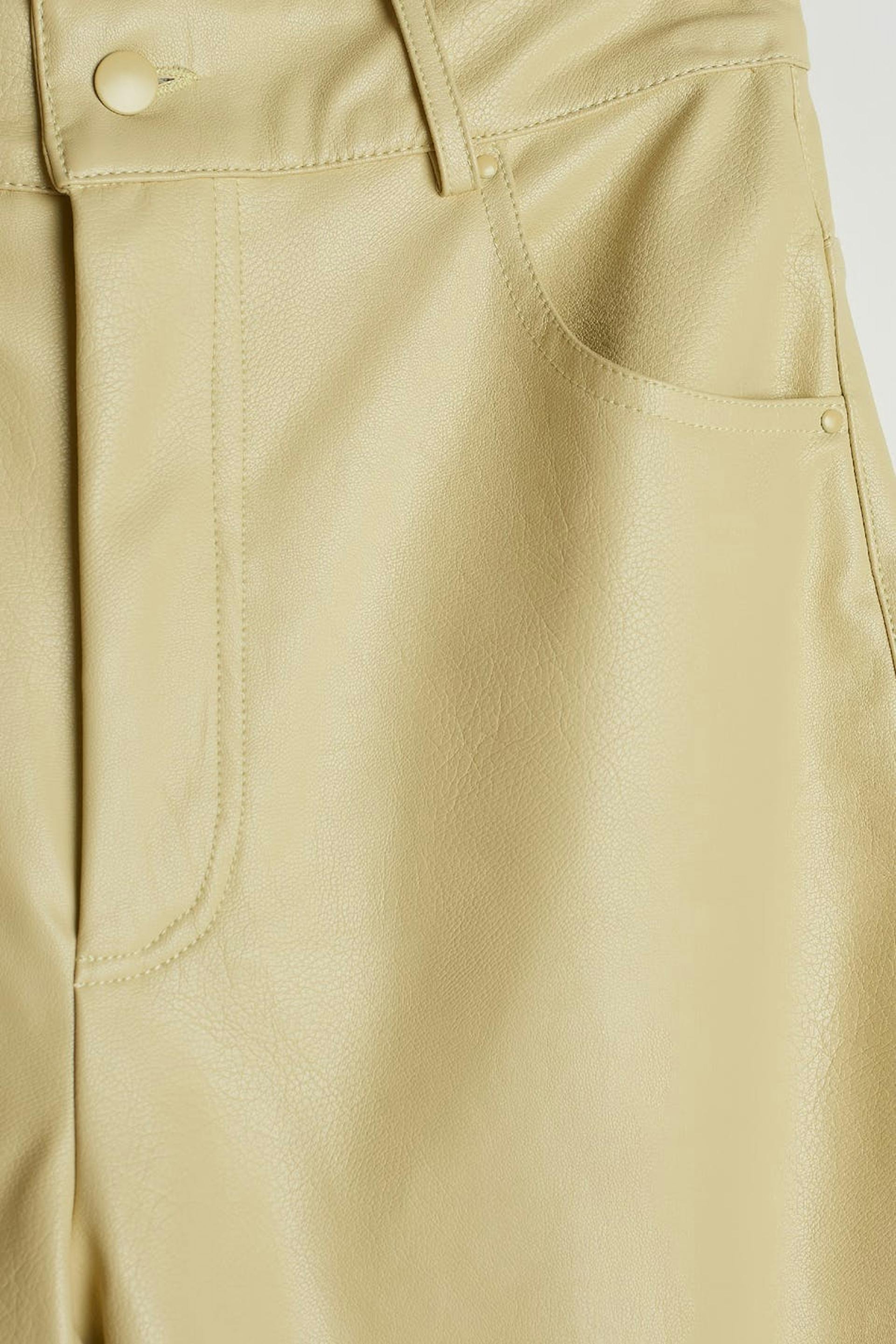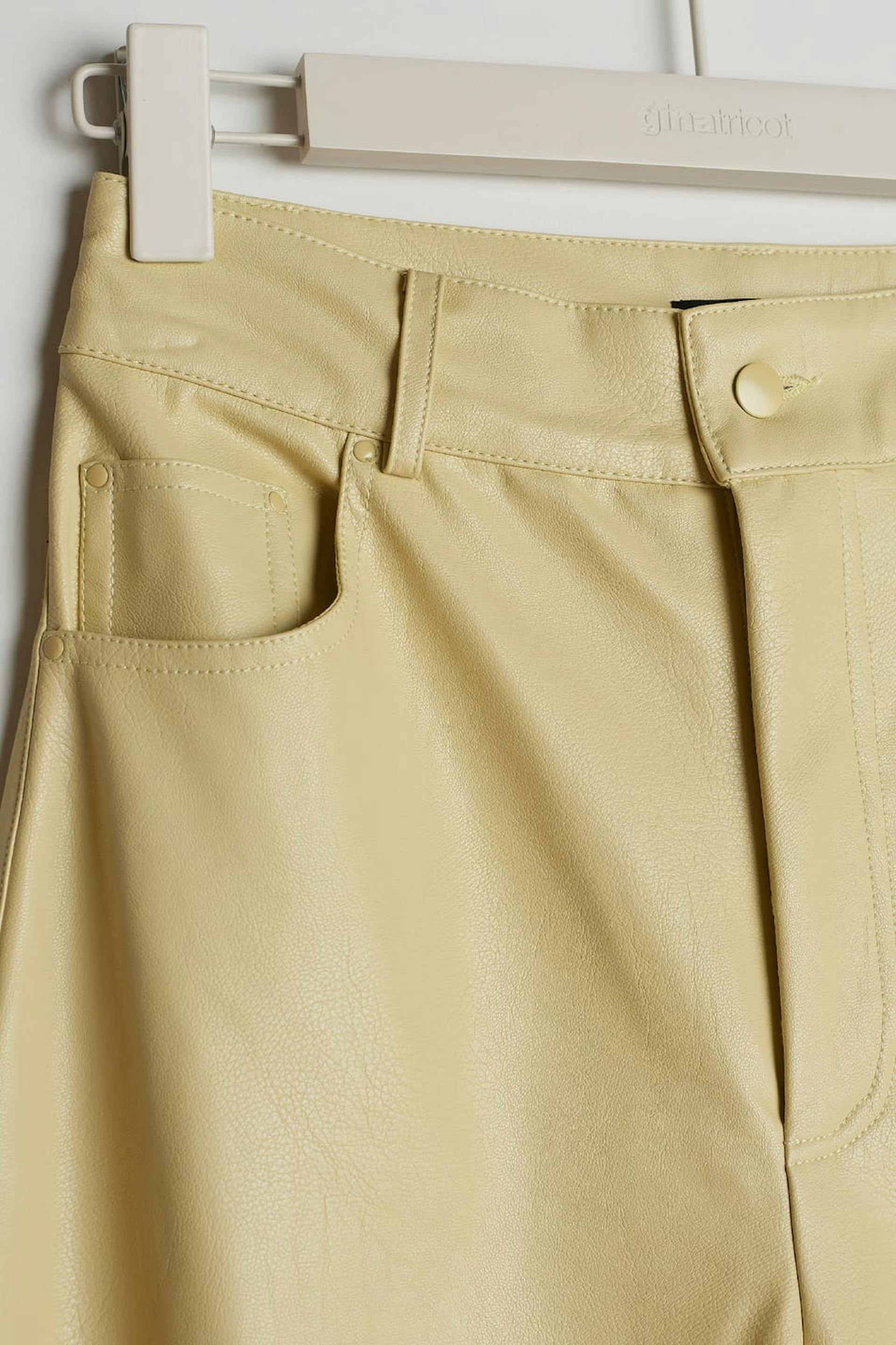 Byxor med raka byxben. Byxorna är gula och har en material i PU. De har fickor fram och baktill.