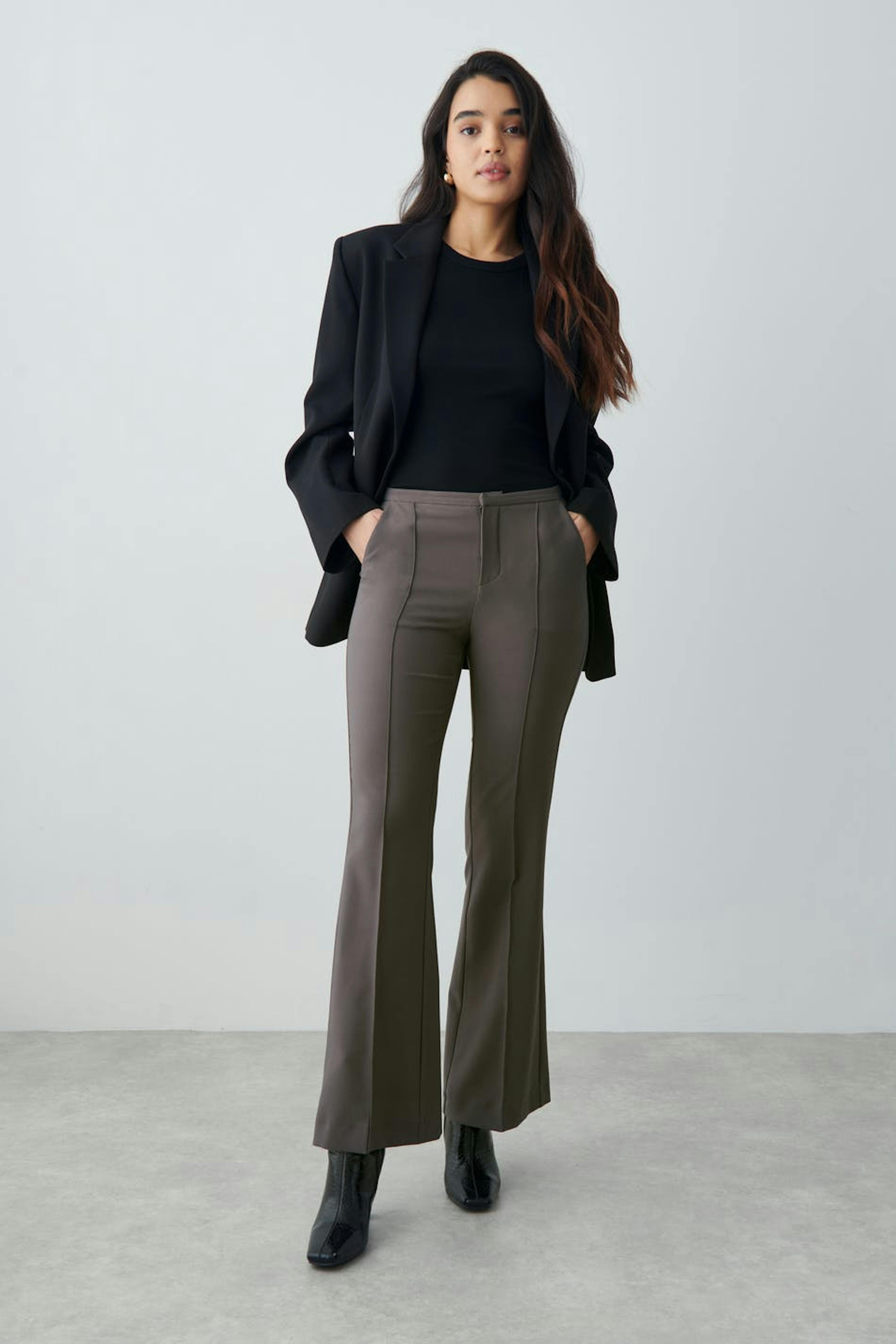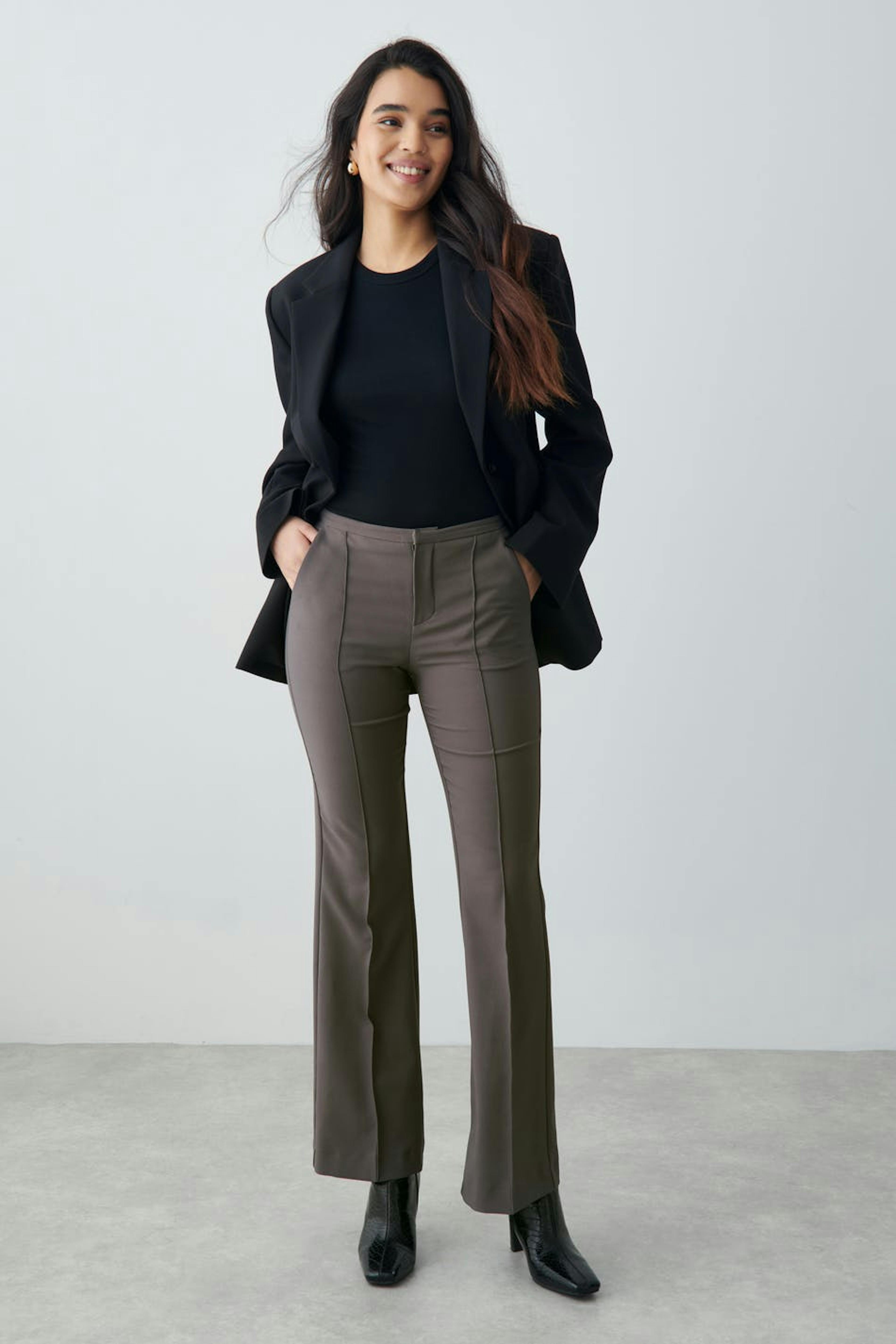 Stretchiga byxor med medelhög midja. Byxorna är gråa och har slim fit. De har utsvängda ben, sidofickor, fuskfickor bak och dragkedjegylf.