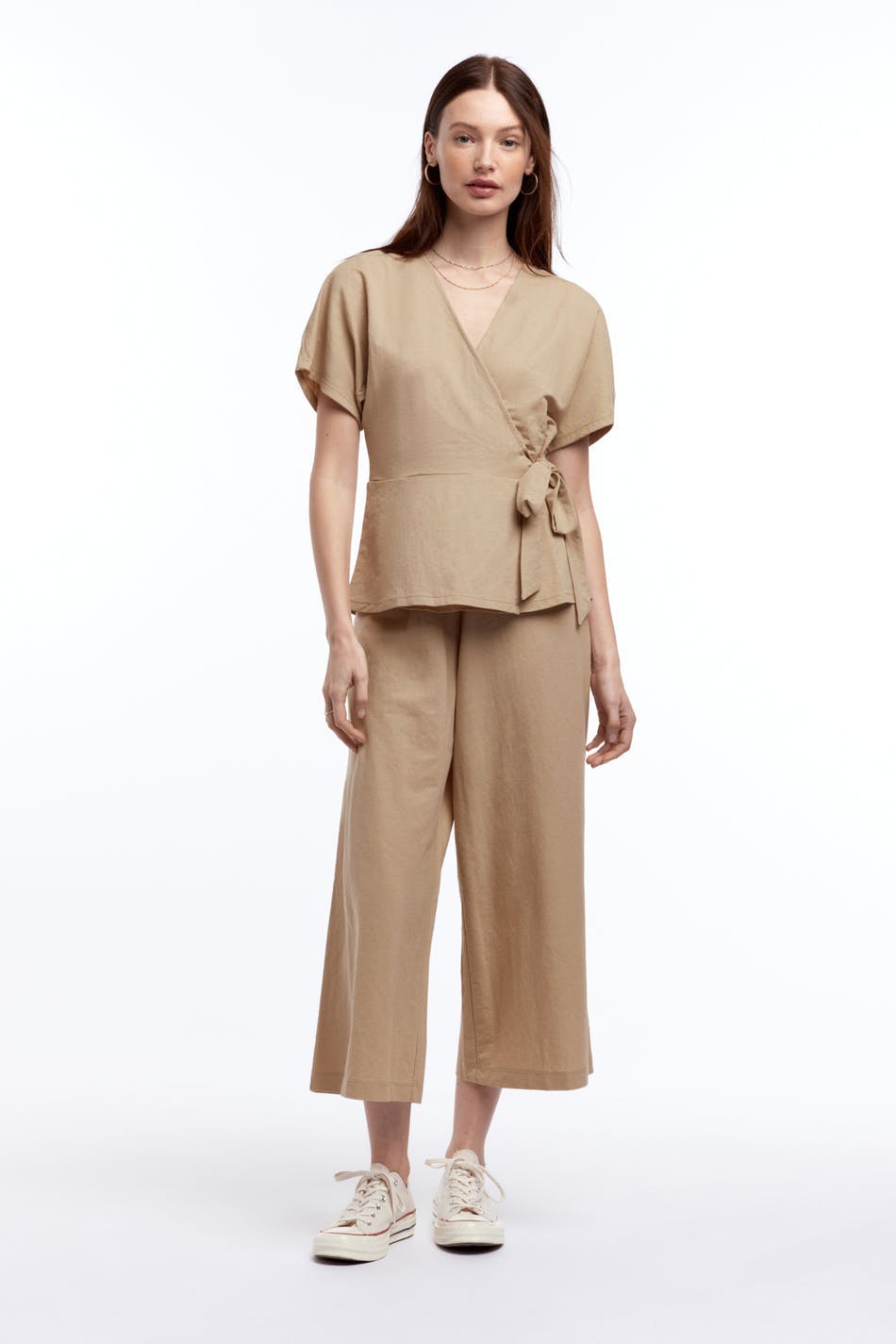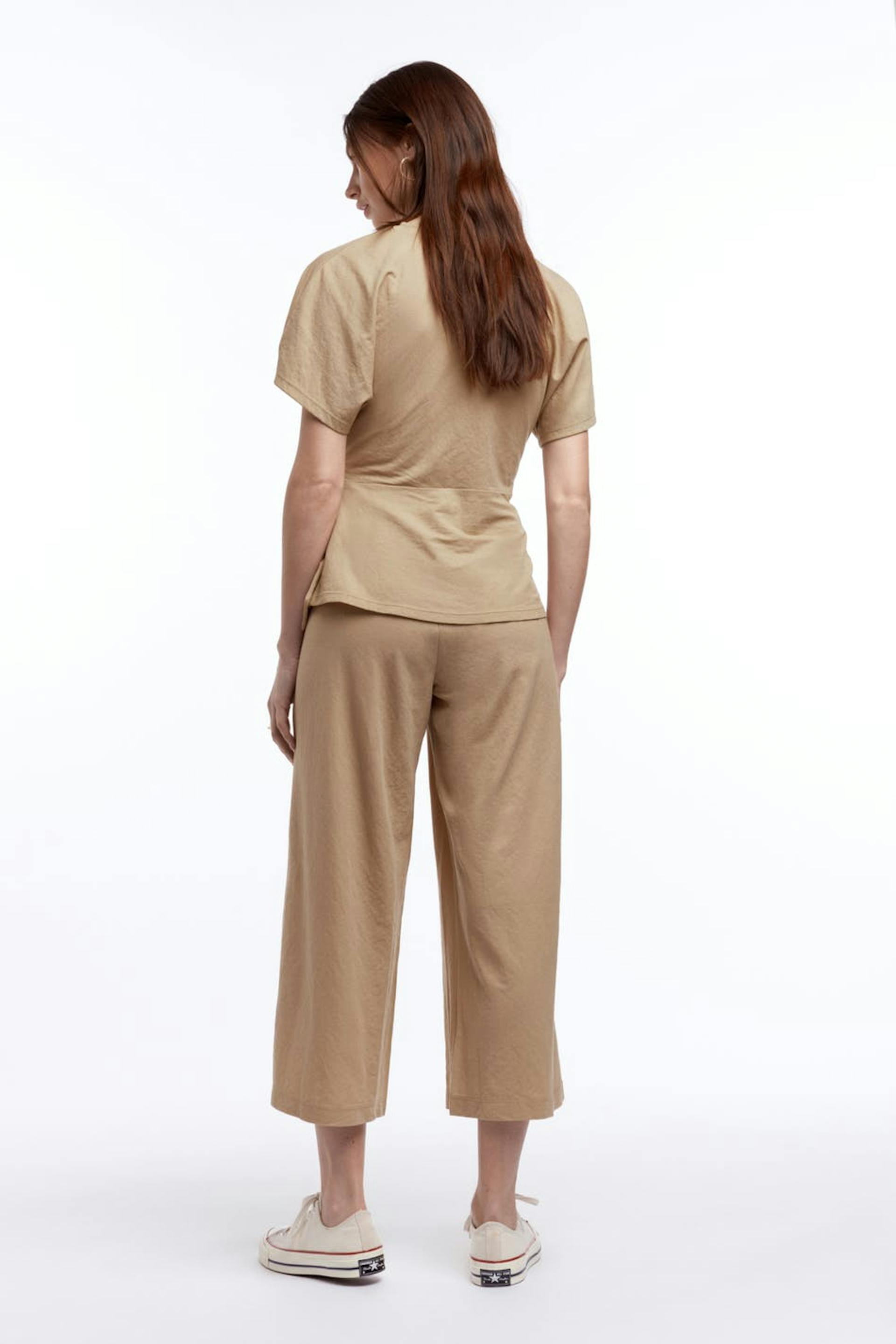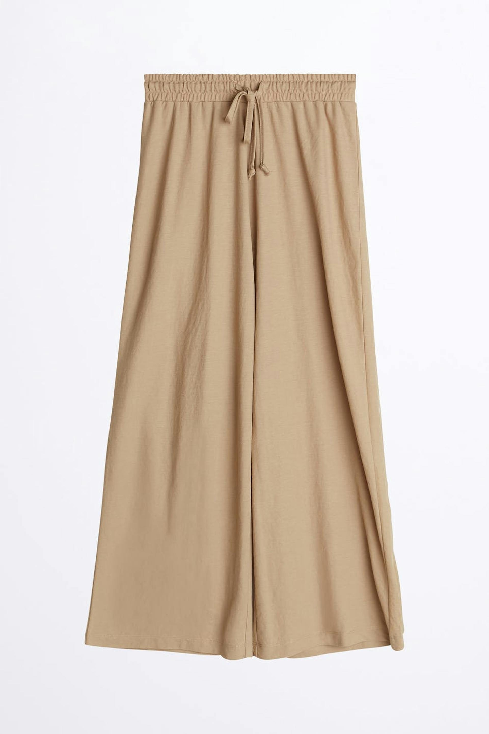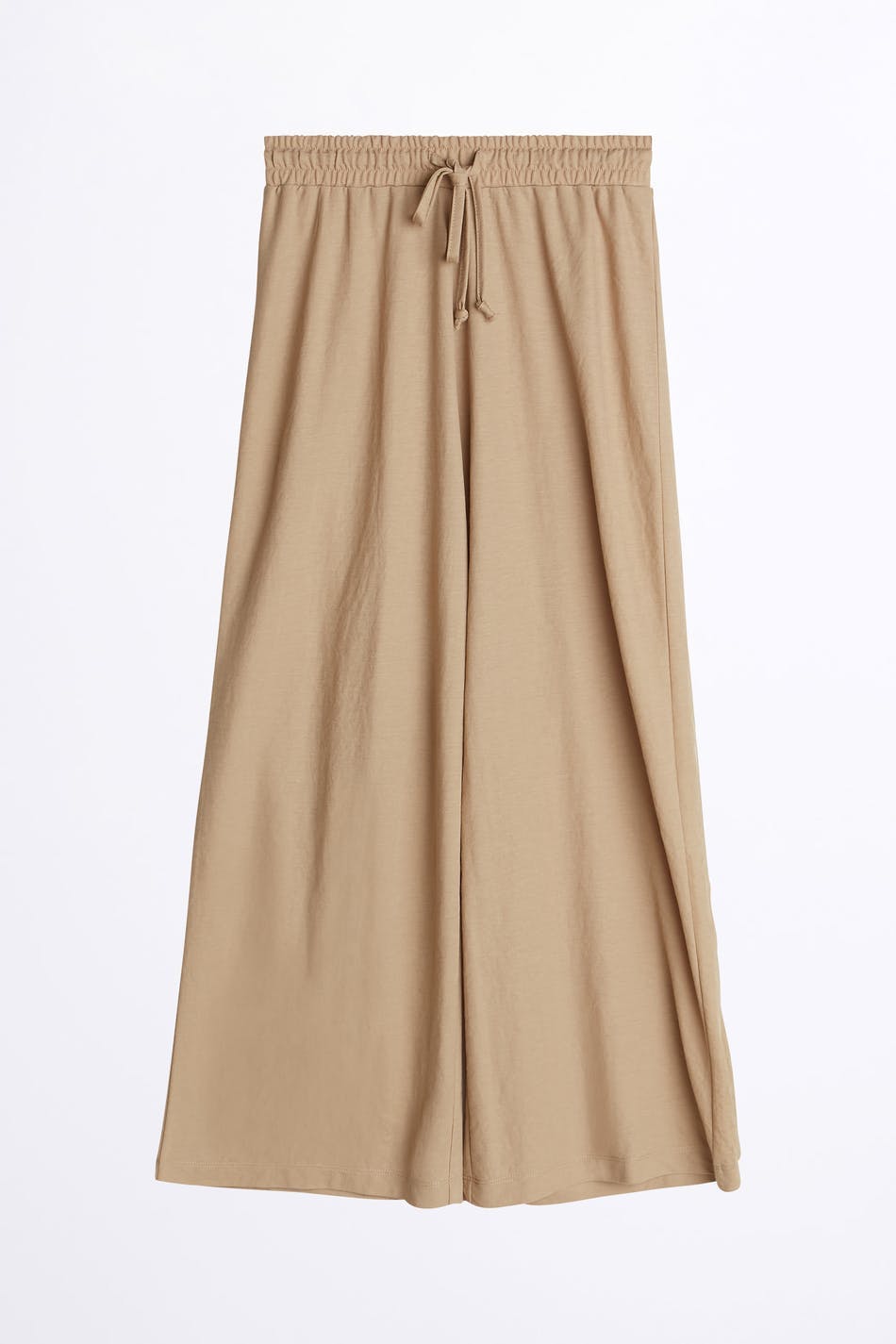 Culottes med vida byxben. Culottesen är beigea och har en midja i resår med en dragsko. De är gjorda av trikå och har en ledig passform.