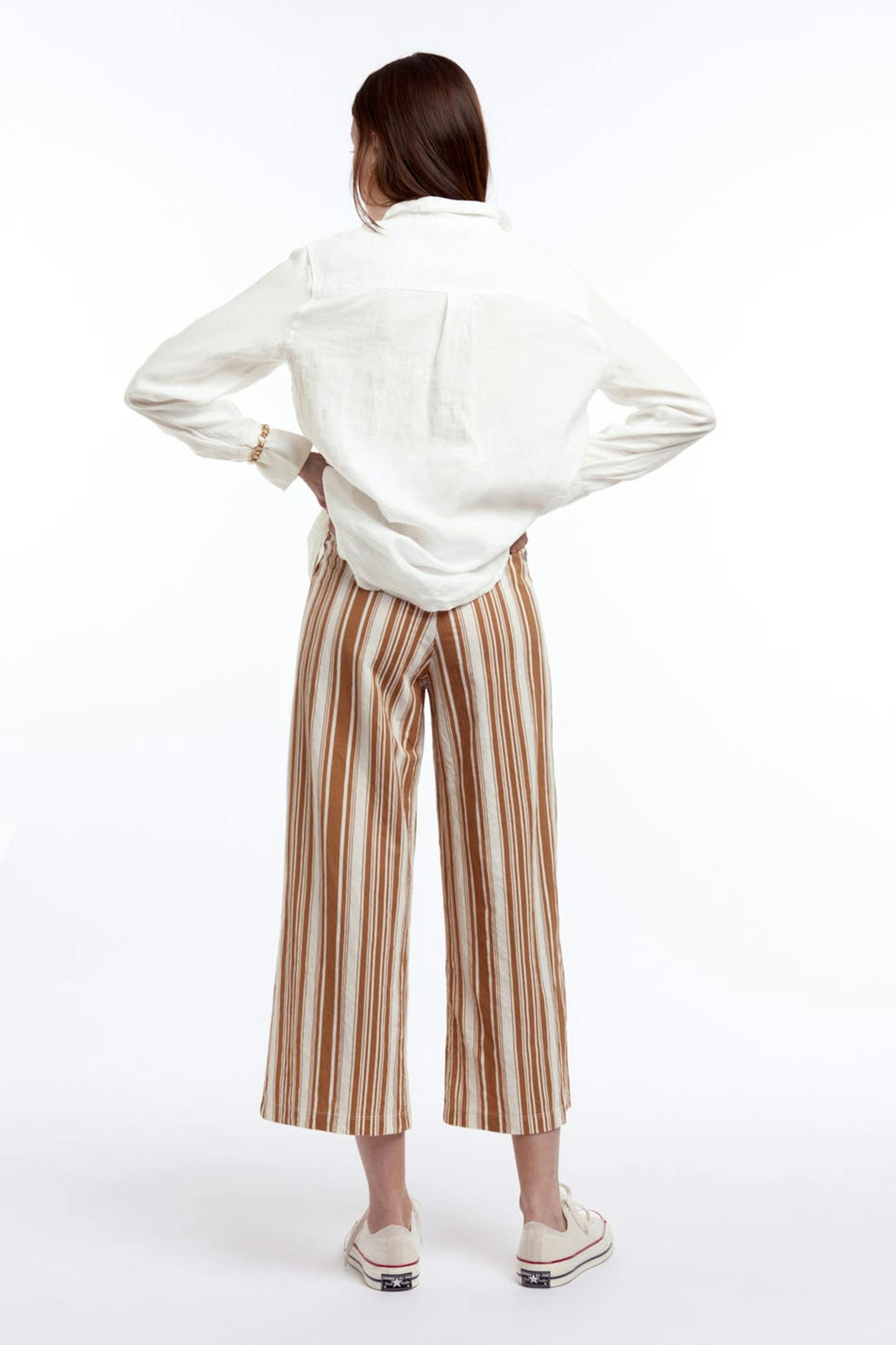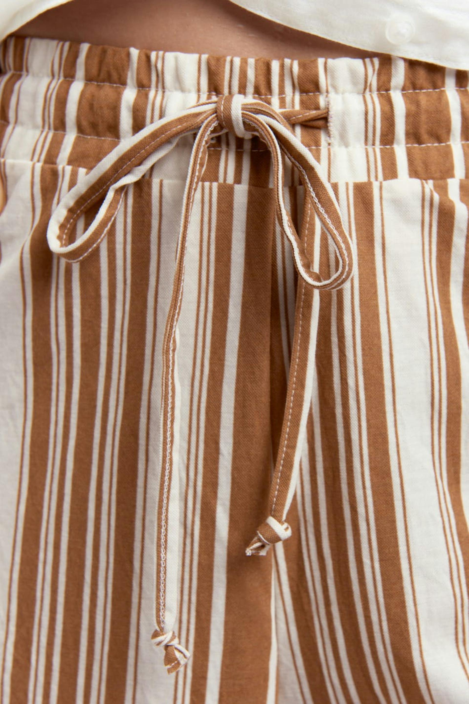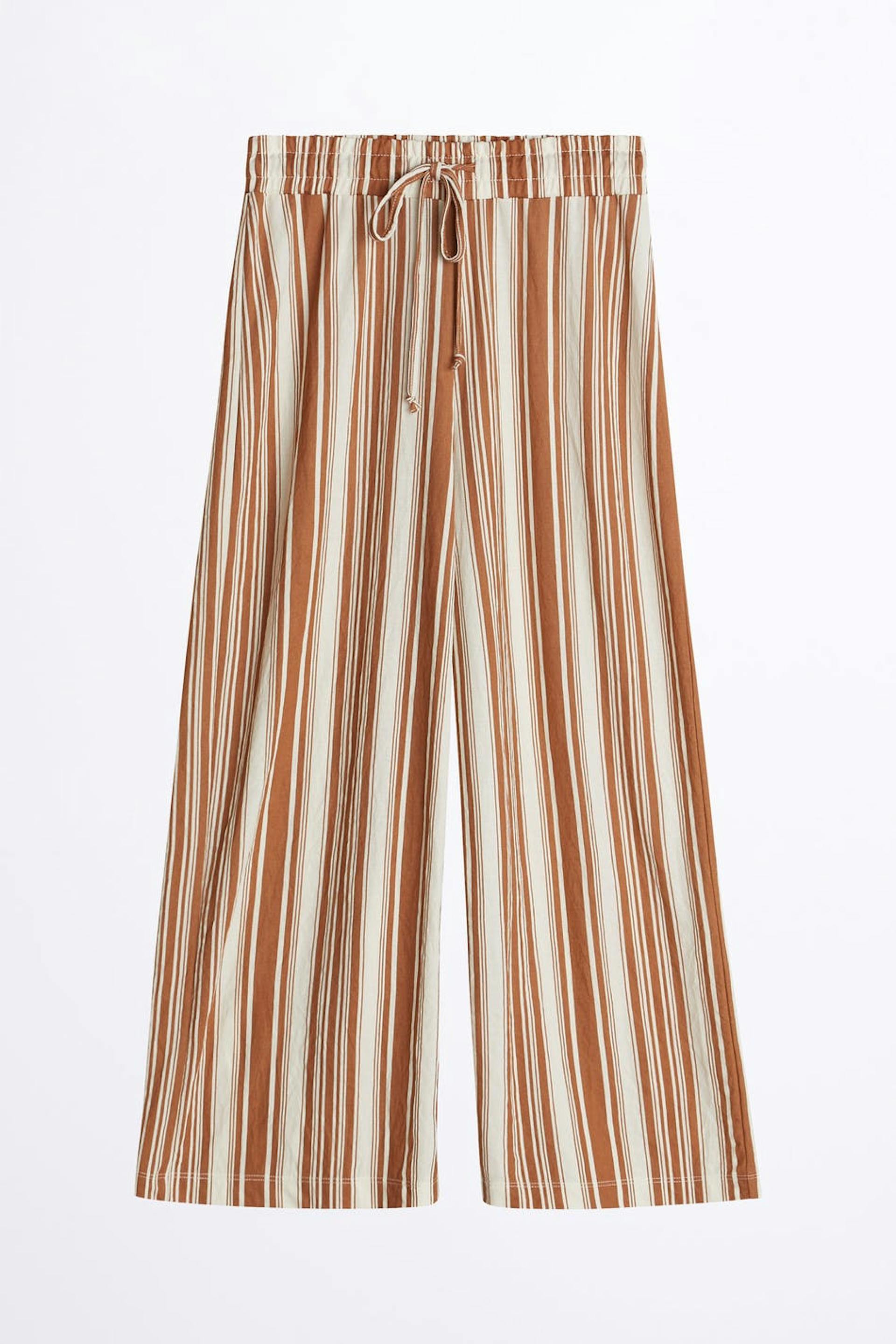 Randiga culottes med vida byxben. Culottesen är orangea och vita och har en midja i resår med en dragsko. De är gjorda av trikå och har en ledig passform.