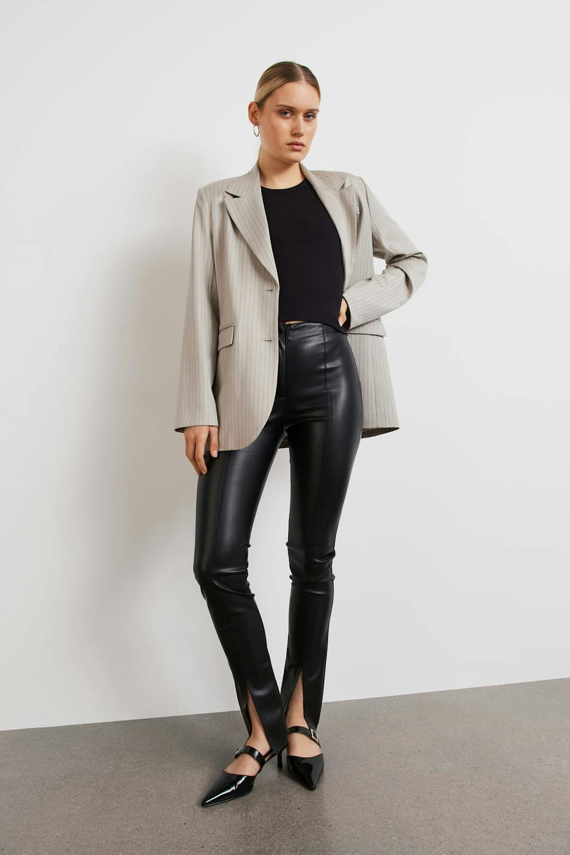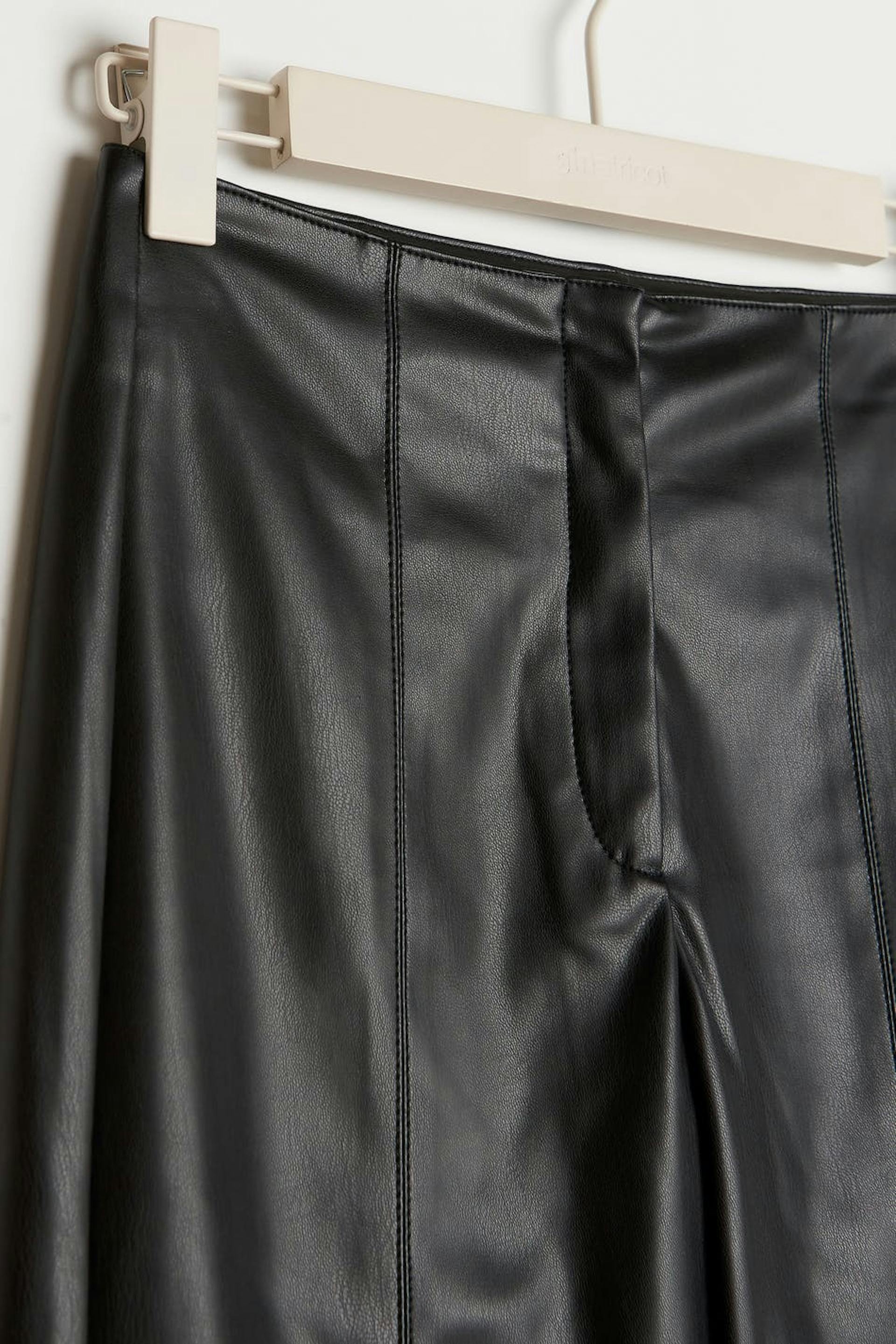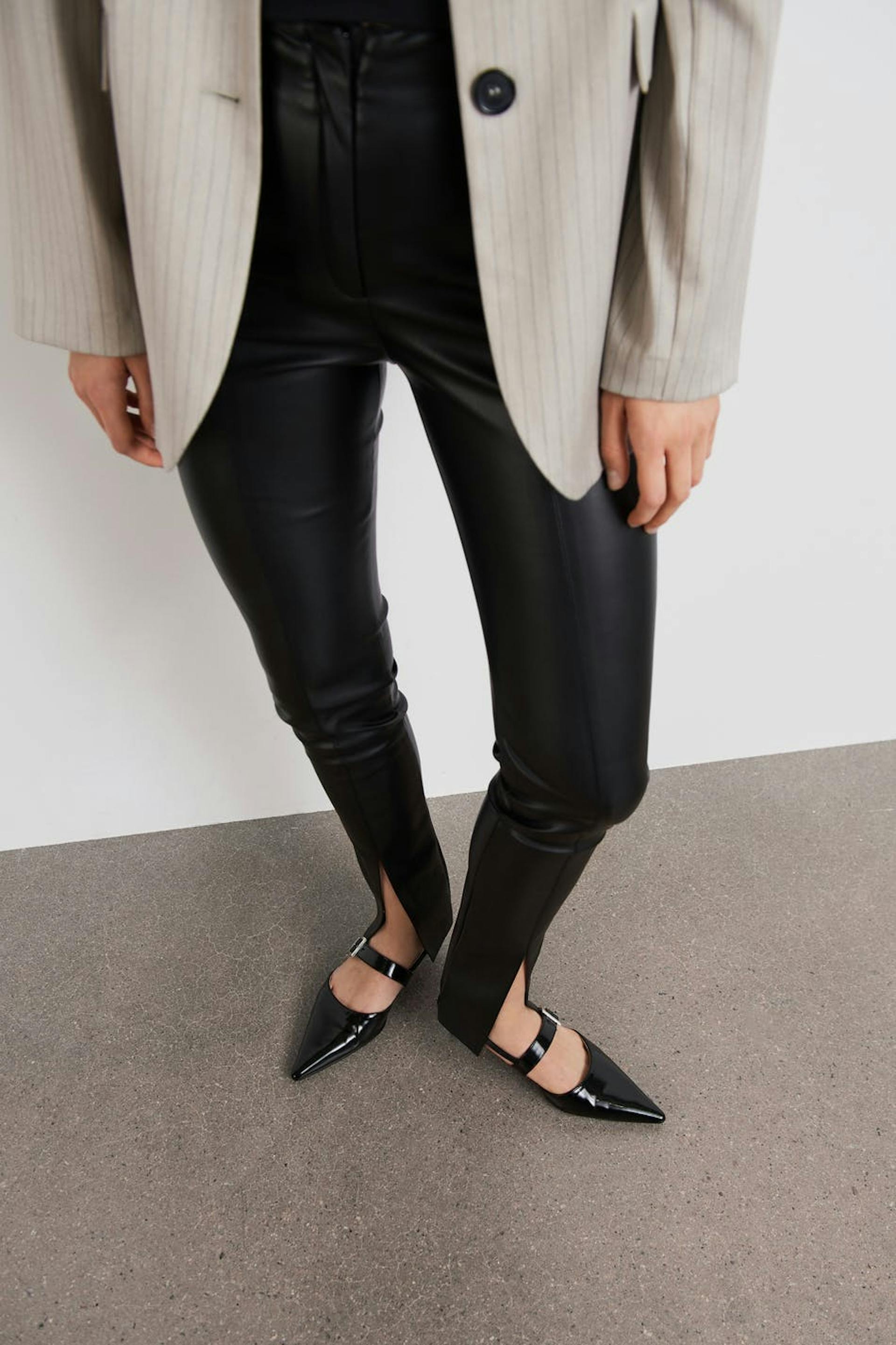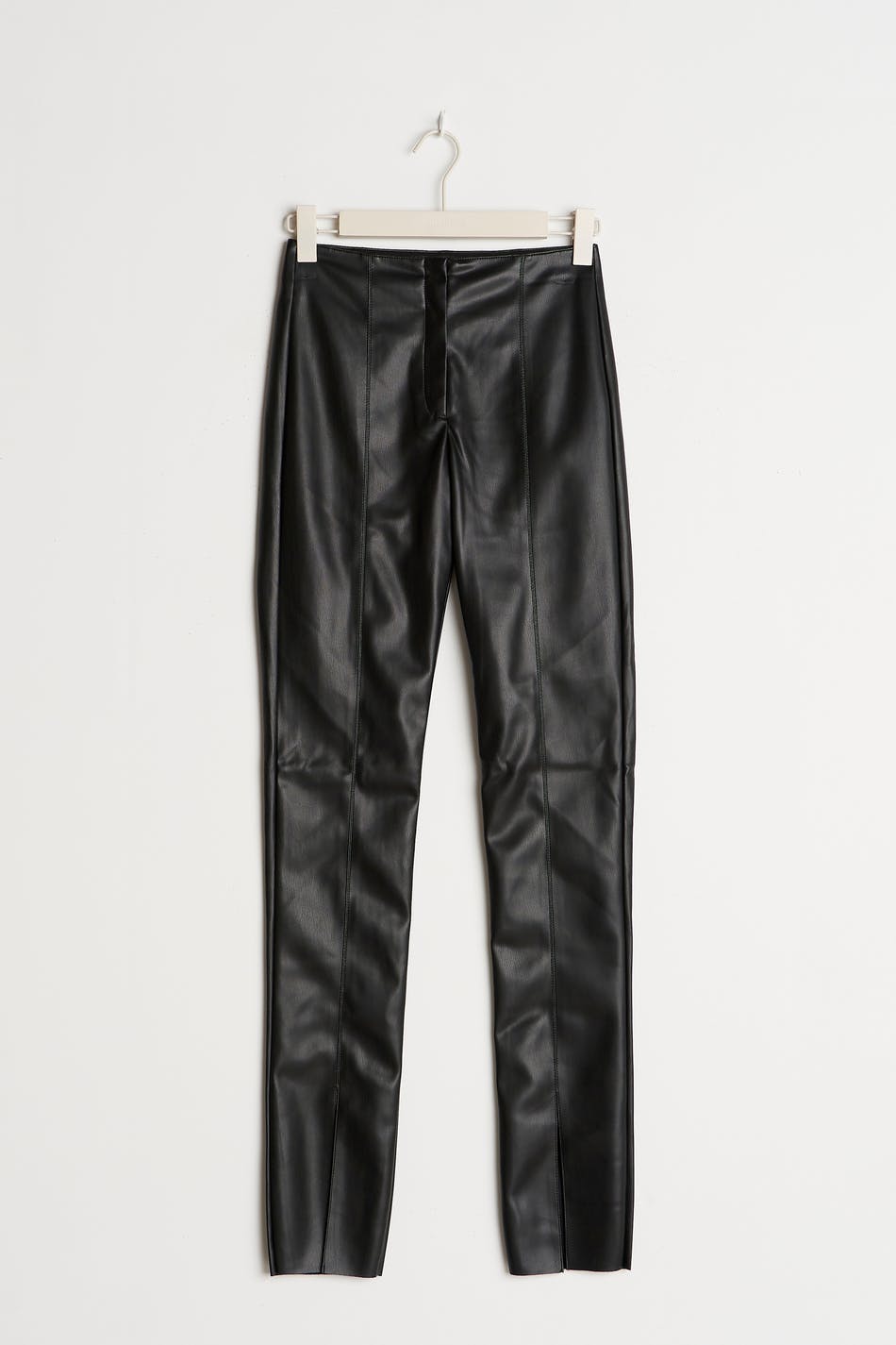 Byxor i läderimitation med slits vid bensluten. Byxorna är svarta och har sömdetaljer framtill. De har en gylf med blixtlås och en längre benlängd. Passar för dig som är 175 cm eller längre.