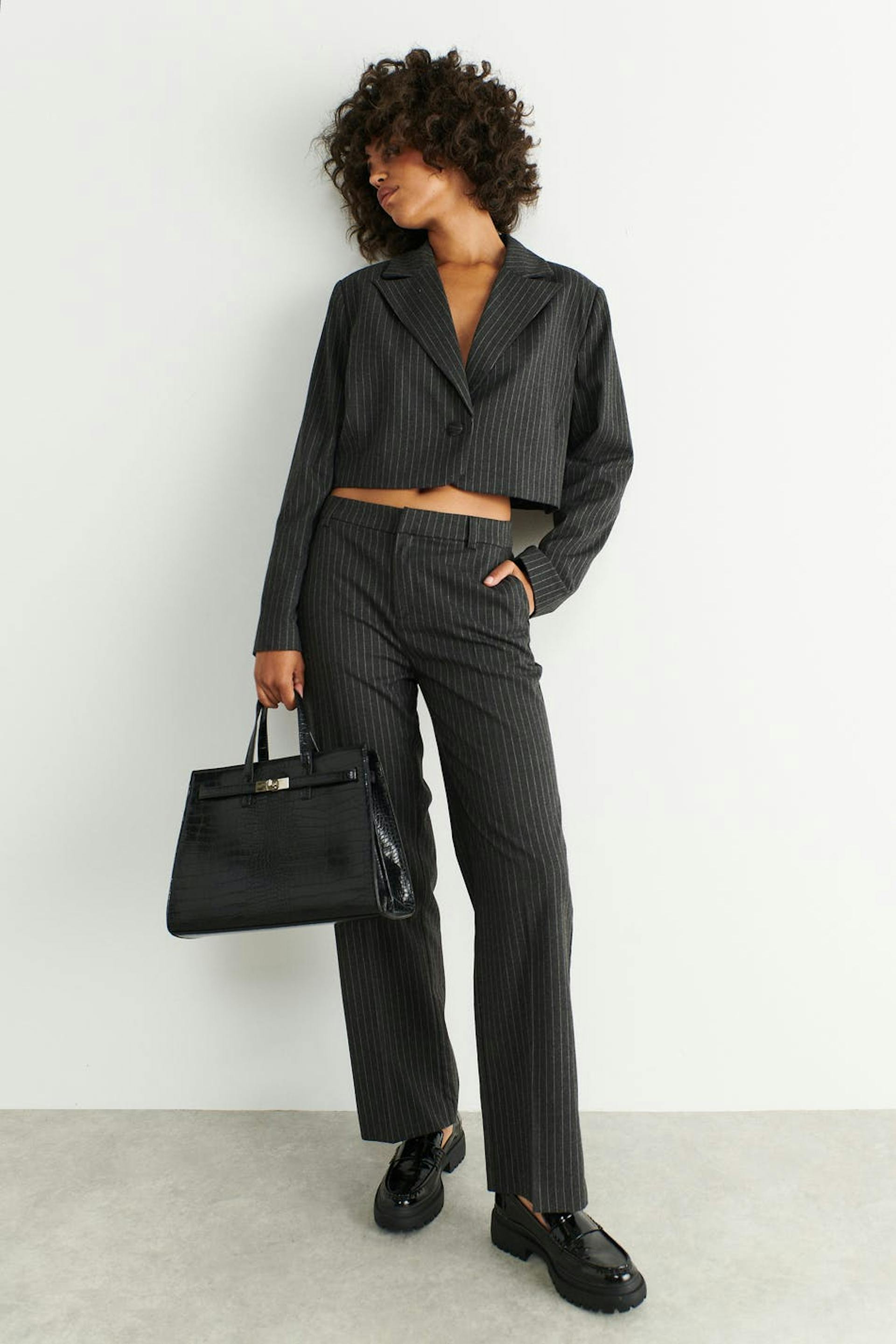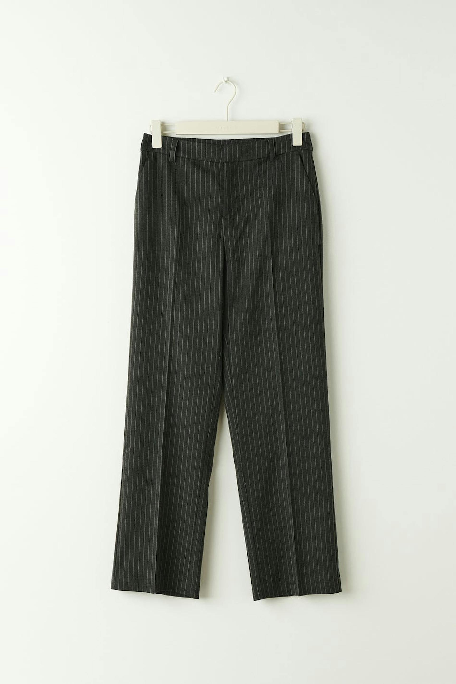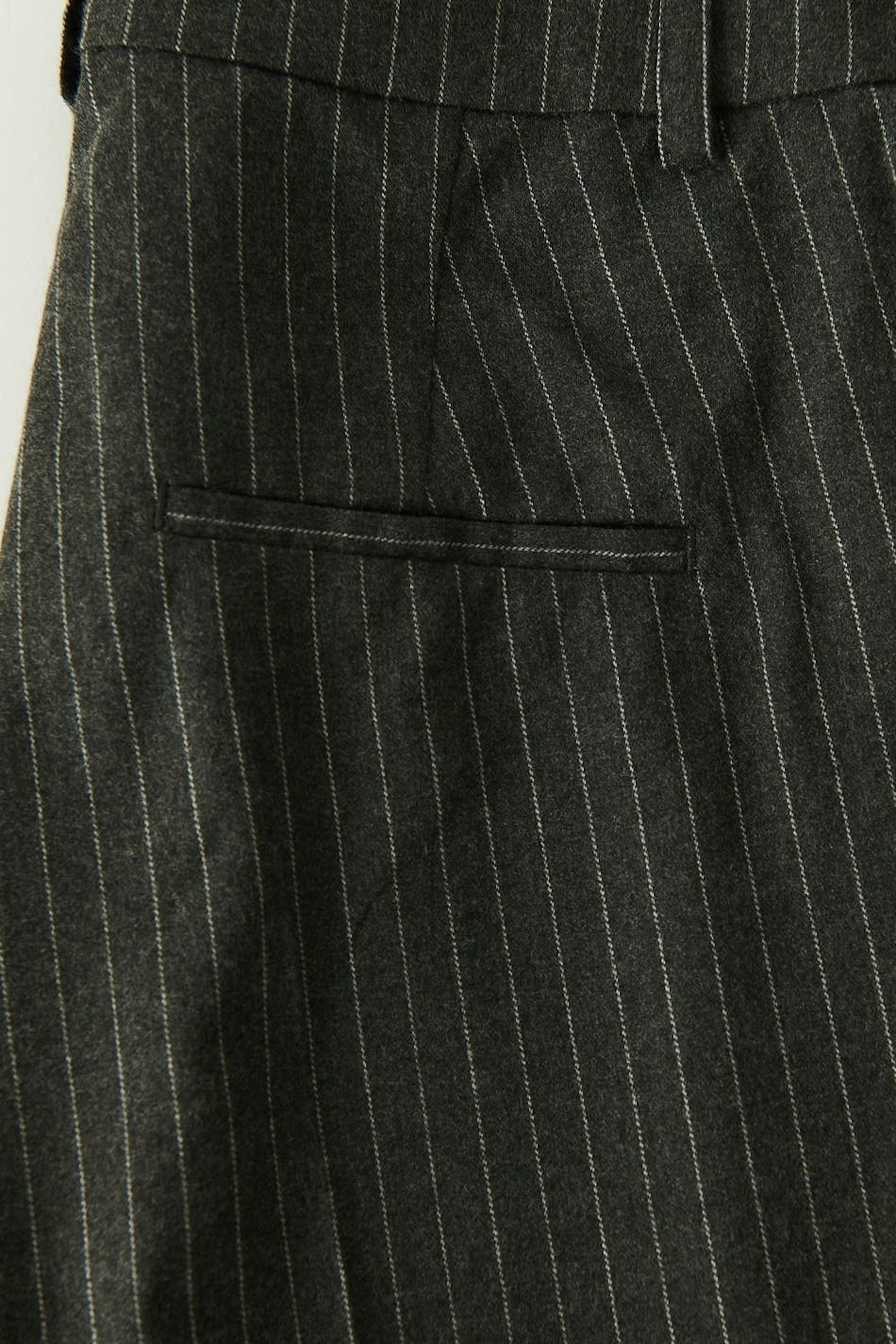 Kritstrecksrandiga kostymbyxor med slim fit. Byxorna är gråa och har medelhög midja. De har pressveck framtill, snedställda fickor och dragkedjegylf.