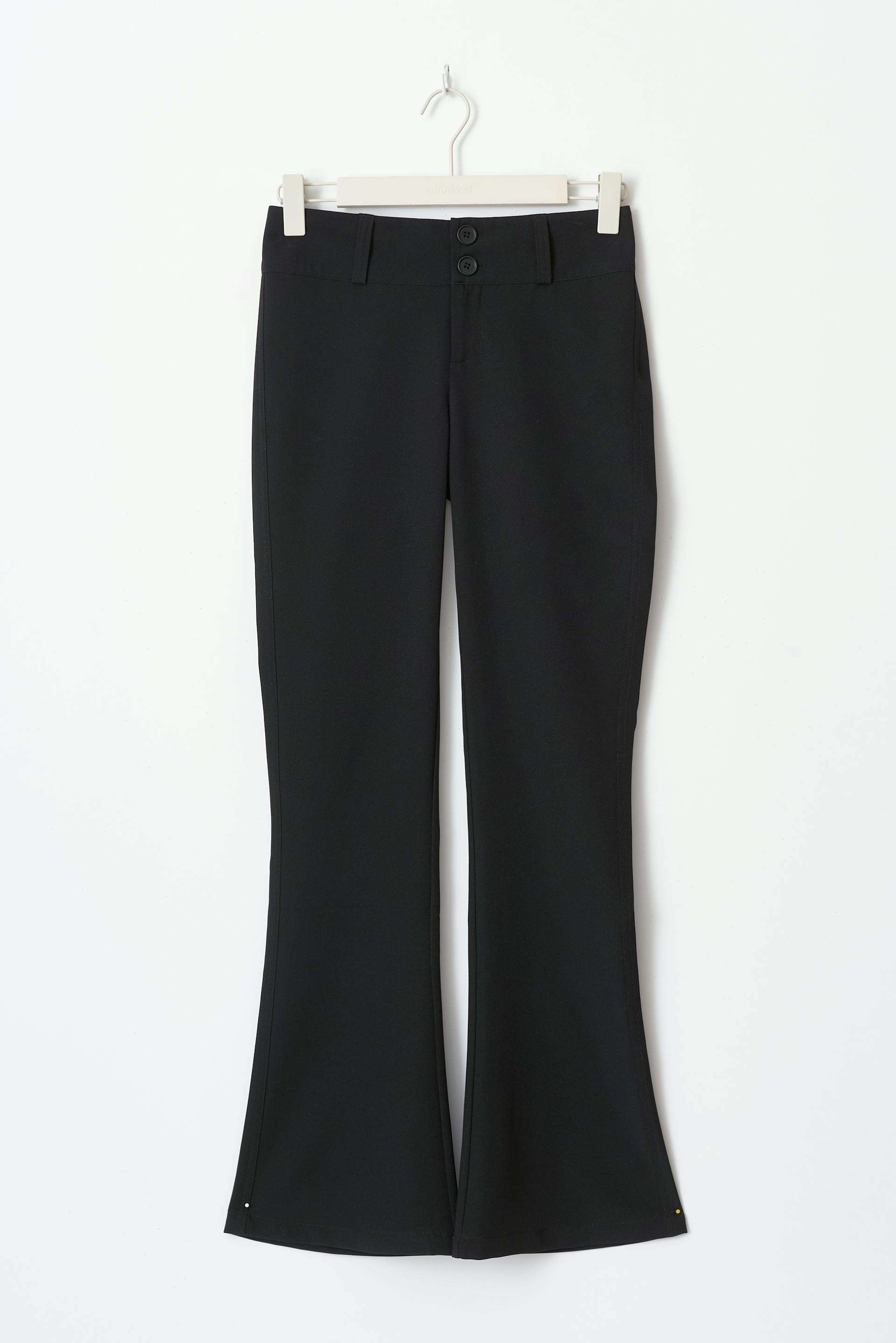 Kostymbyxor med figurnära passform. Byxorna är svarta och har utsvängda ben med fullängd. De har brett midjeband, dragkedjegylf och bakfickor med lock och knapp. Passar för dig som är 175 cm eller längre.