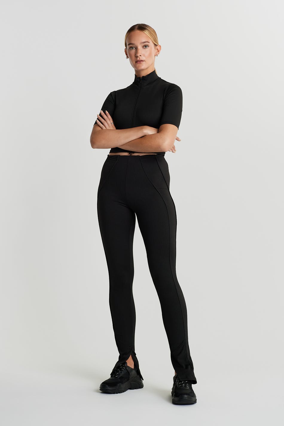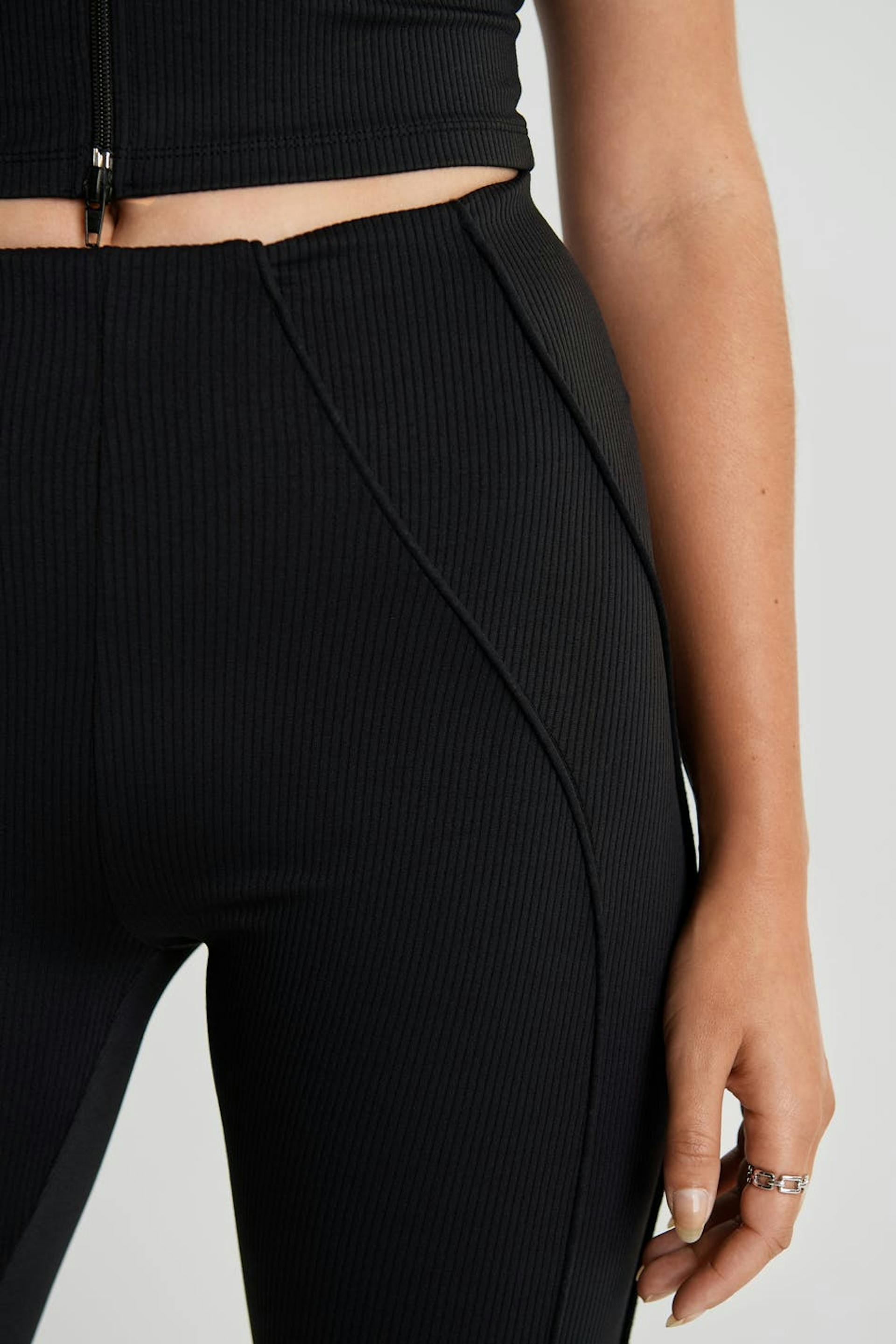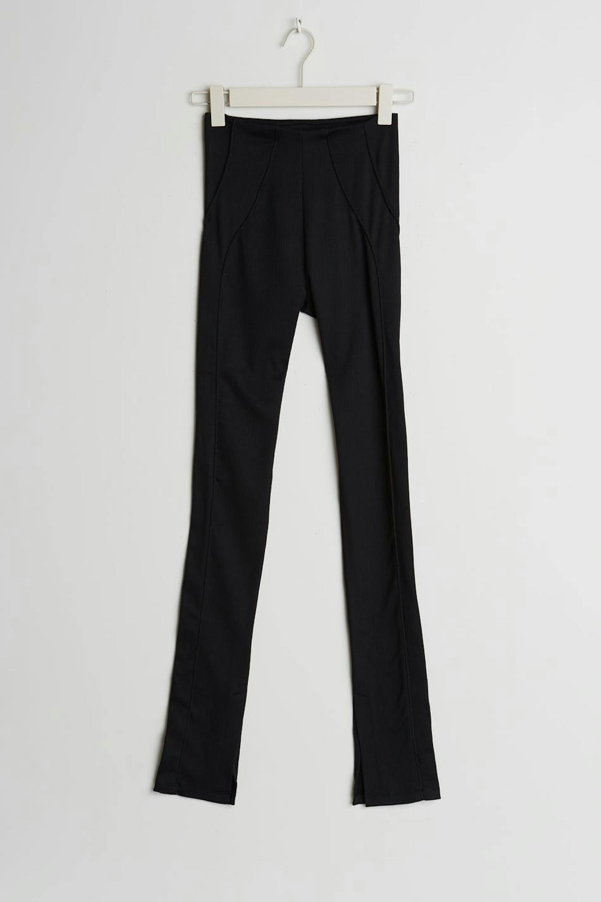Stretchiga leggings med en figurnära passform. Leggingsen är svarta och har sömdetaljer ner längs framsidan. De har slits vid bensluten.