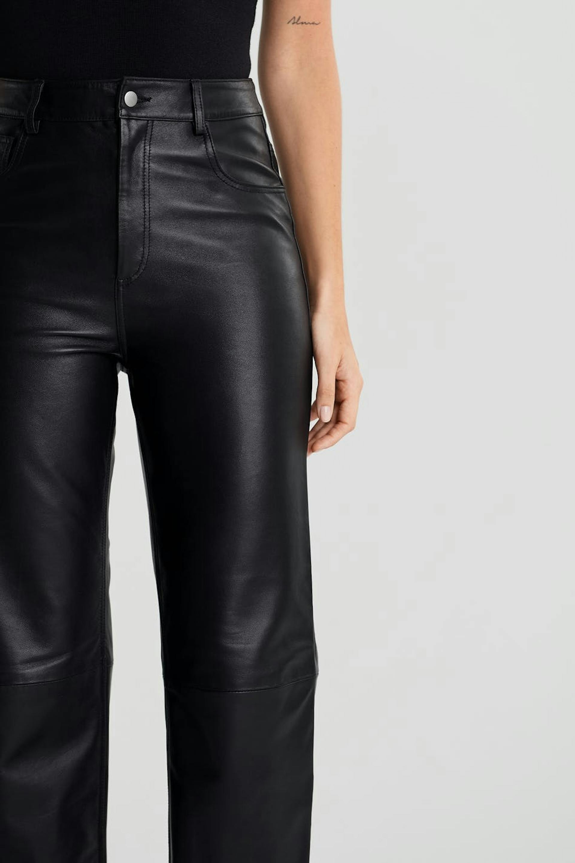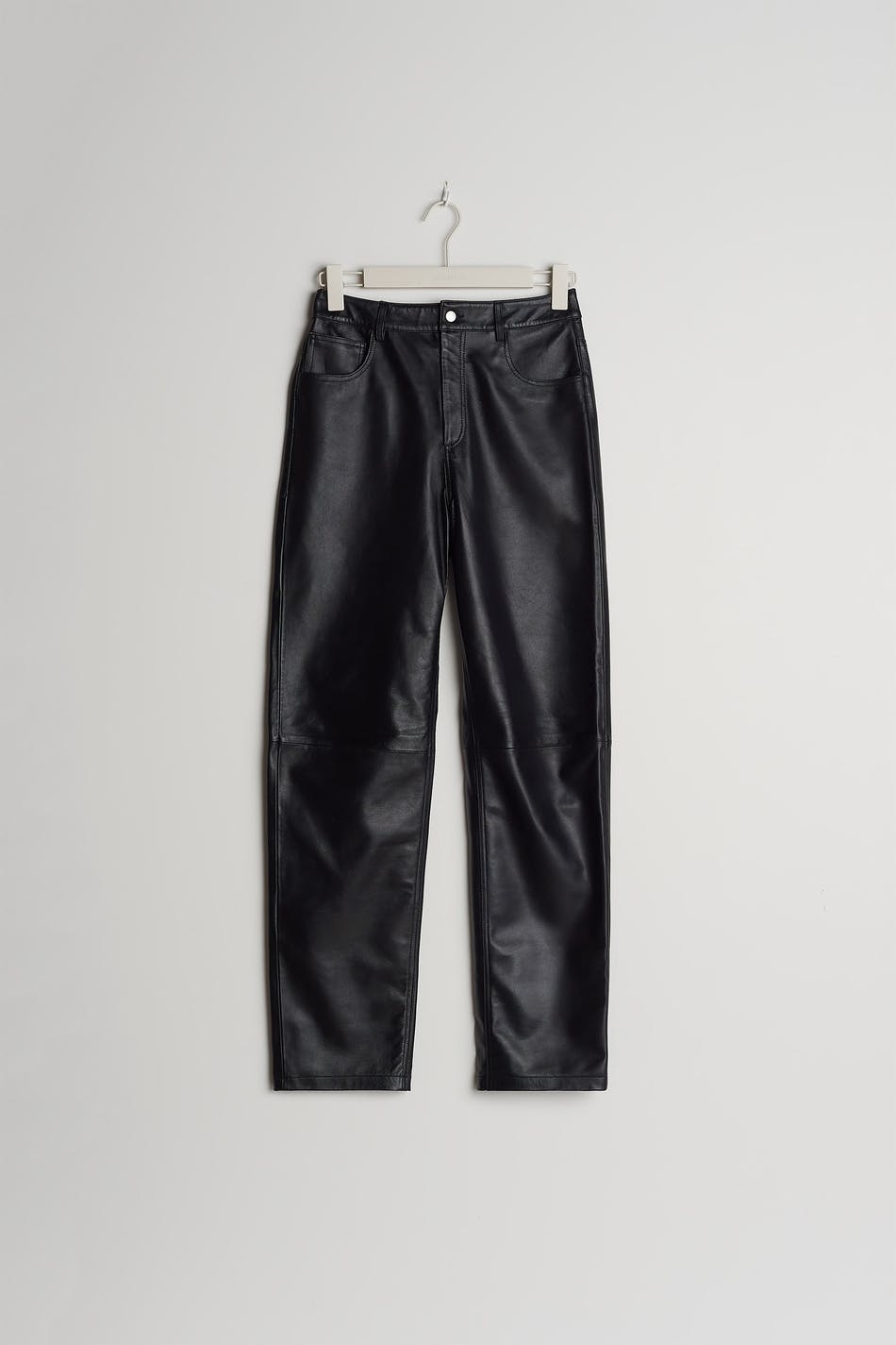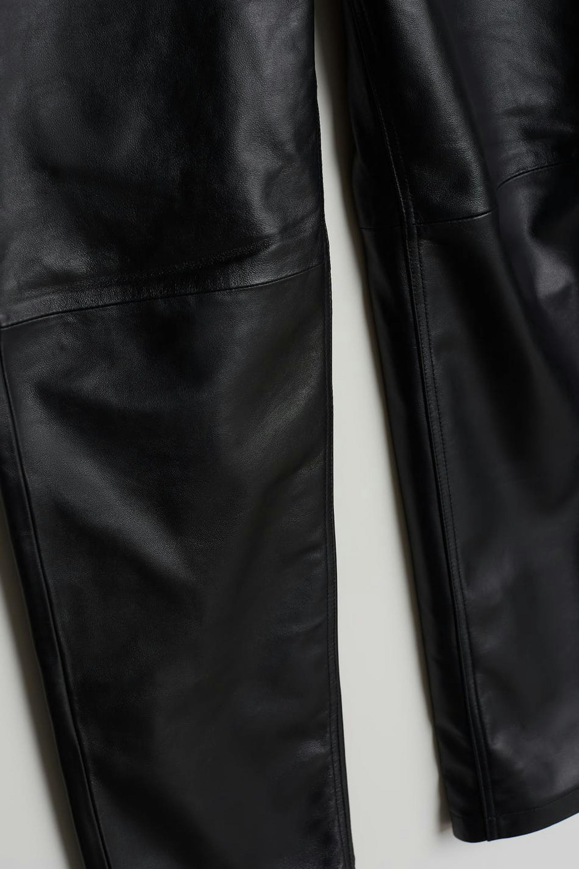 Byxor med raka byxben med en fullängd. Byxorna är svarta och har en sömdetalj vid knäna. De är gjorda av läder och har fickor fram och bak.