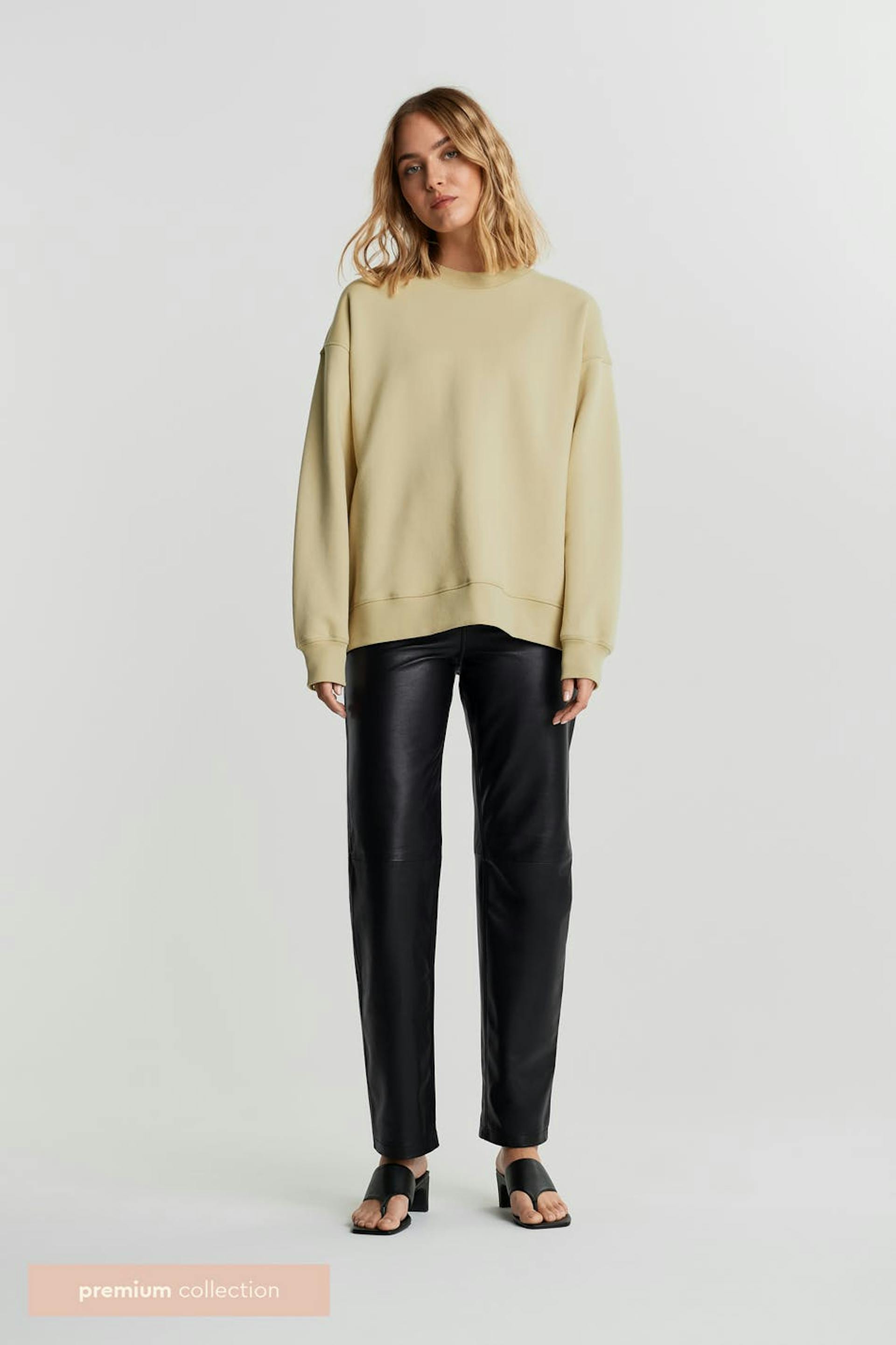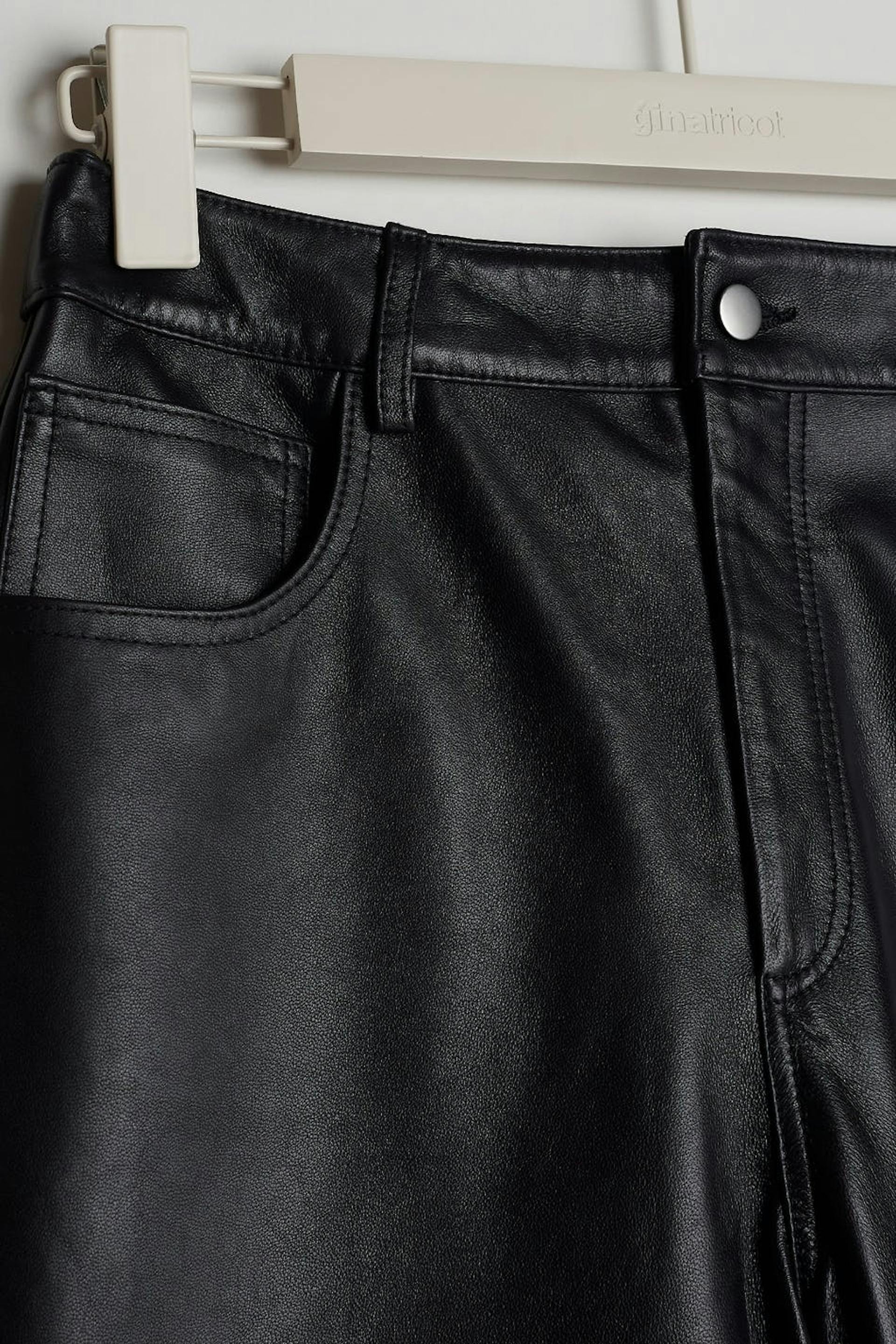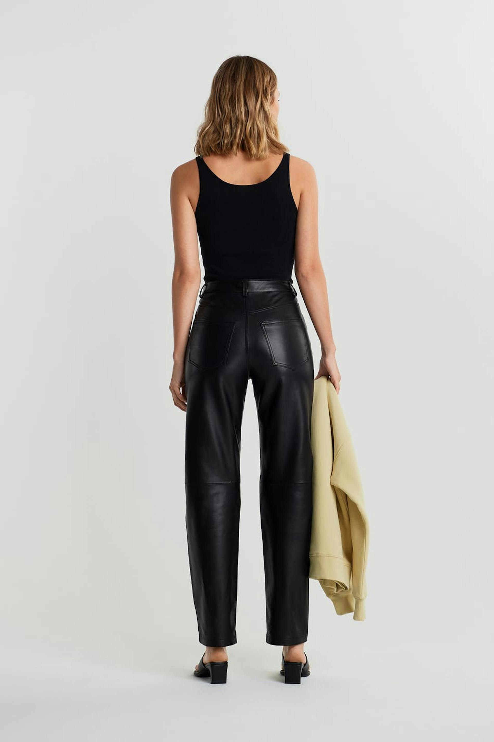 Byxor med raka byxben med en fullängd. Byxorna är svarta och har en sömdetalj vid knäna. De är gjorda av läder och har fickor fram och bak.