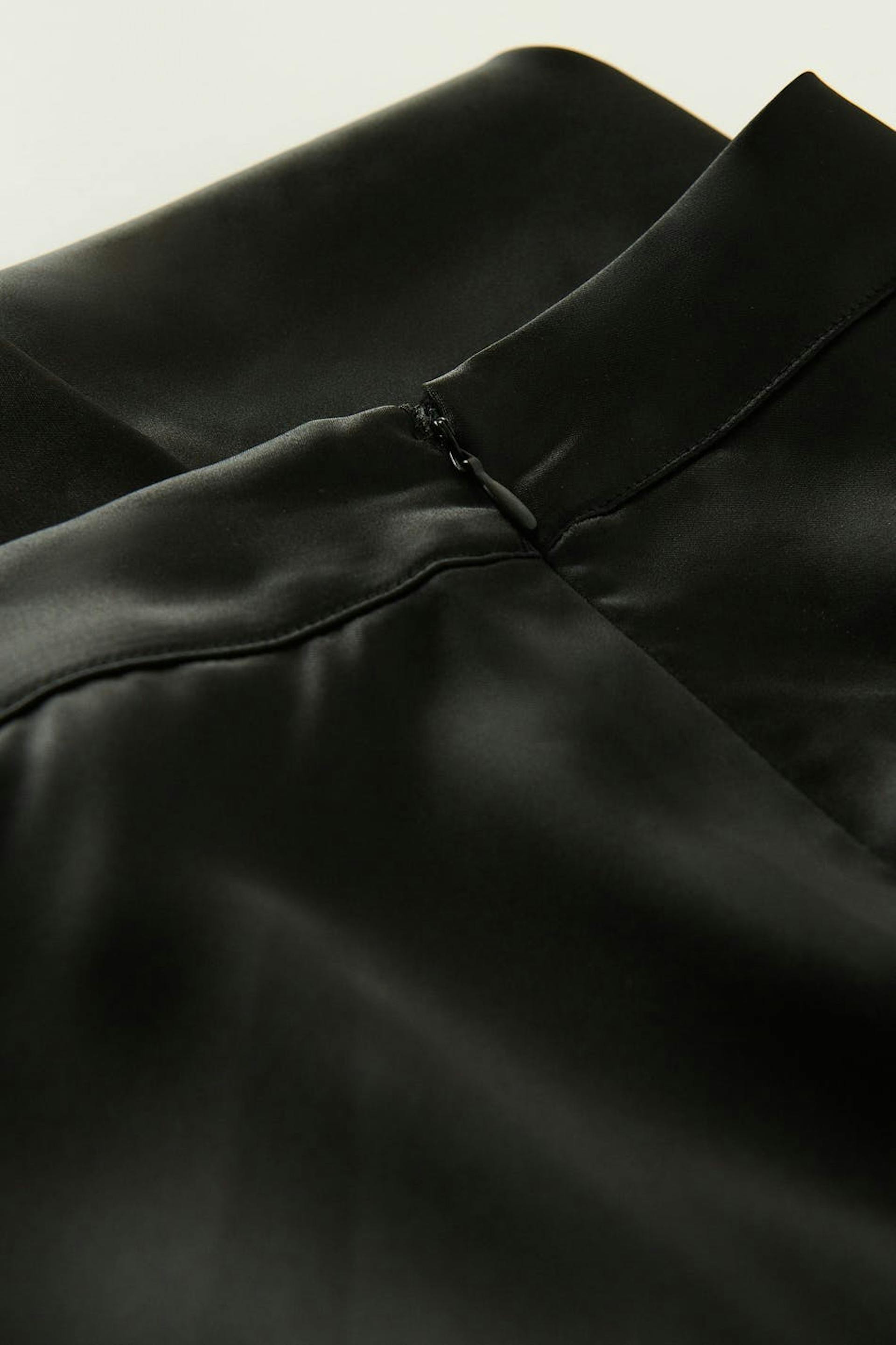 Byxor i satin med figurnära passform. Byxorna är svarta och har en rak passform. De har dragkedja i sidosömmen och fransdetaljer med strassutsmyckning vid bensluten.