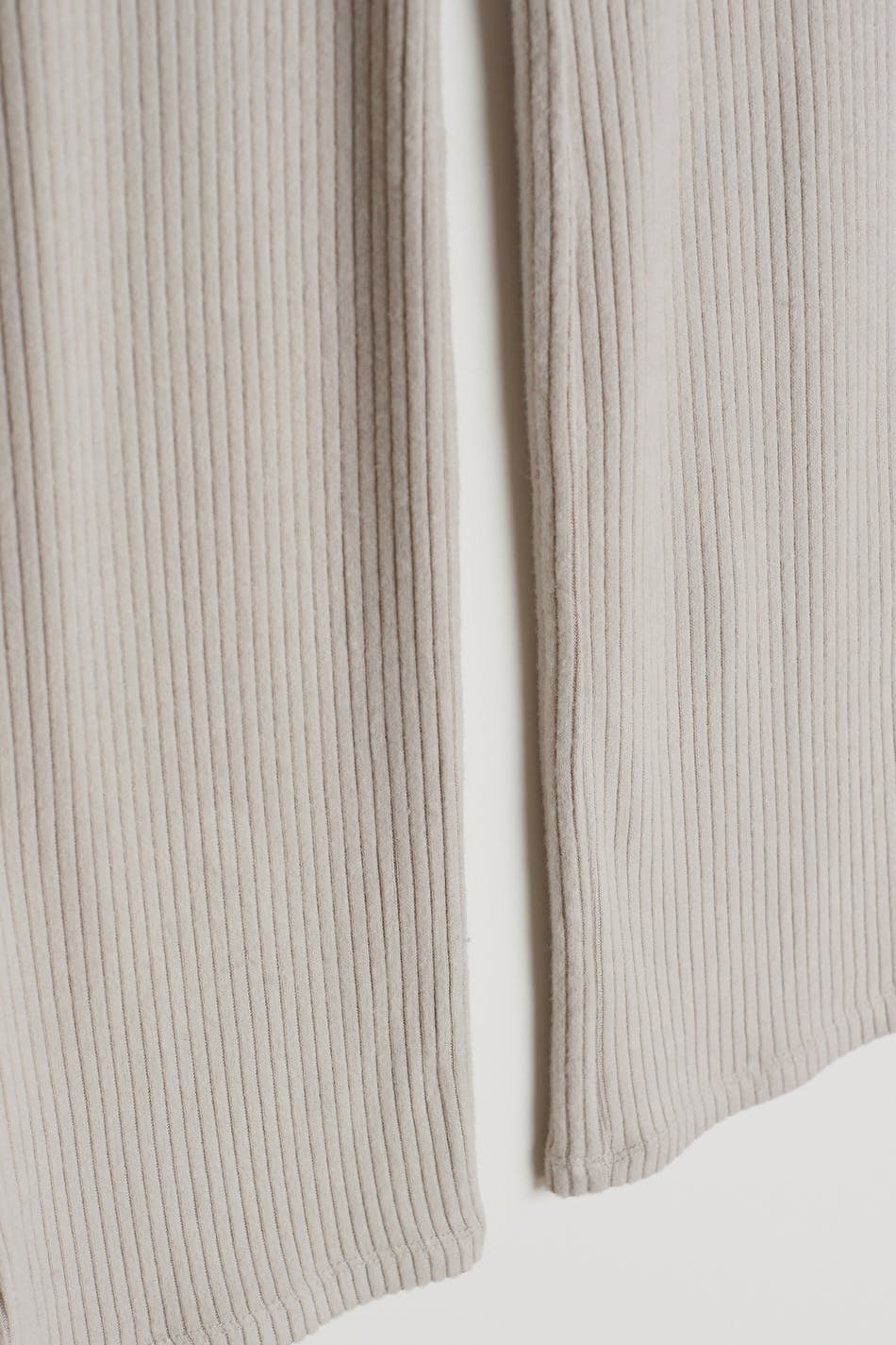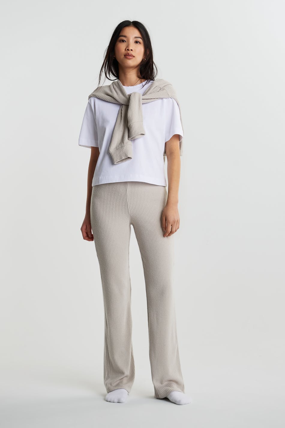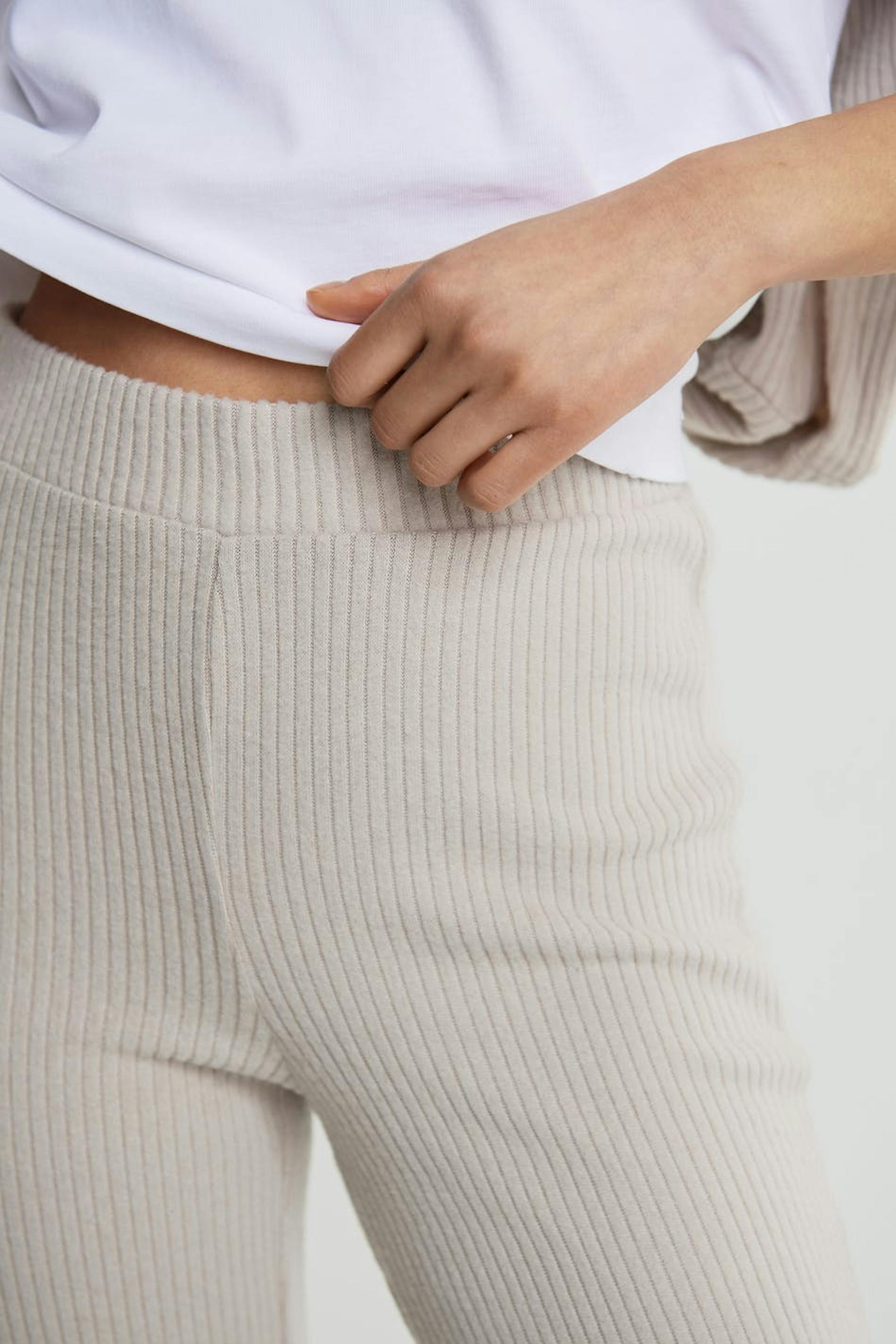Ribbstickade byxor med en normal passform. Byxorna är beigea och har raka byxben. De har en mjuk resår i midjan.