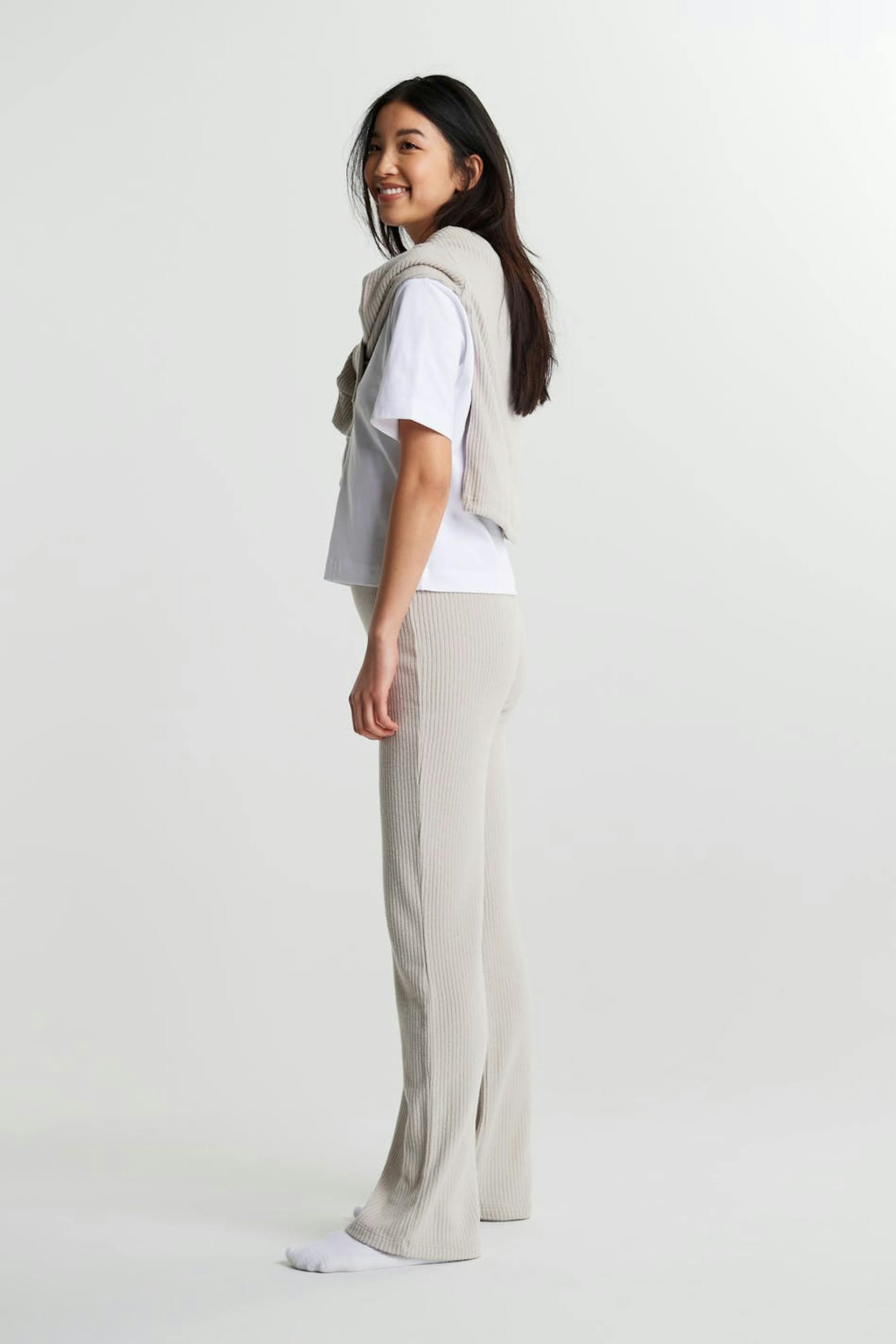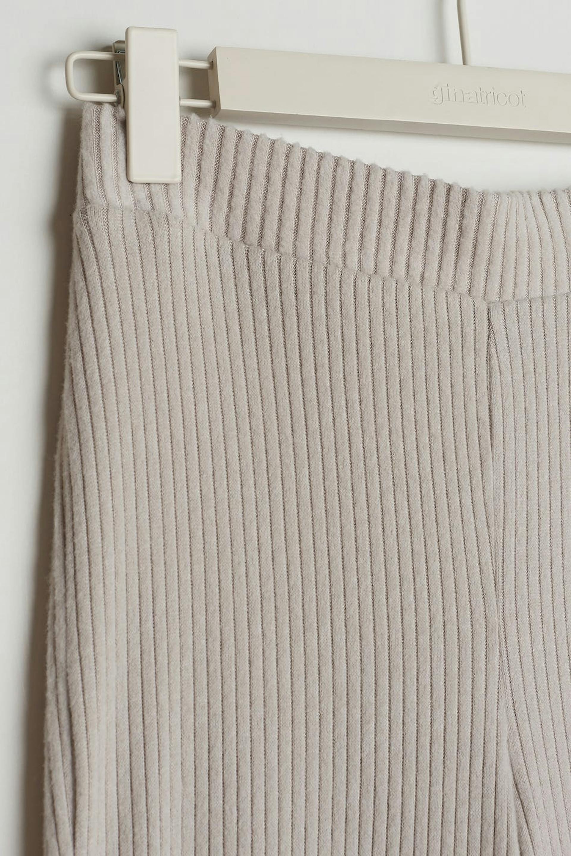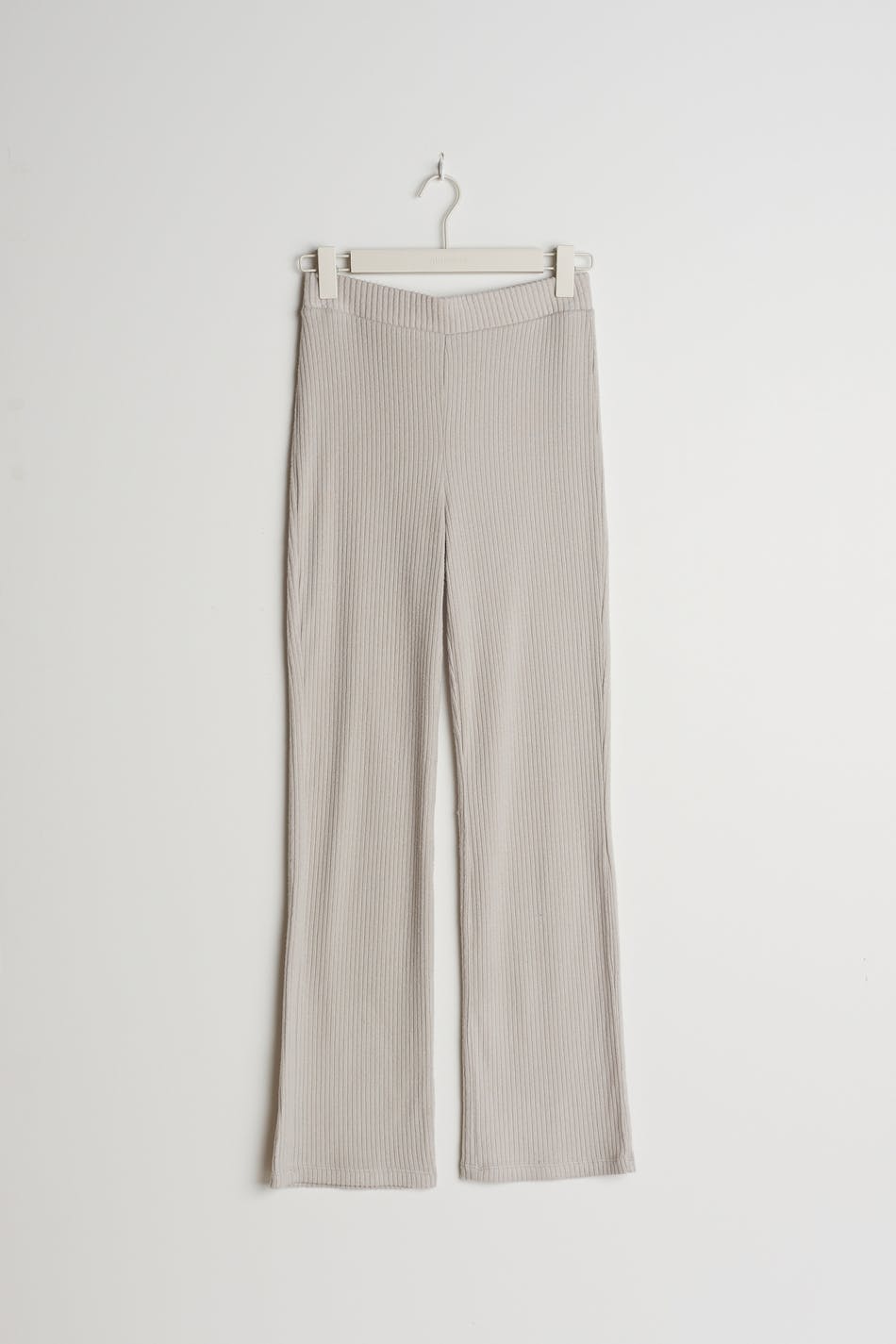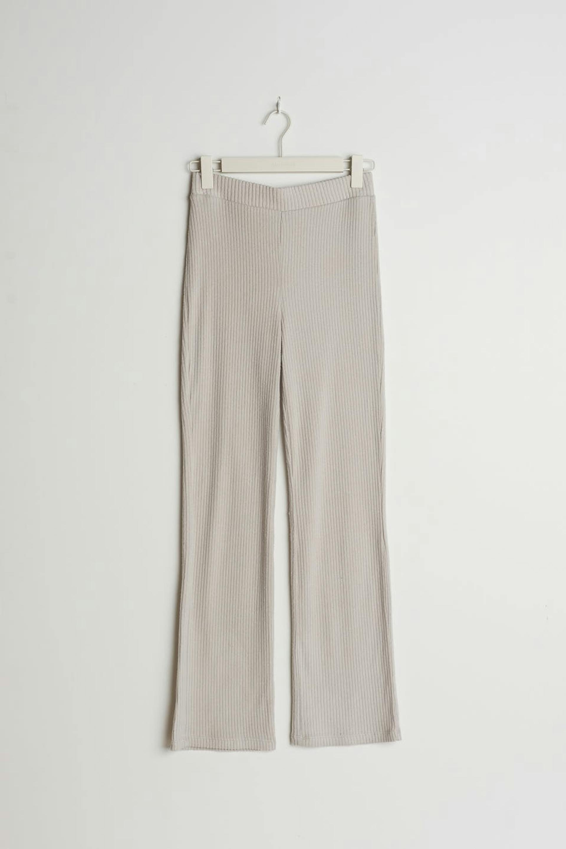Ribbstickade byxor med en normal passform. Byxorna är beigea och har raka byxben. De har en mjuk resår i midjan.