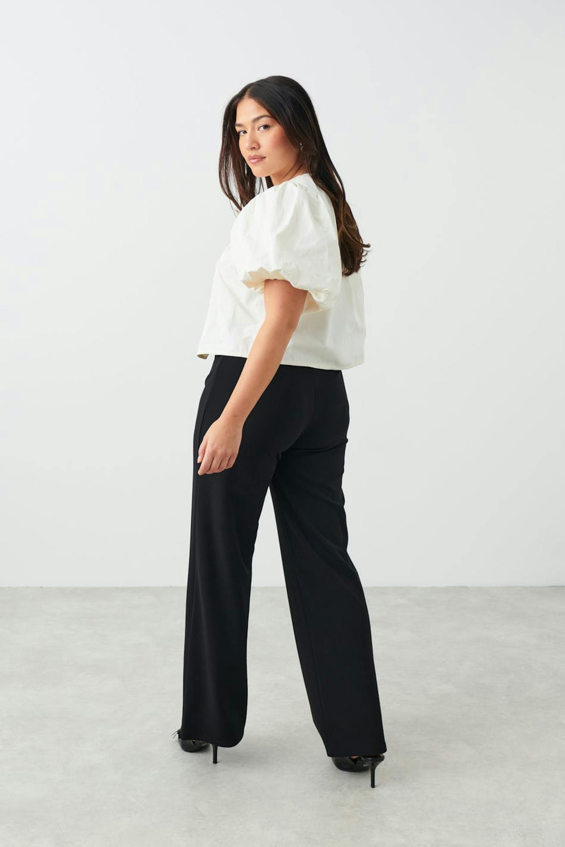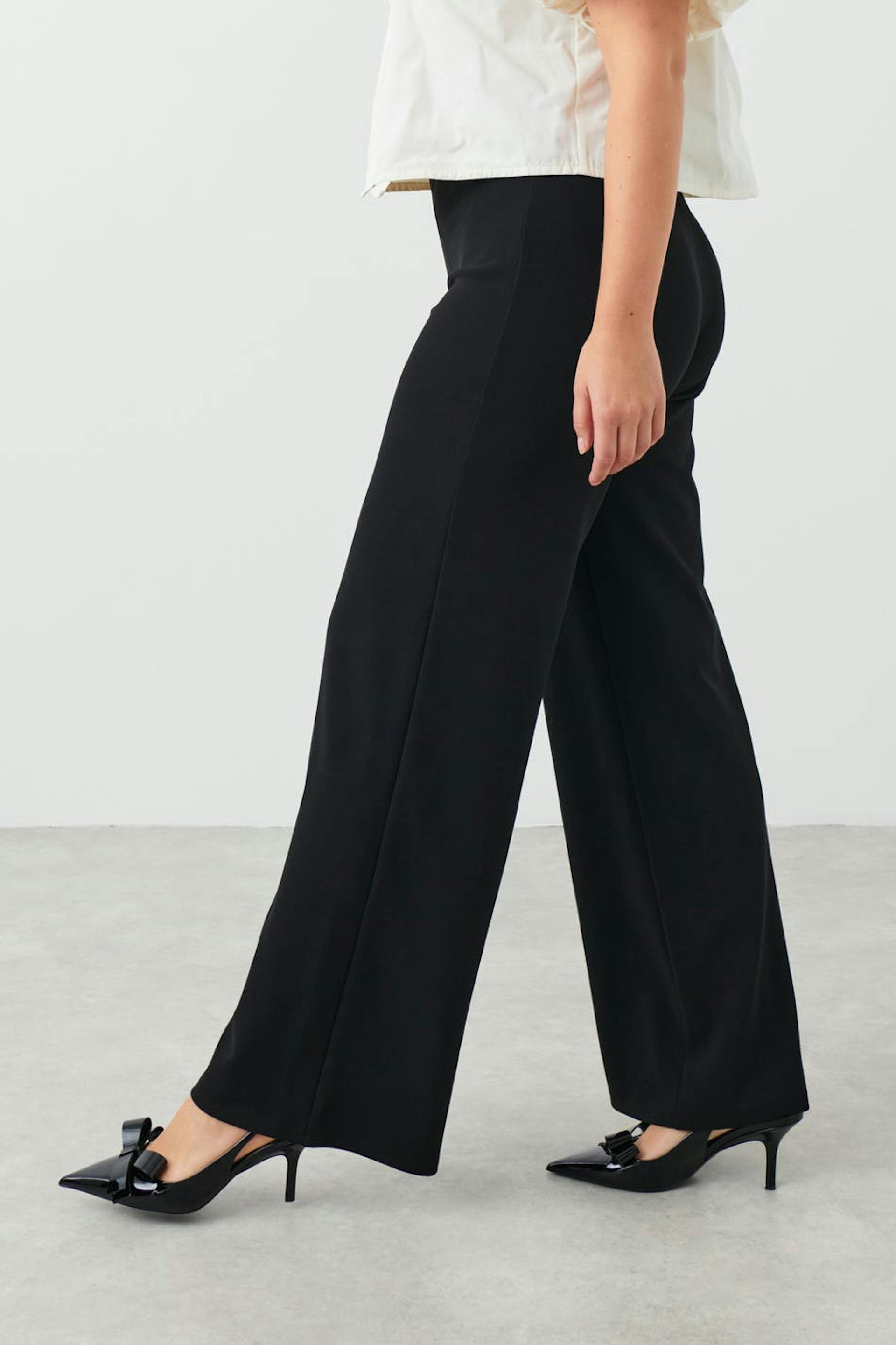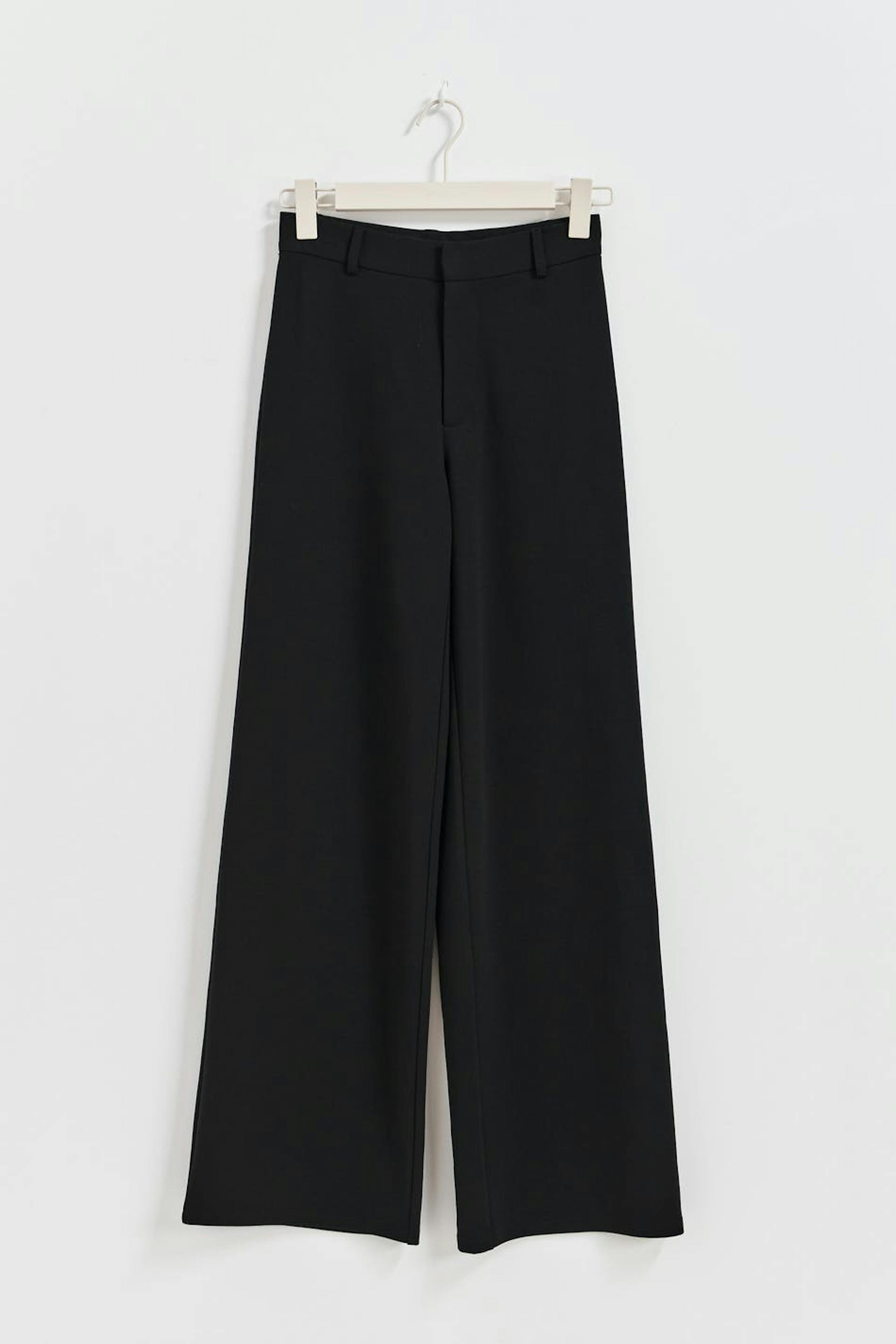 Raka kostymbyxor med normalhög midja. Byxorna är svarta och har raka, vida ben. De har hysk- och hakestängning, dragkedjegylf, bälteshällor och passpolerade fickor bak.