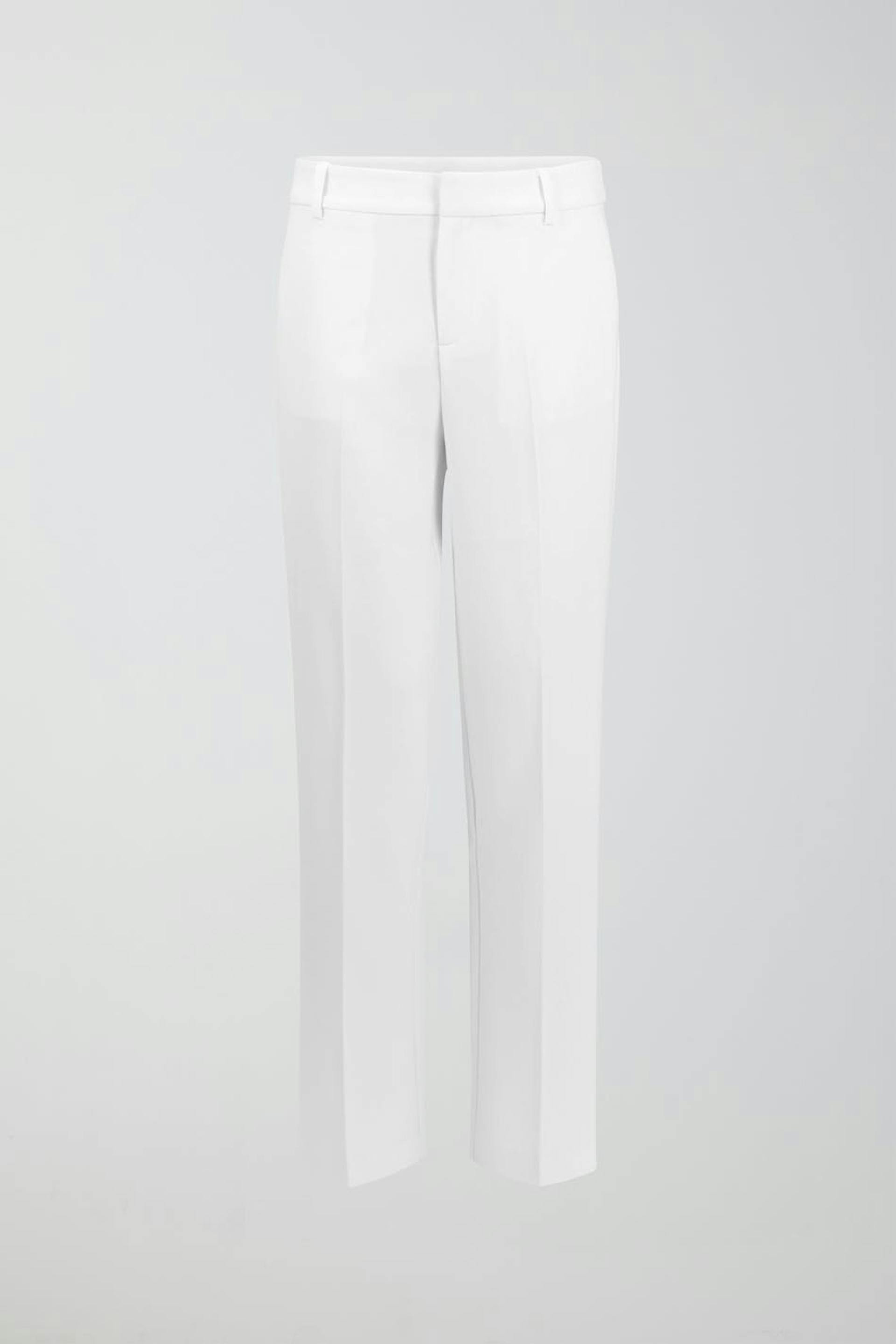 Petite kostymbyxor med pressveck fram. Byxorna är vita och har raka ben med fullängd. De har fickor på sidorna, midjeband med hällor och passpoalfickor baktill. Passar för dig som är 160 cm eller kortare.
