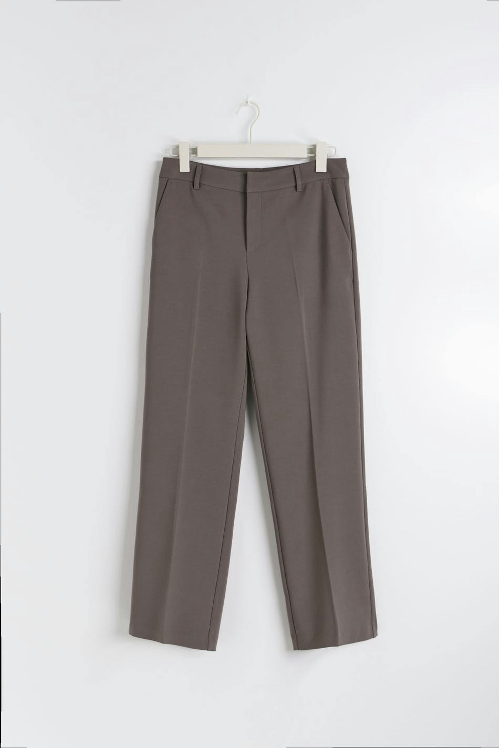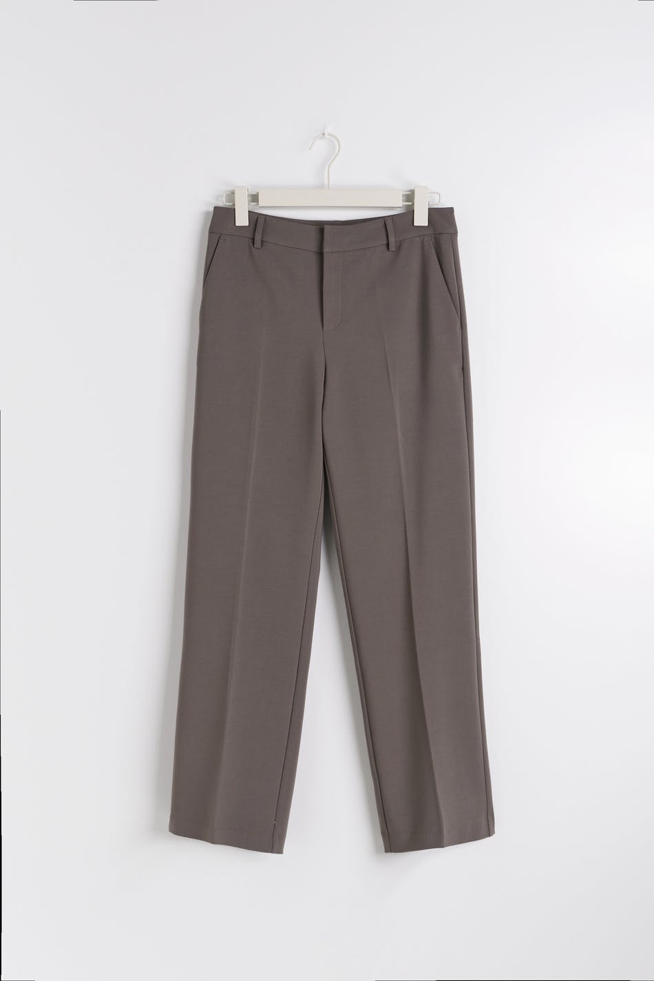 Petite kostymbyxor med pressveck fram. Byxorna är beigea och har raka ben med fullängd. De har fickor på sidorna, midjeband med hällor och passpoalfickor baktill. Passar för dig som är 160 cm eller kortare.