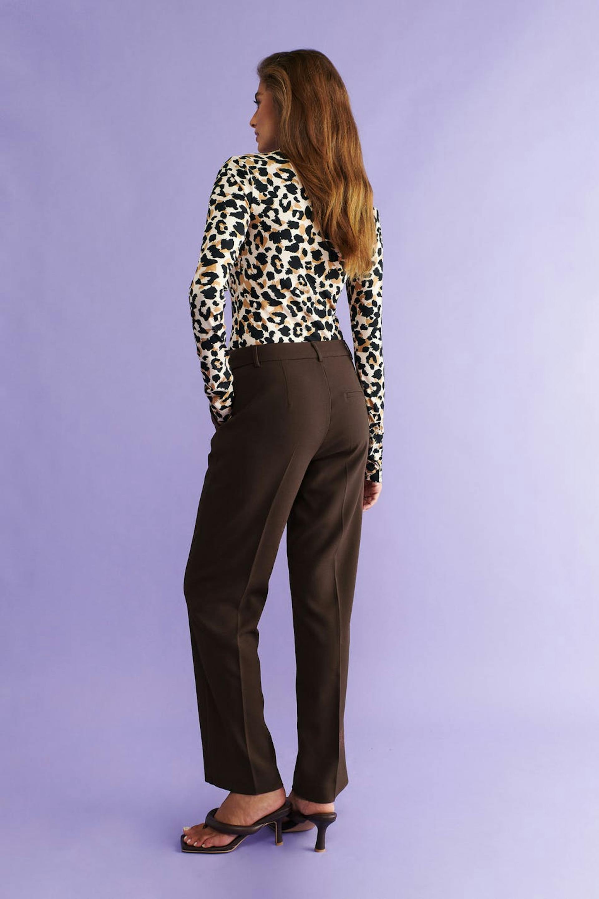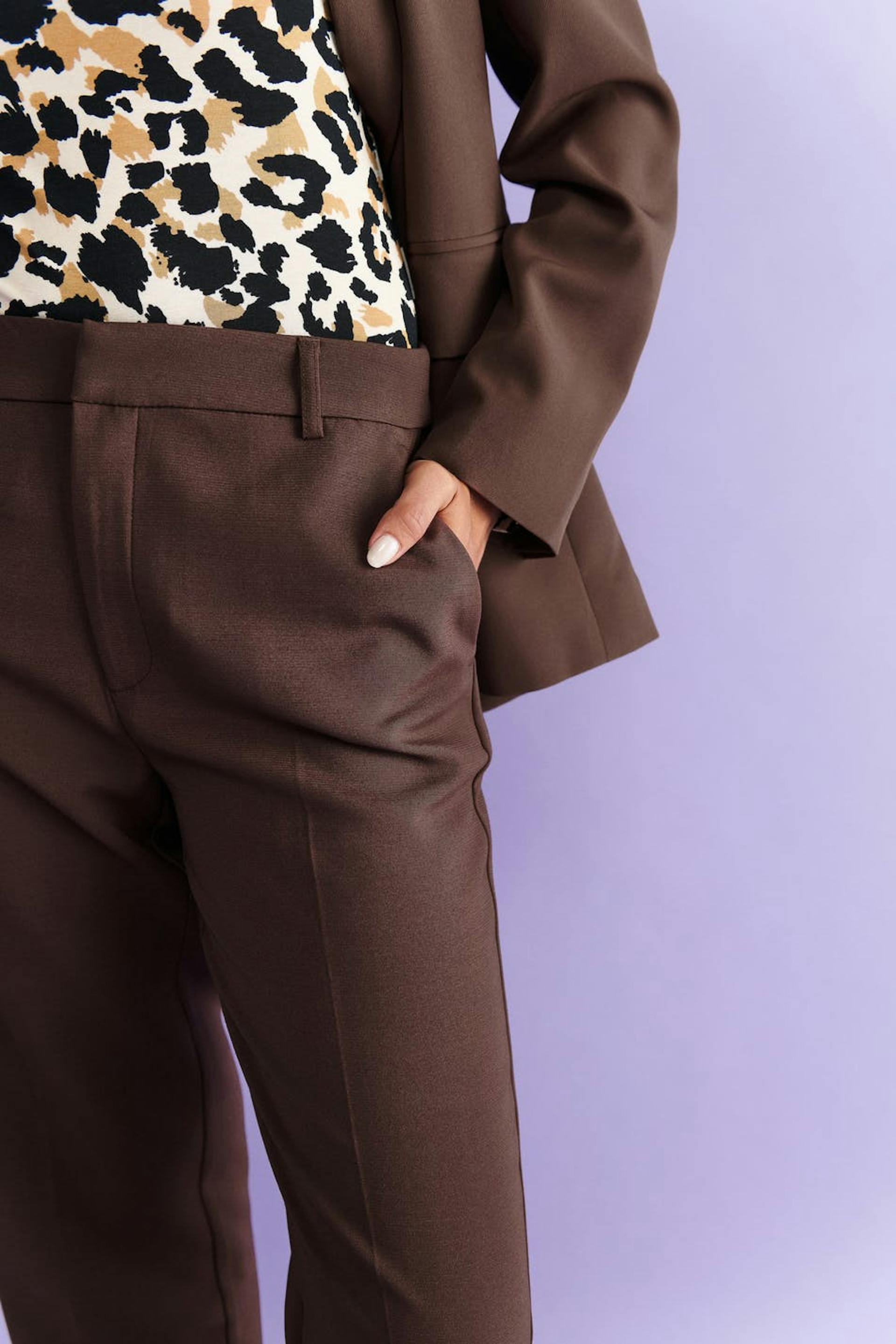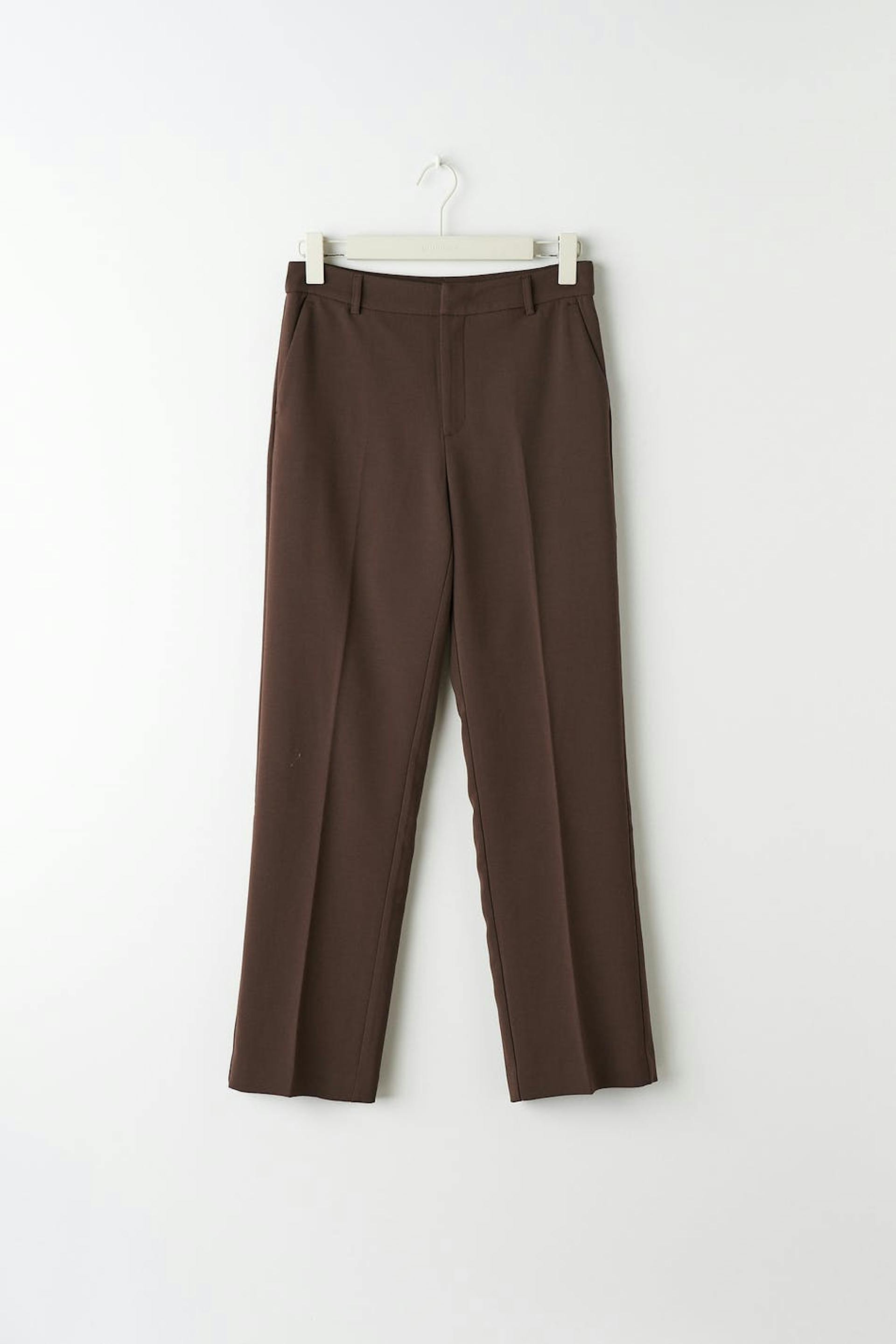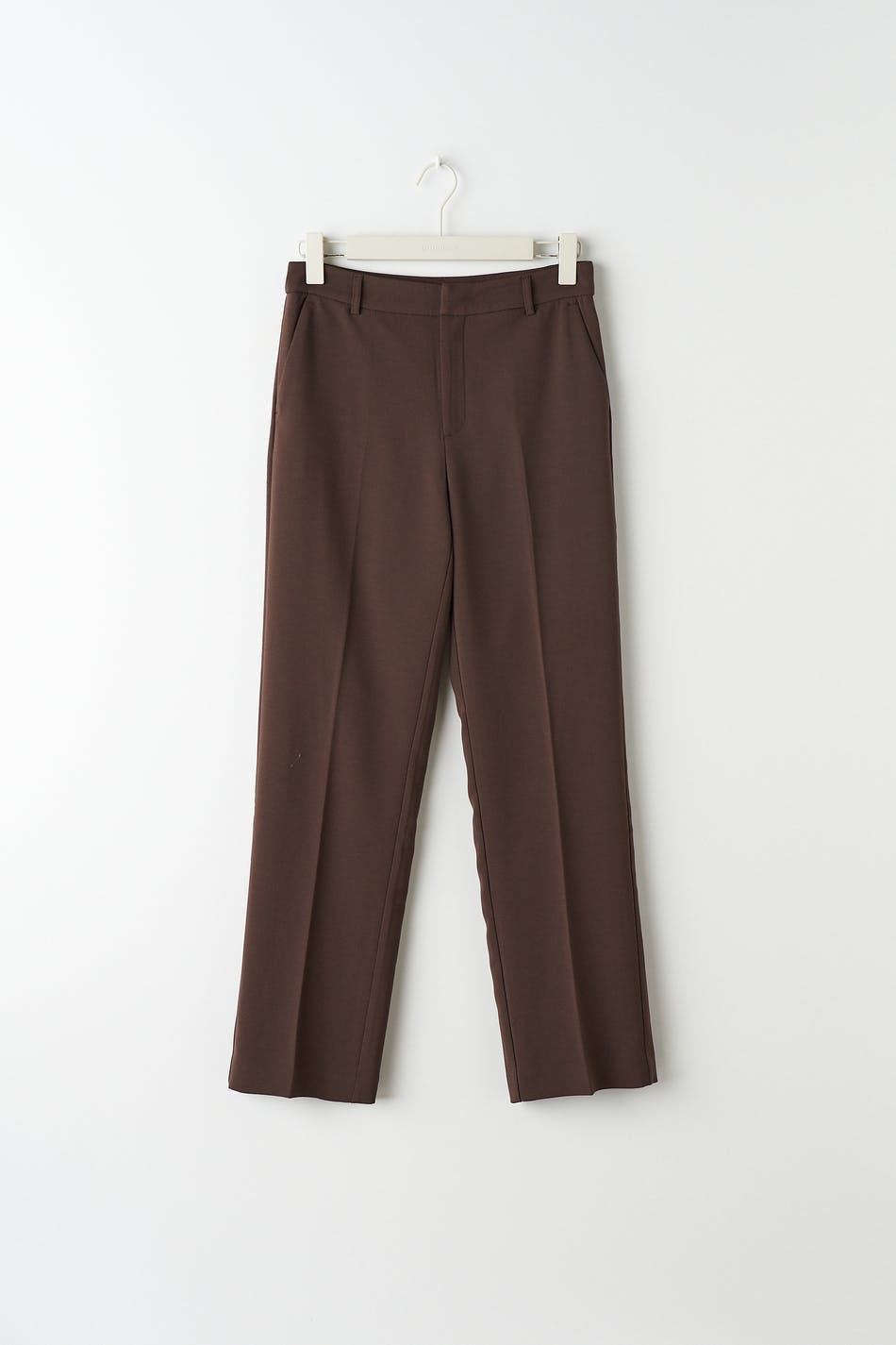 Raka kostymbyxor med pressveck. Byxorna är bruna och har fickor i sidorna. De har raka, långa byxben och en passpoalficka baktill.