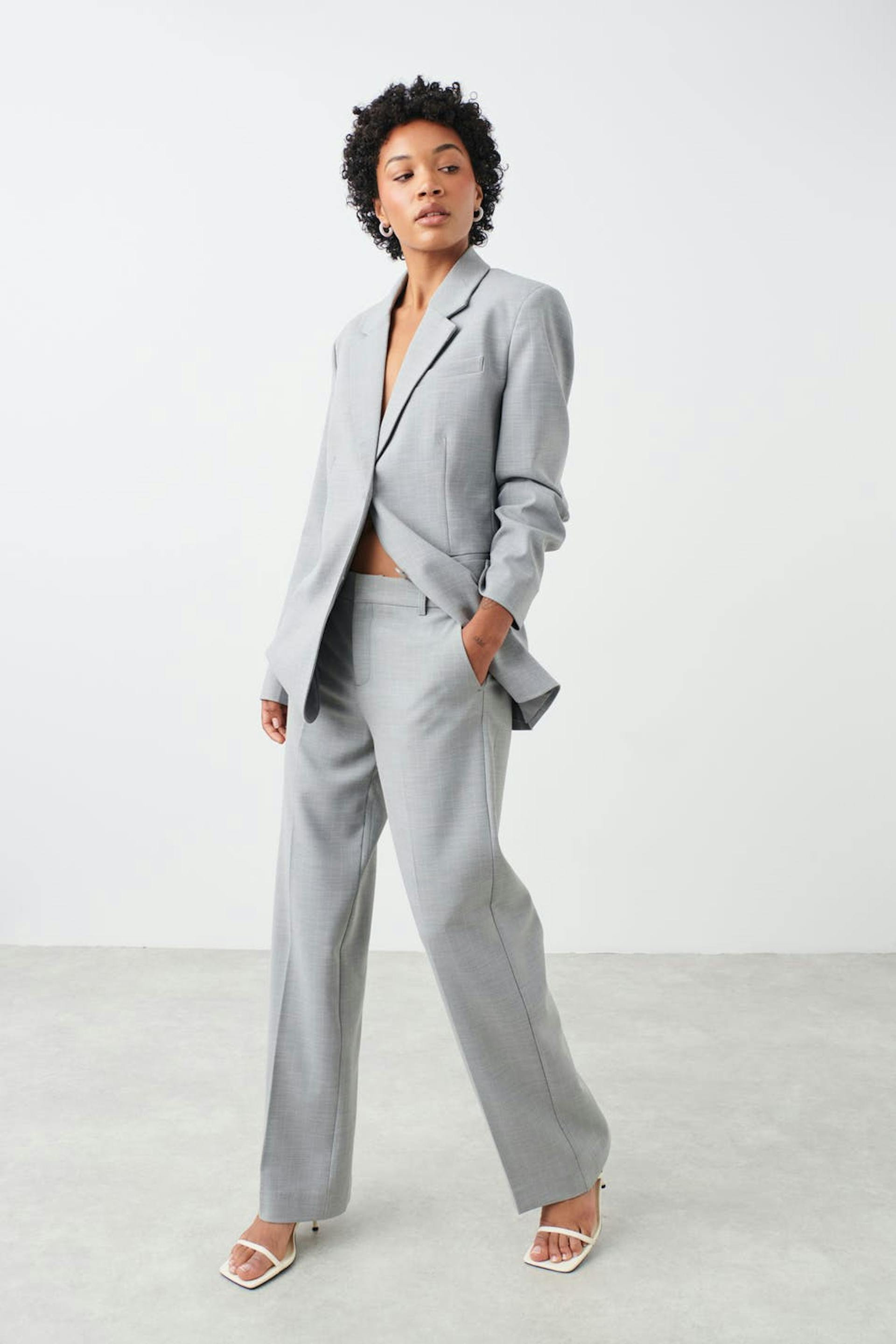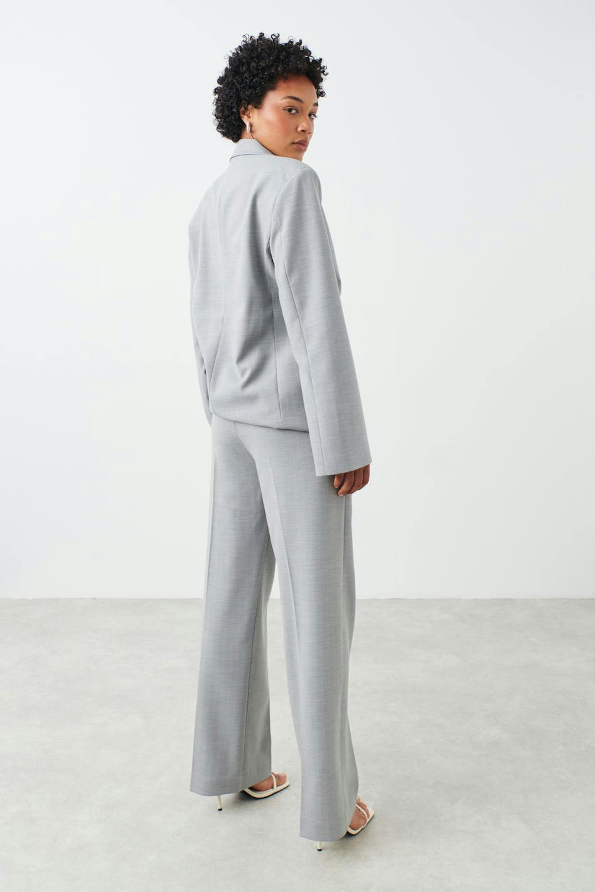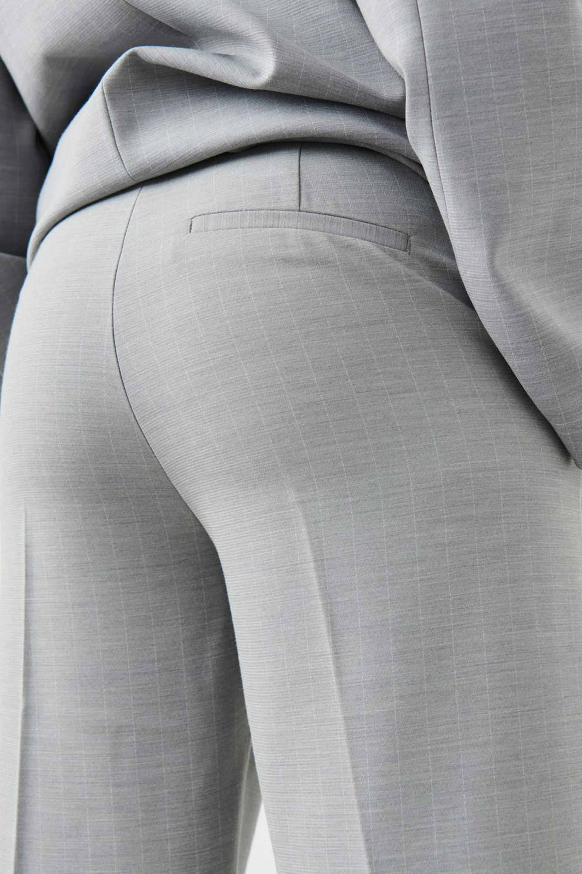 Raka kostymbyxor med pressveck. Byxorna är gråa och har fickor i sidorna. De har raka, långa byxben och en passpoalficka baktill.