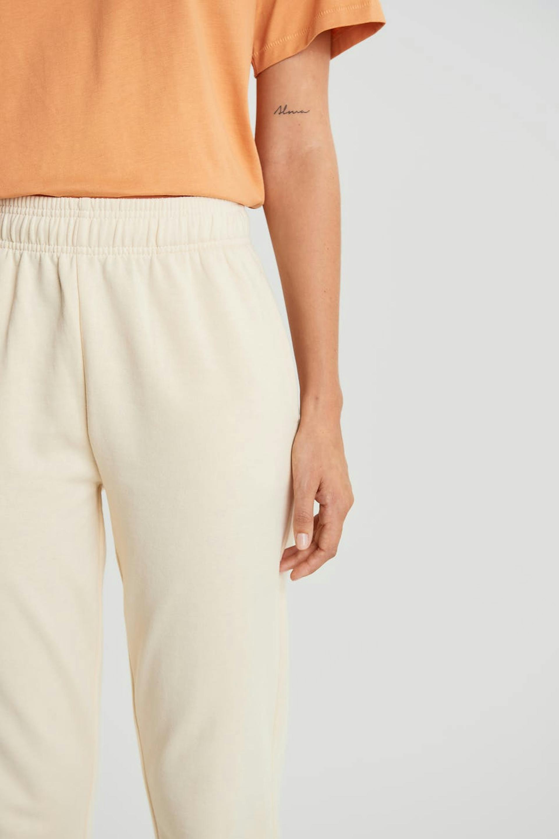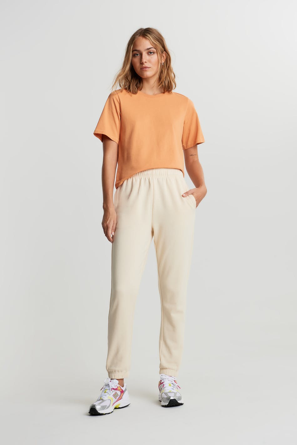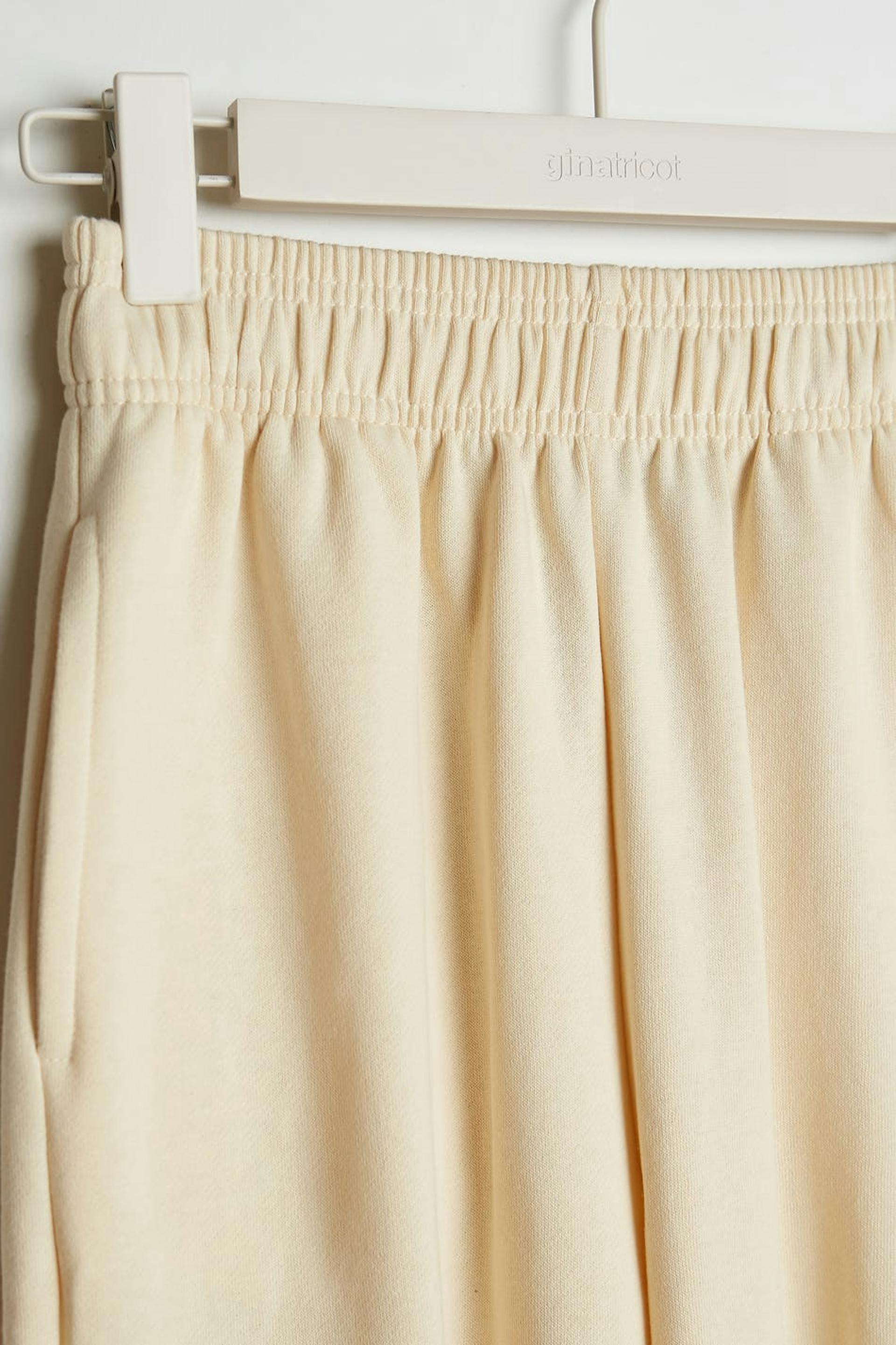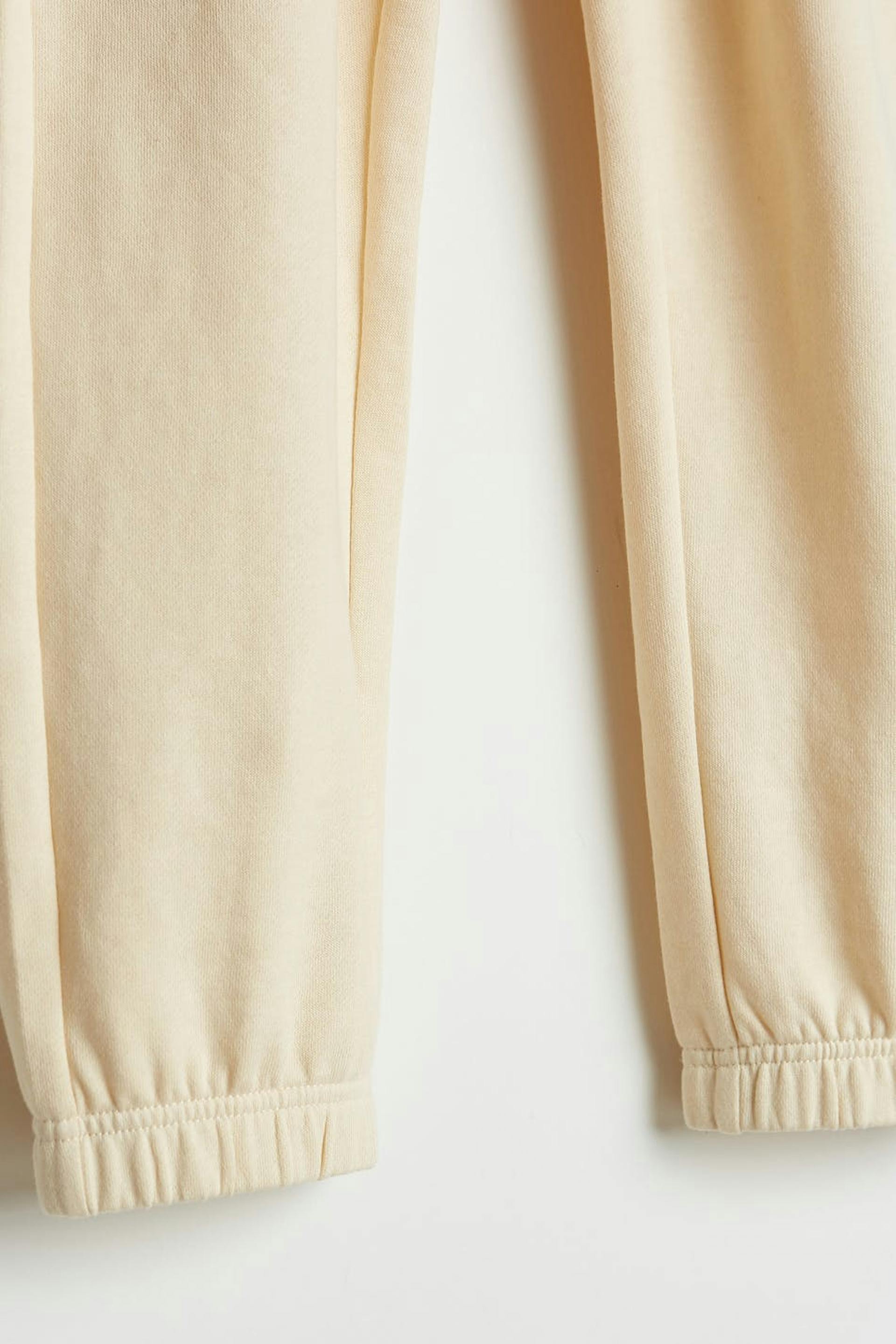 Mjukisbyxor med en normal passform. Byxorna är beigea och har en resår i midjan och vid bensluten. De är gjorda av trikå och har sidofickor.