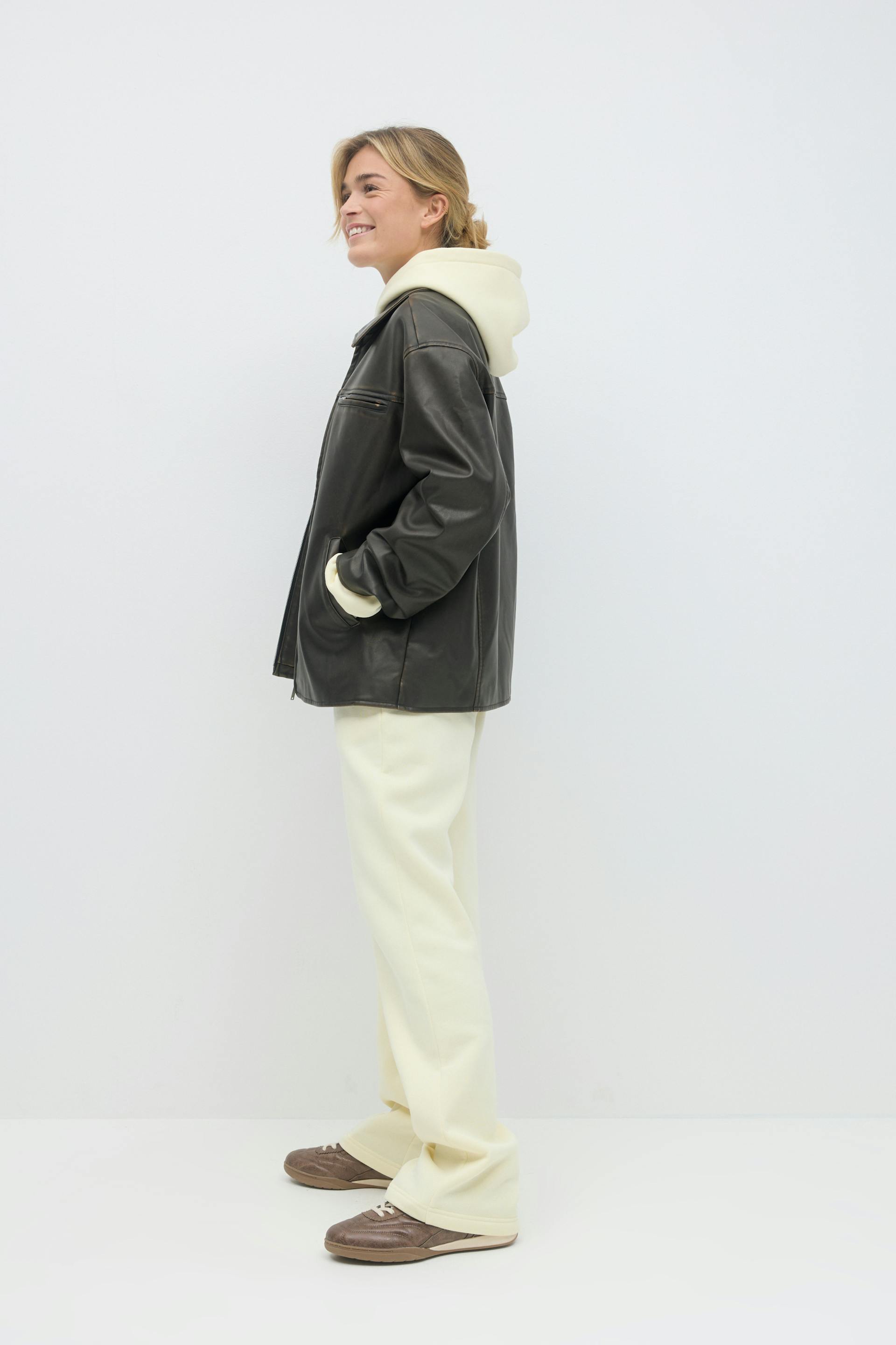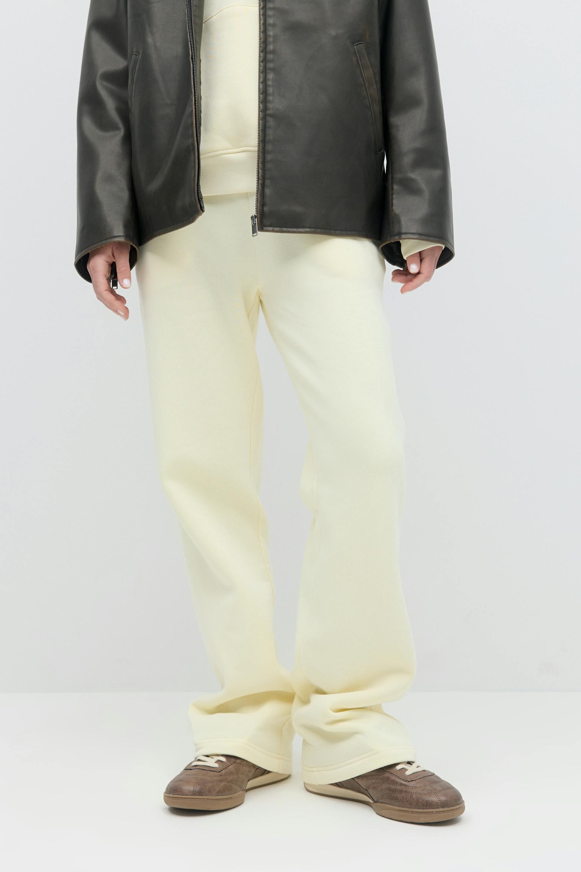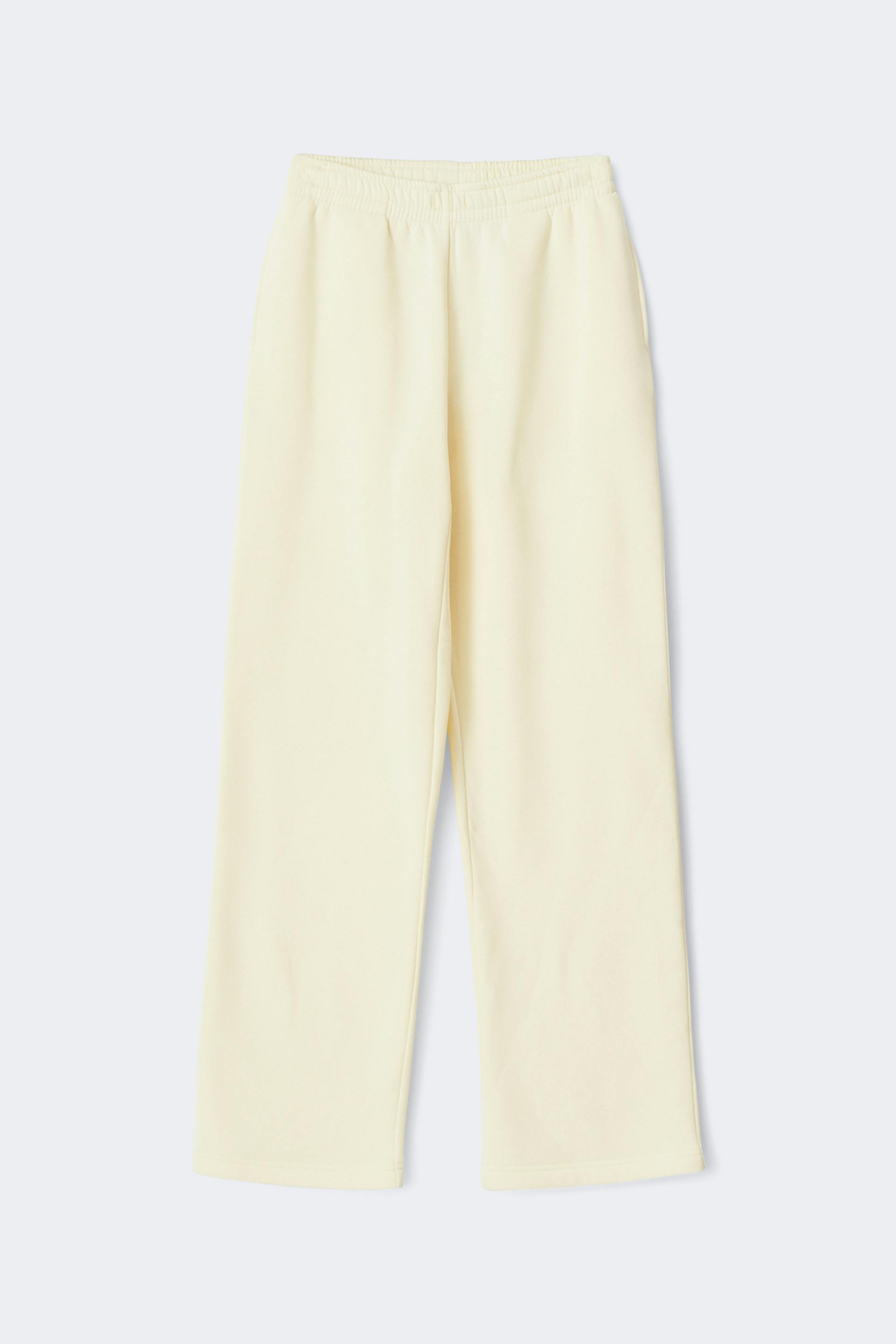 Mjukisbyxor med normal passform. Byxorna är gula och har fickor i sidorna. De har raka ben och resår i midjan med knytning framtill.