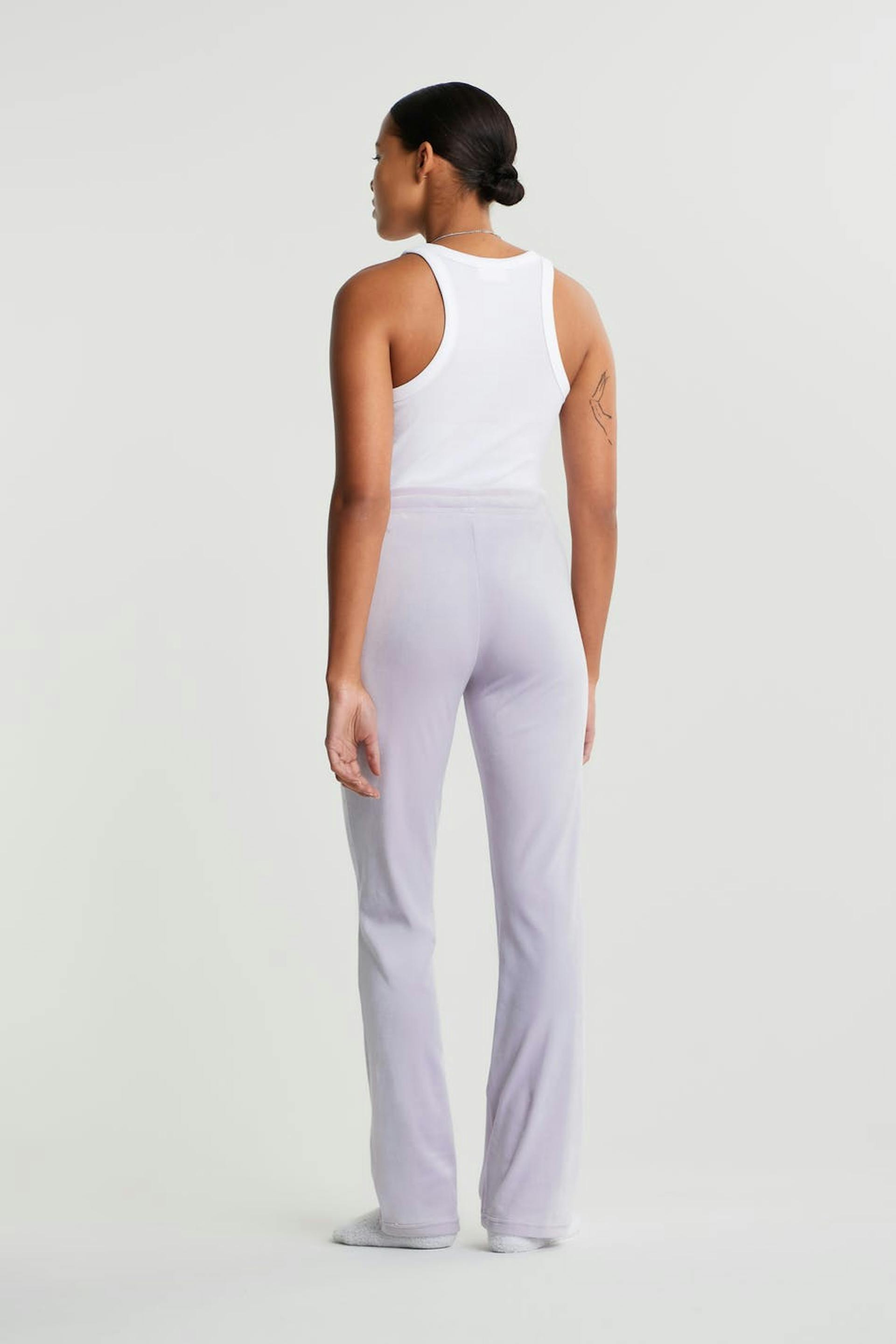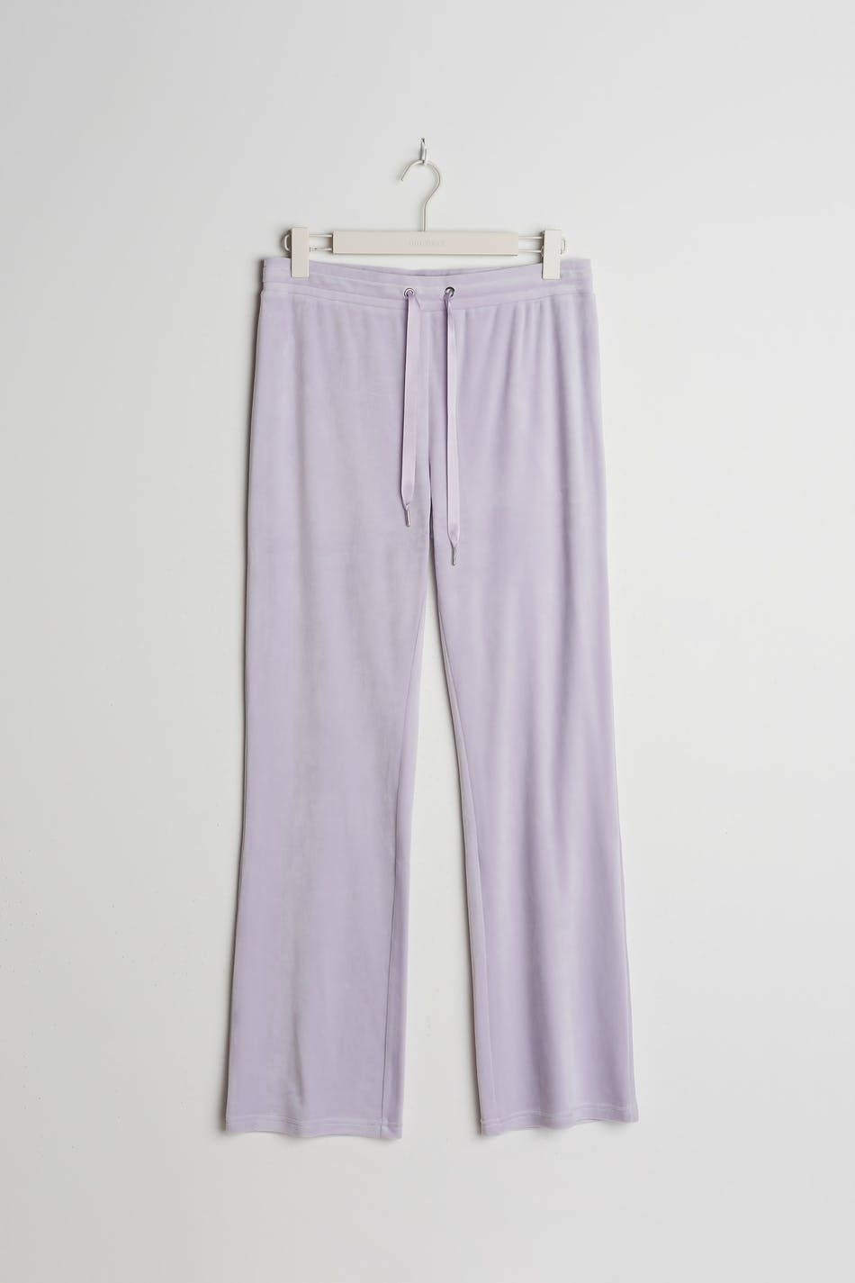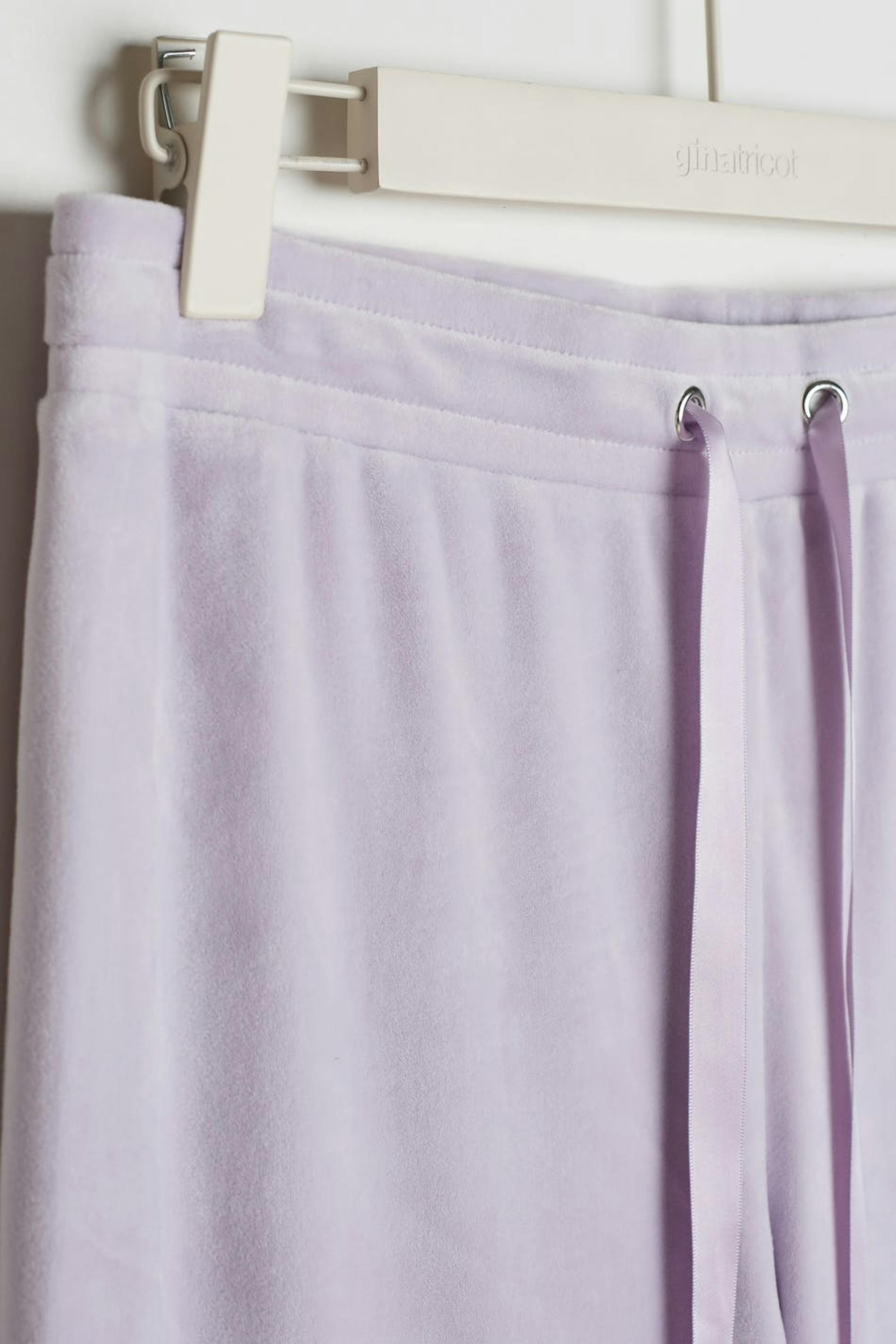 Mjukisbyxor med raka ben. Byxorna är lila och har en midja med ett resårband och en dragsko. De är gjorda av velour. Får inte komma i kontakt med eld.