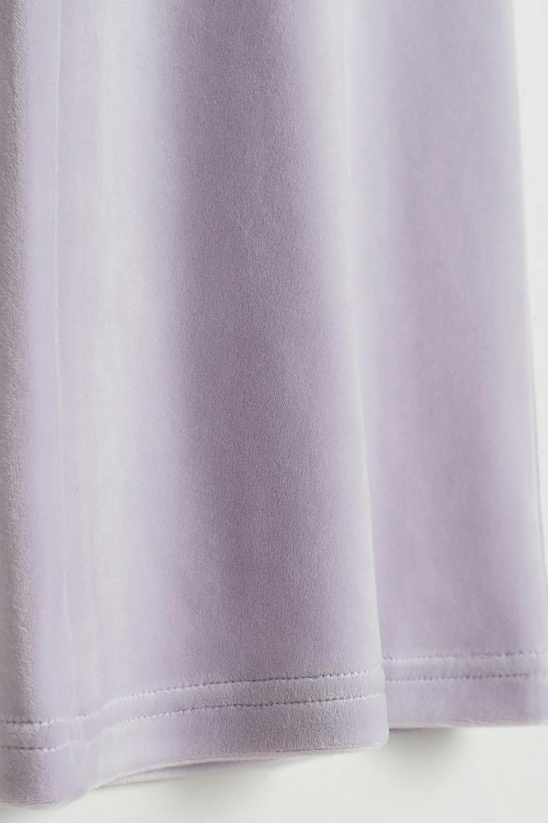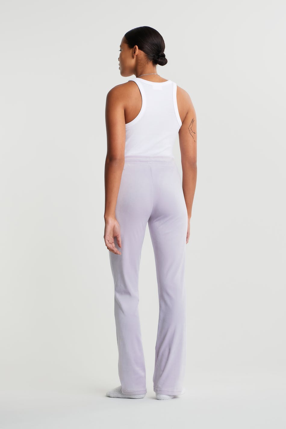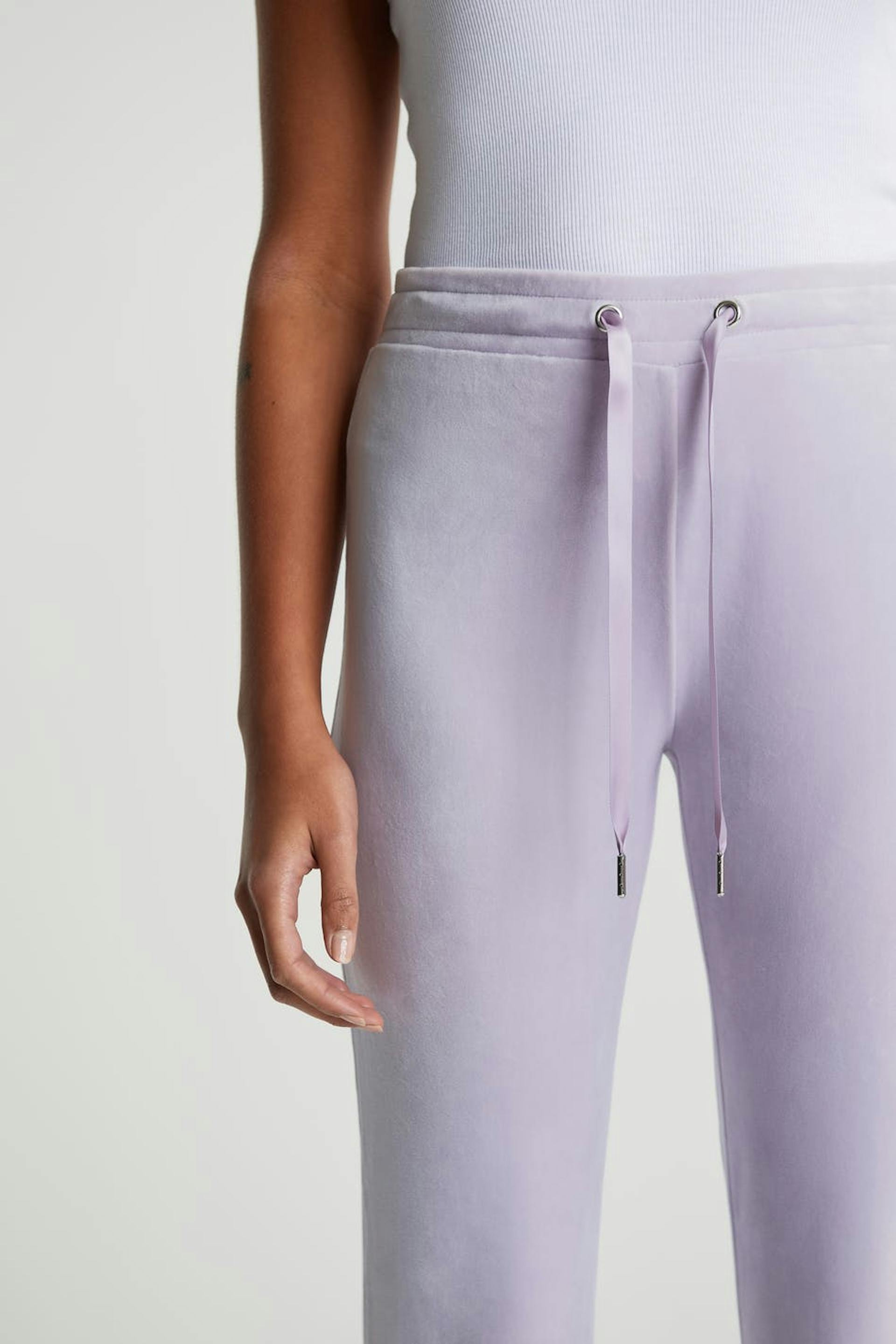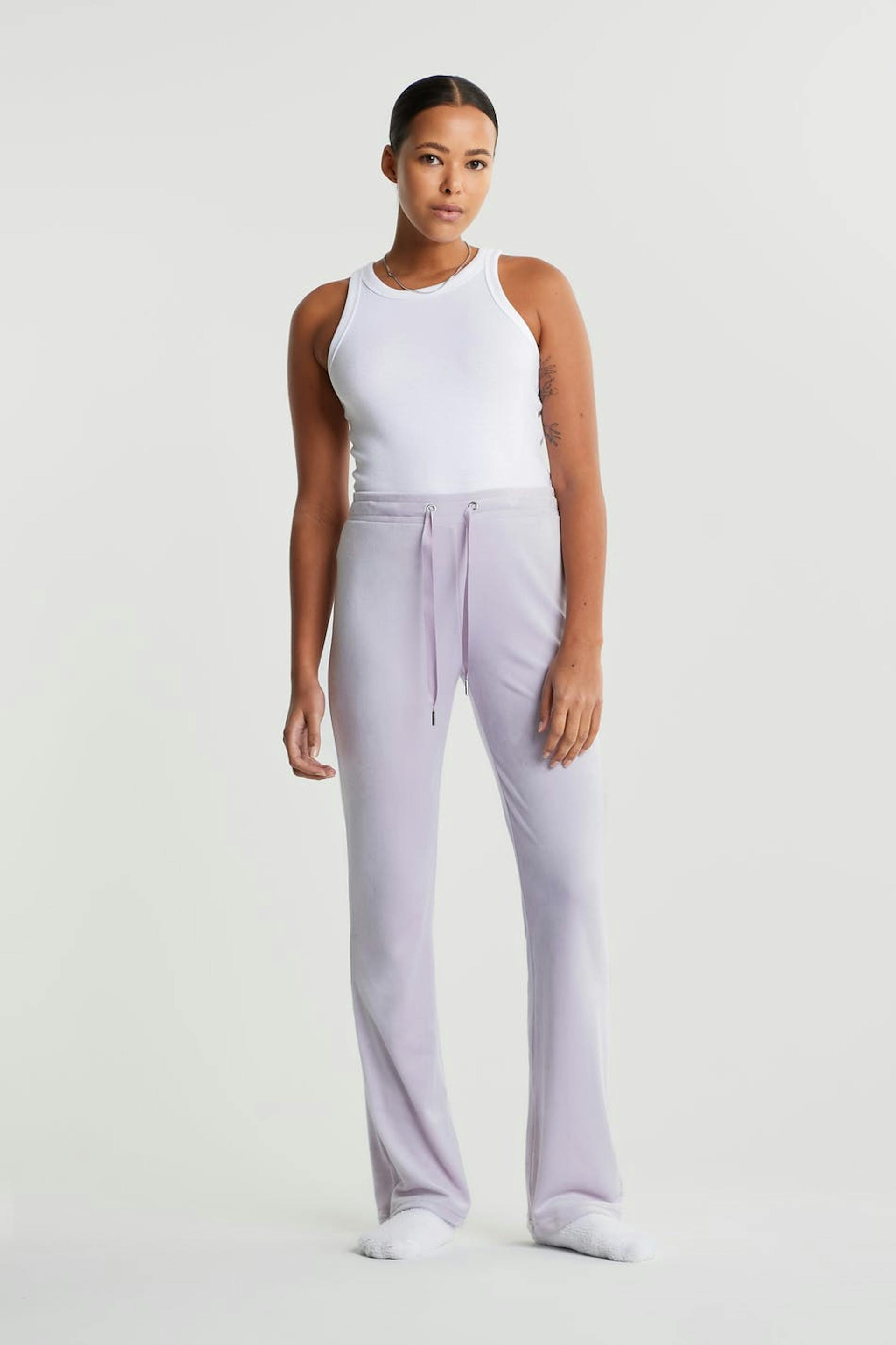 Mjukisbyxor med raka ben. Byxorna är lila och har en midja med ett resårband och en dragsko. De är gjorda av velour. Får inte komma i kontakt med eld.