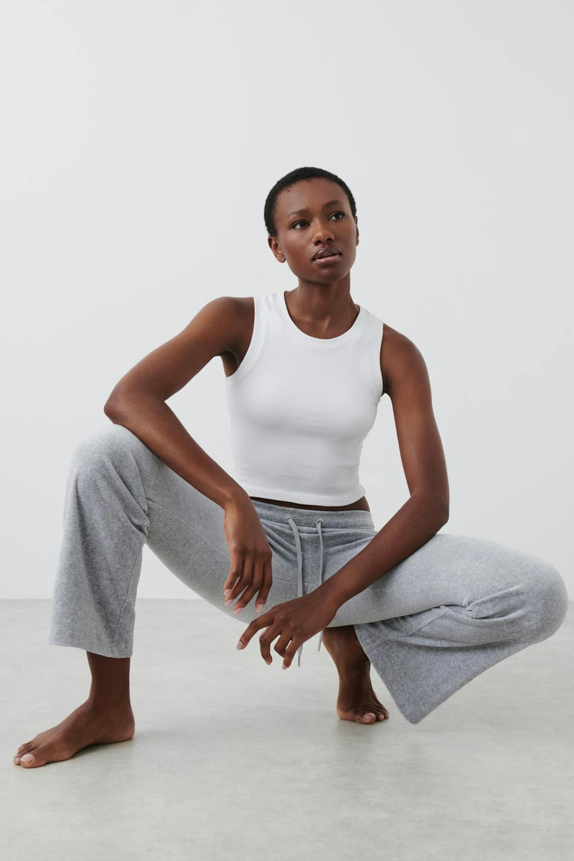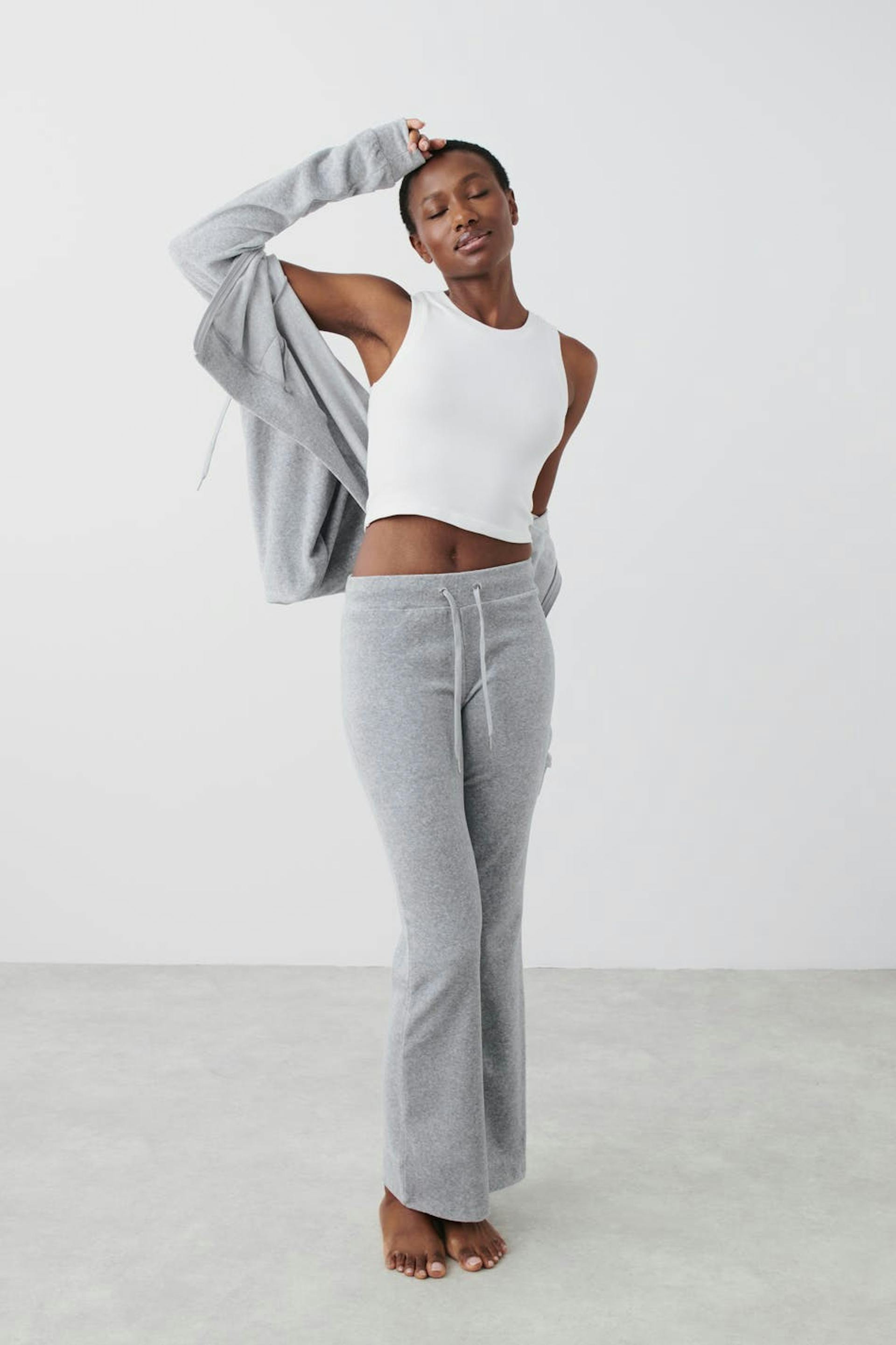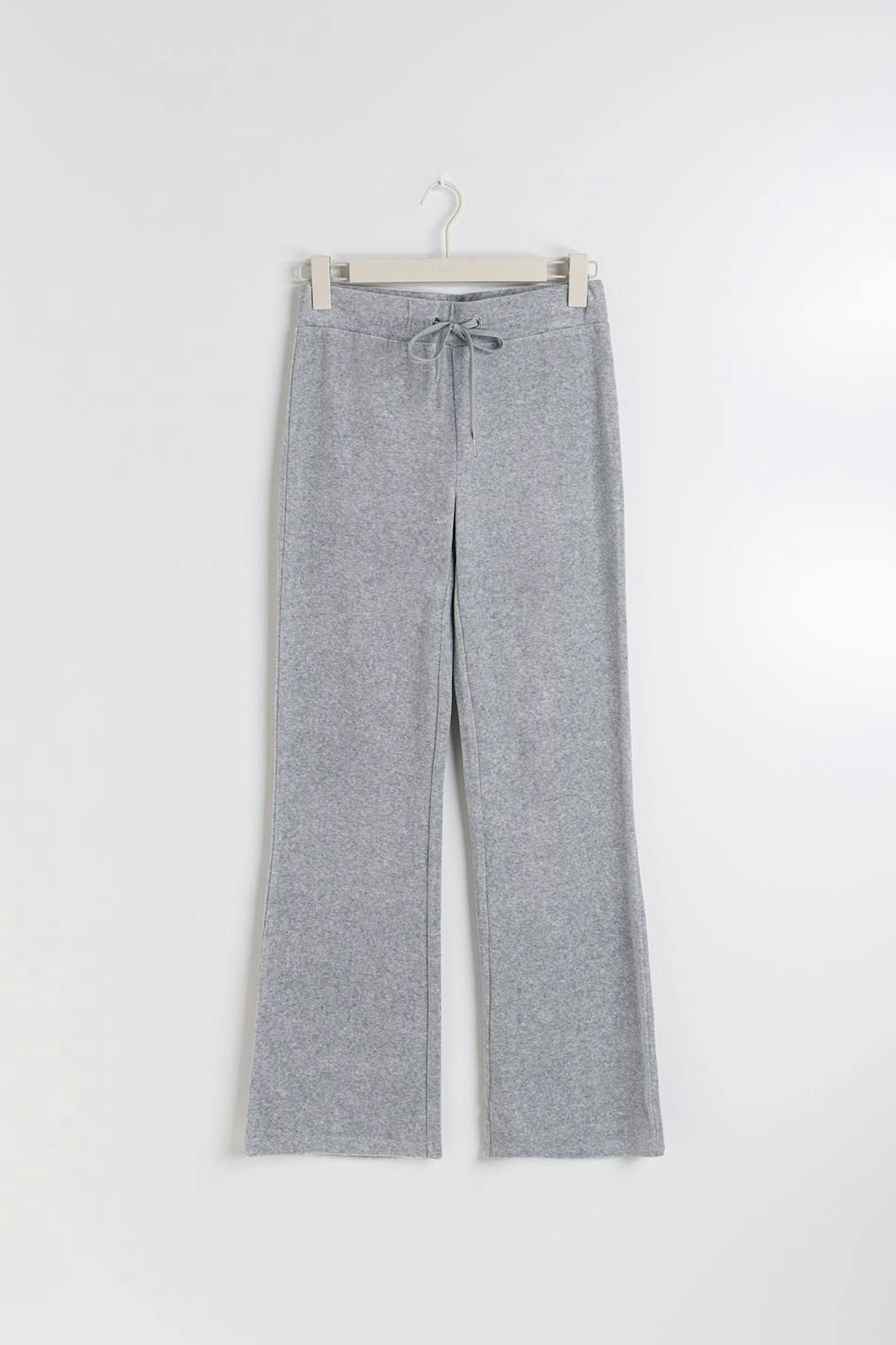 Mjukisbyxor i velour med låg midja. Byxorna är gråa och har utsvängda ben. De har resår i midjan och knytbar dragsko framtill.