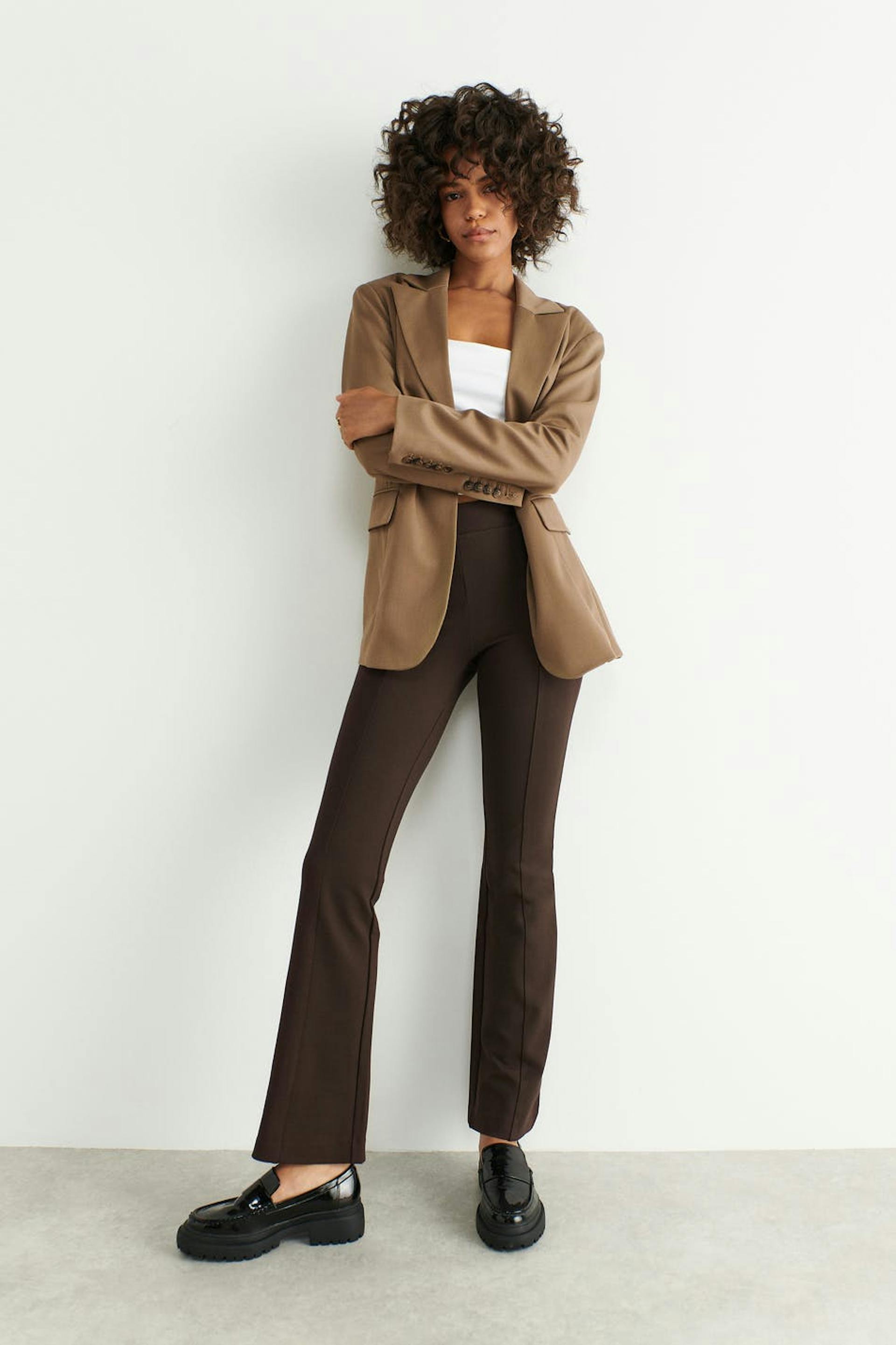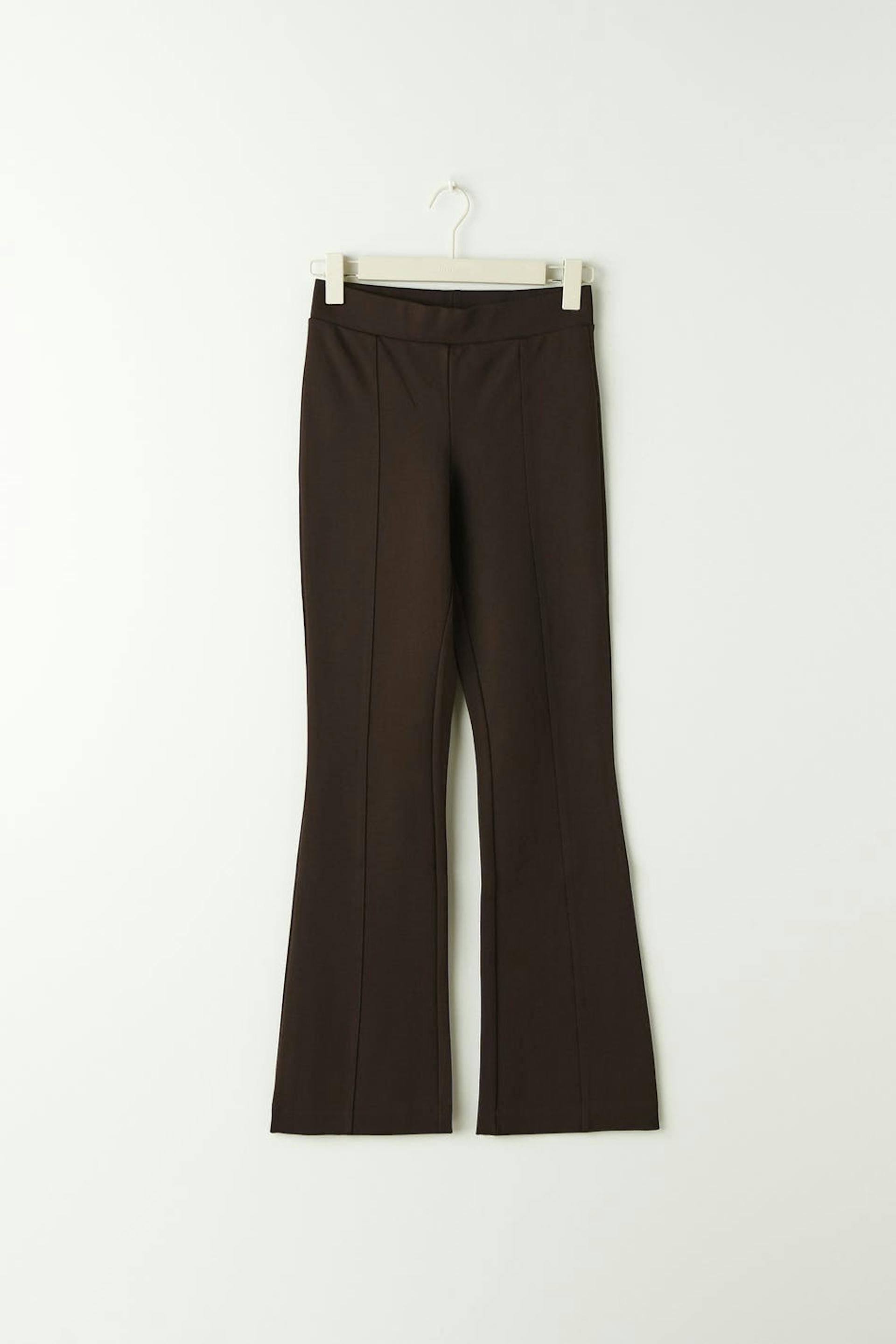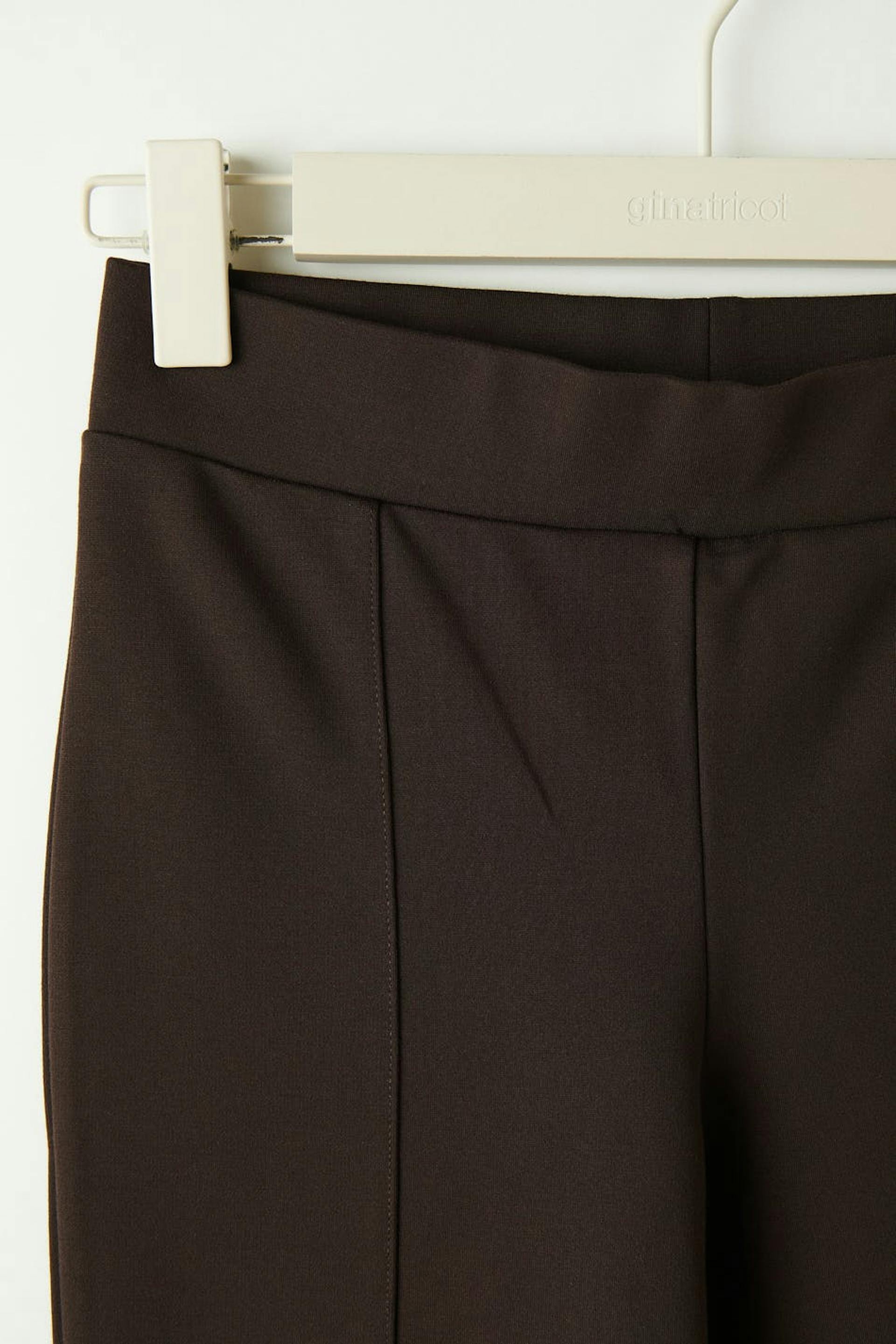 Utsvängda byxor i trikå med mjuk resår i midjan. Byxorna är bruna och har passpoalerade fickor baktill.
