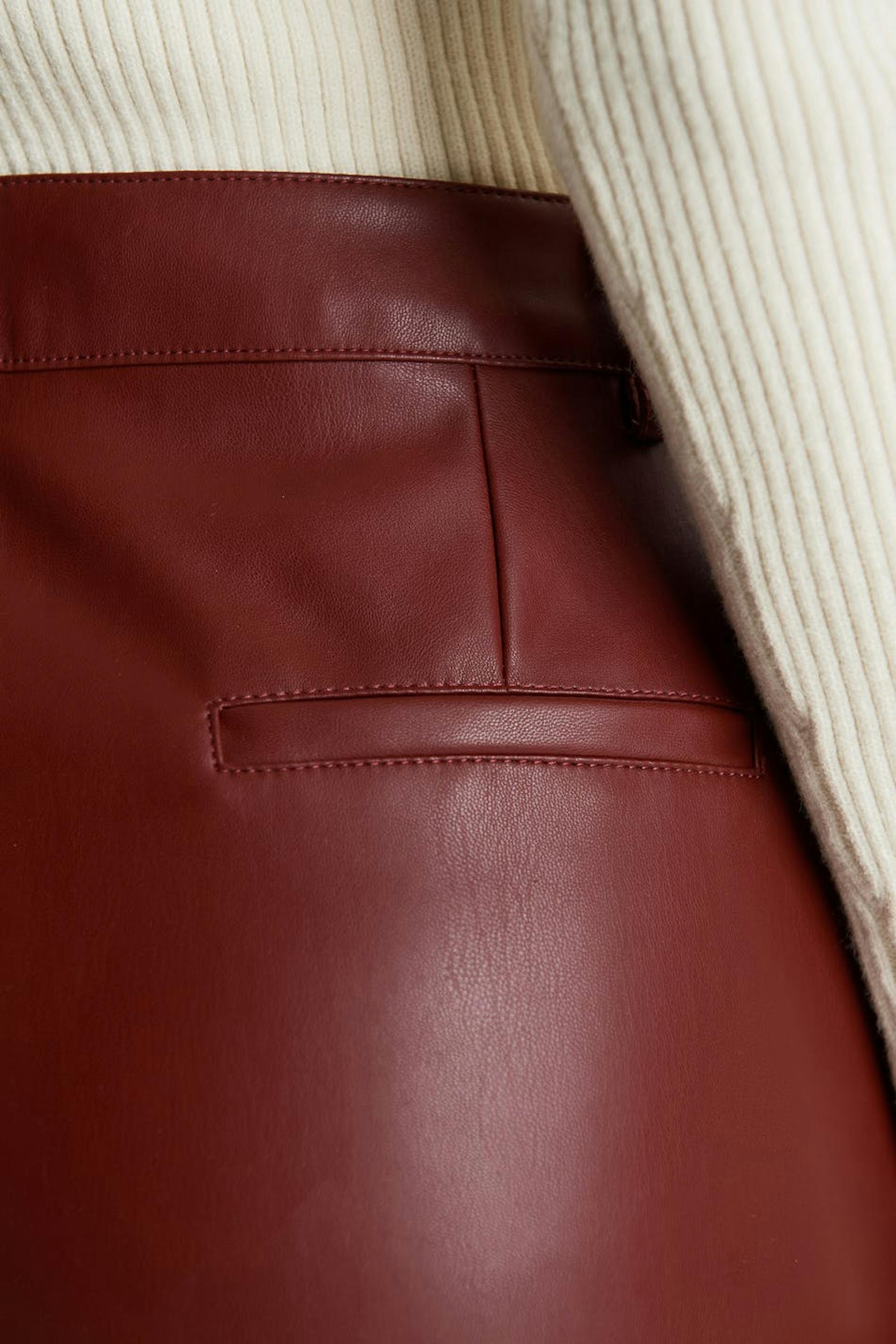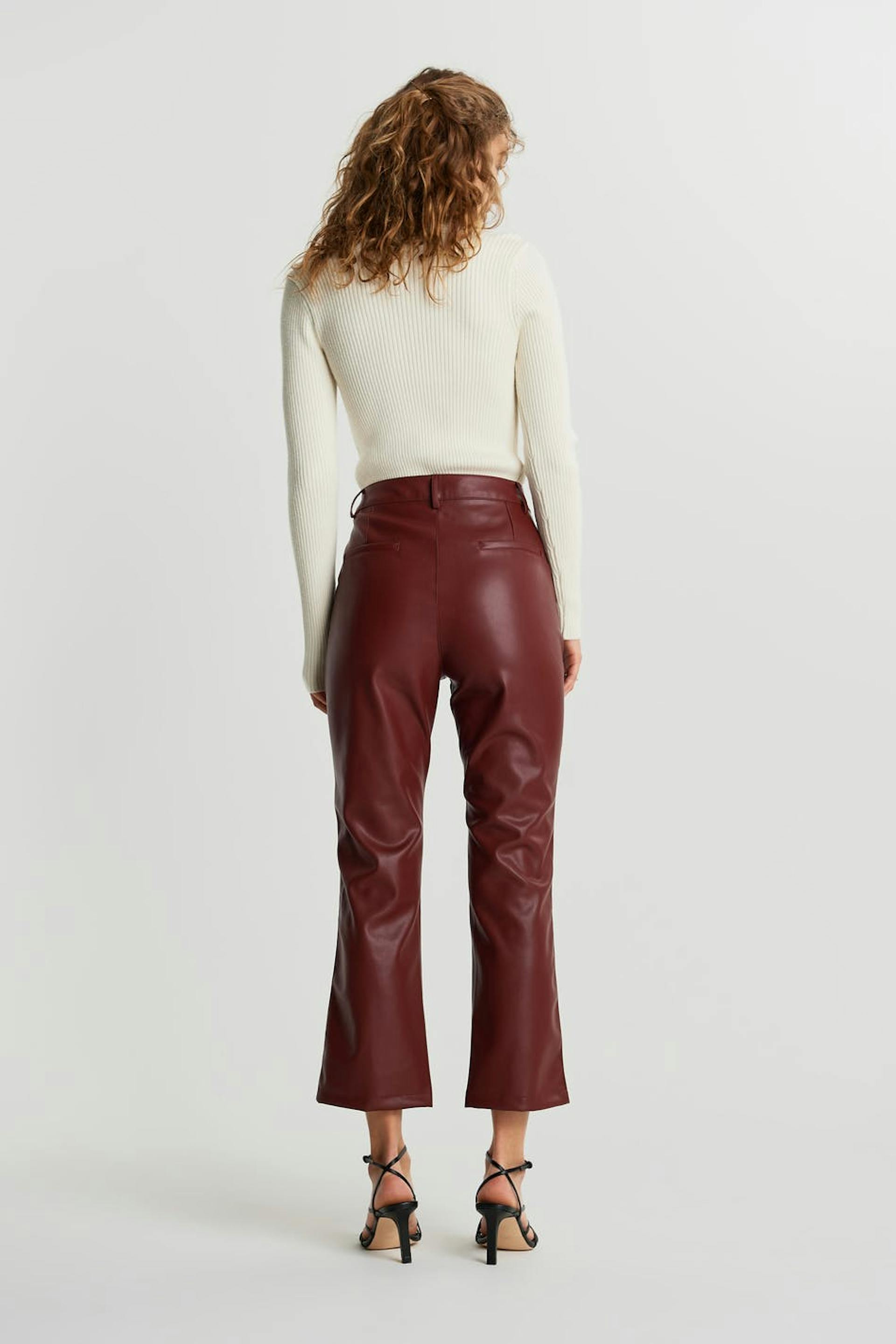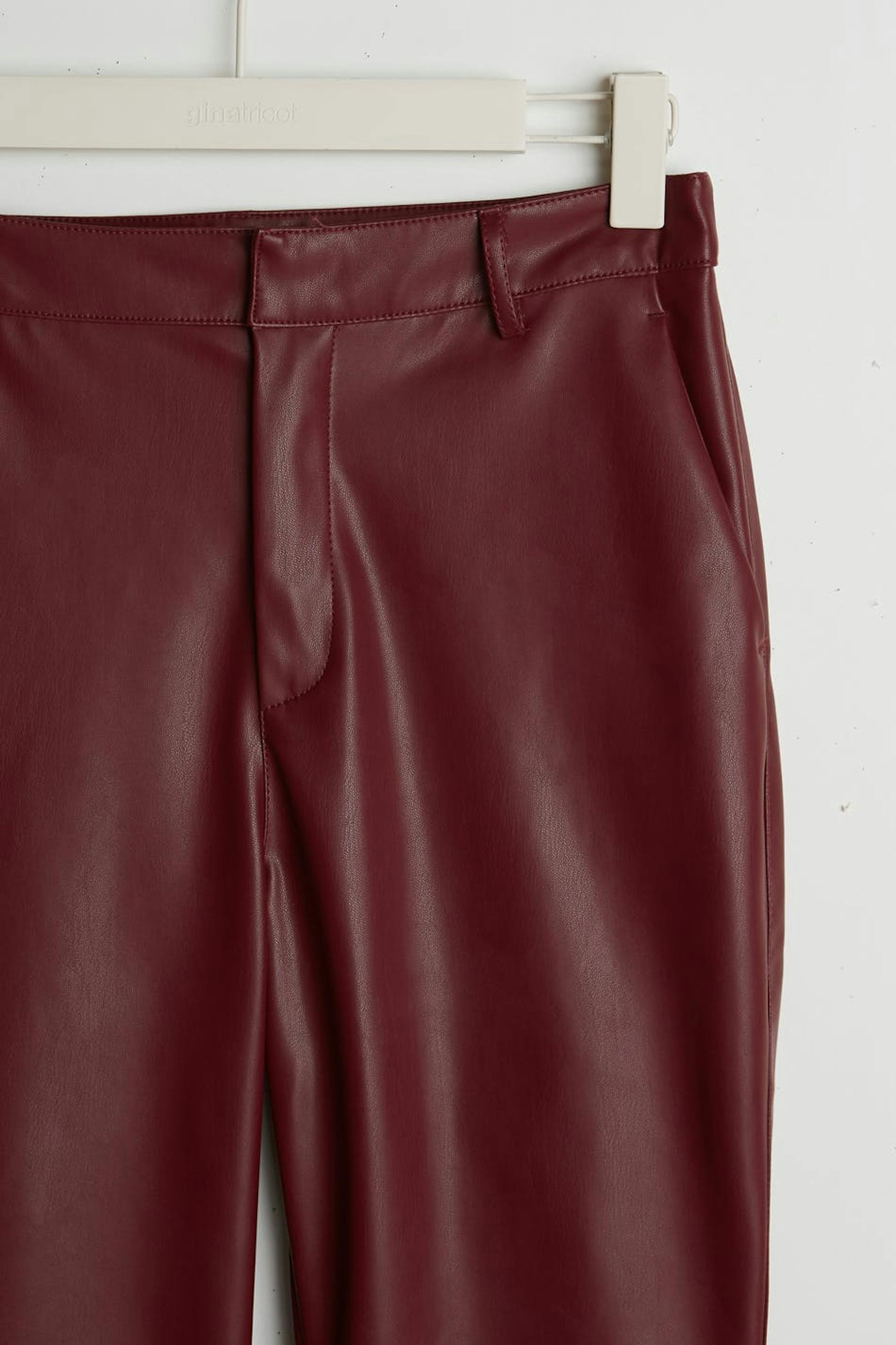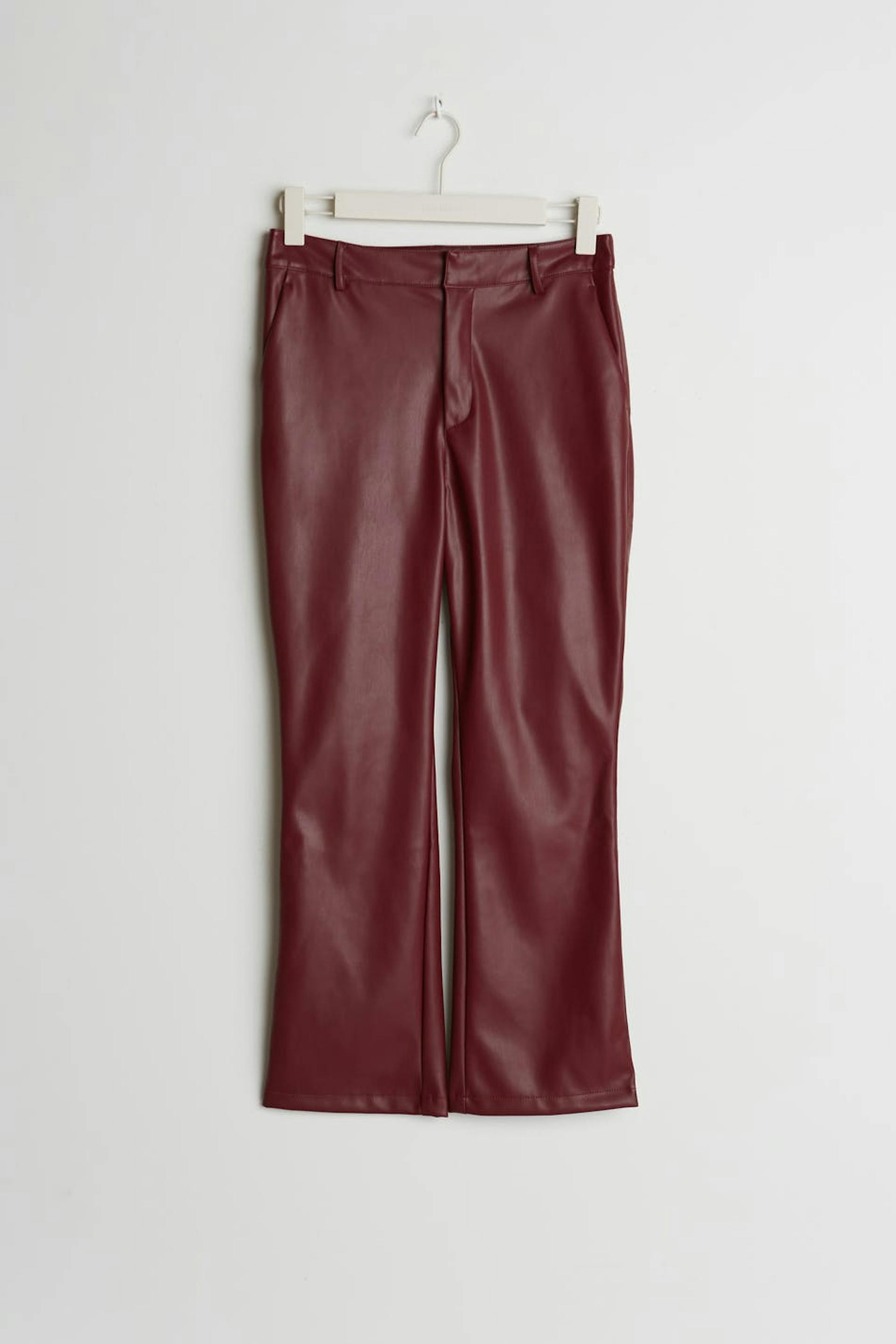 Rak byxa med något utsvängda byxben. Byxan är röd och croppad och har fickor på sidorna. Den är gjord av PU.