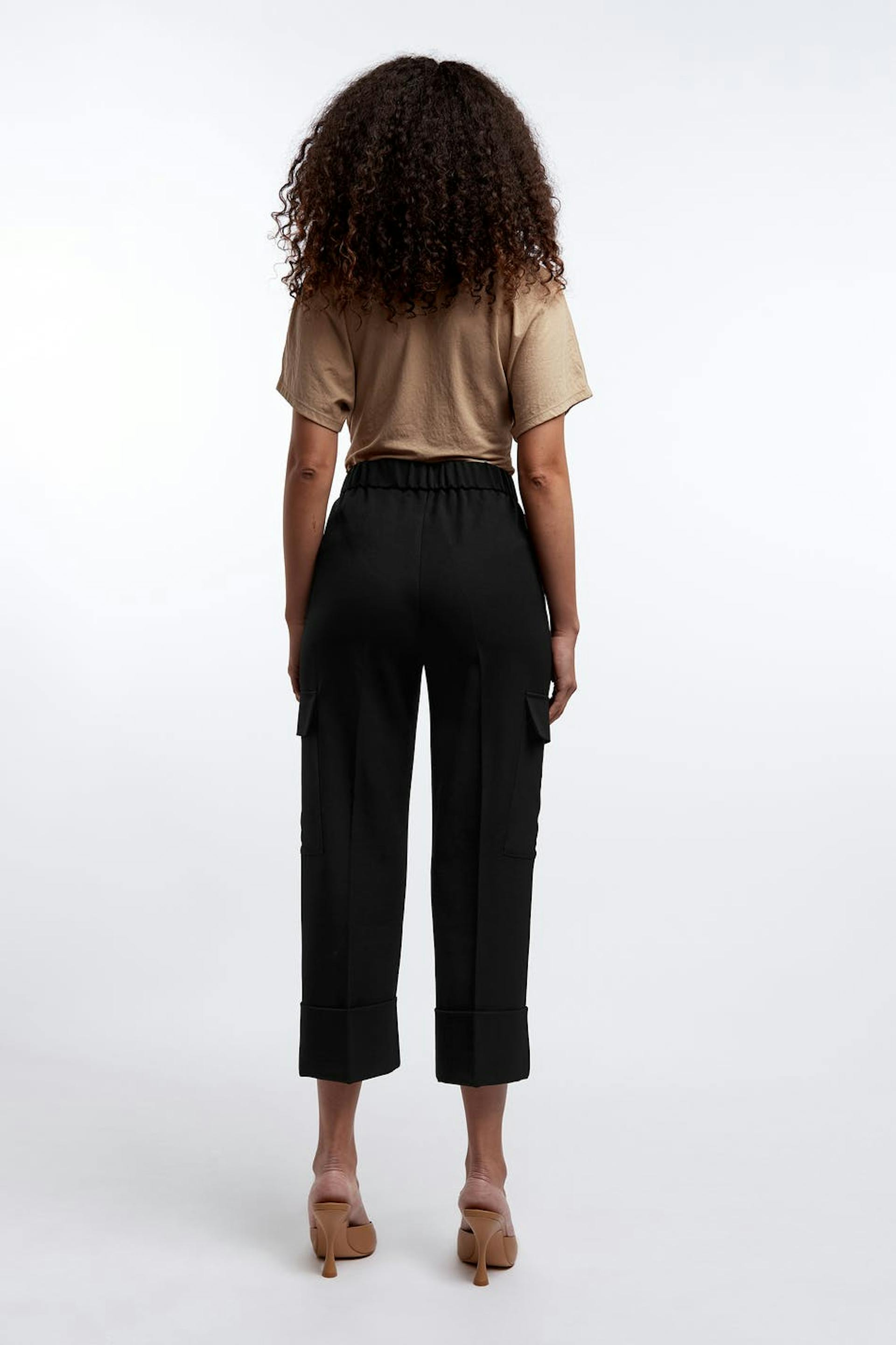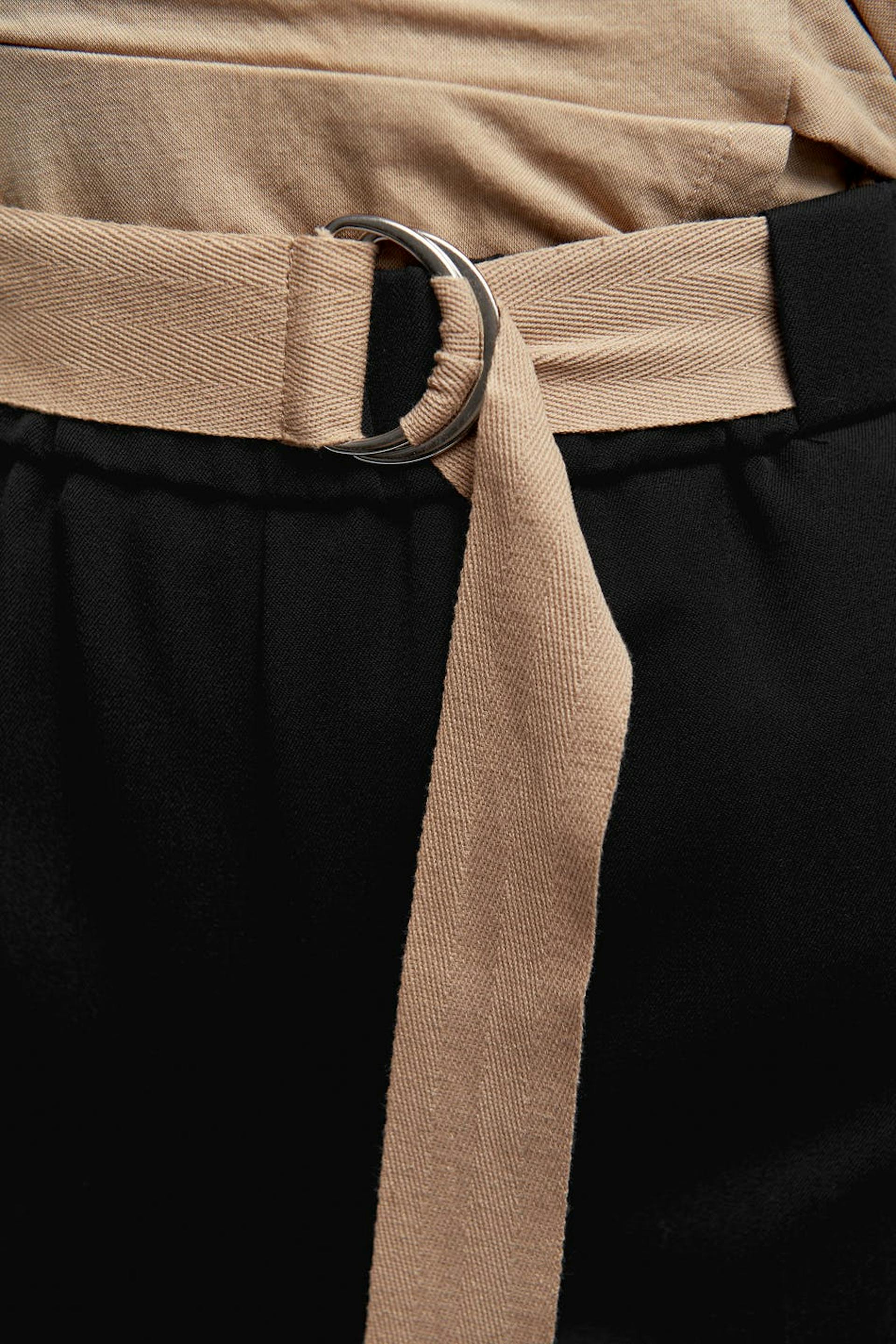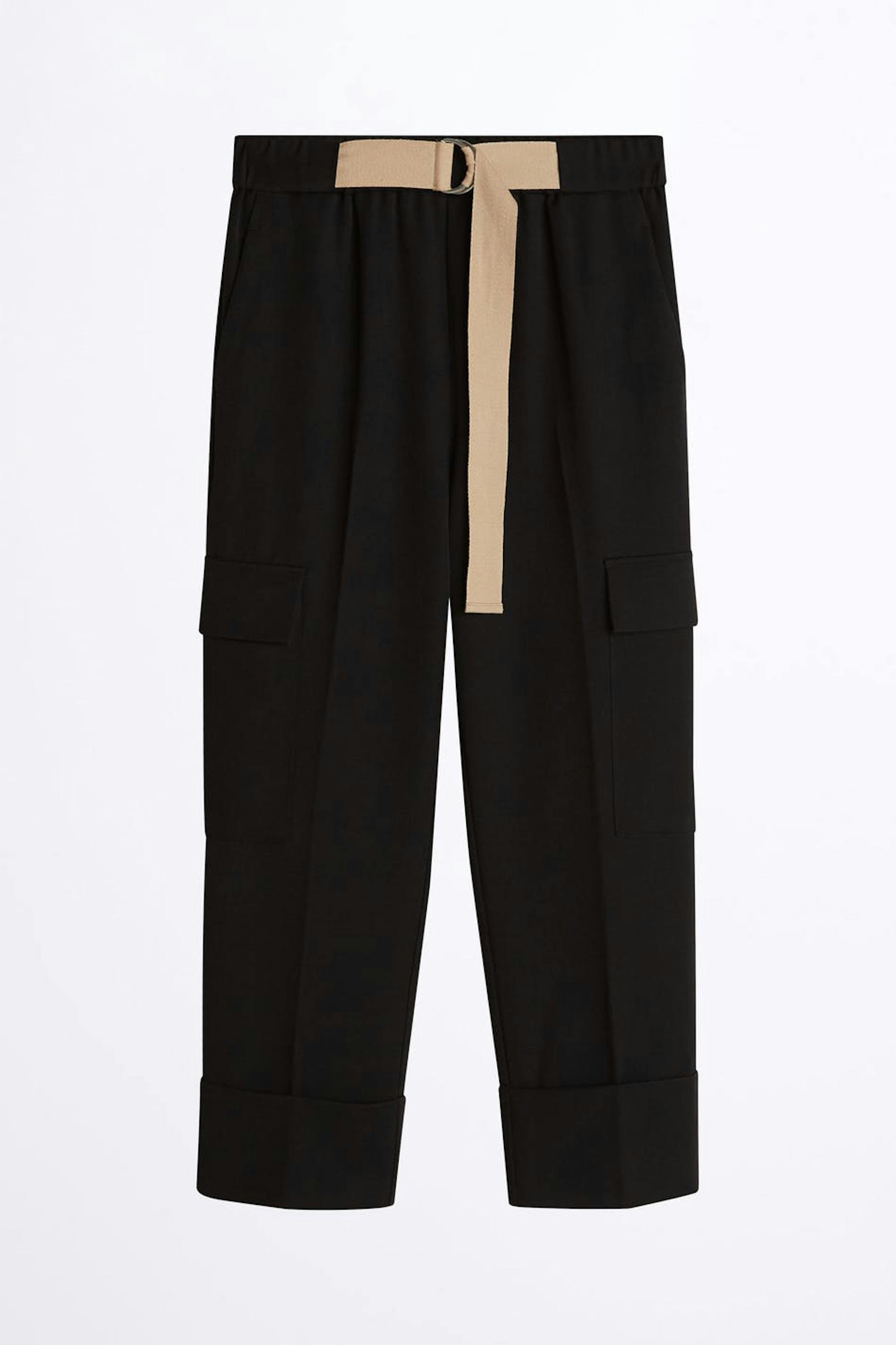 Croppade byxor med fickor på sidorna. Byxorna är svarta och har ett bälte i midjan.