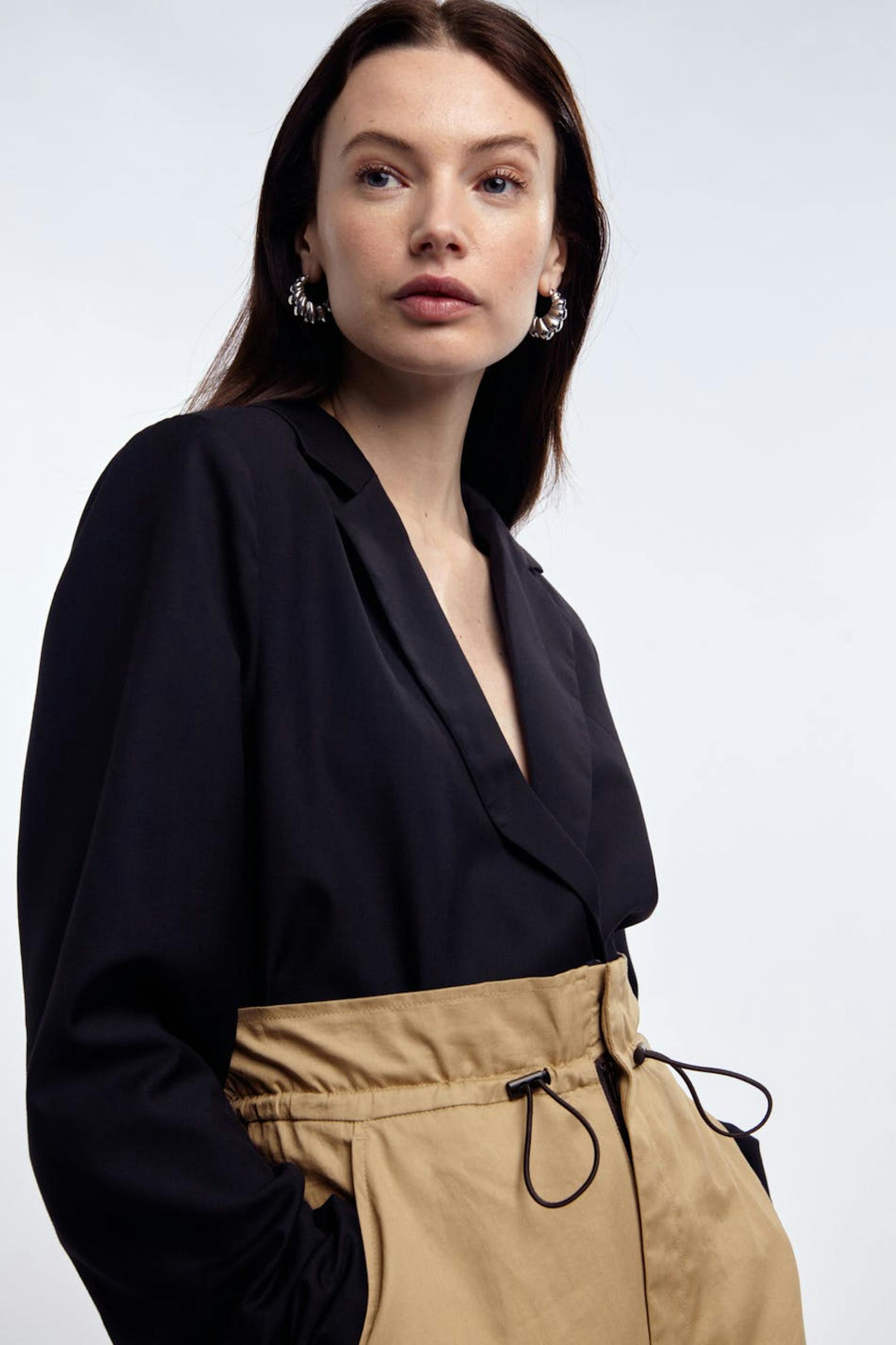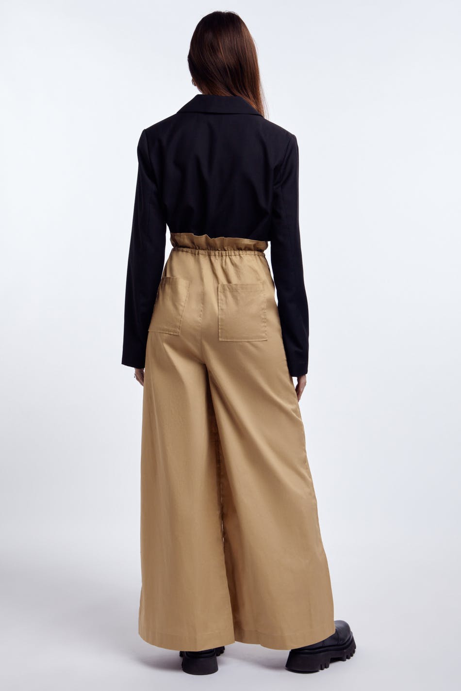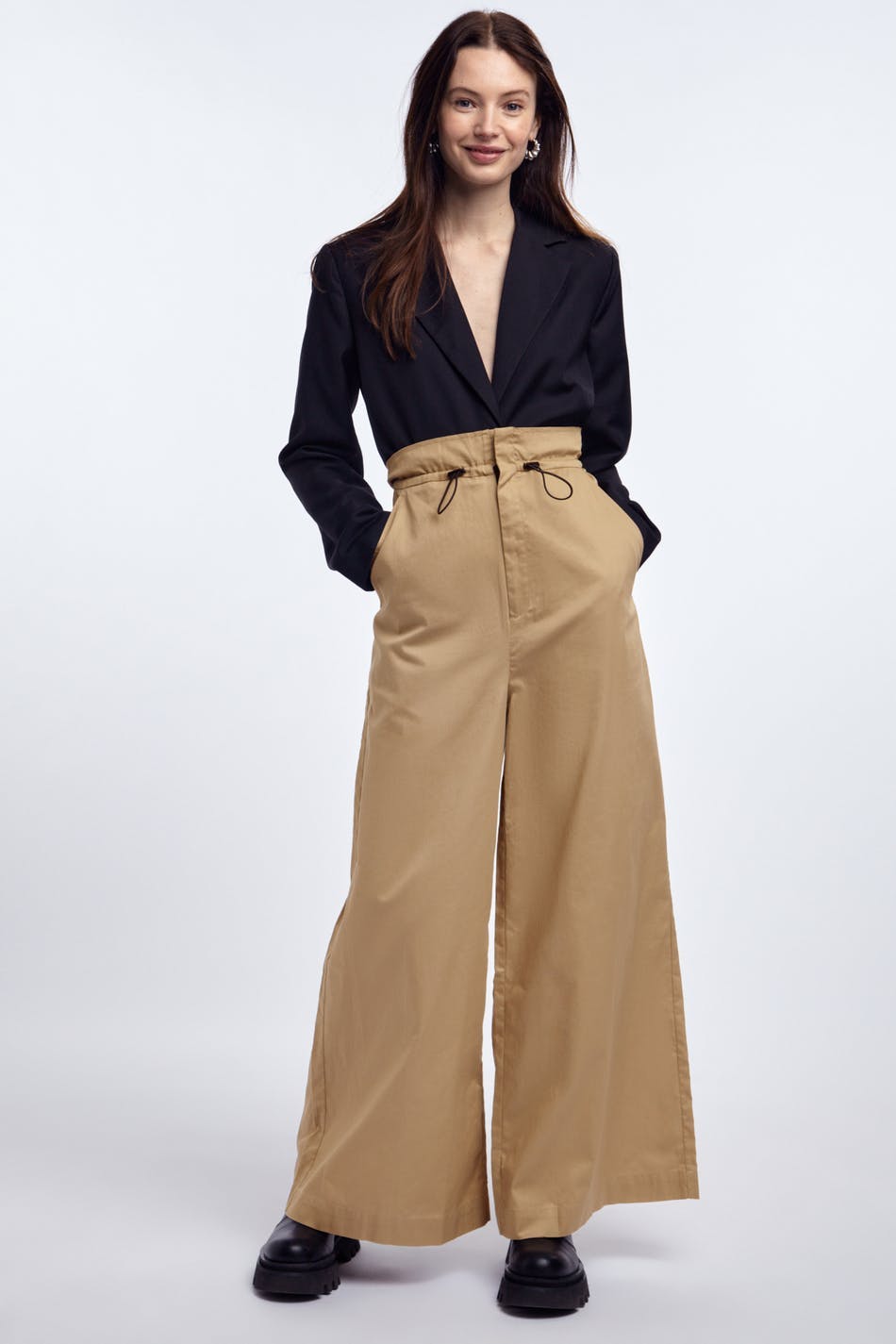 Byxor med en midja i resår med en dragsko. Byxorna är beigea och har sidofickor. De har vida byxben.