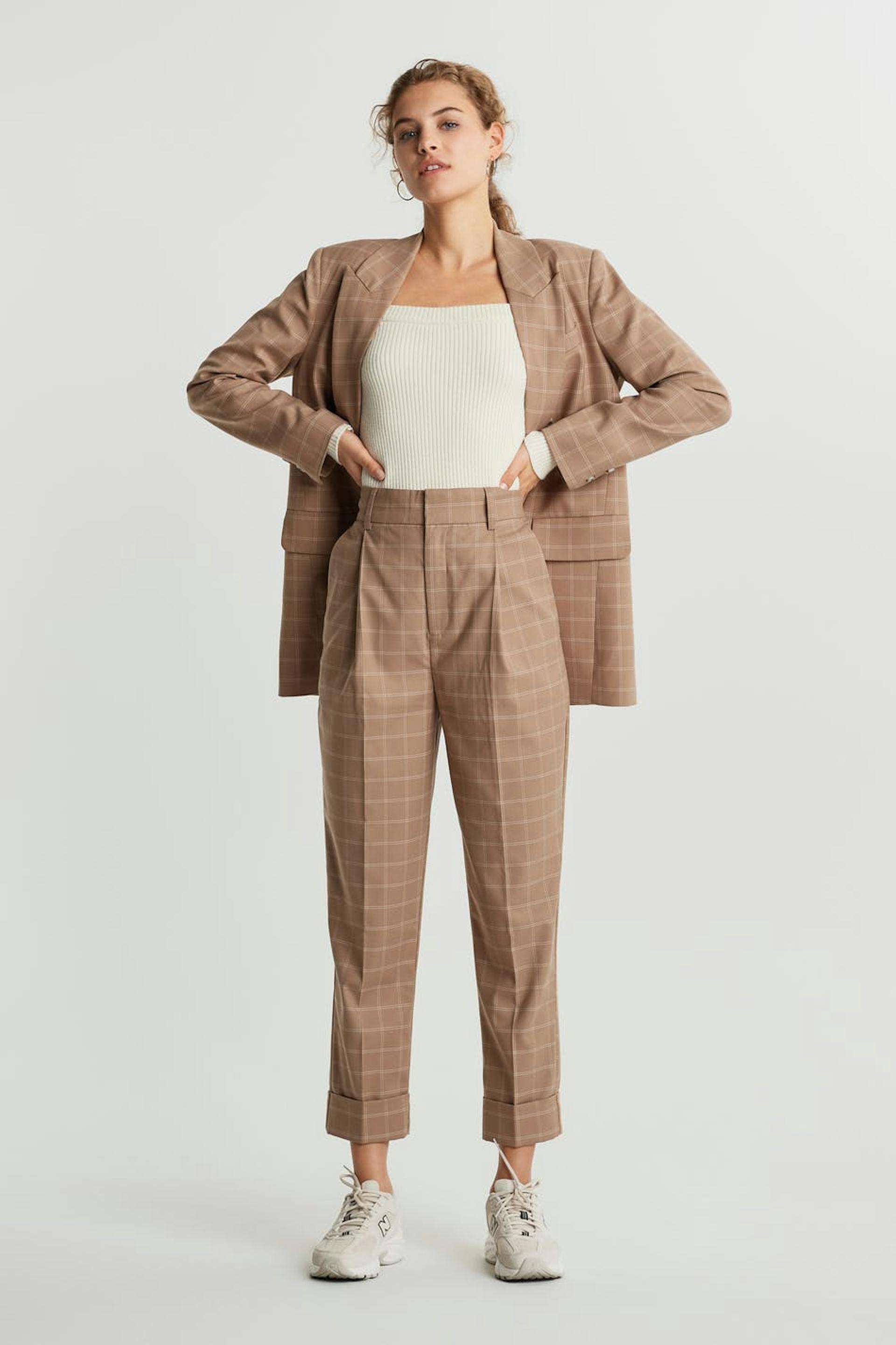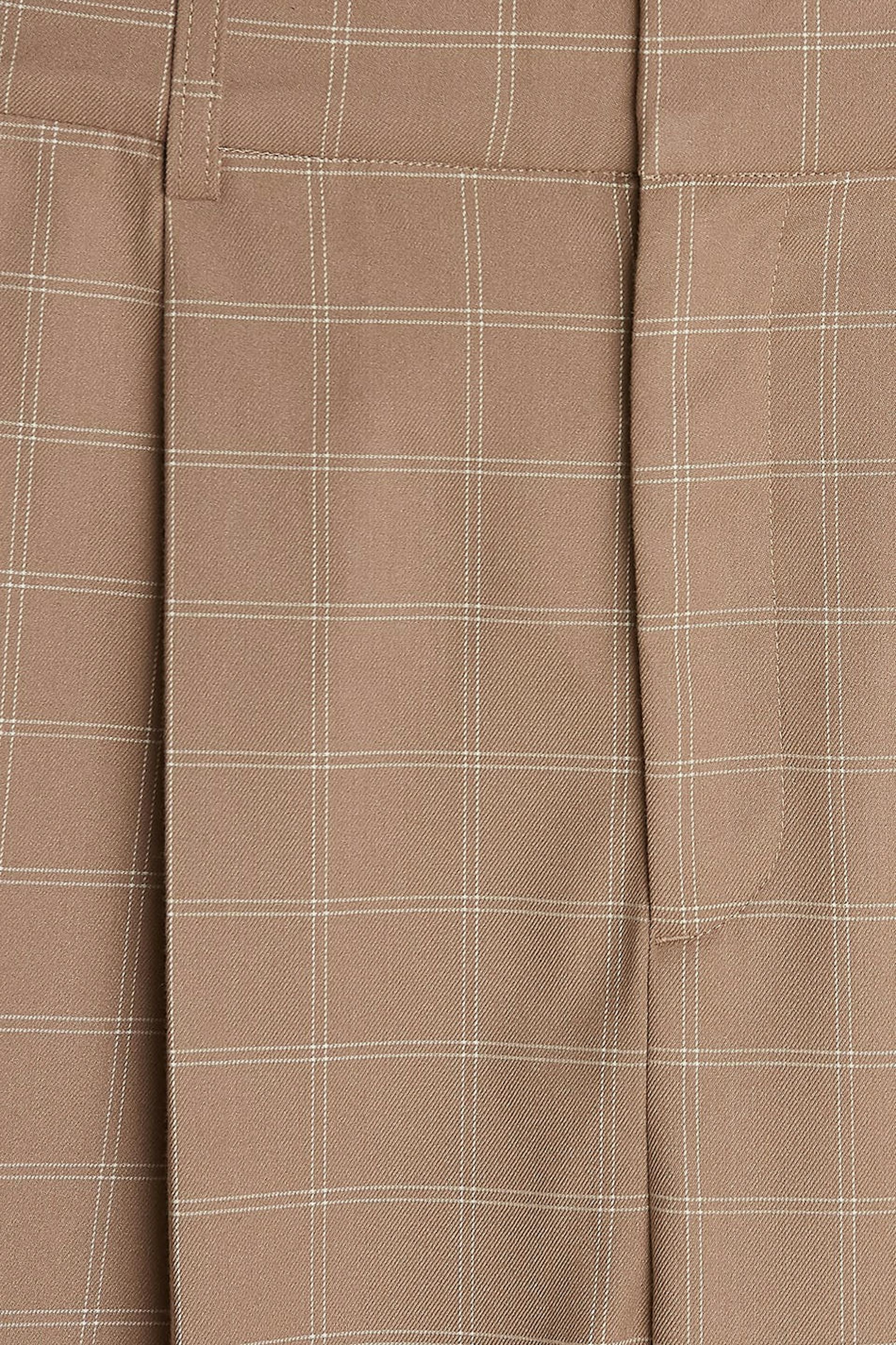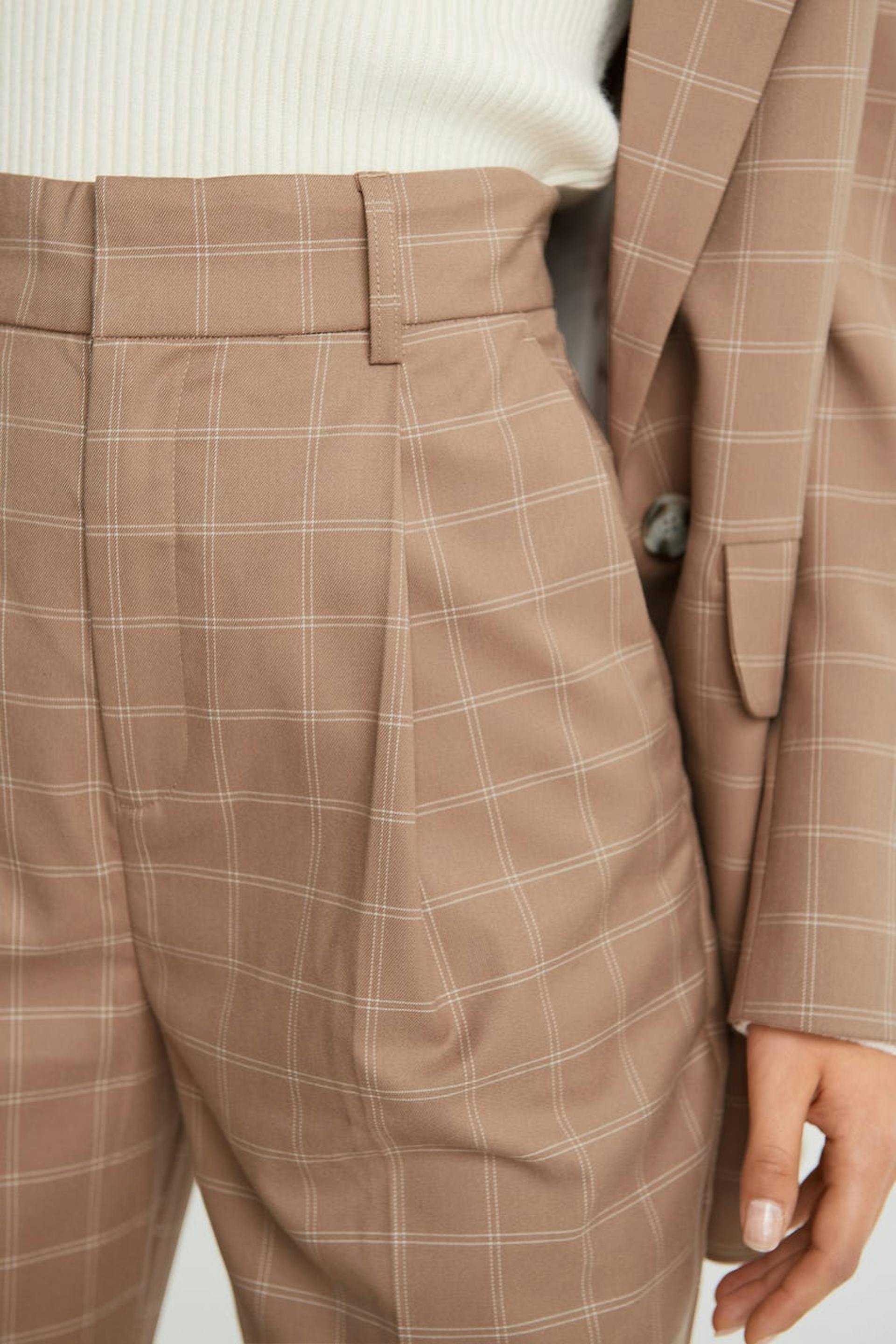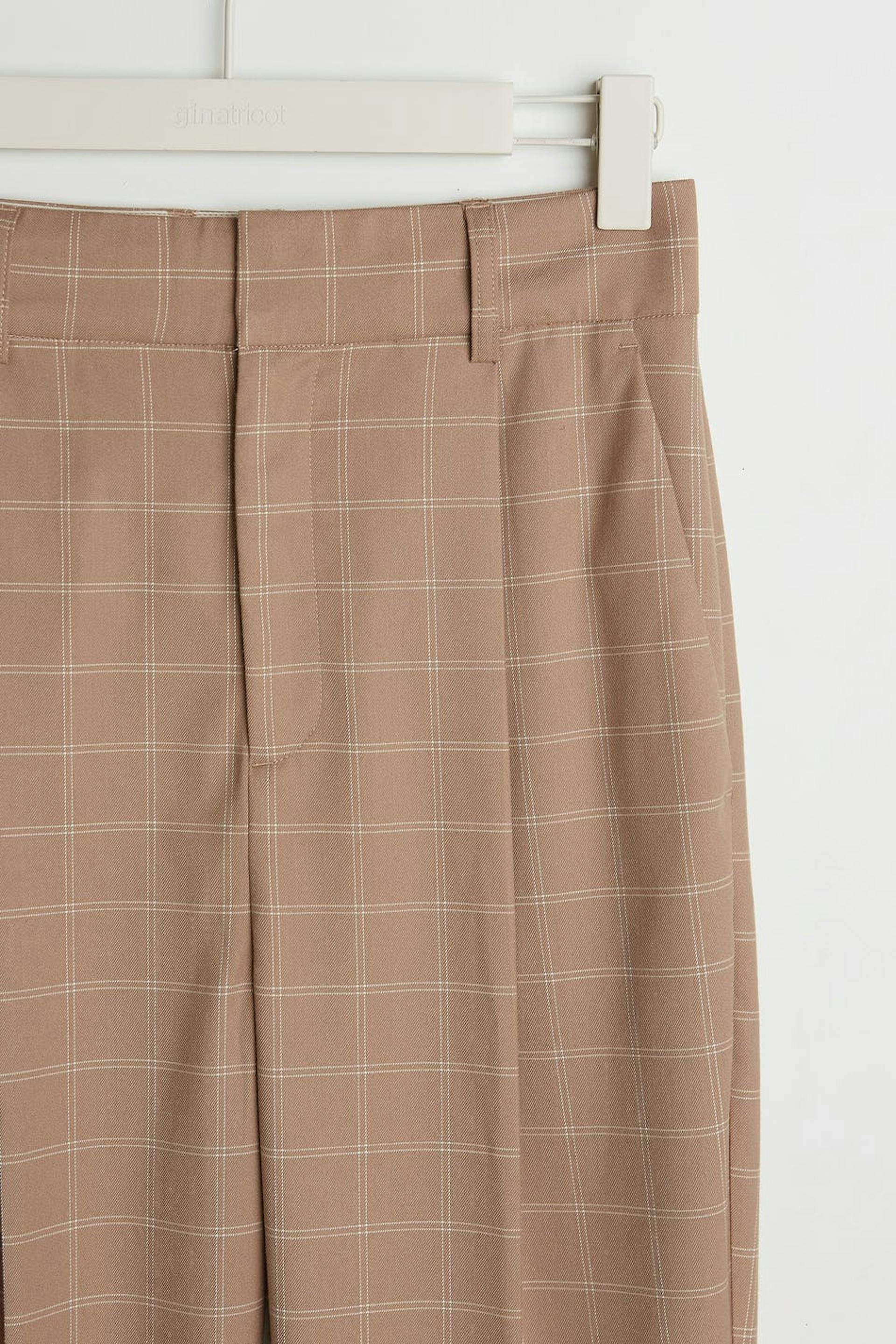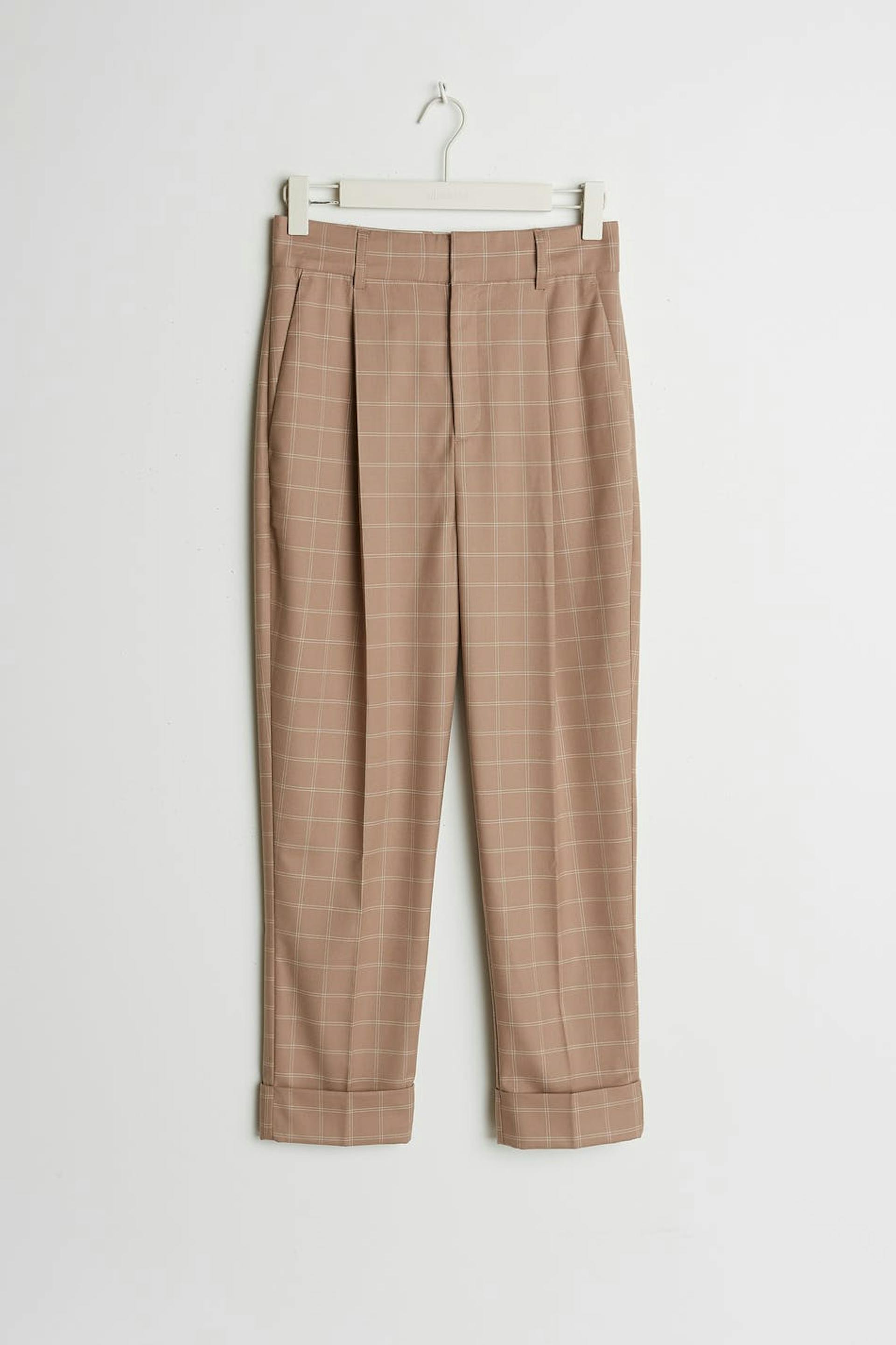 Rutig kostymbyxa med uppvikta ben. Byxan är beige och har pressveck. Den har en lös passform.