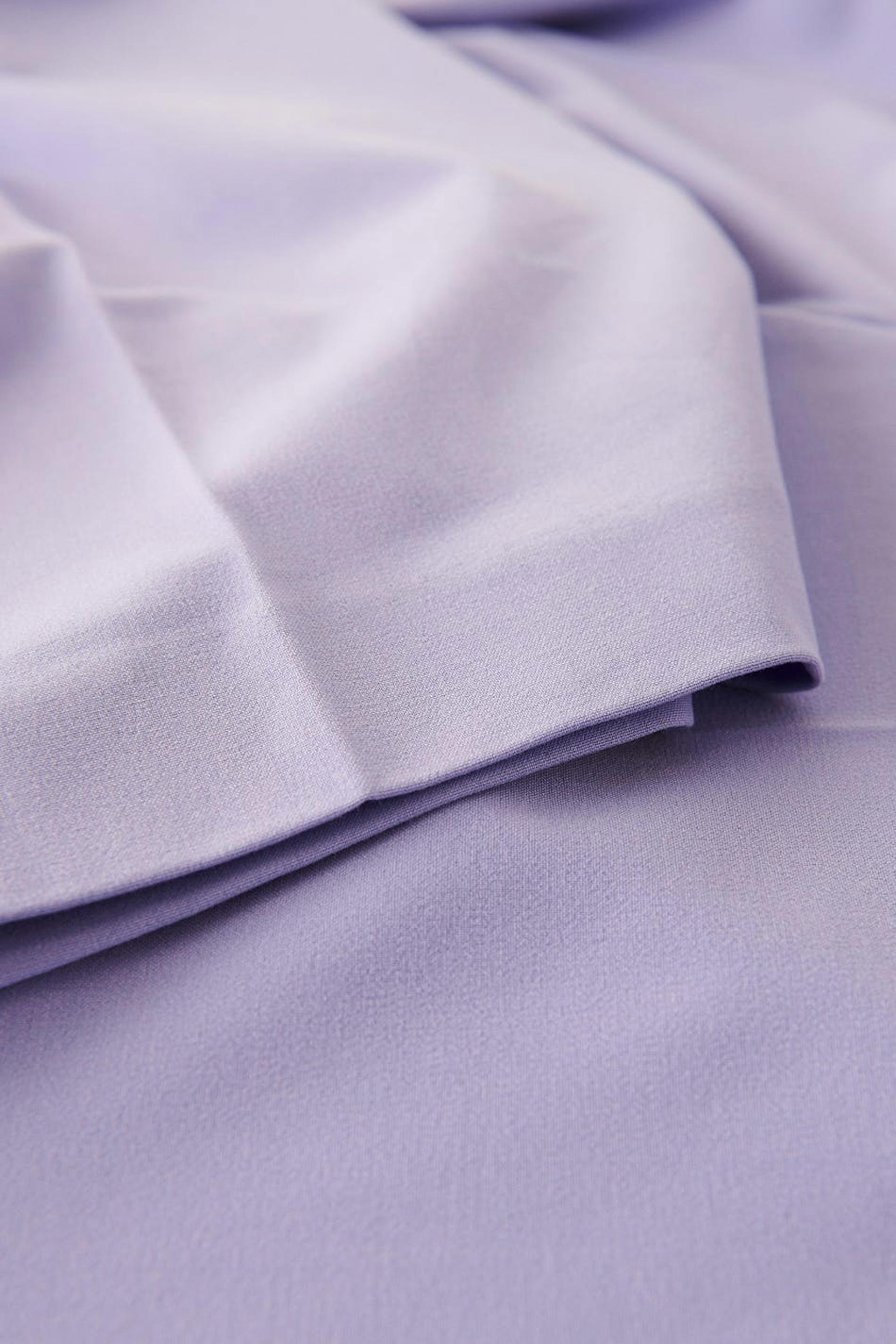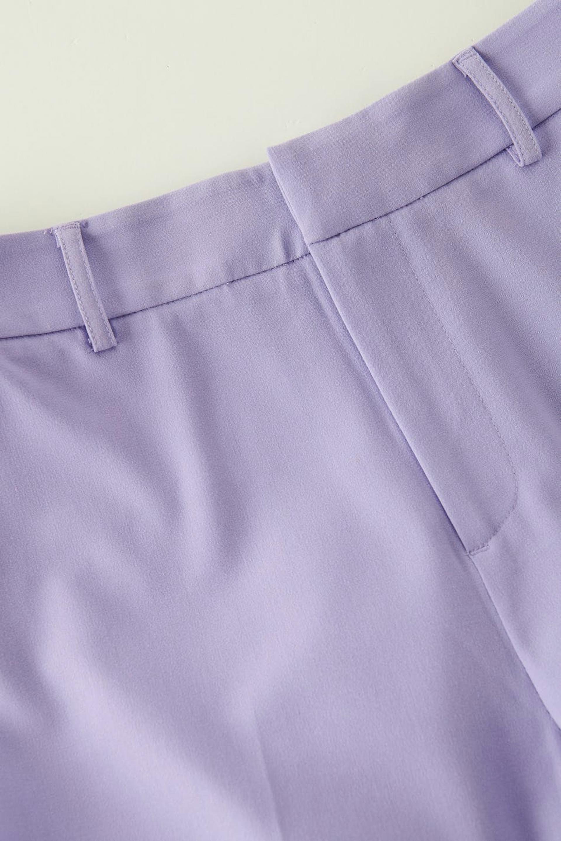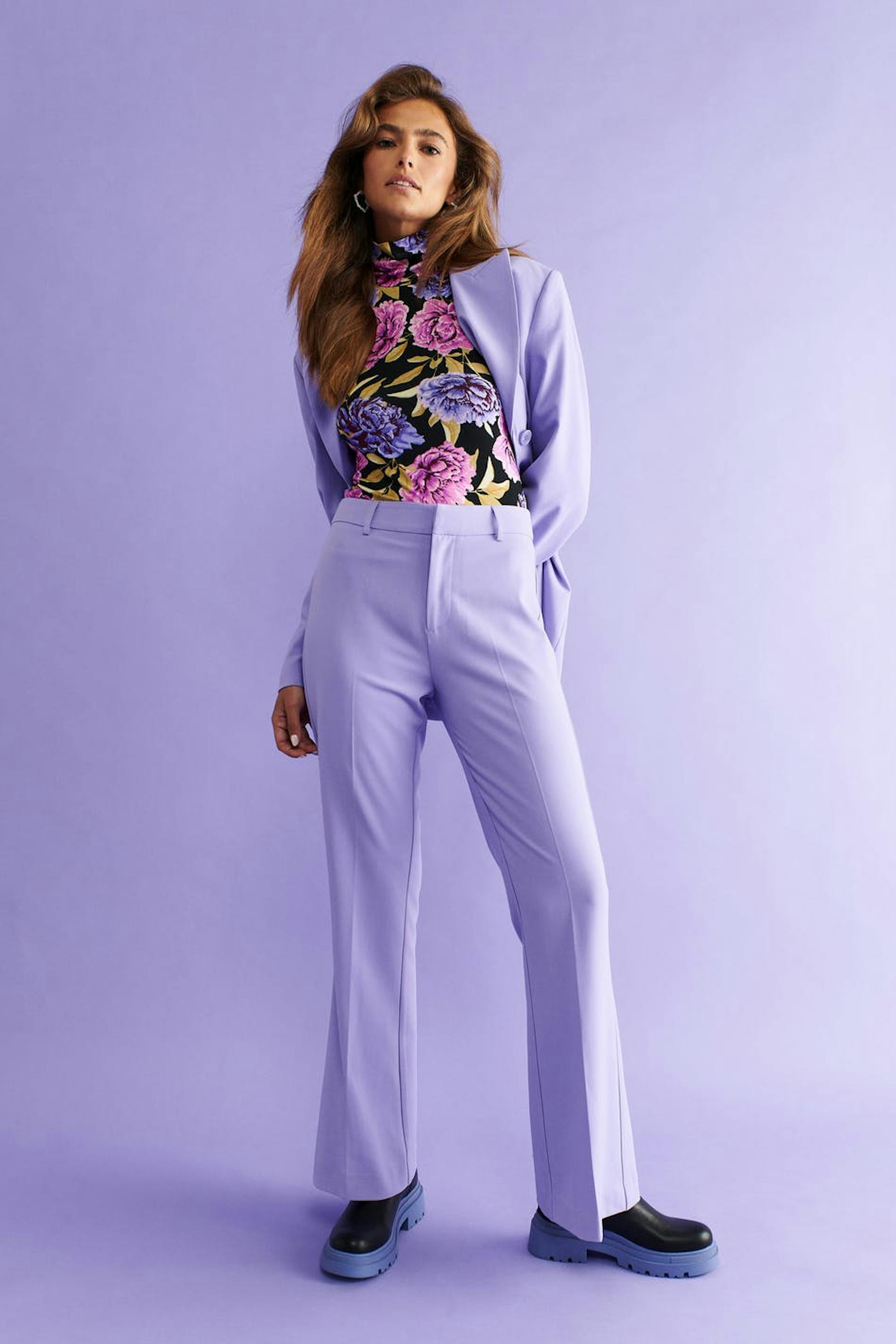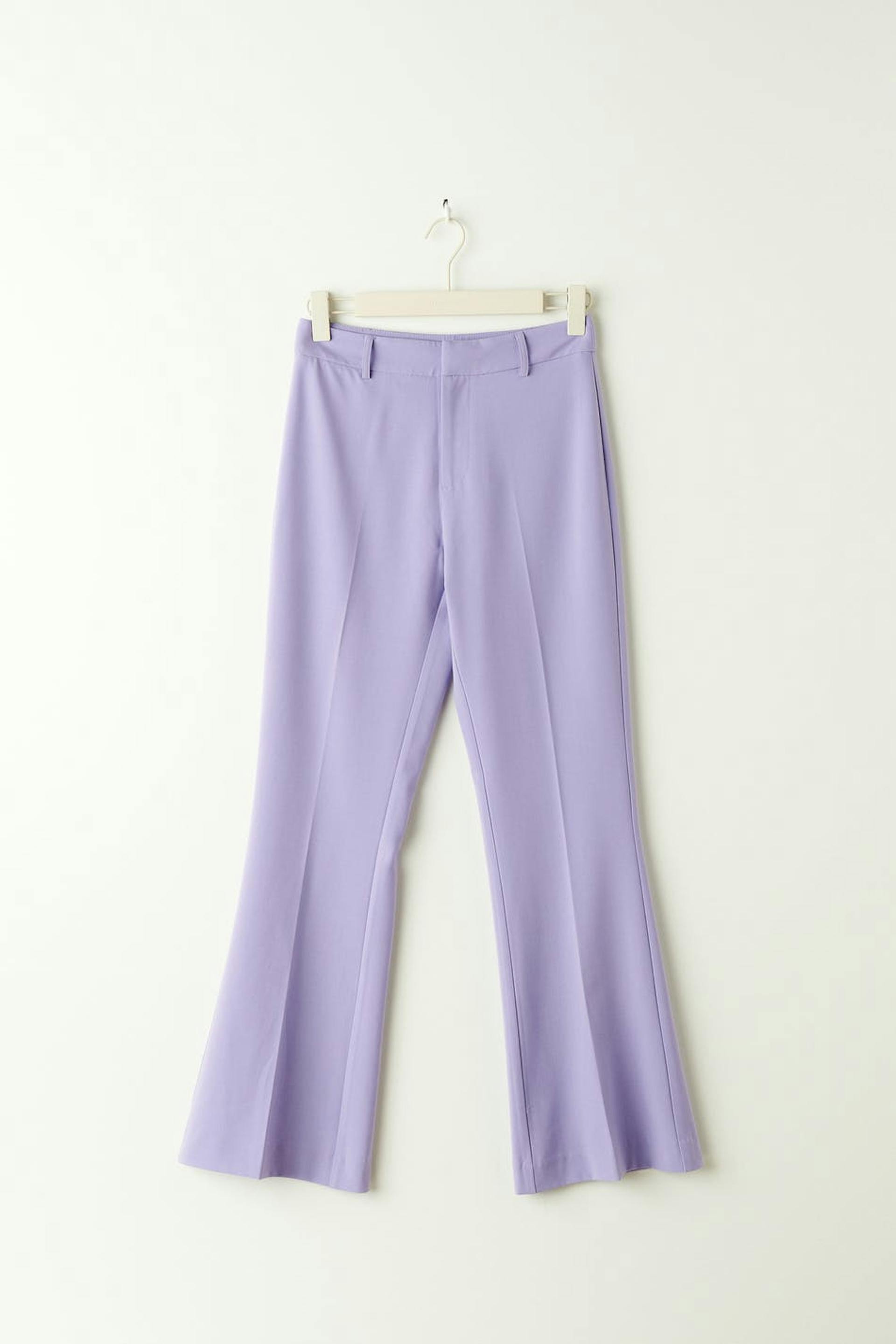 Kostymbyxor med hög midja. Byxorna är lila och har något utsvängda ben med fullängd. De har sidofickor, en passpoalficka bak, bälteshällor, dragkedjegylf och hysk- och hakestängning.