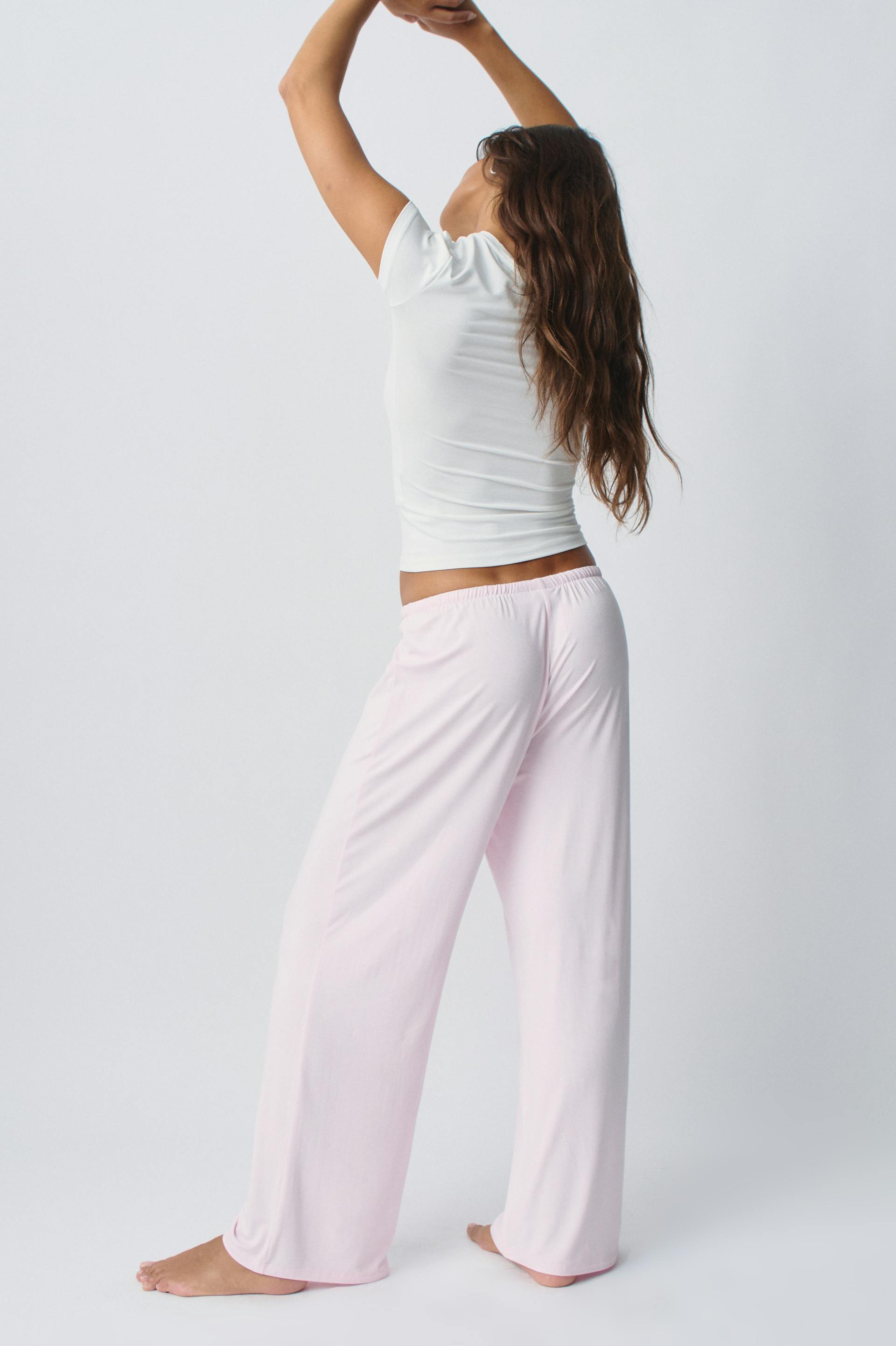 Vida byxor med knytbar dragsko i midjan. Byxorna är rosa och har lös passform.