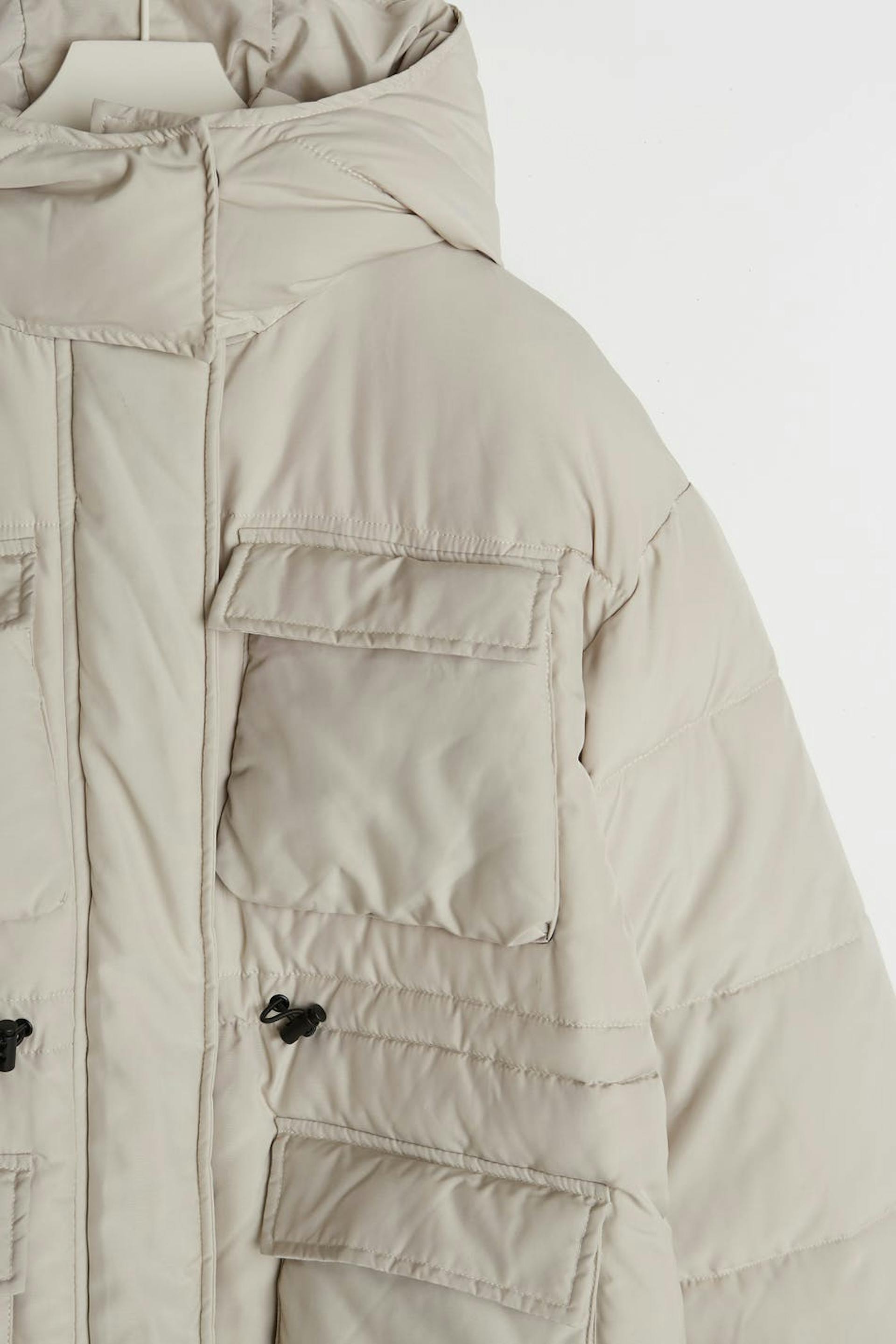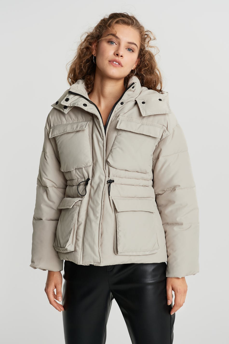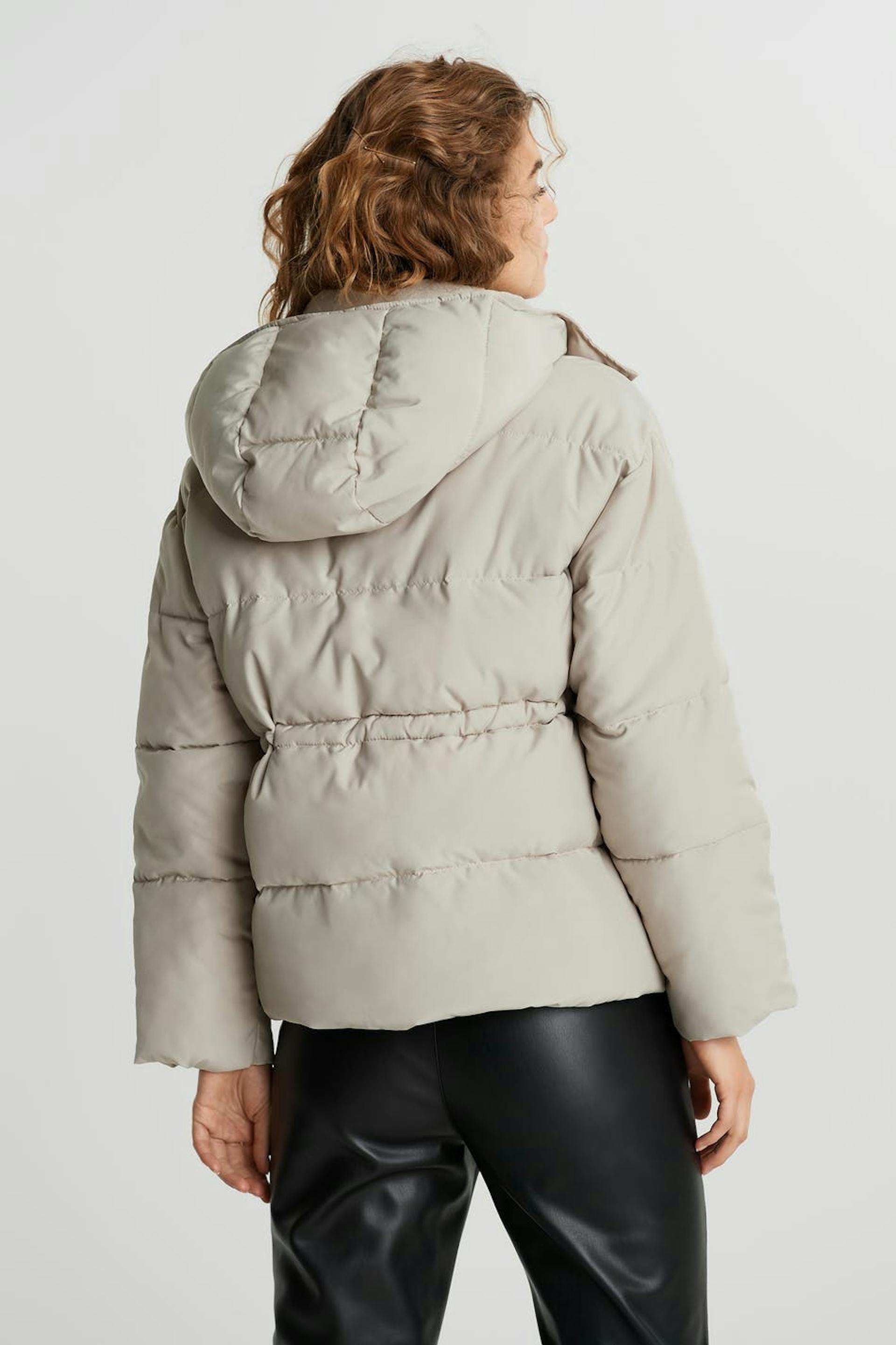 Jacka med en huva. Jackan är grå och har en dragsko i midjan. Den har fickor på framsidan.