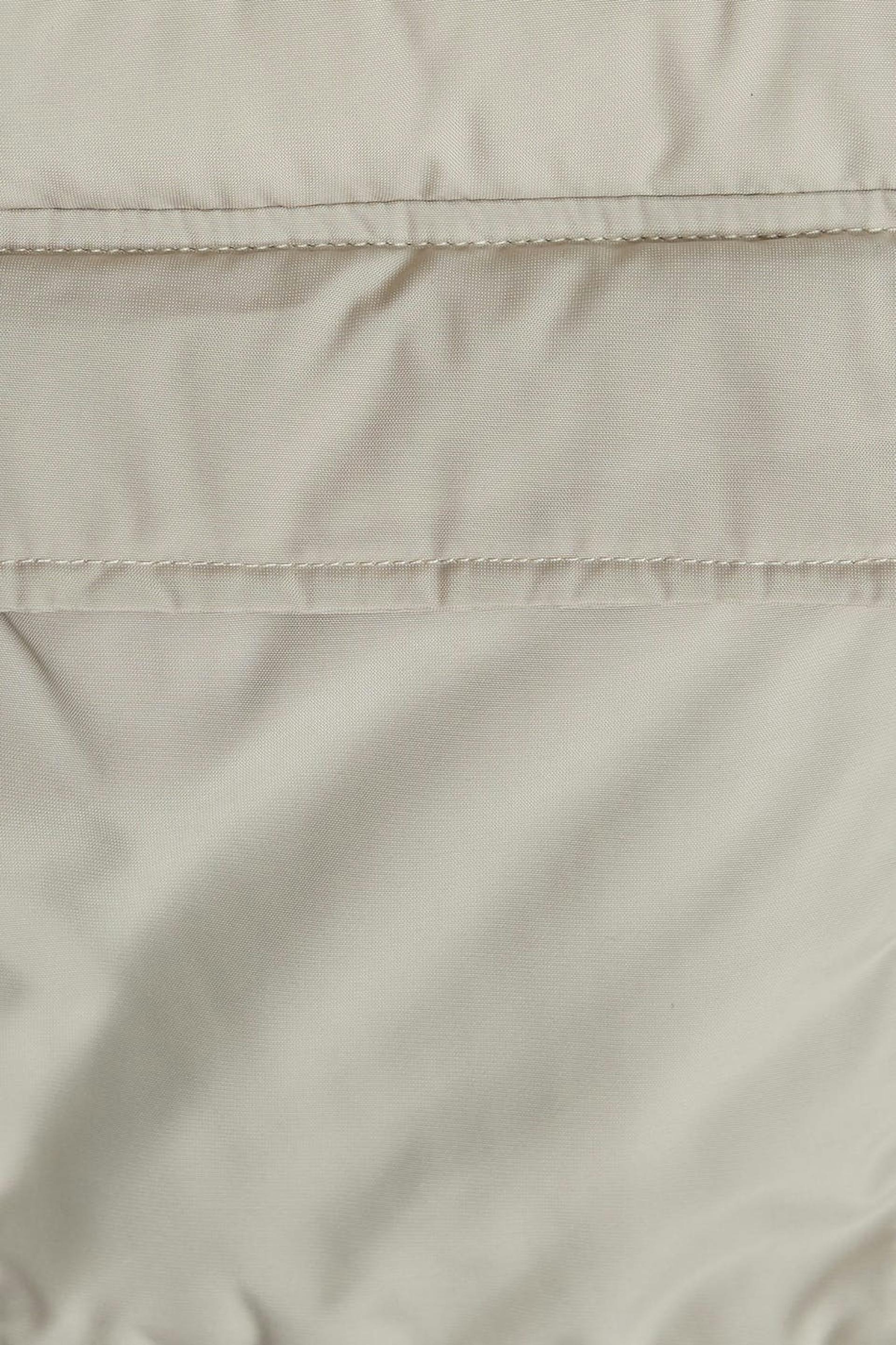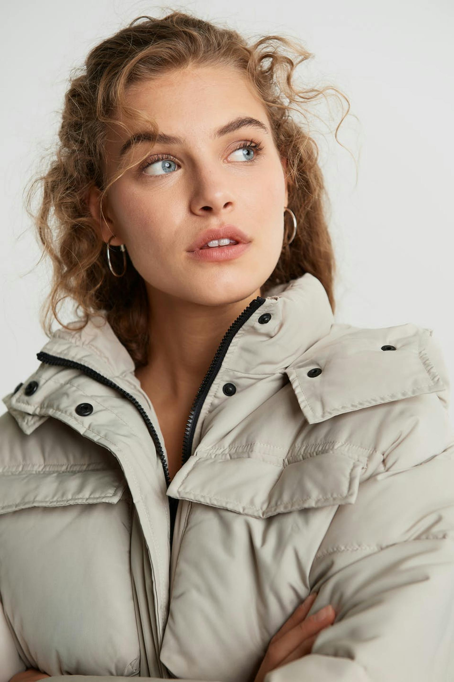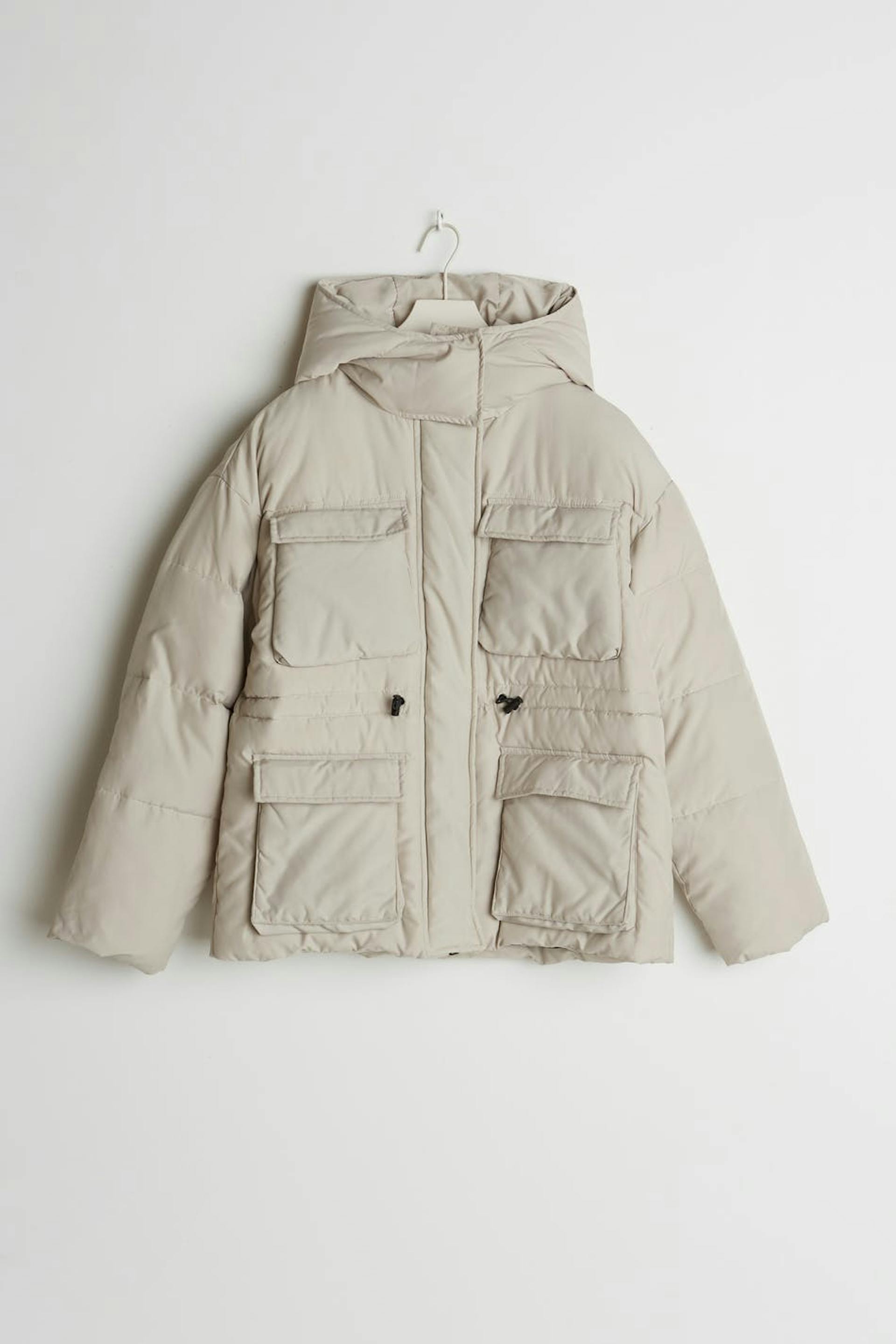 Jacka med en huva. Jackan är grå och har en dragsko i midjan. Den har fickor på framsidan.