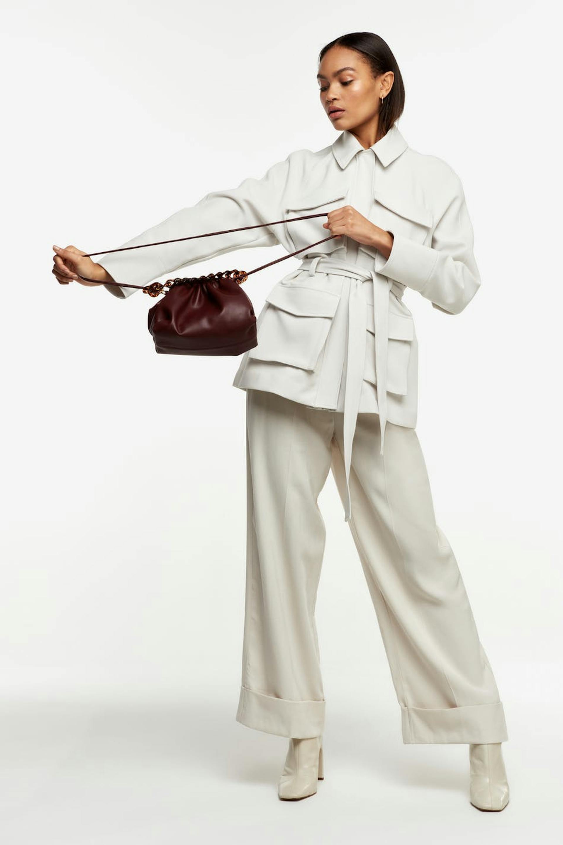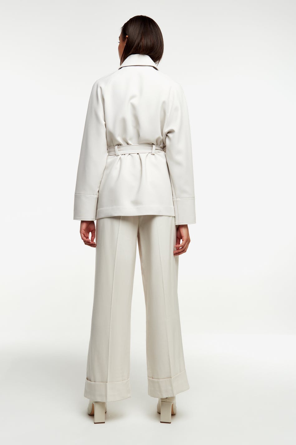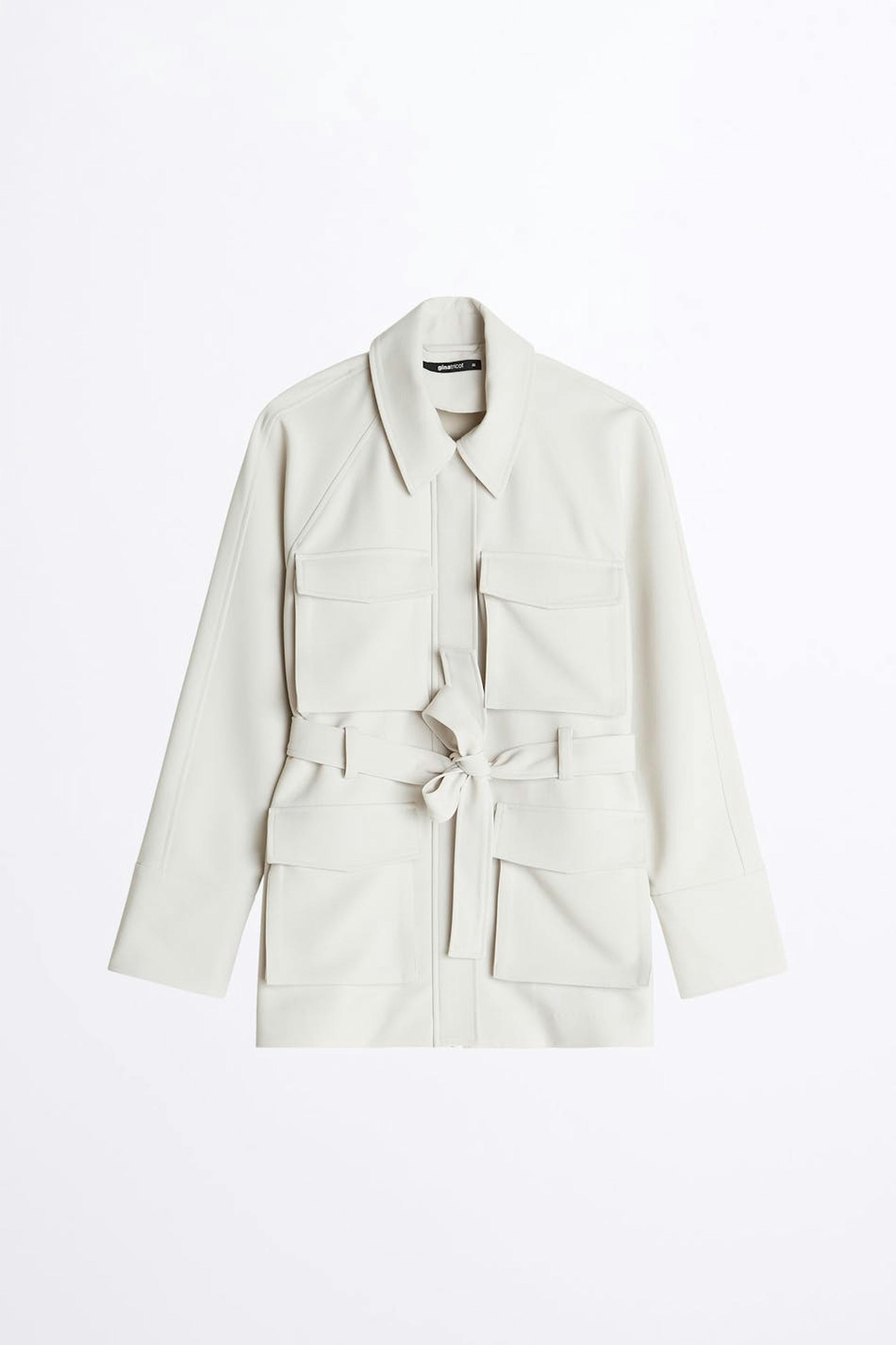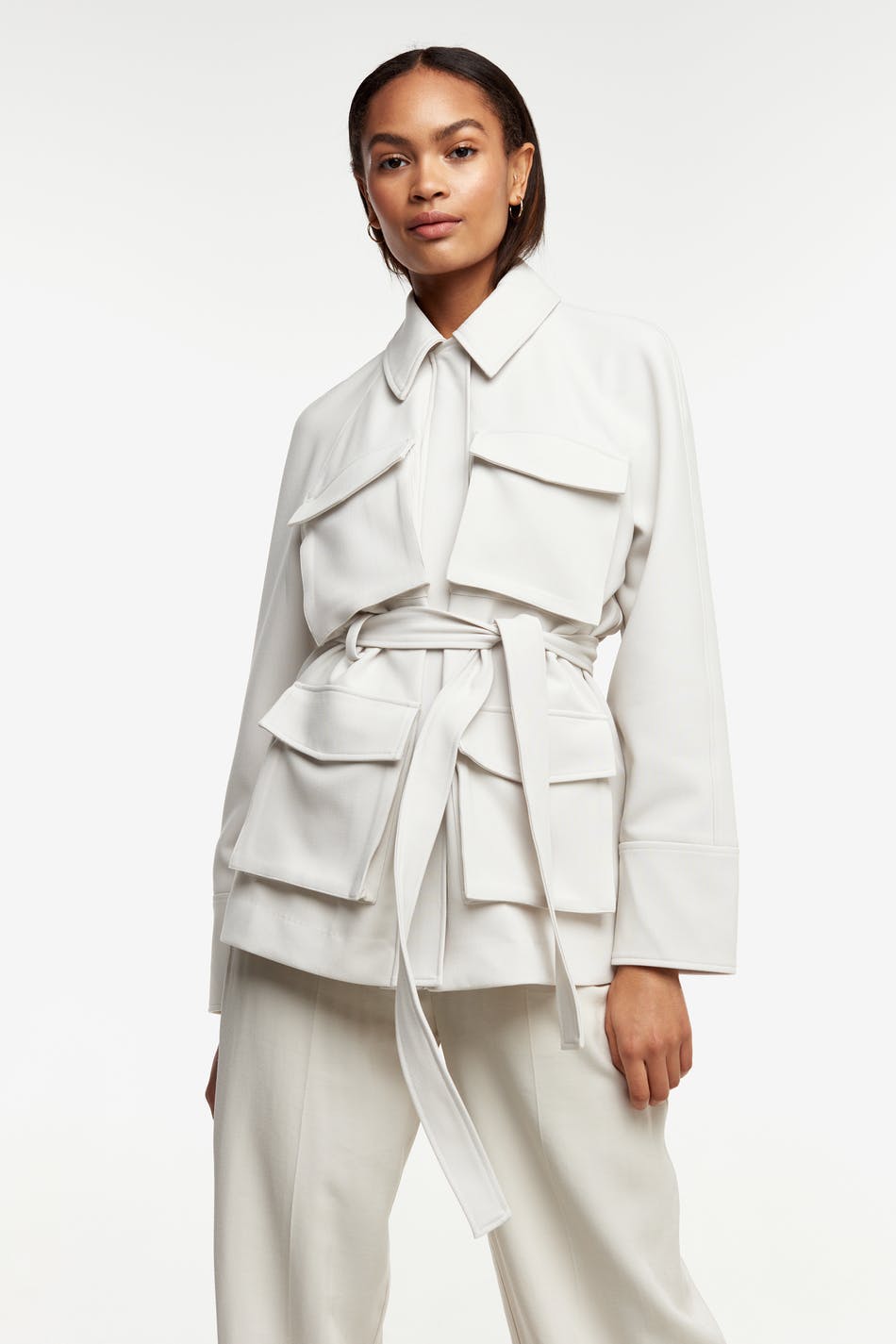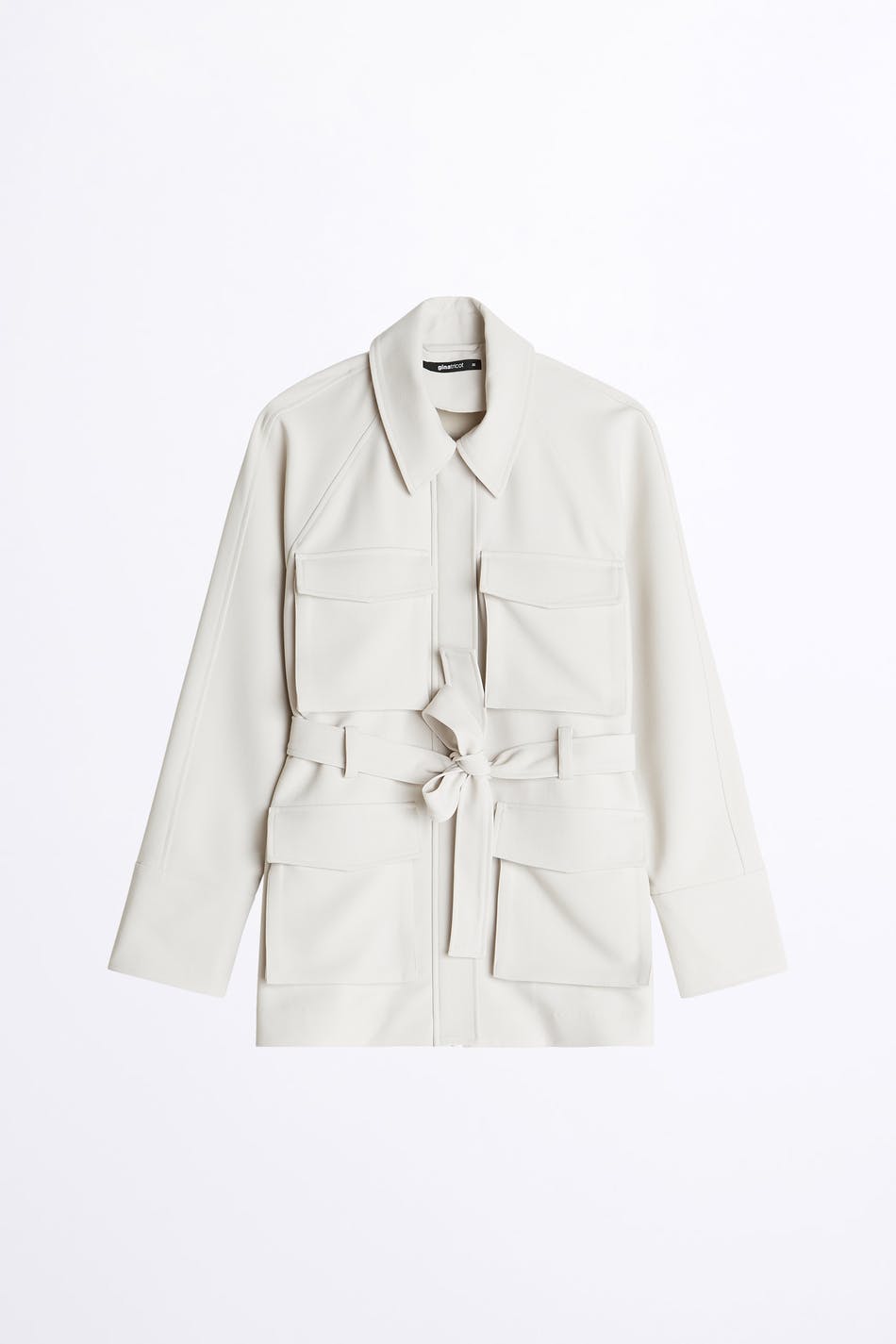 Jacka med fickor framtill. Jackan är beige och har en dragkedja. Den har ett knytband i midjan.