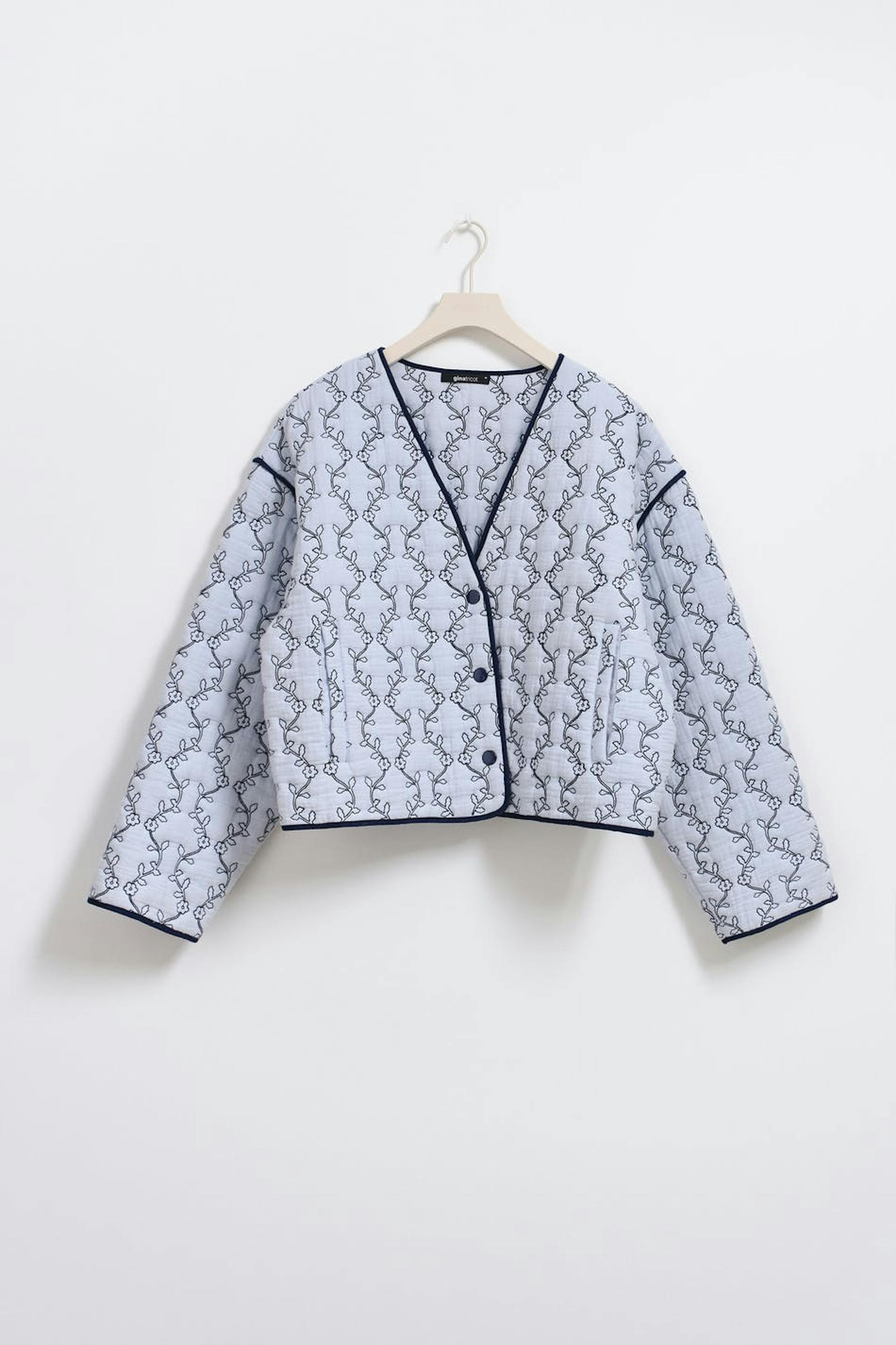Mönstrad jacka med tryckknappsstängning. Jackan är blå, quiltad och kort. Den har v-ringning, marinblåa kantband och snedställda fickor i sidorna.