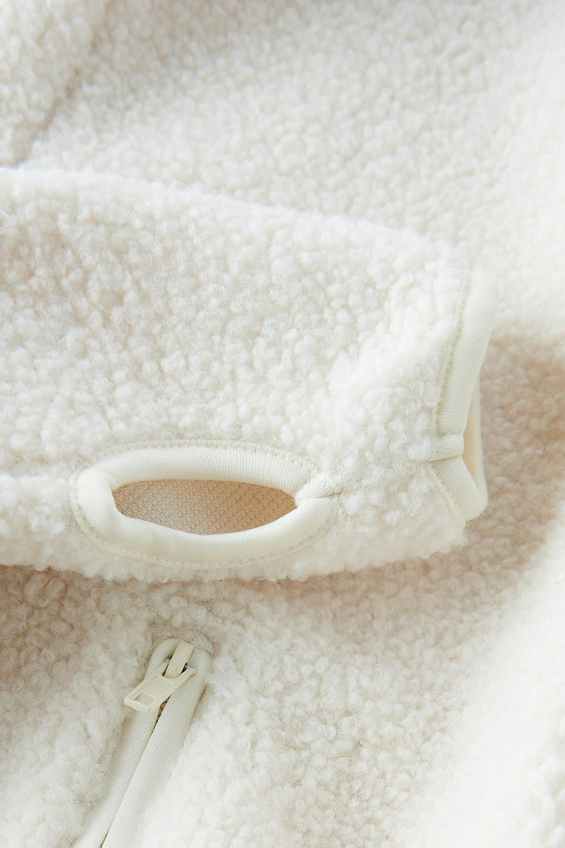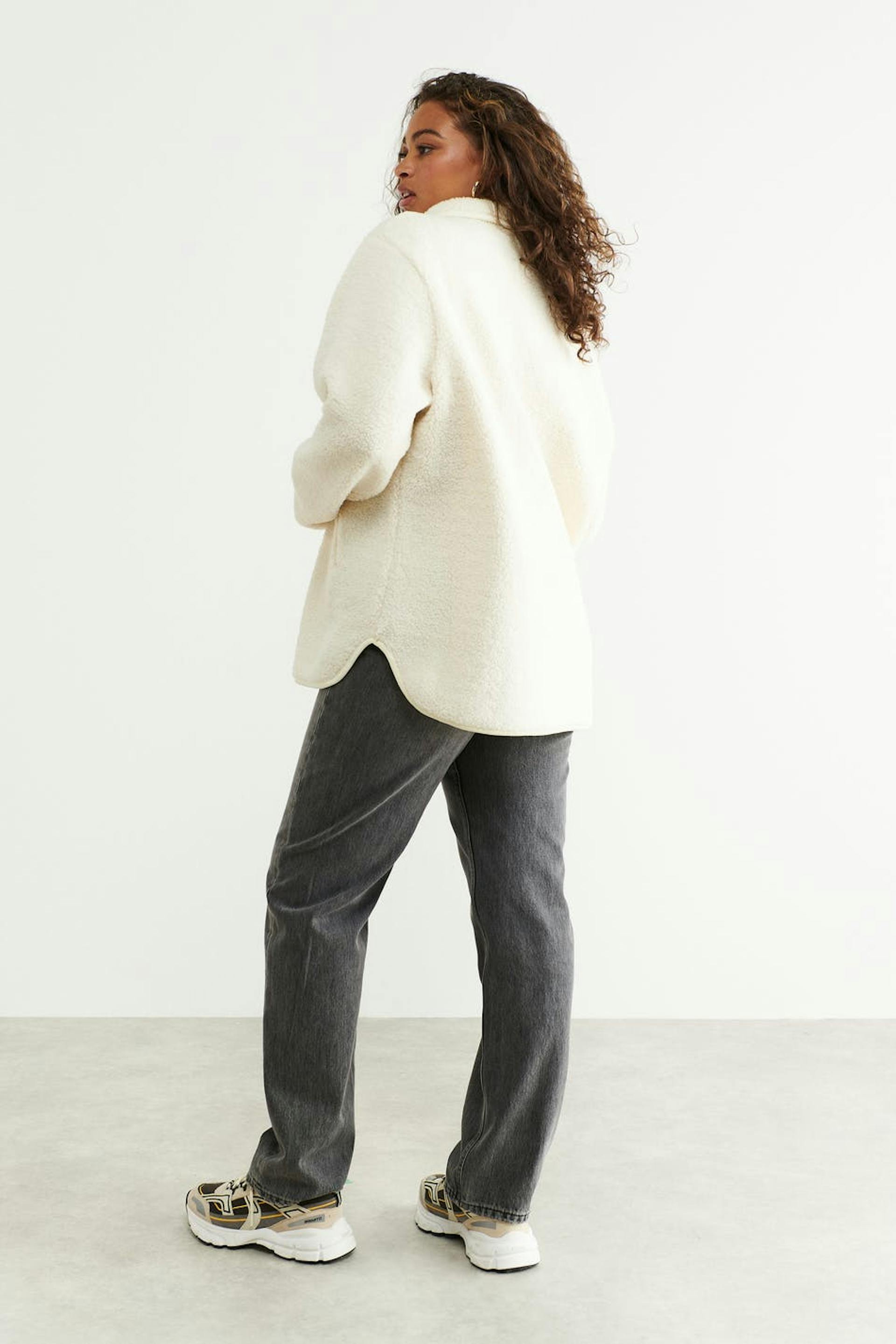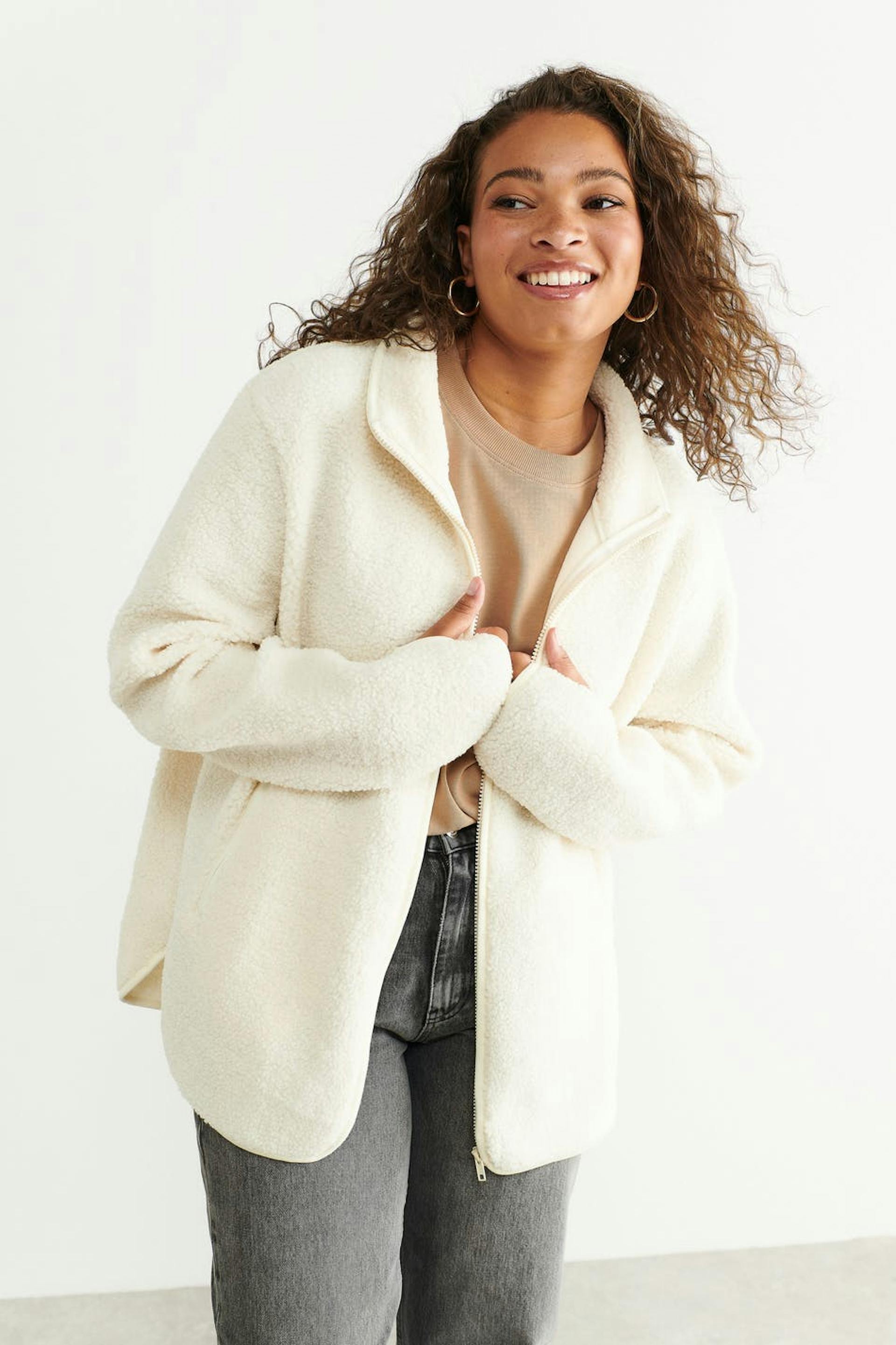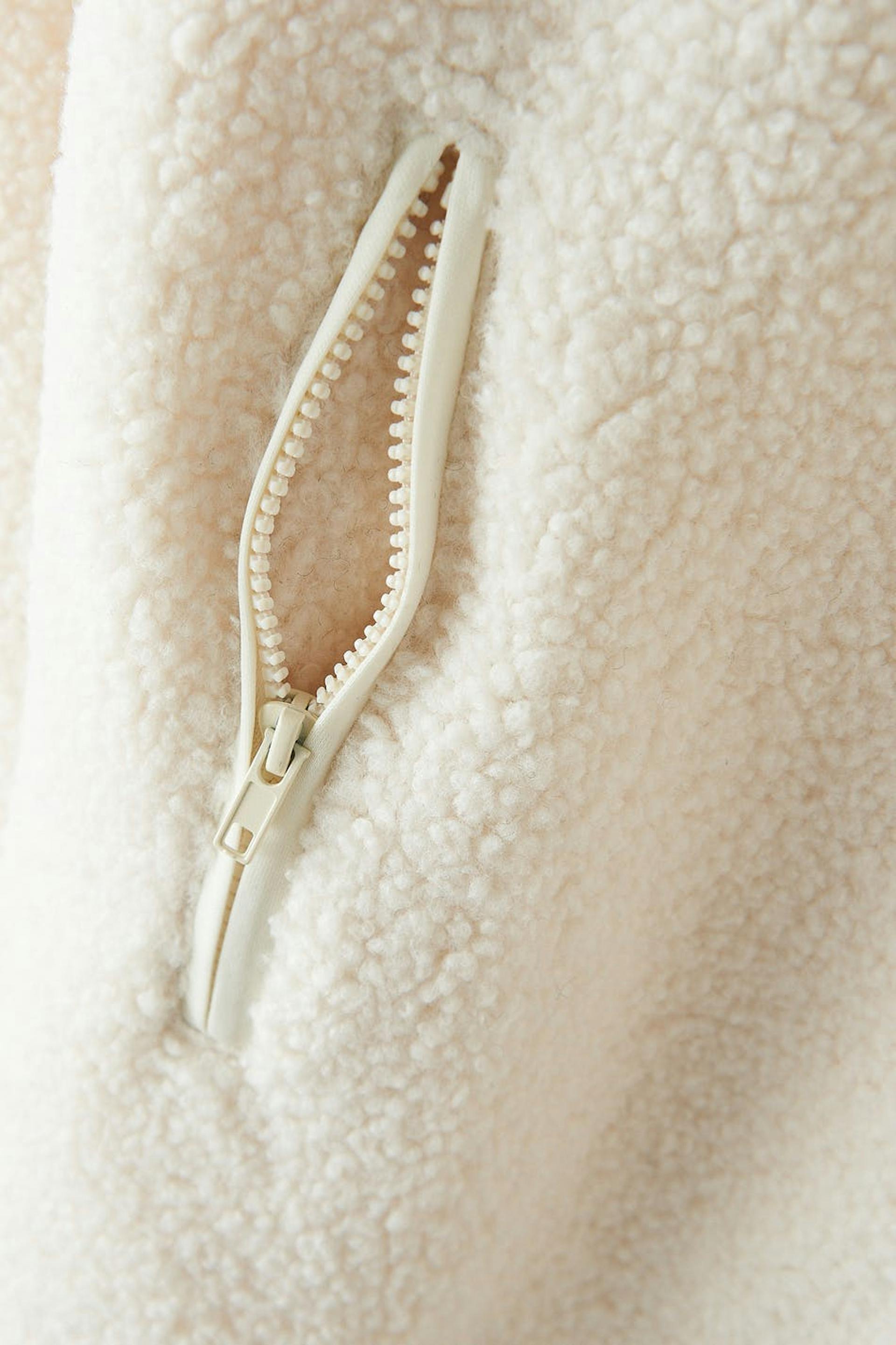 Teddyjacka med oversize fit. Teddyjackan är vit och har hög krage. Den har dragkedjestängning fram, sidofickor med blixtlås, tumhål vid ärmsluten och slits i sidorna.