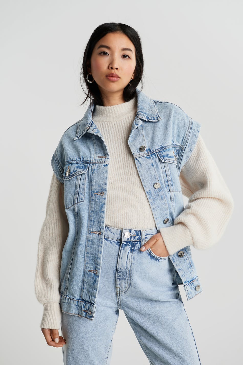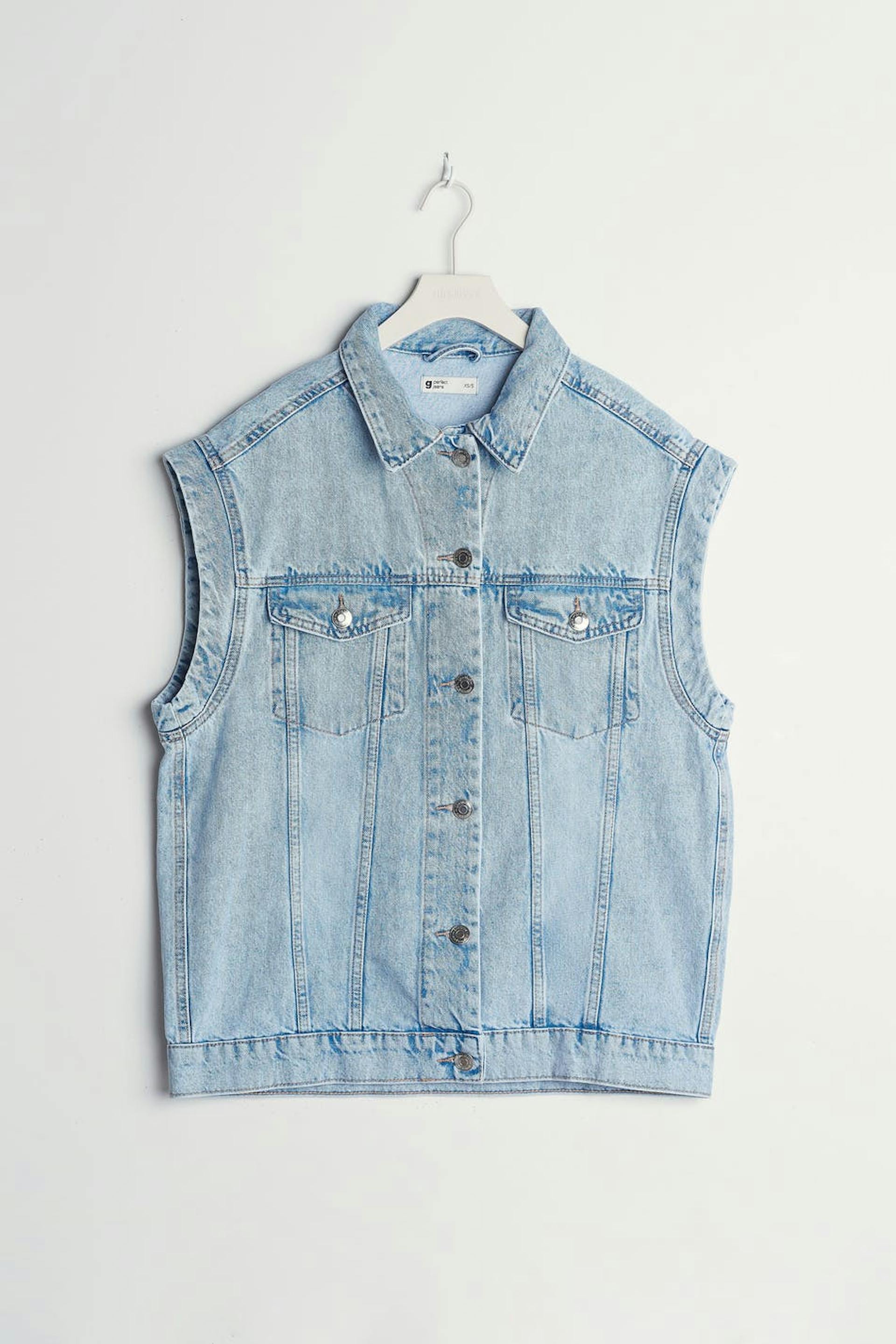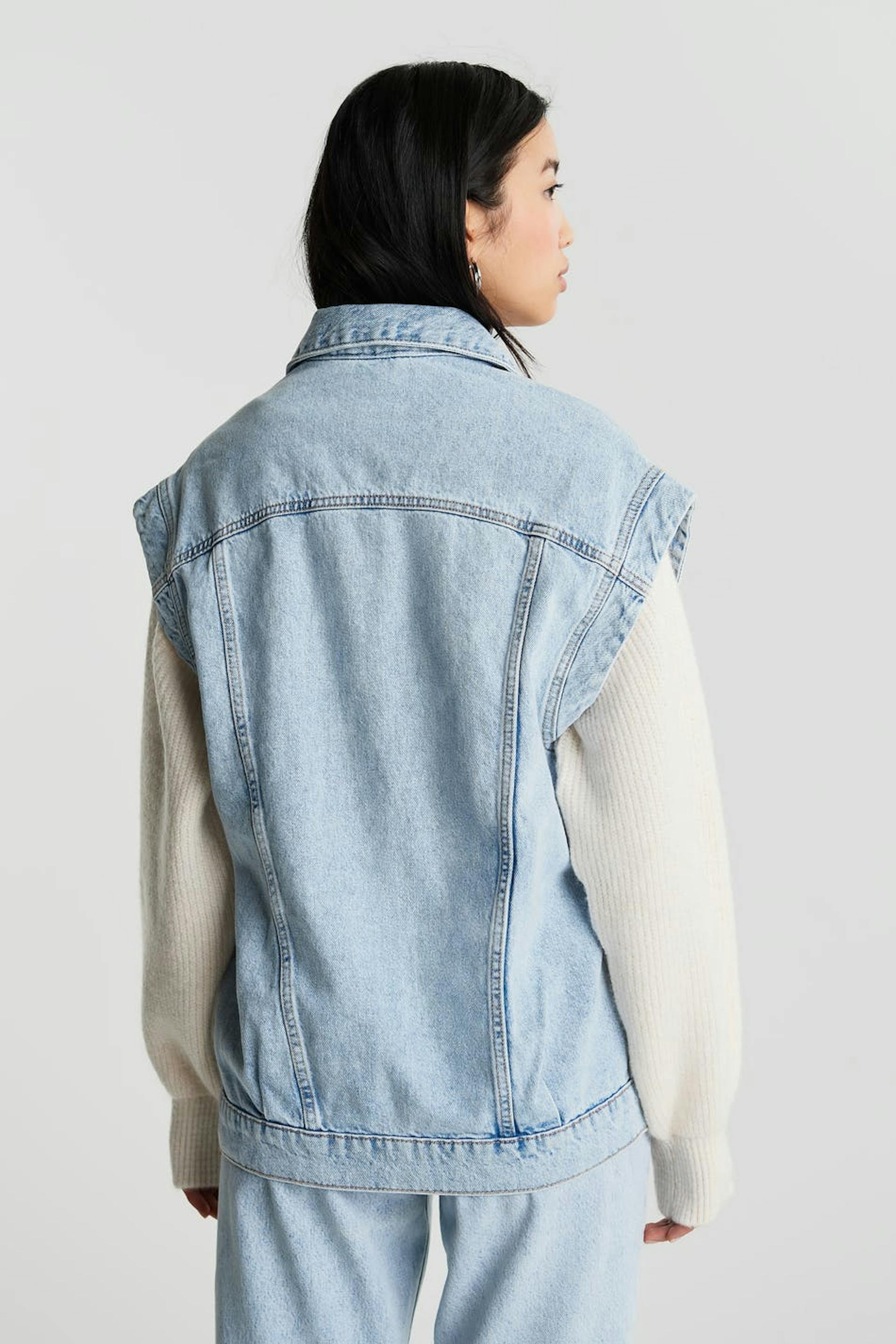 Ärmlös väst med oversize fit. Västen är ljusblå och har en vintageinspirerad design. Den är gjord av denim och har bröstfickor och en krage.