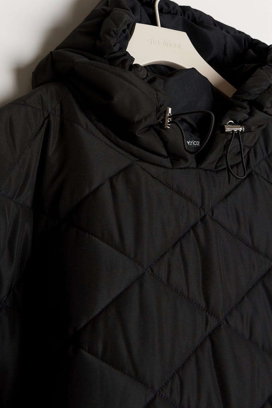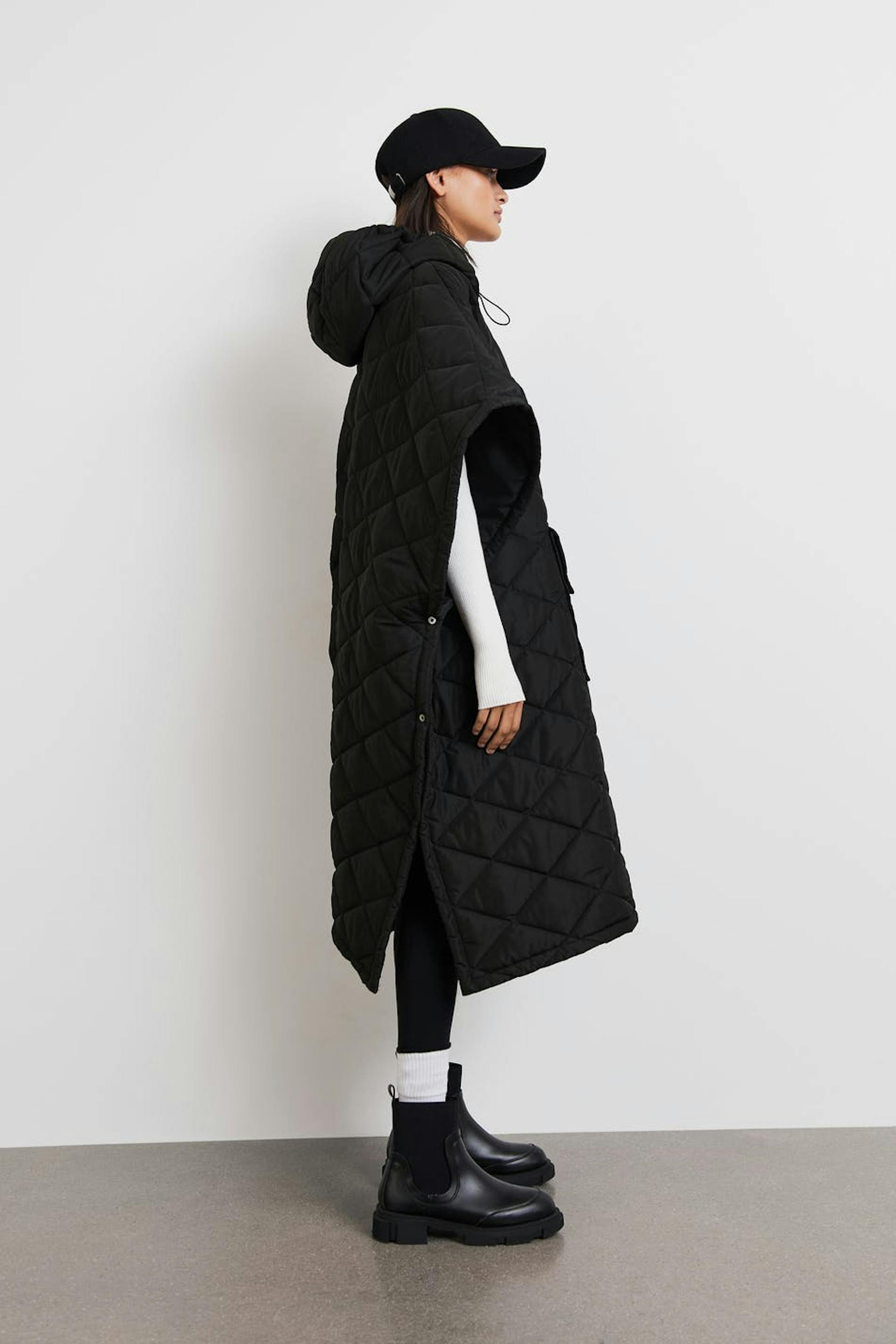 Quiltad kappa med en vävd kvalitet i polyester. Kappan är svart, vadderad och lång. Den har oversize fit, en stor ficka framtill, tryckknappar på sidorna och en huva med justerbar dragsko.