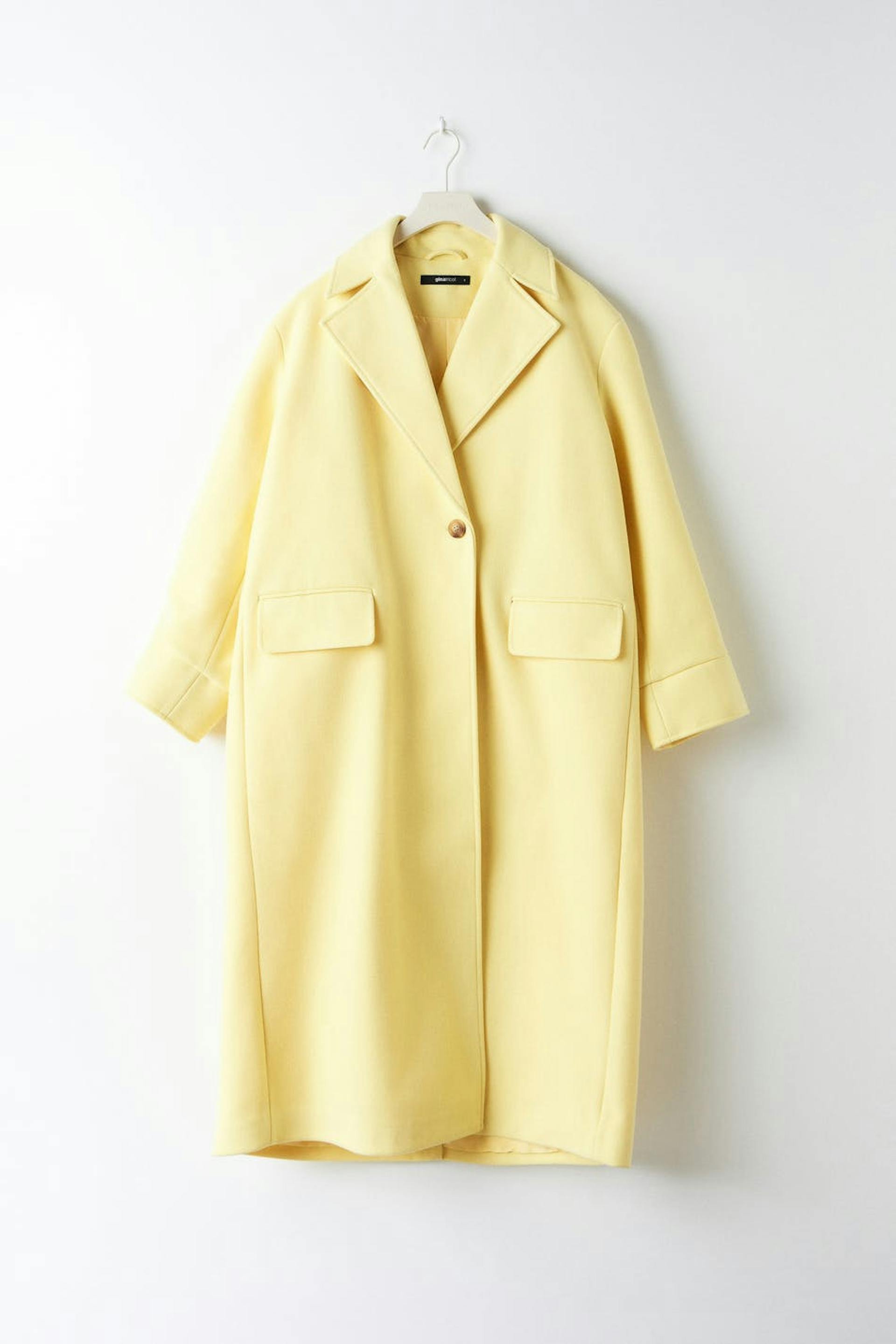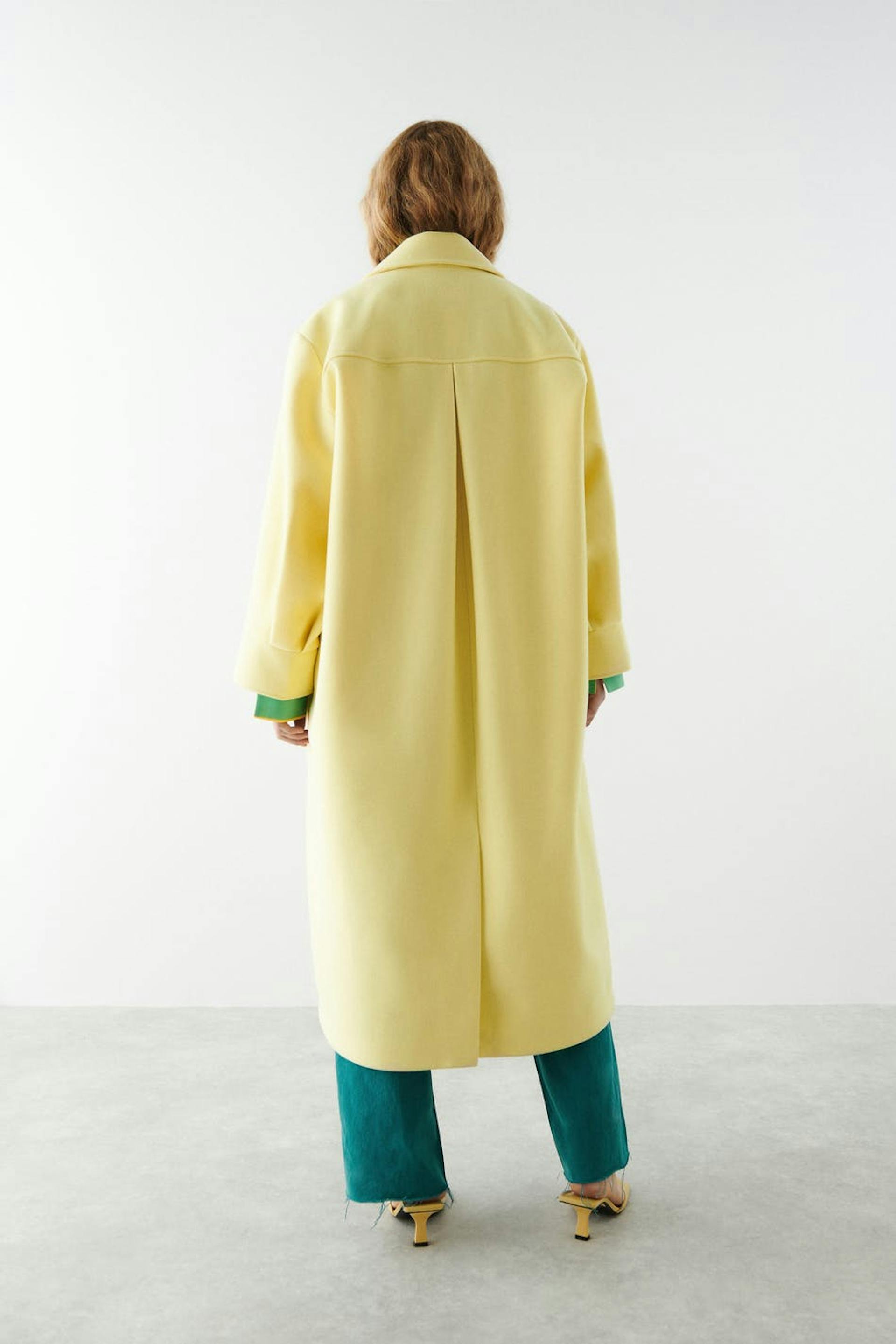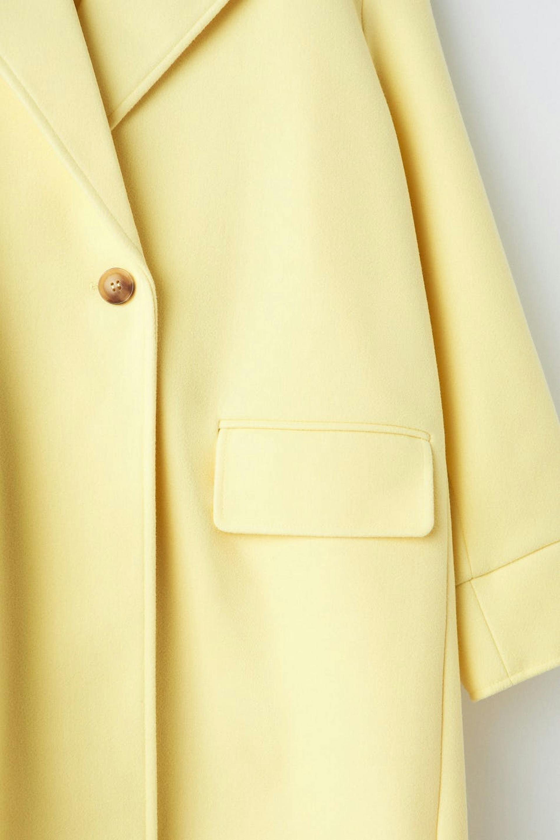 Lång kappa med oversize fit. Kappan är gul och enkelknäppt och har en tjockare, vävd kvalitet. Den har chunky slag, voluminösa ärmar, manschetter, passpoalfickor fram, veck bak och sprund nedtill.