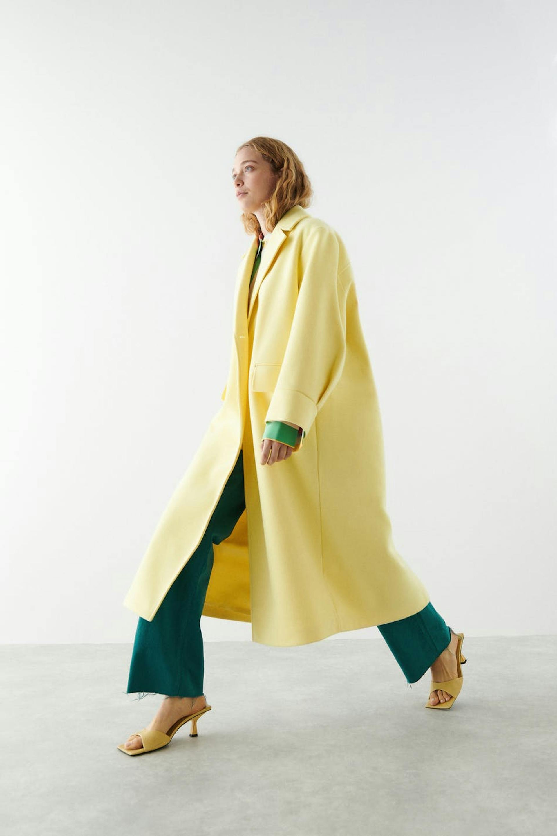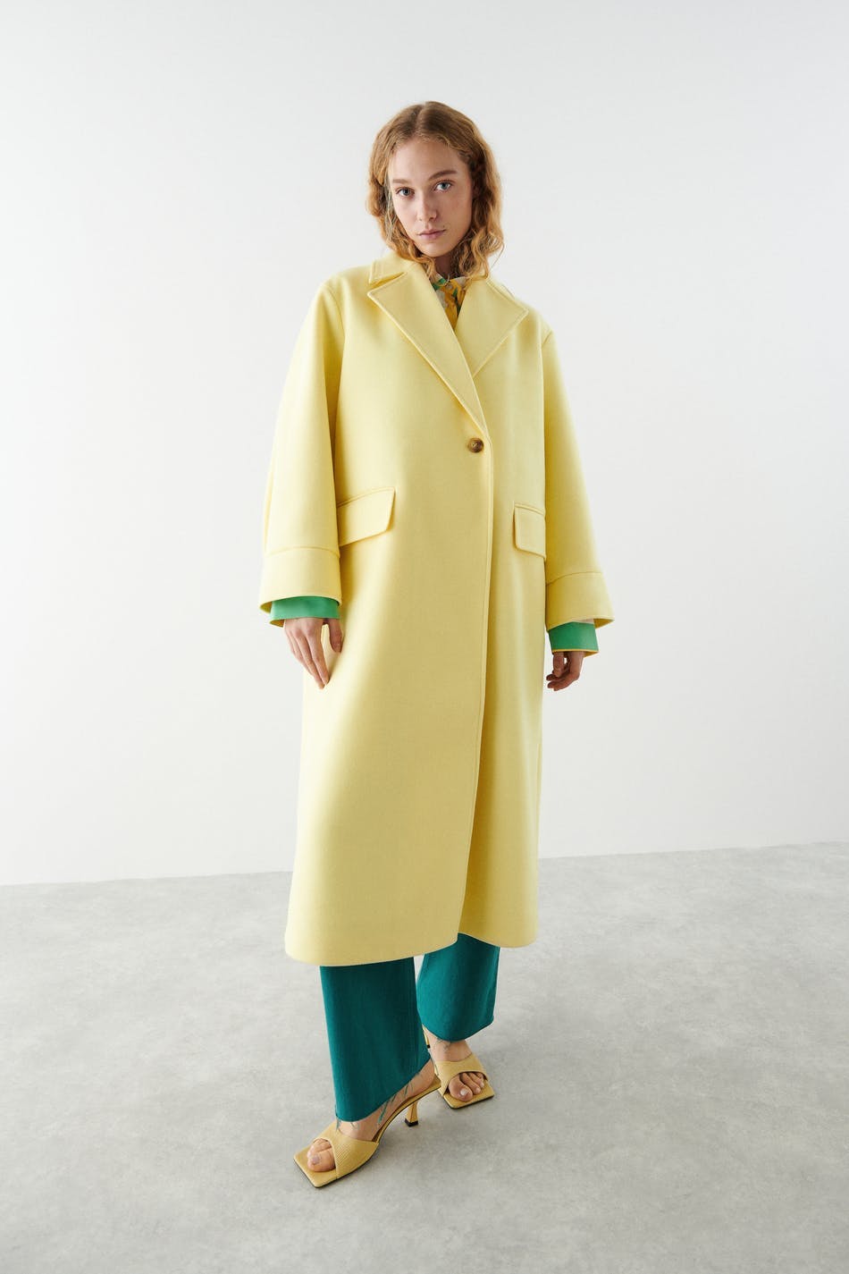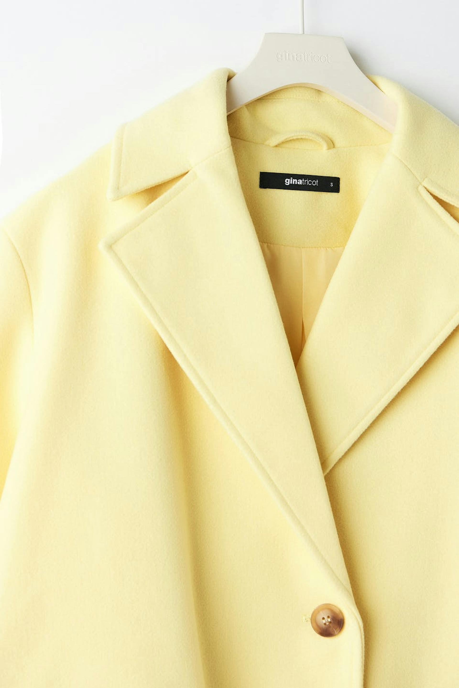 Lång kappa med oversize fit. Kappan är gul och enkelknäppt och har en tjockare, vävd kvalitet. Den har chunky slag, voluminösa ärmar, manschetter, passpoalfickor fram, veck bak och sprund nedtill.