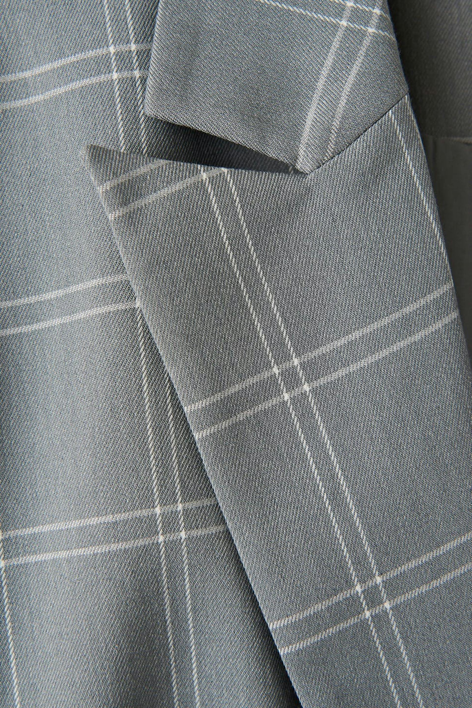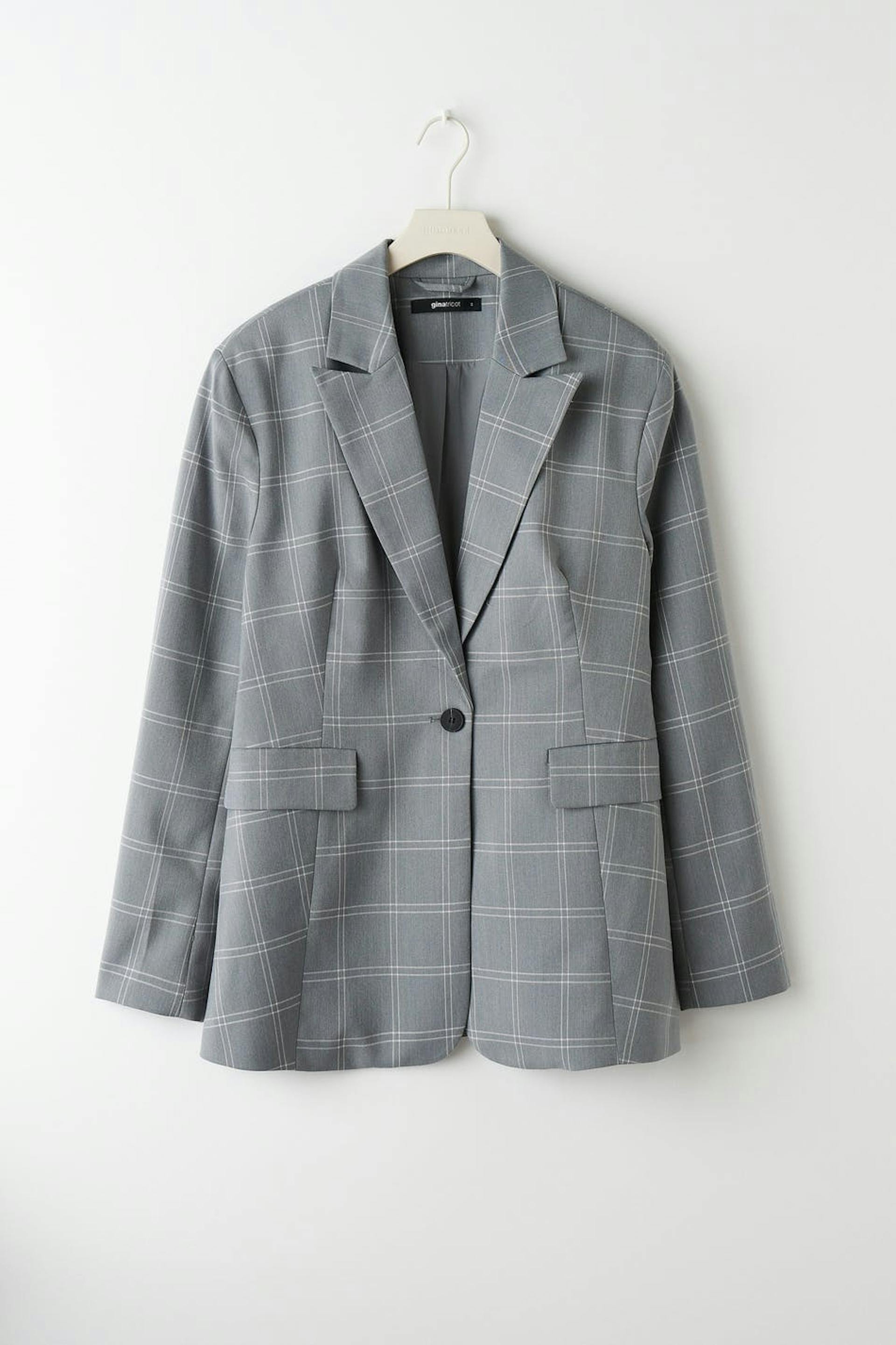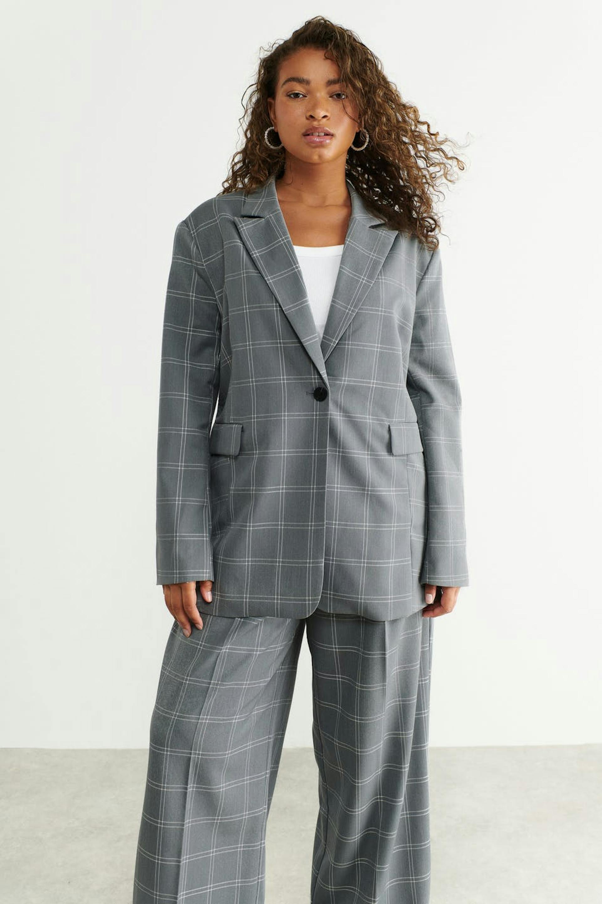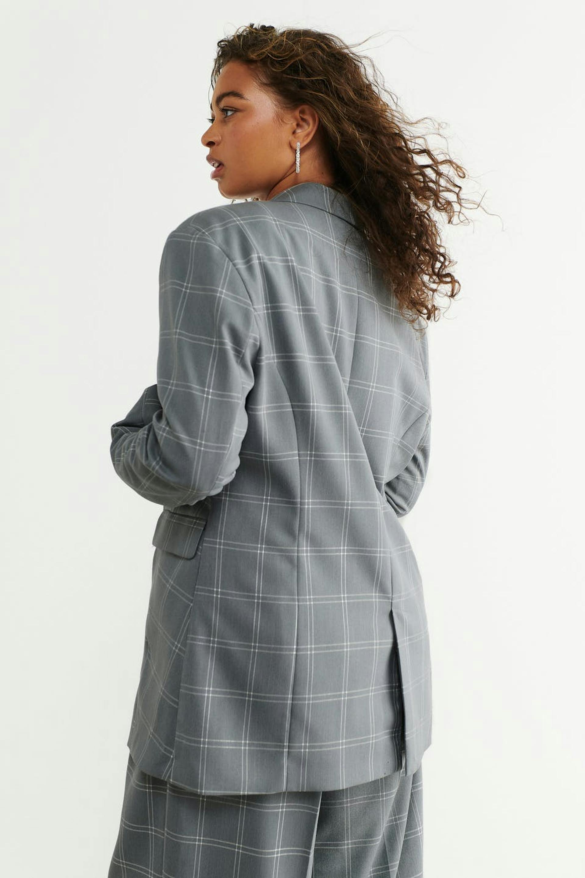 Rutig blazer med avslappnad passform. Blazern är grå och har breda axlar. Den har knäppning fram, breda slag, passpoalerade fickor med lock och sprund bak.
