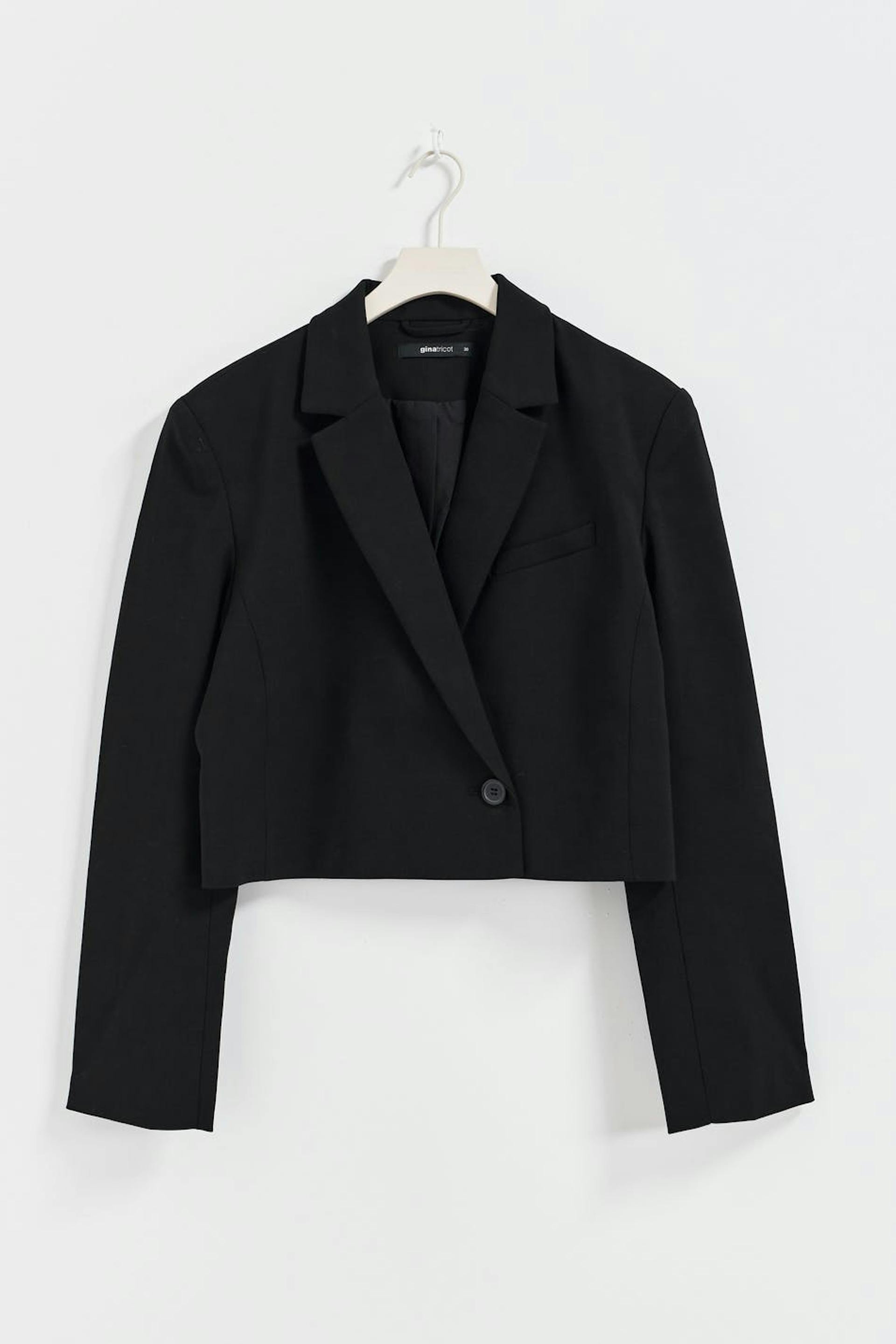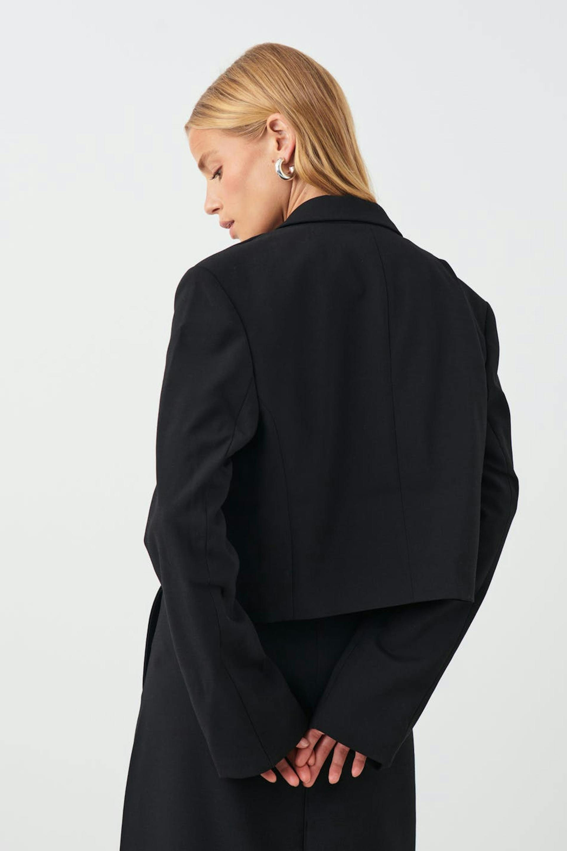 Croppad blazer med dubbelknäppning fram. Blazern är svart och har krage med trubbigt slag.